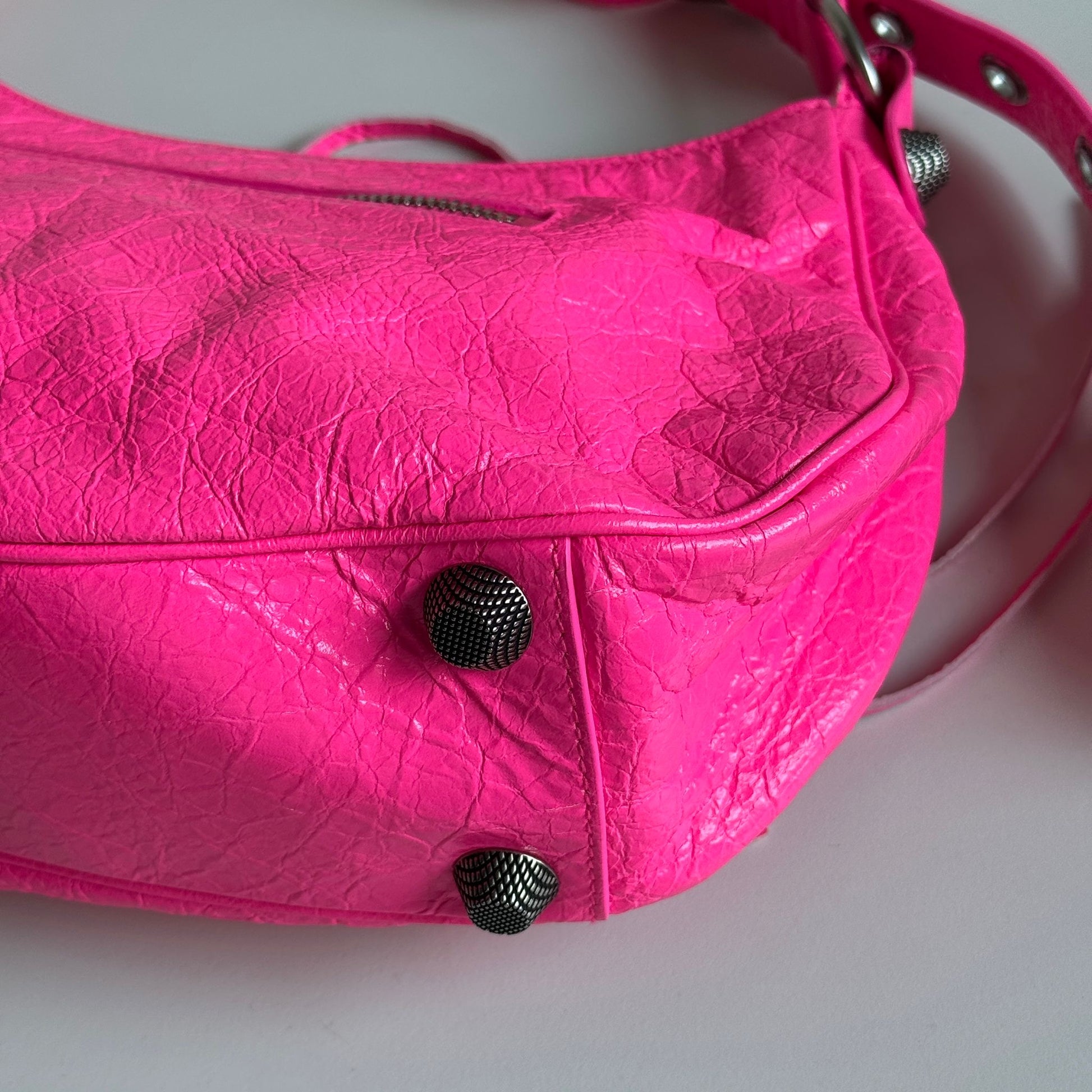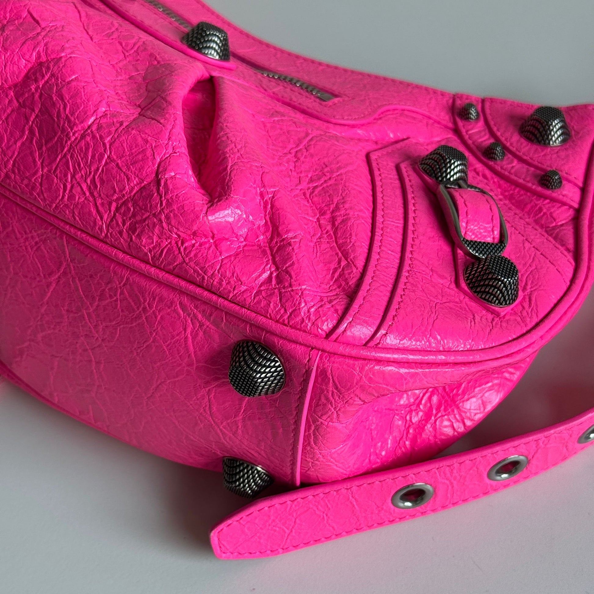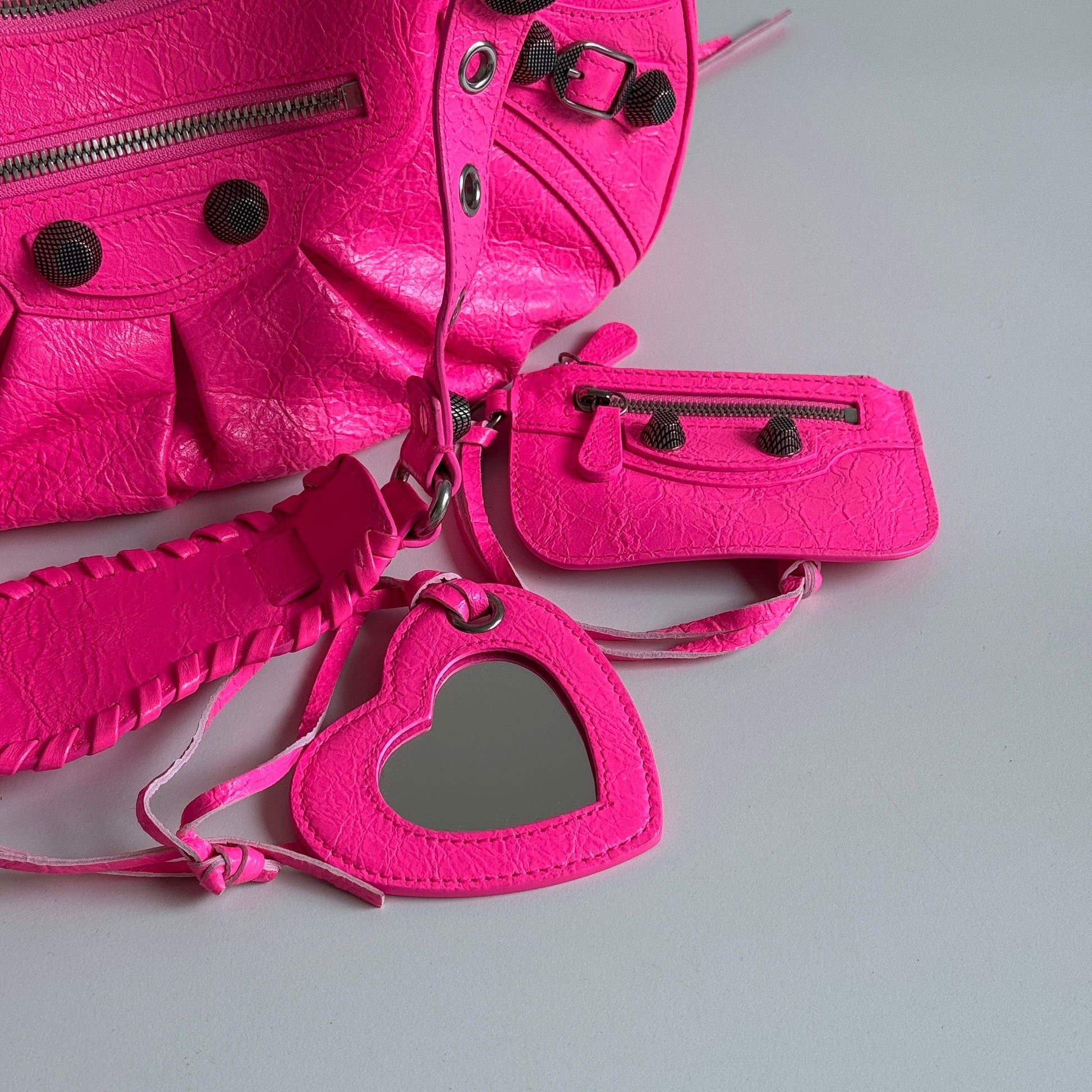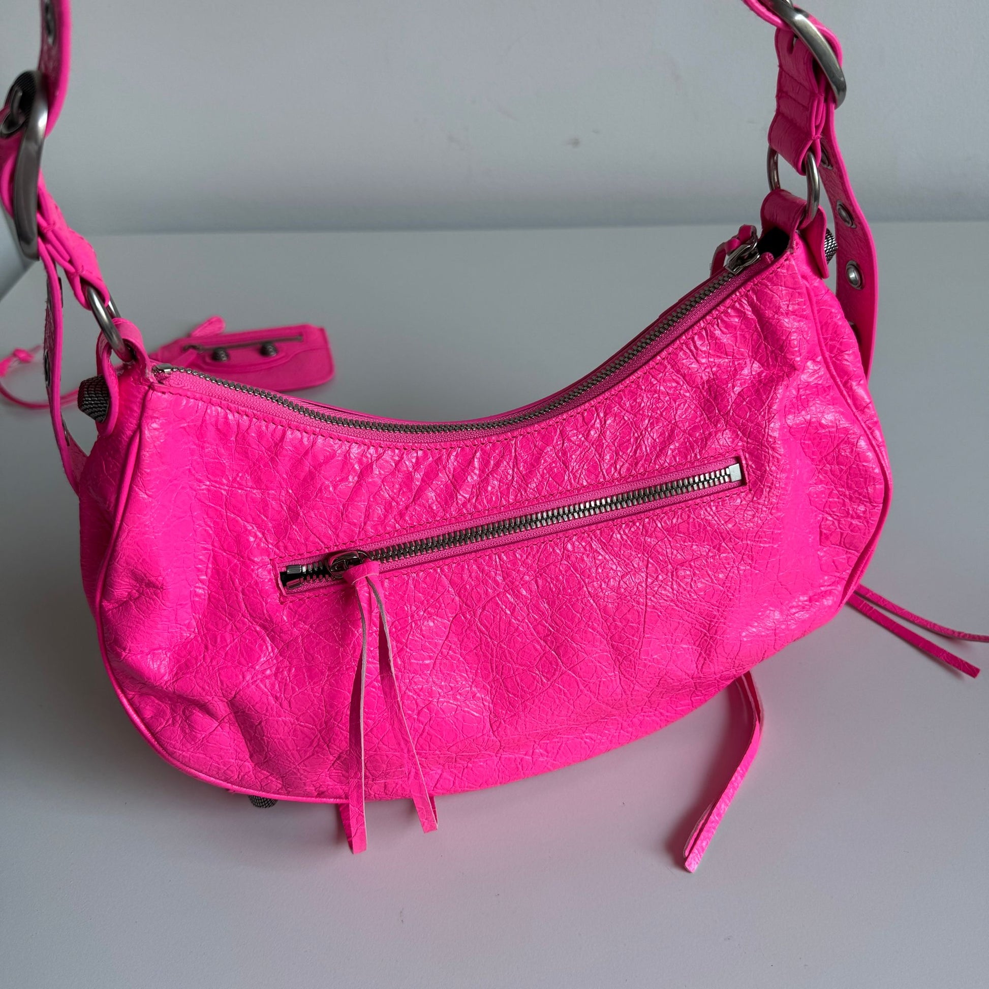 Iconica borsa Balenciaga modello Le Cagole S in pelle fucsia fluo con hardware argento. Si indossa a spalla e a tracolla grazie allo spallaccio regolabile.