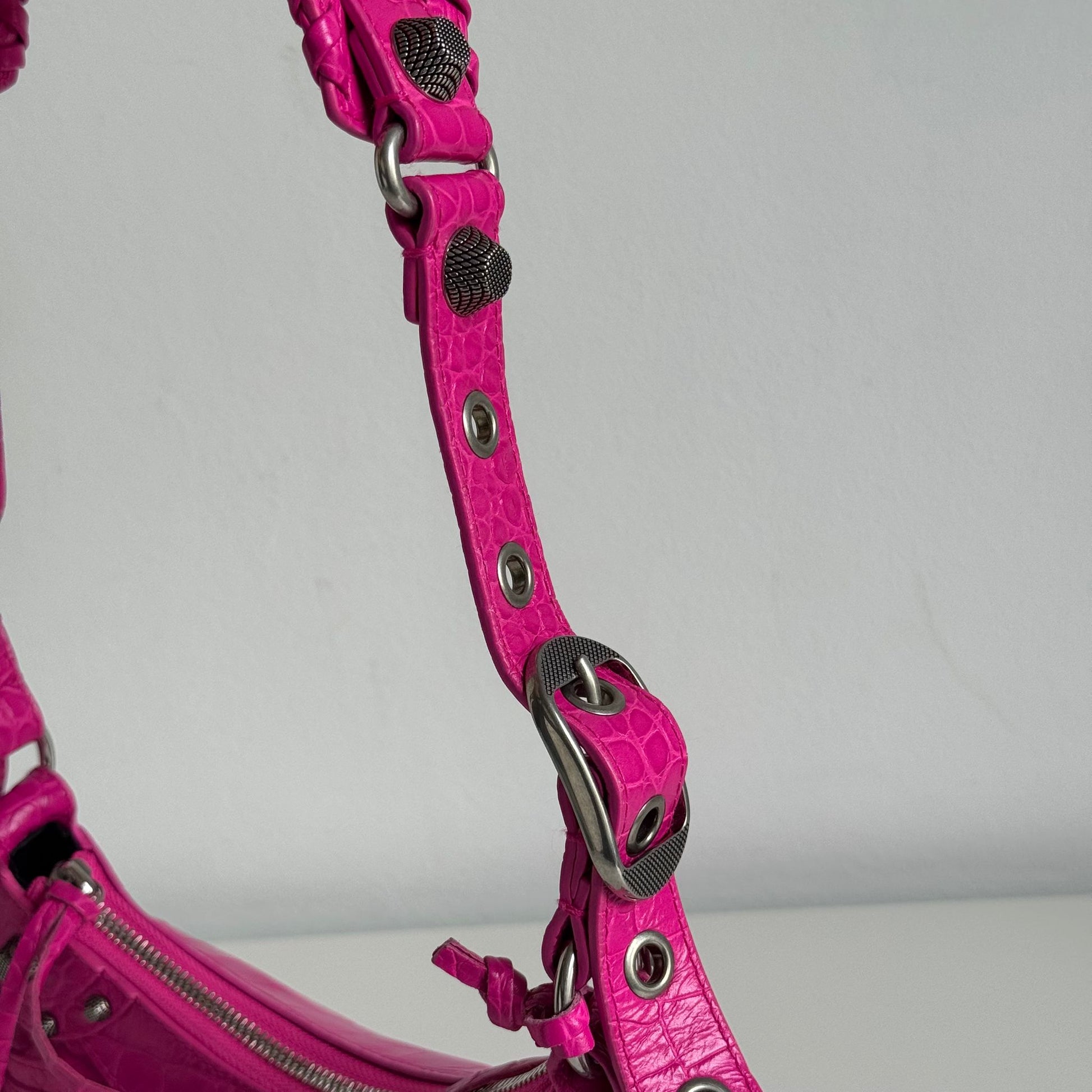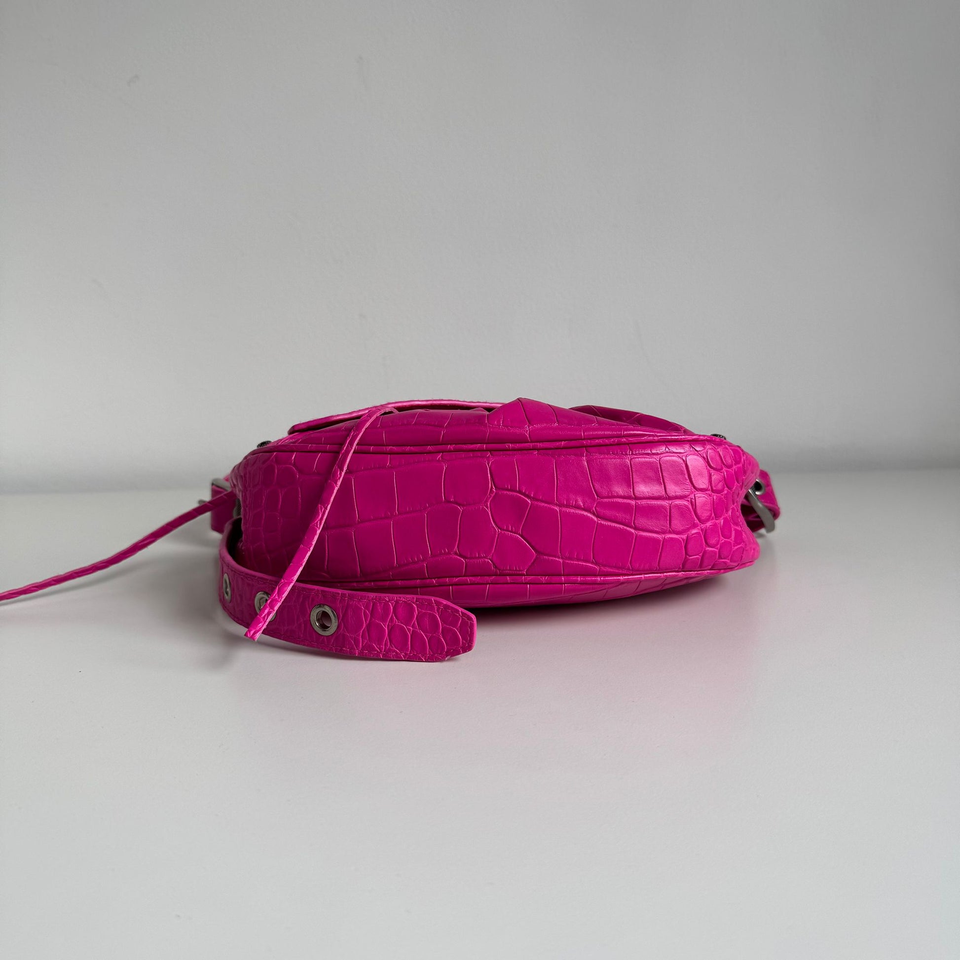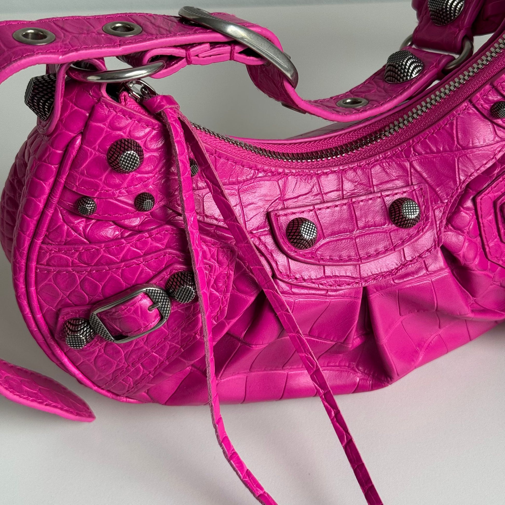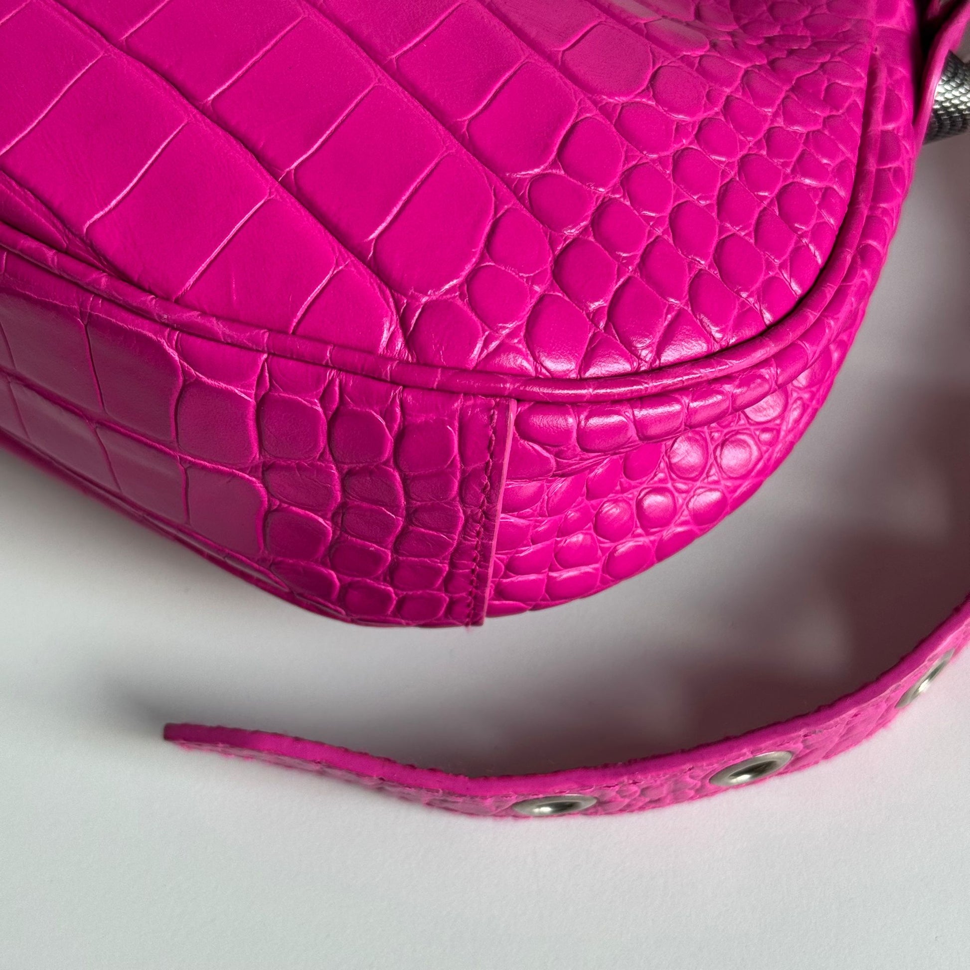 Iconica borsa Balenciaga modello Le Cagole XS in pelle croco fucsia con hardware argento. Si indossa a spalla e a tracolla grazie allo spallaccio regolabile.