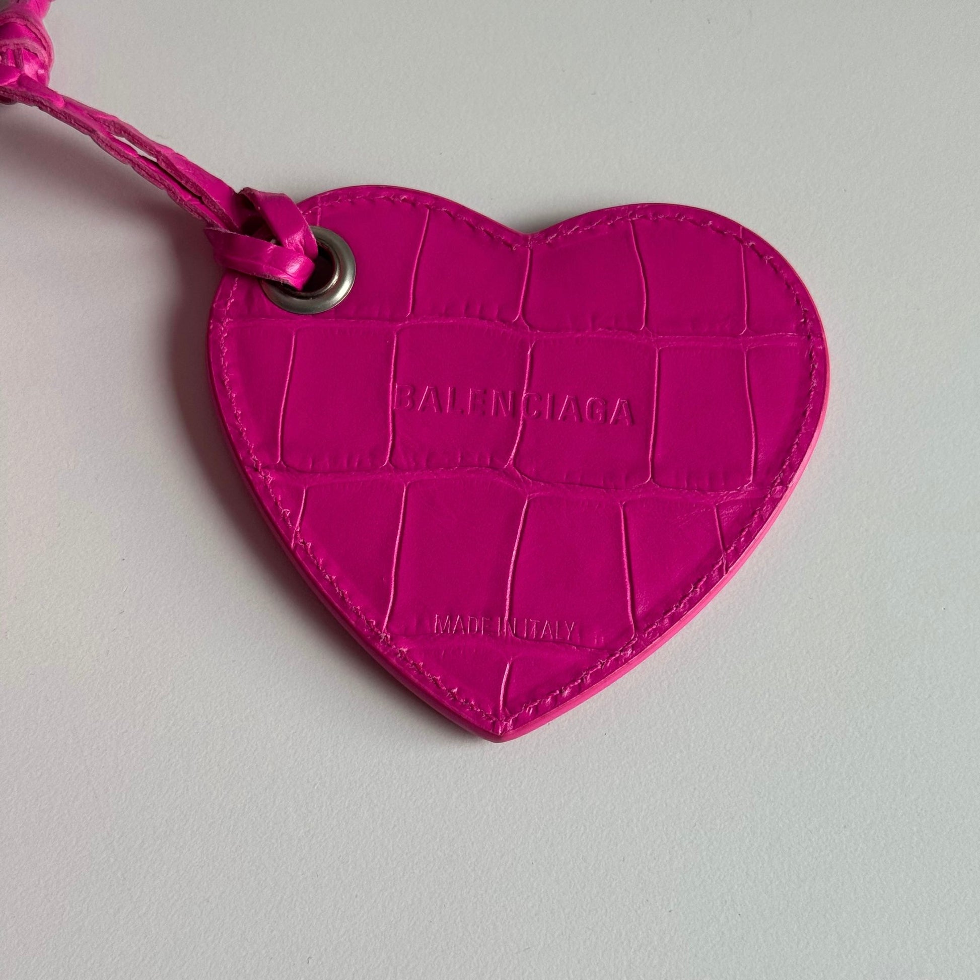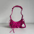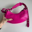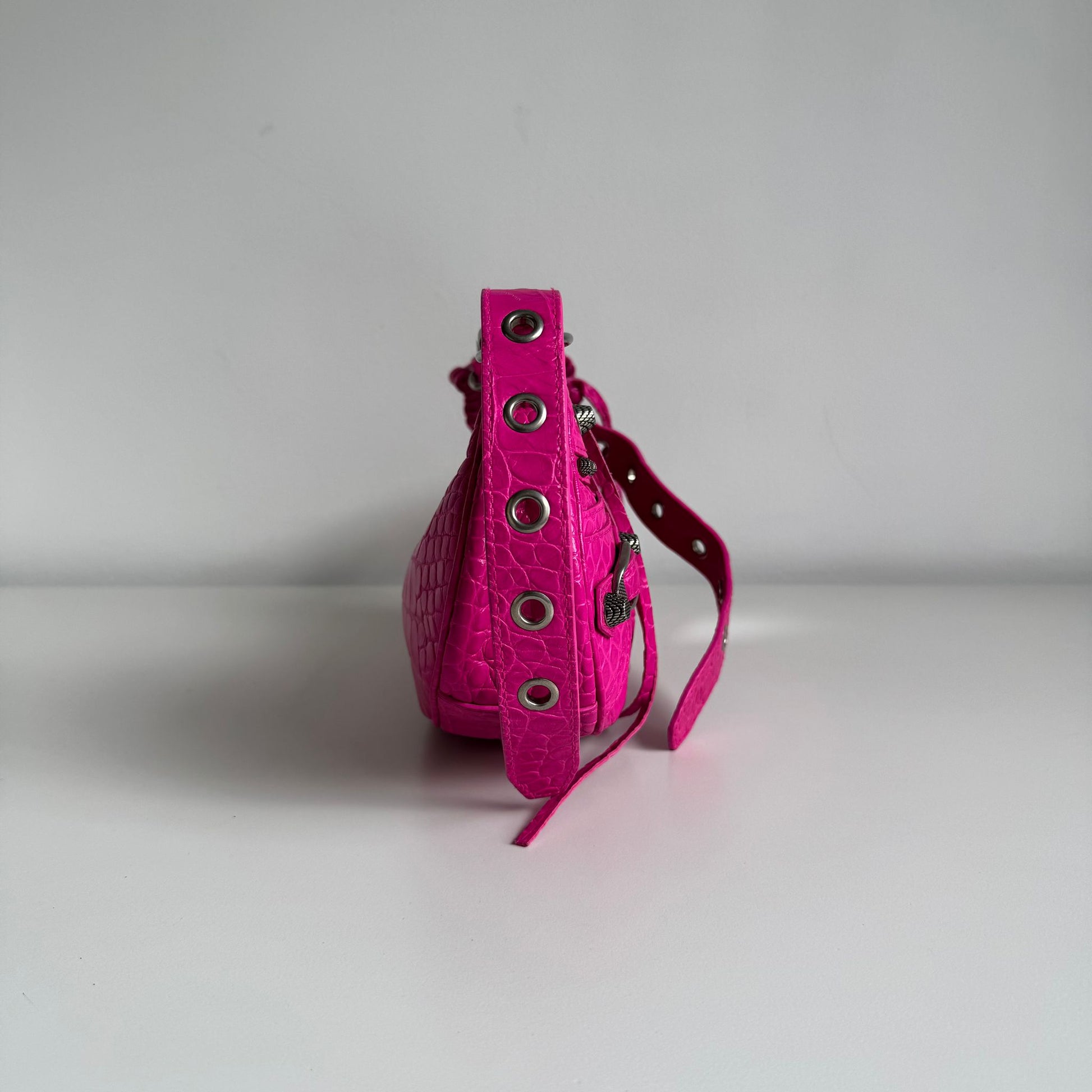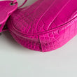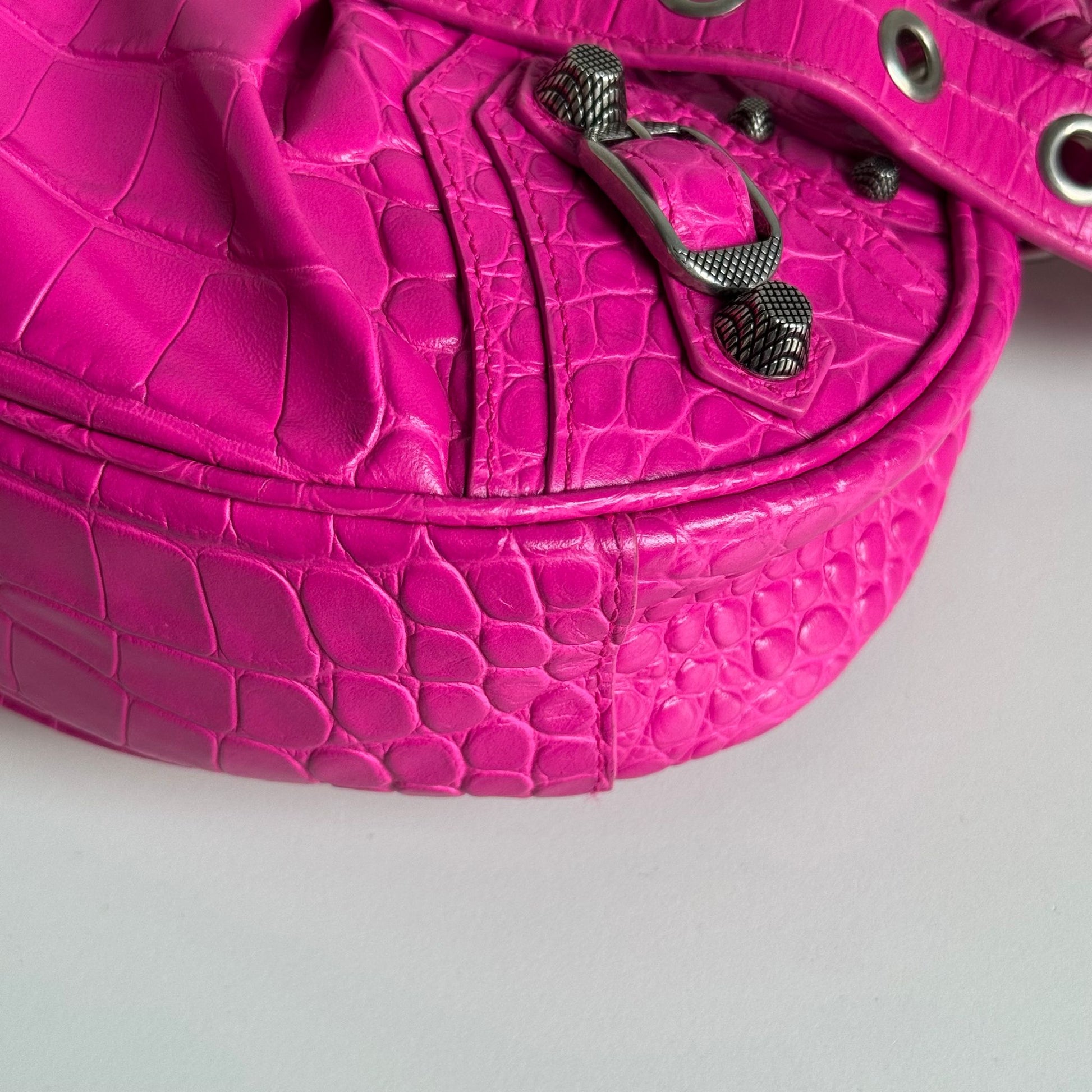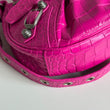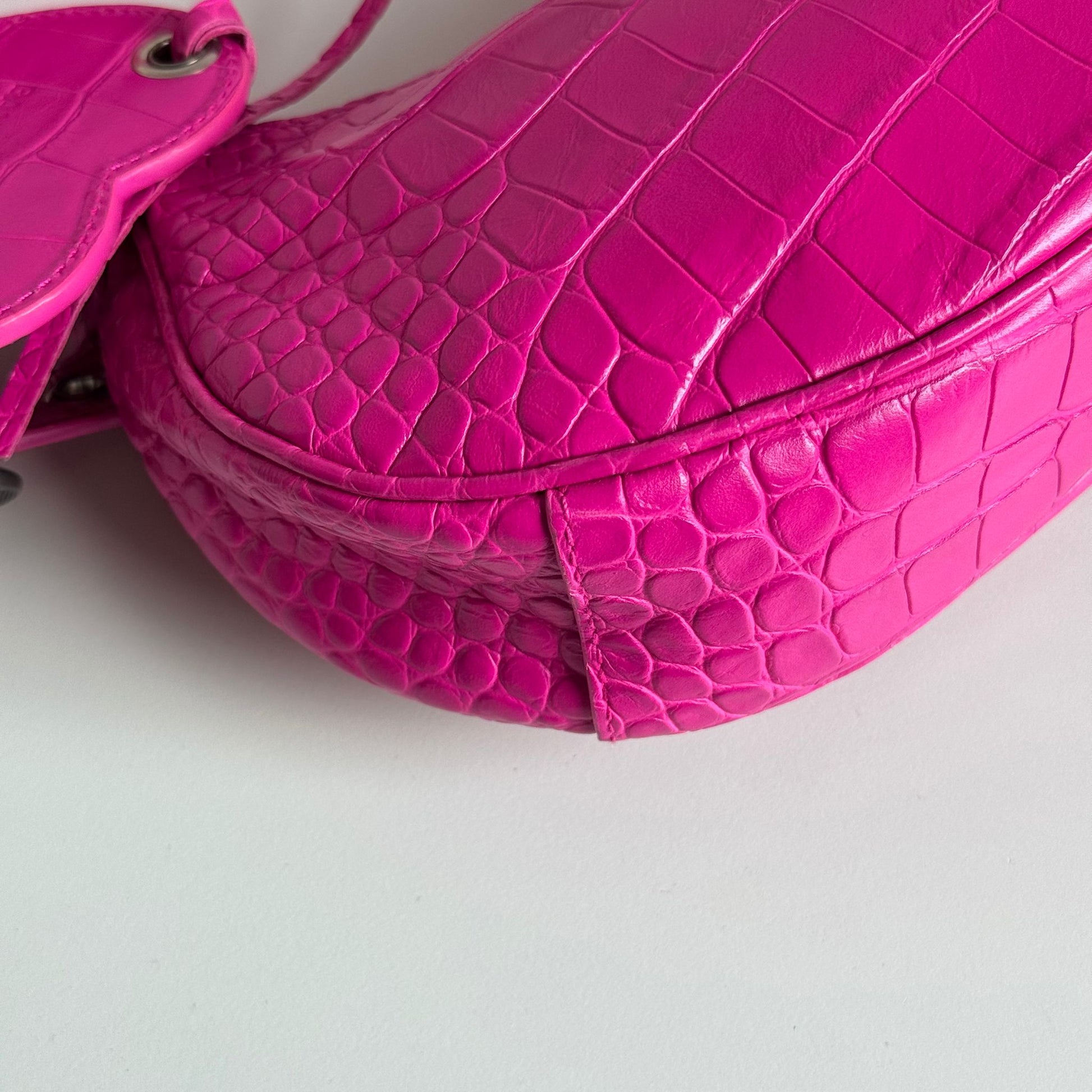 Iconica borsa Balenciaga modello Le Cagole XS in pelle croco fucsia con hardware argento. Si indossa a spalla e a tracolla grazie allo spallaccio regolabile.