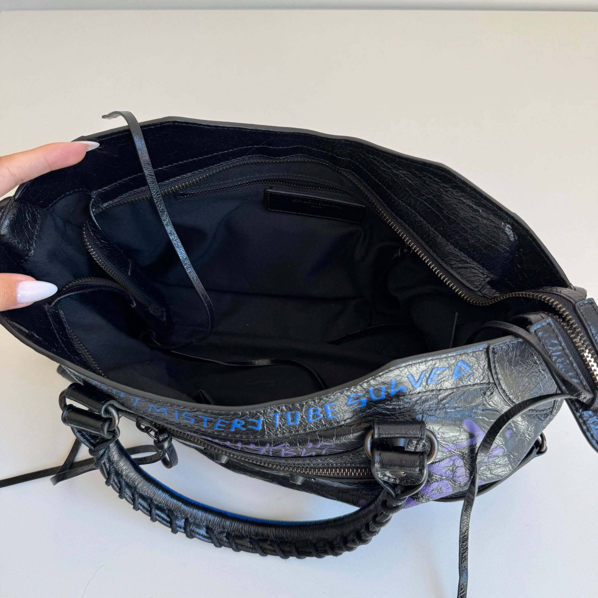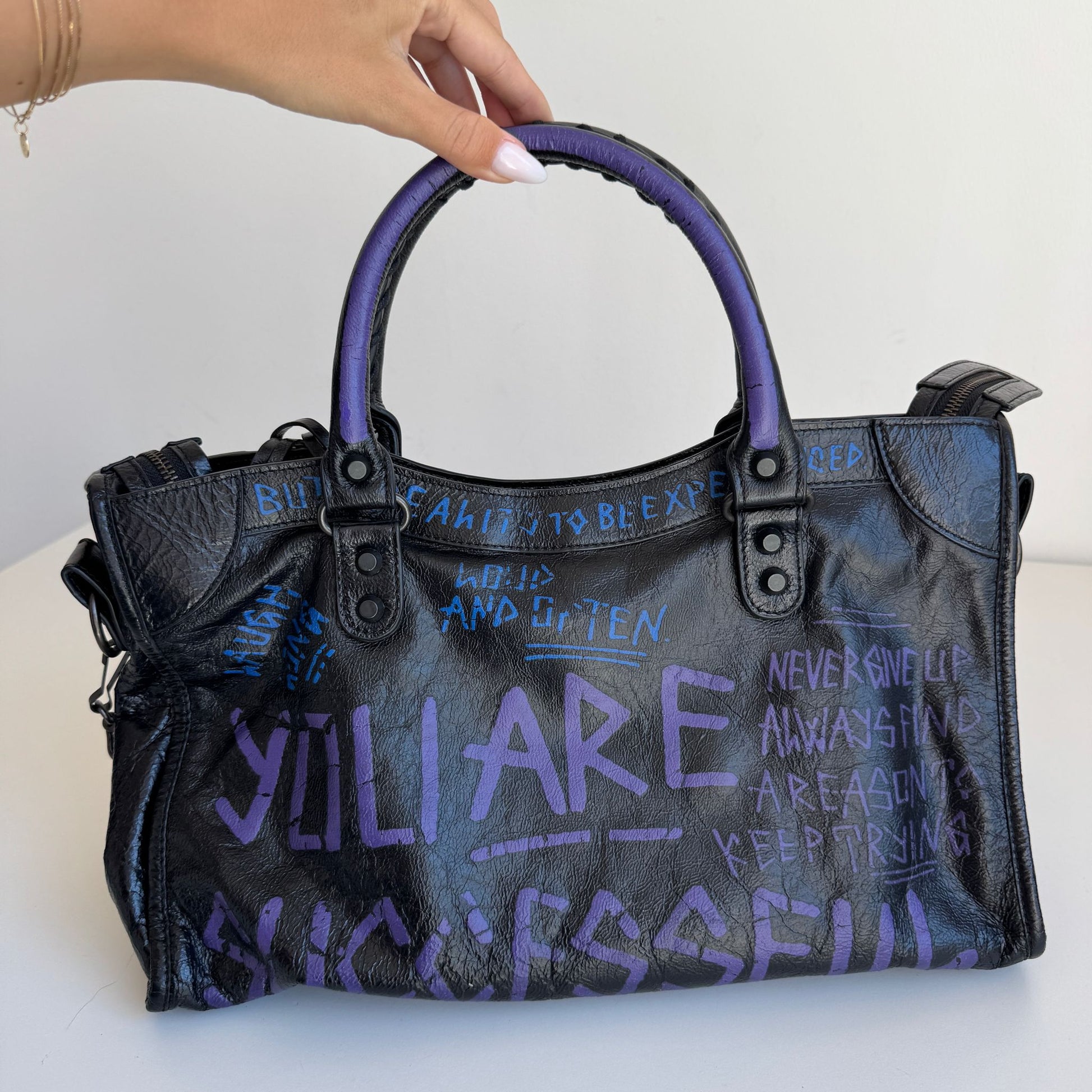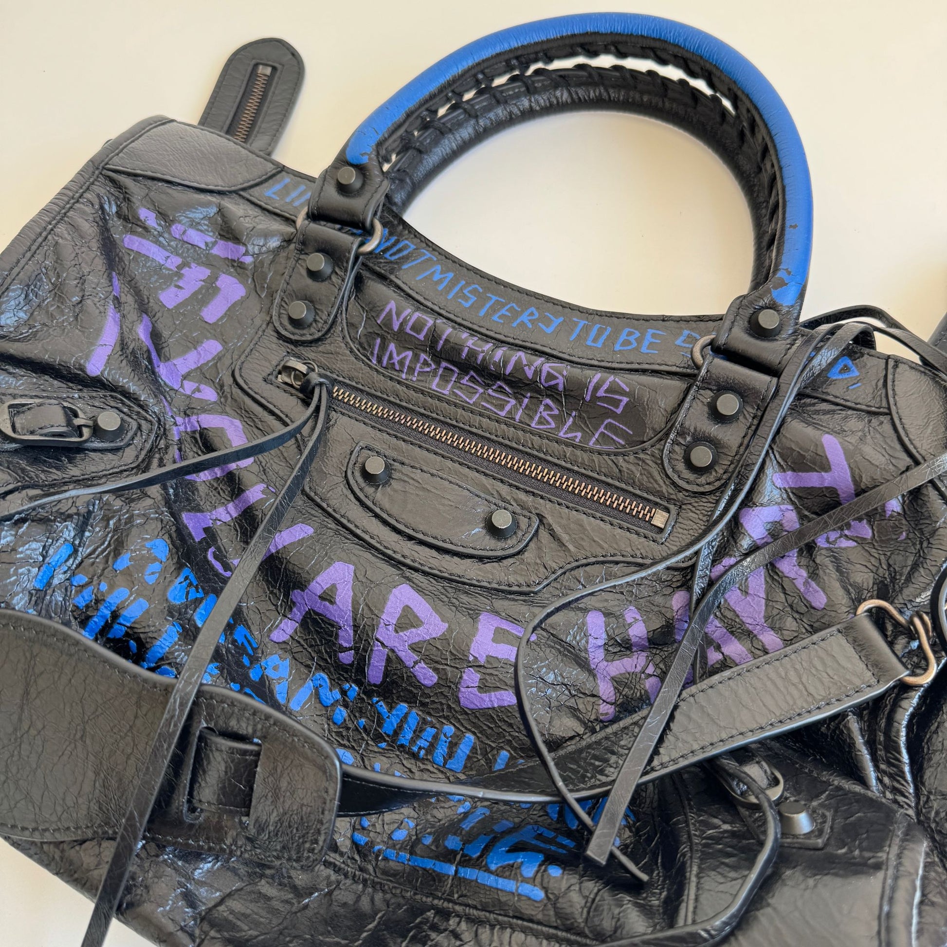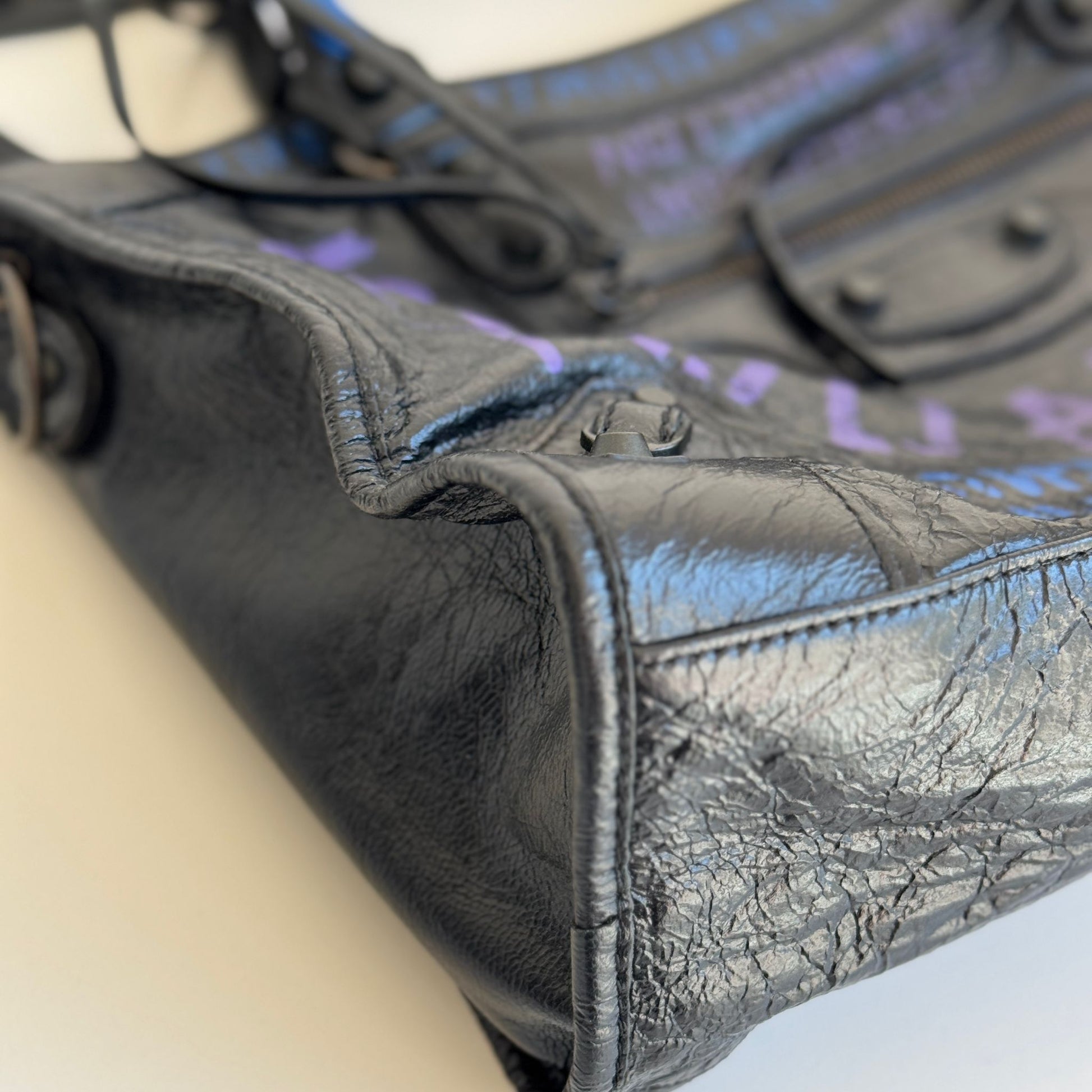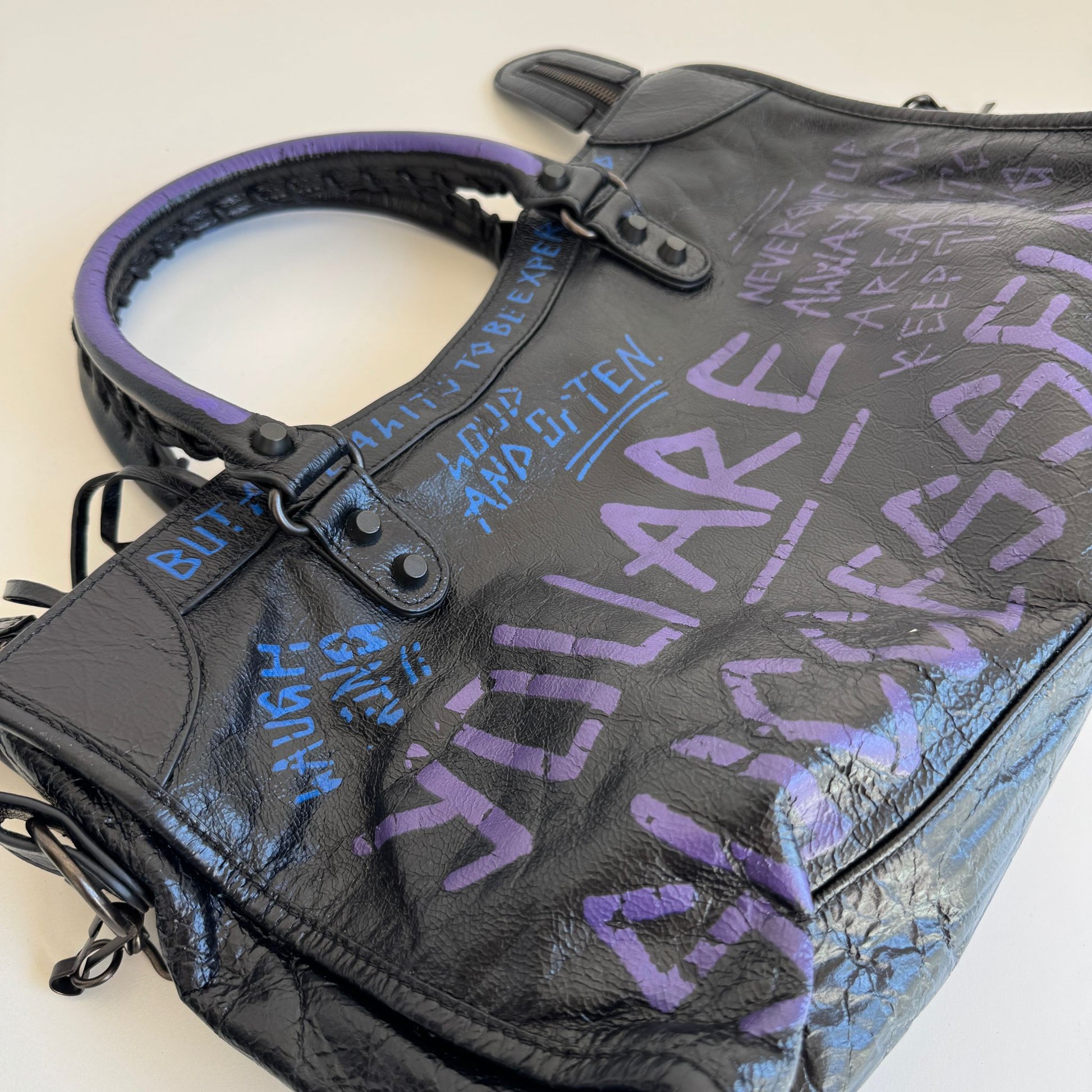 Stupenda borsa Balenciaga City Graffiti in pelle nera effetto used con grafiche blu-viola. Si indossa a mano e a spalla. La tracolla é rimovibile e non regolabile.