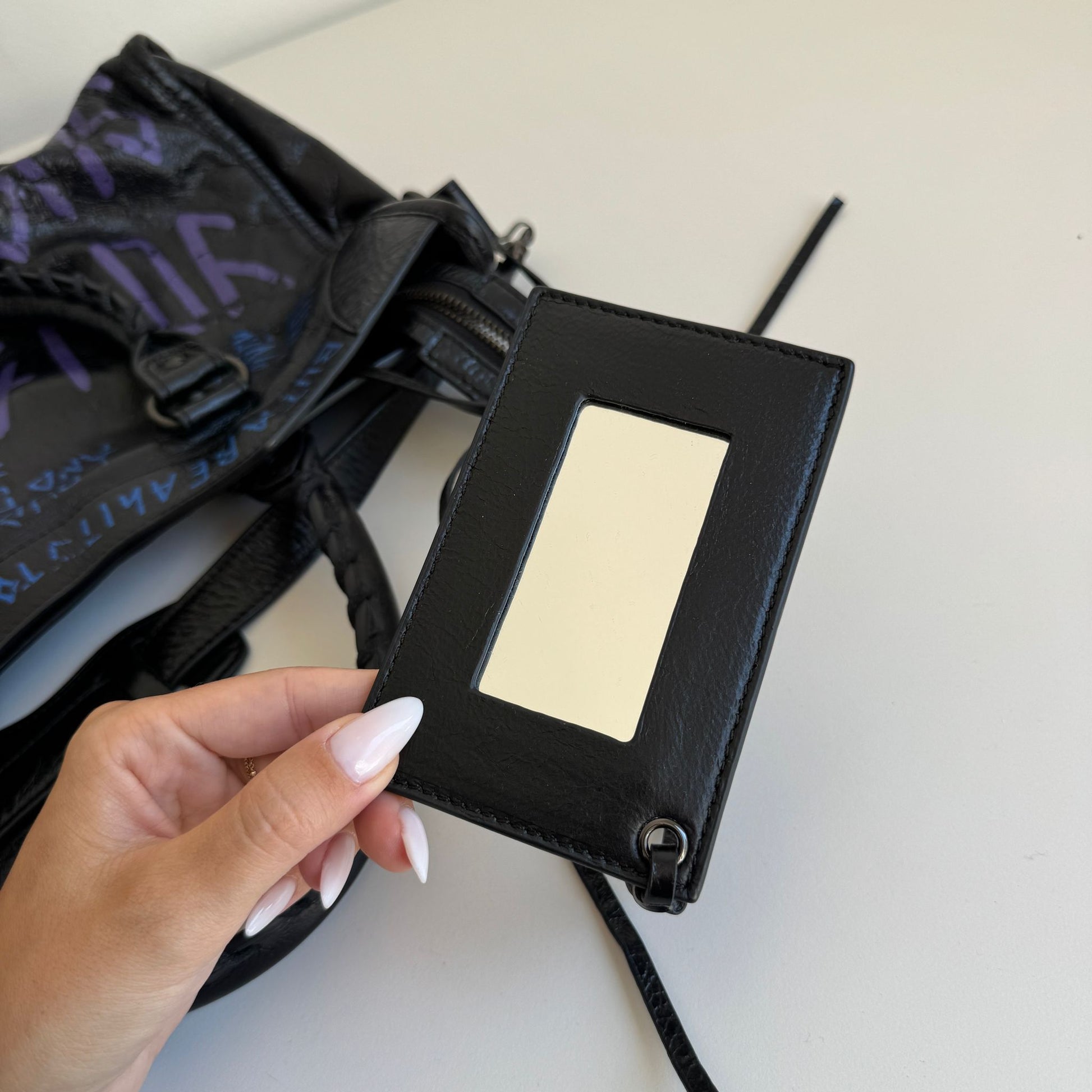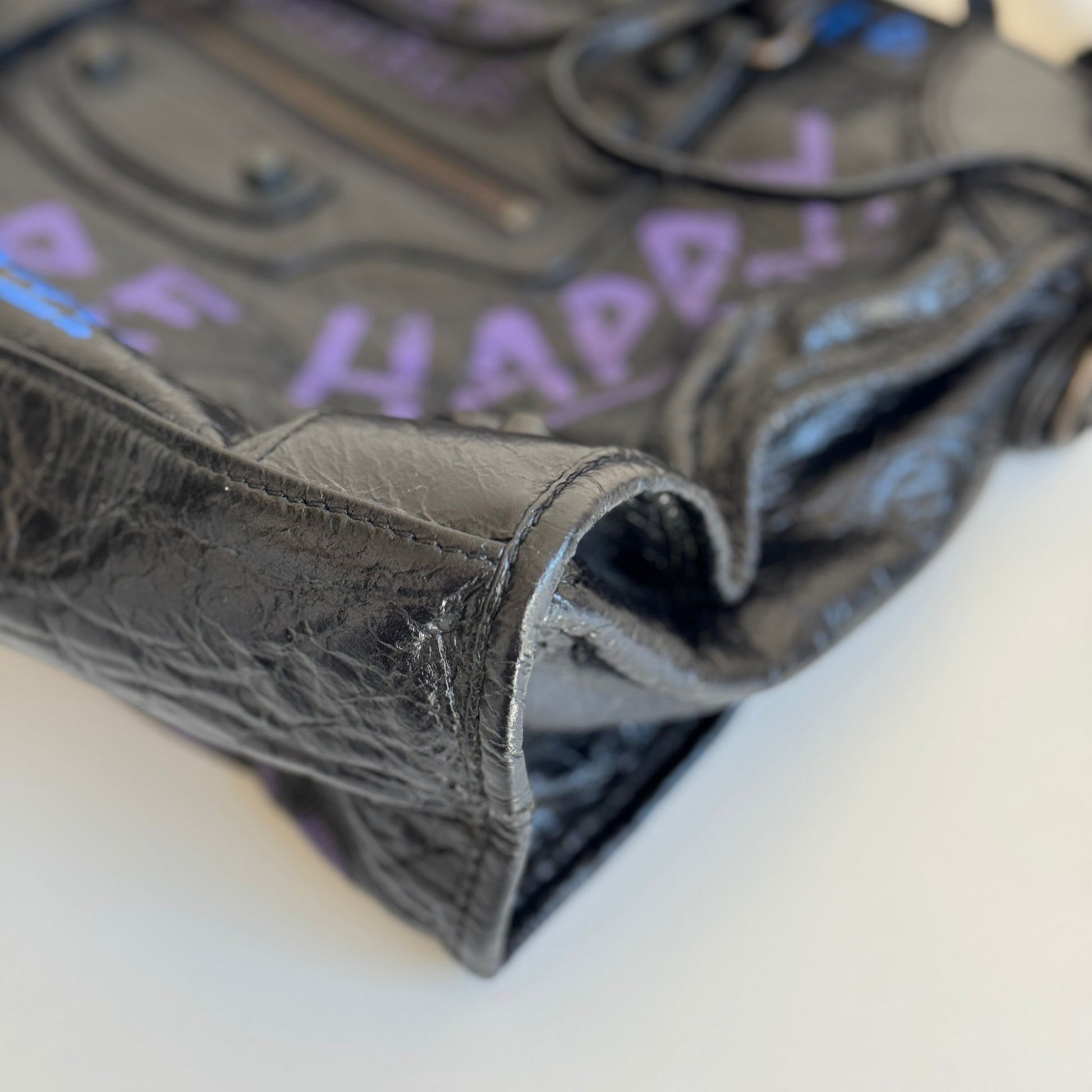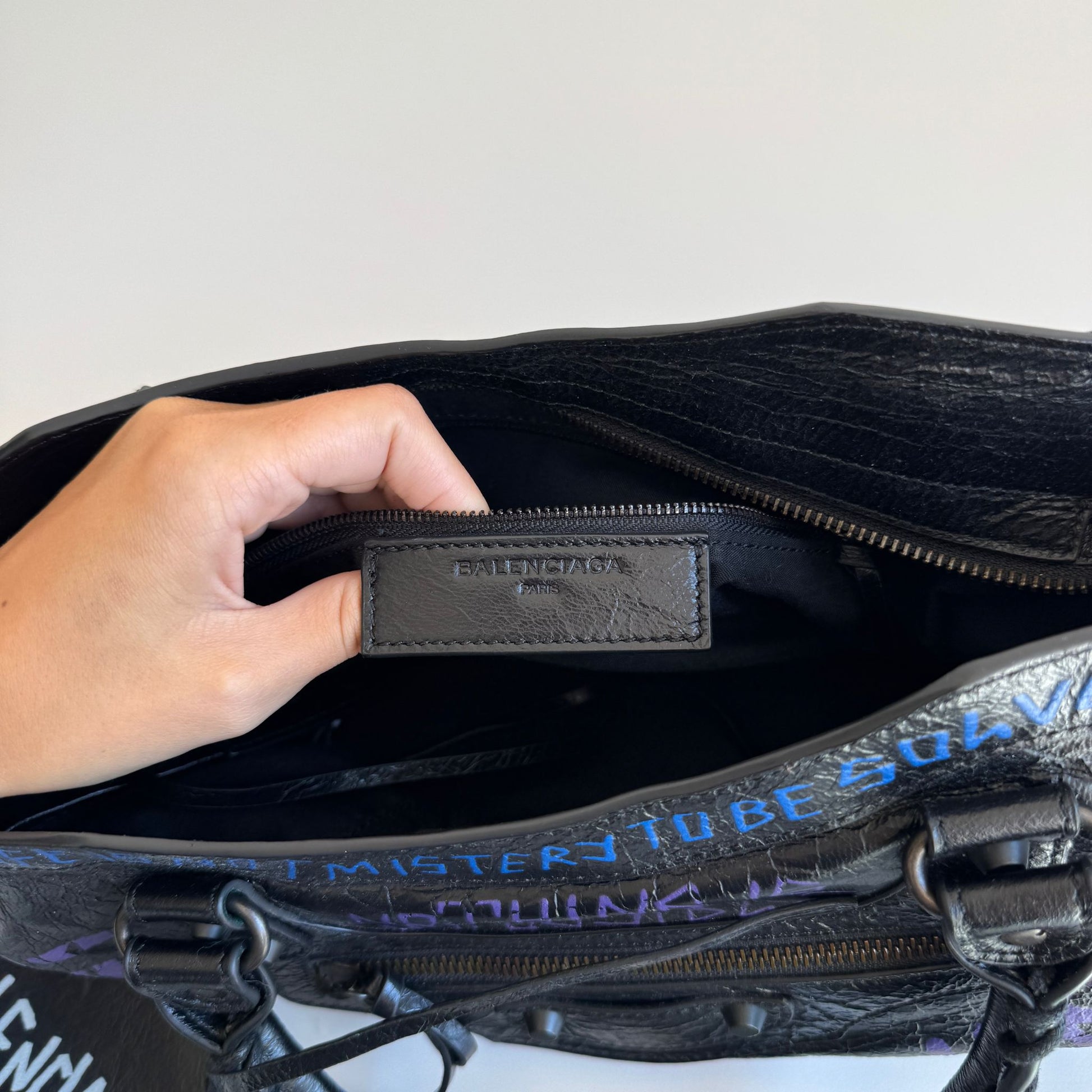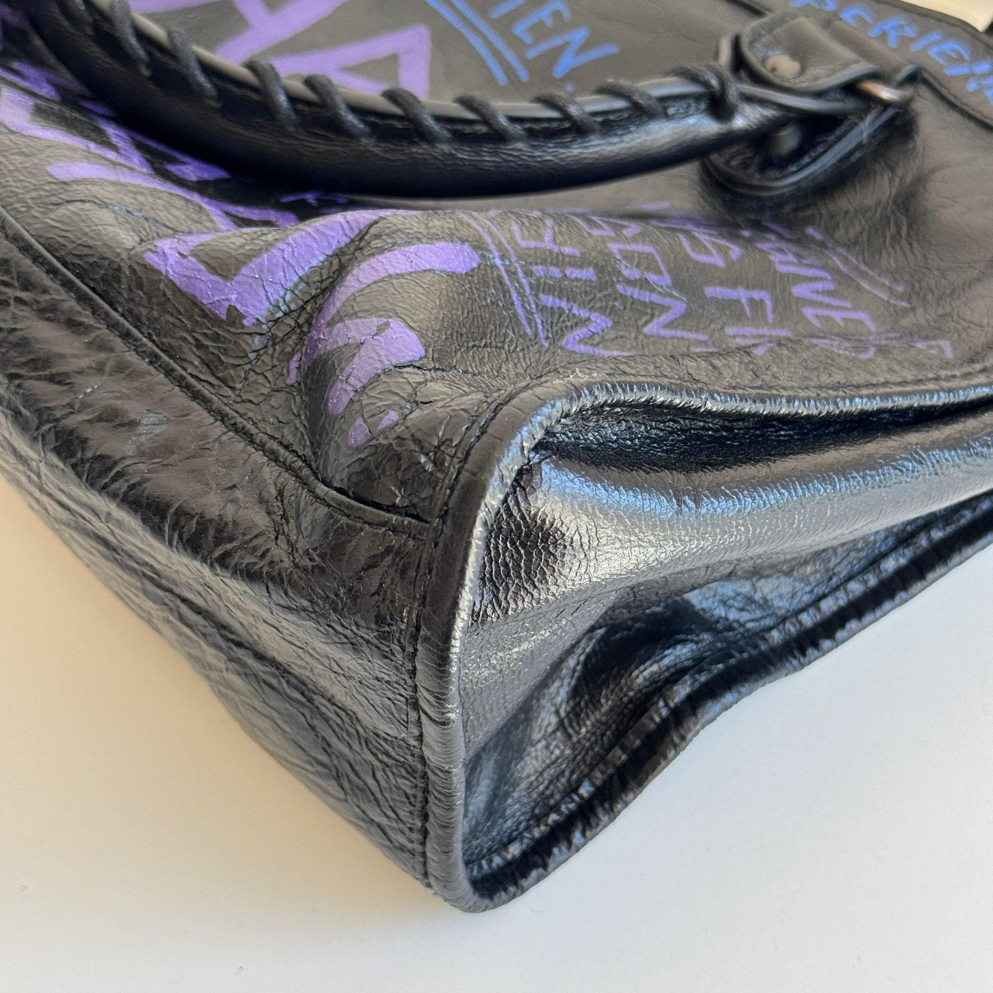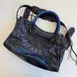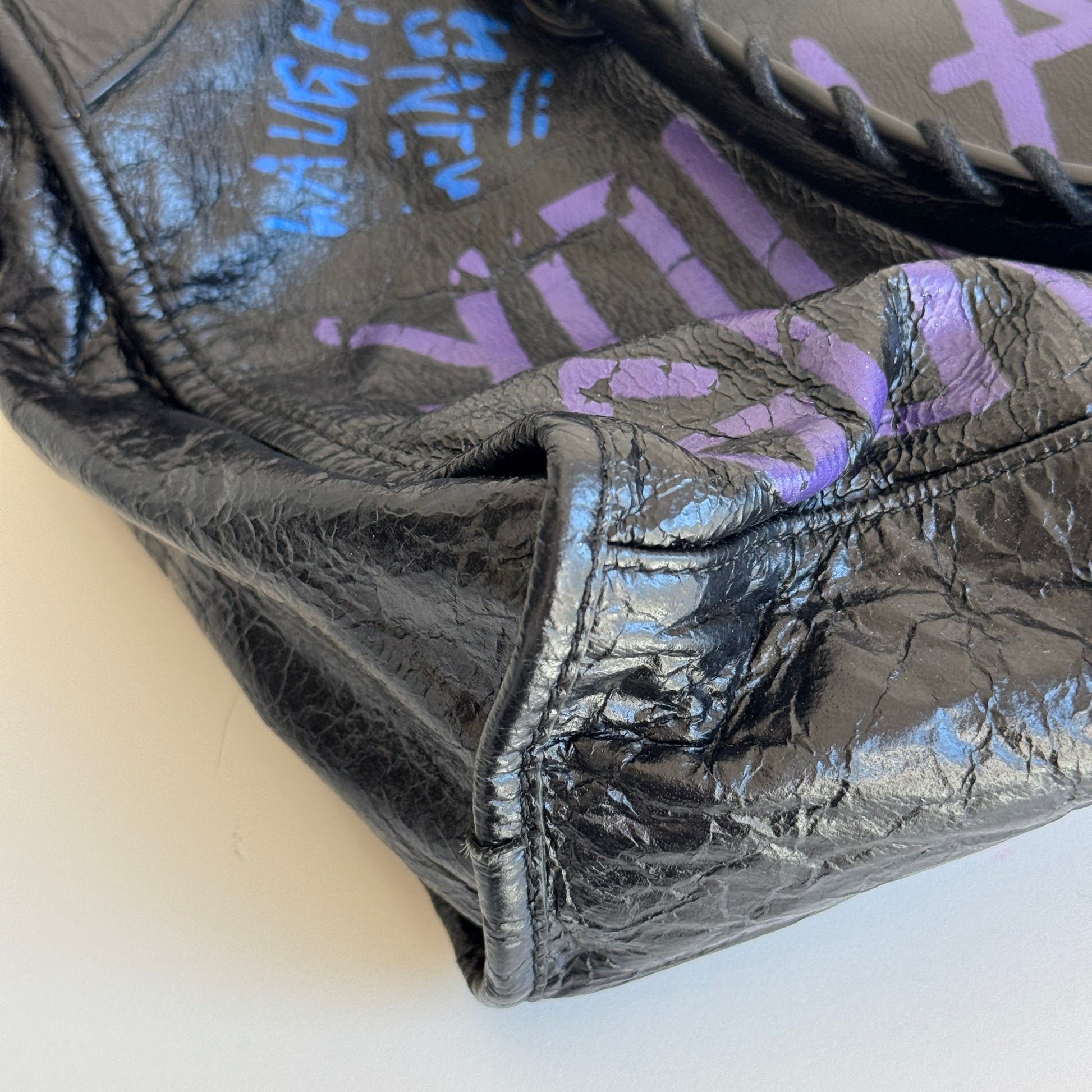 Stupenda borsa Balenciaga City Graffiti in pelle nera effetto used con grafiche blu-viola. Si indossa a mano e a spalla. La tracolla é rimovibile e non regolabile.