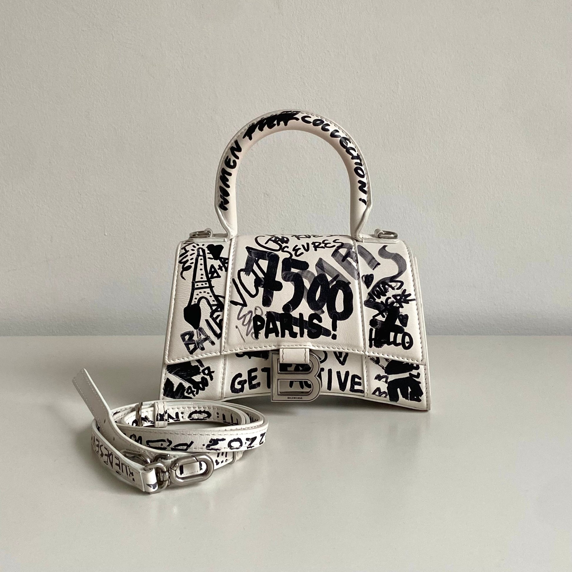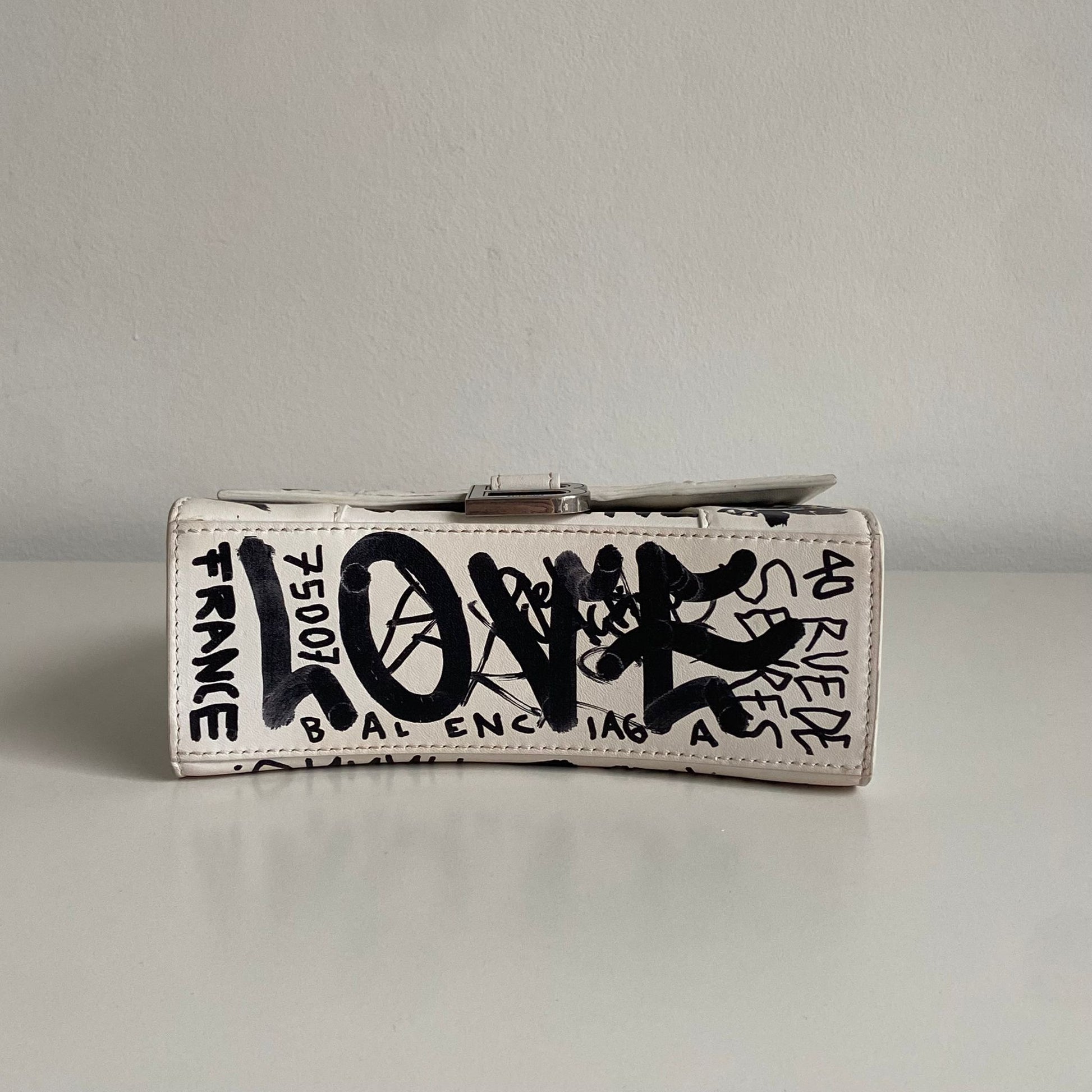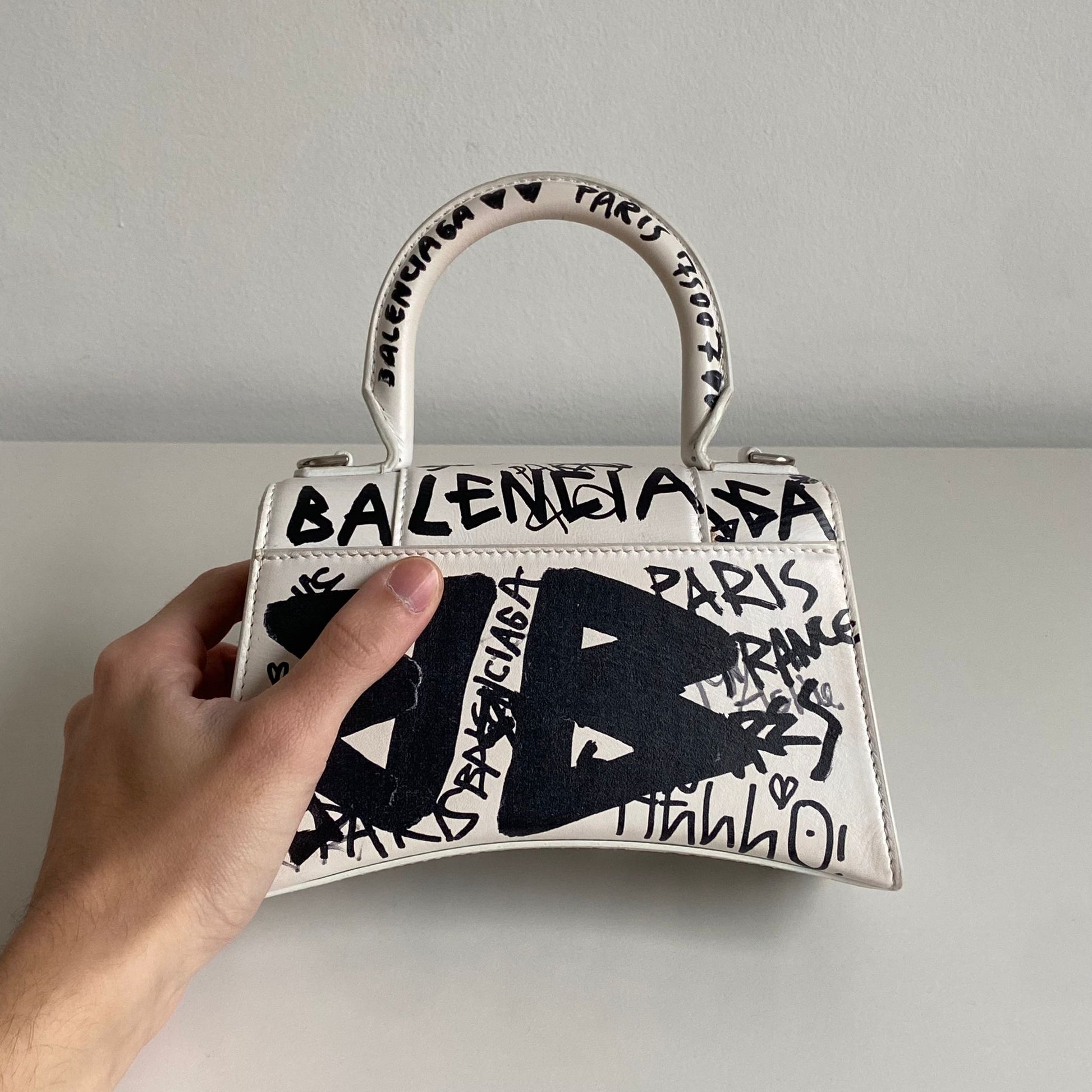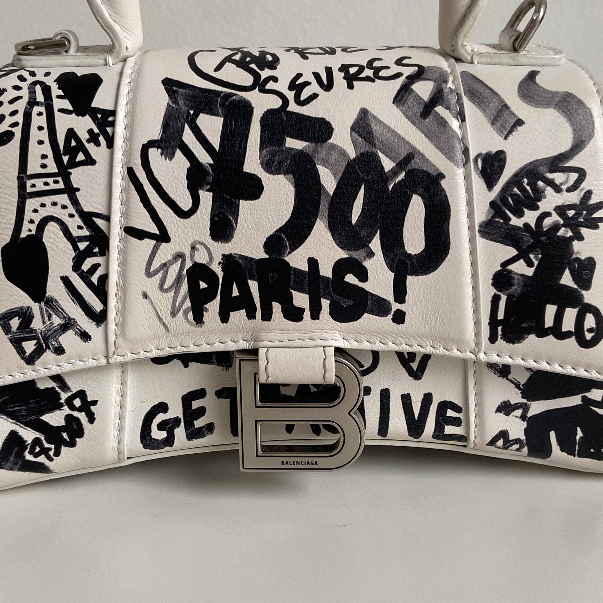 Bellissima Balenciaga modello Hourglass in pelle liscia bianca edizione Graffiti e hardware argento. Tracolla regolabile e rimovibile.