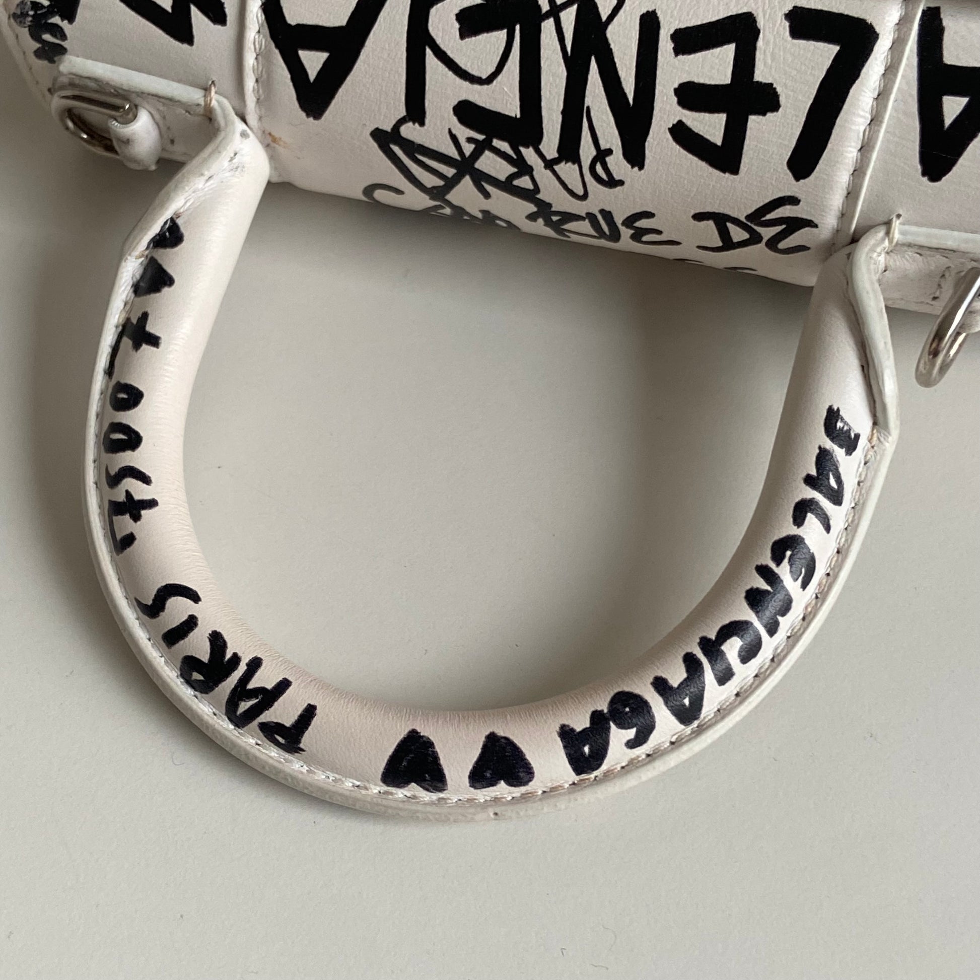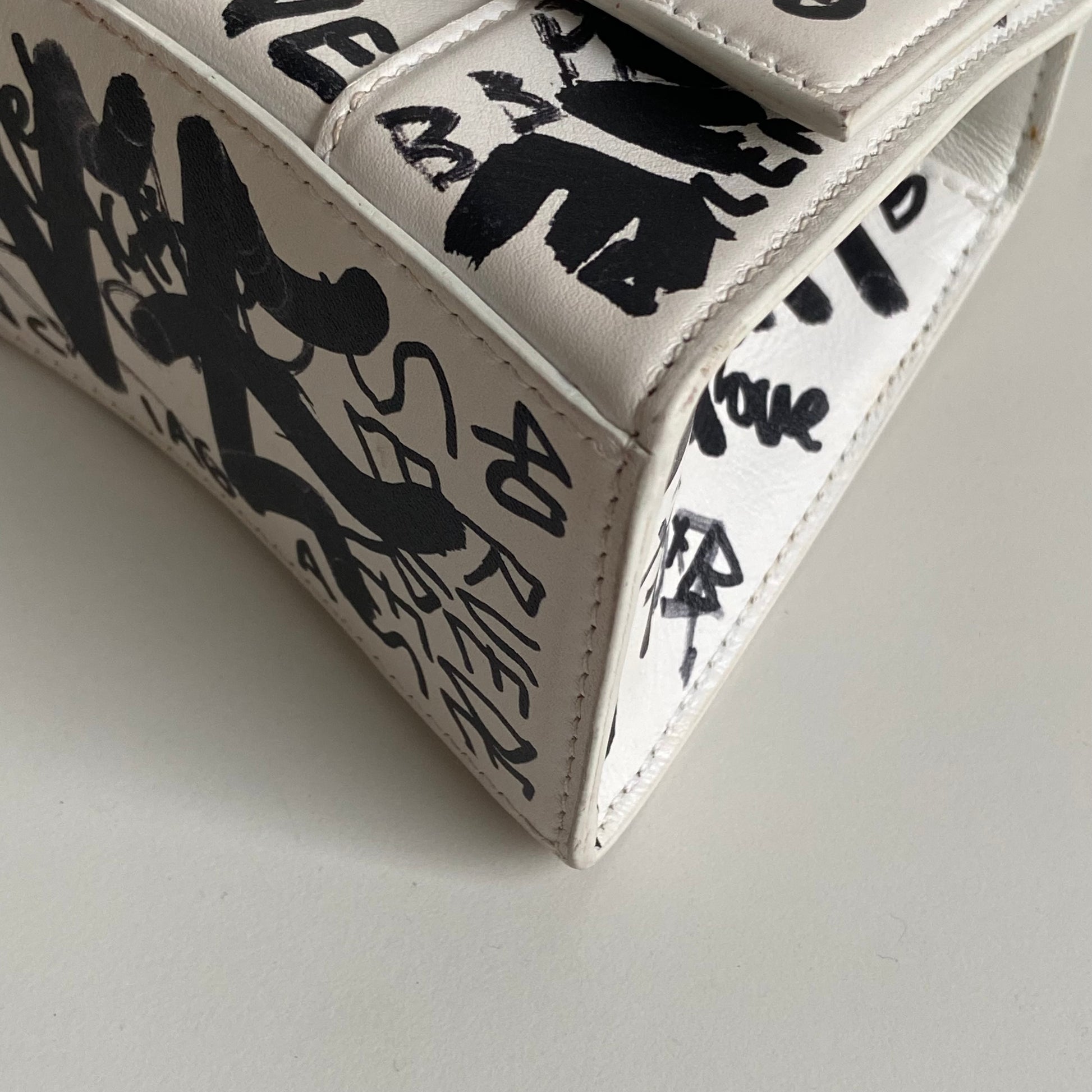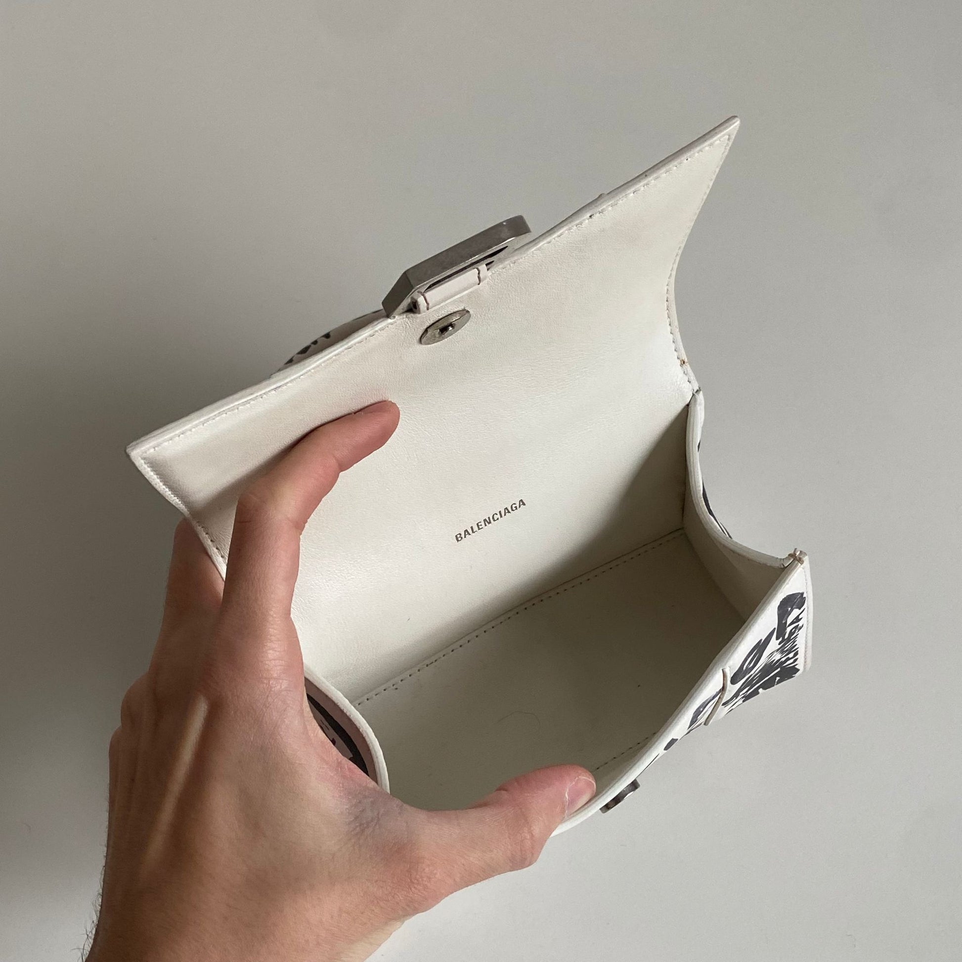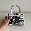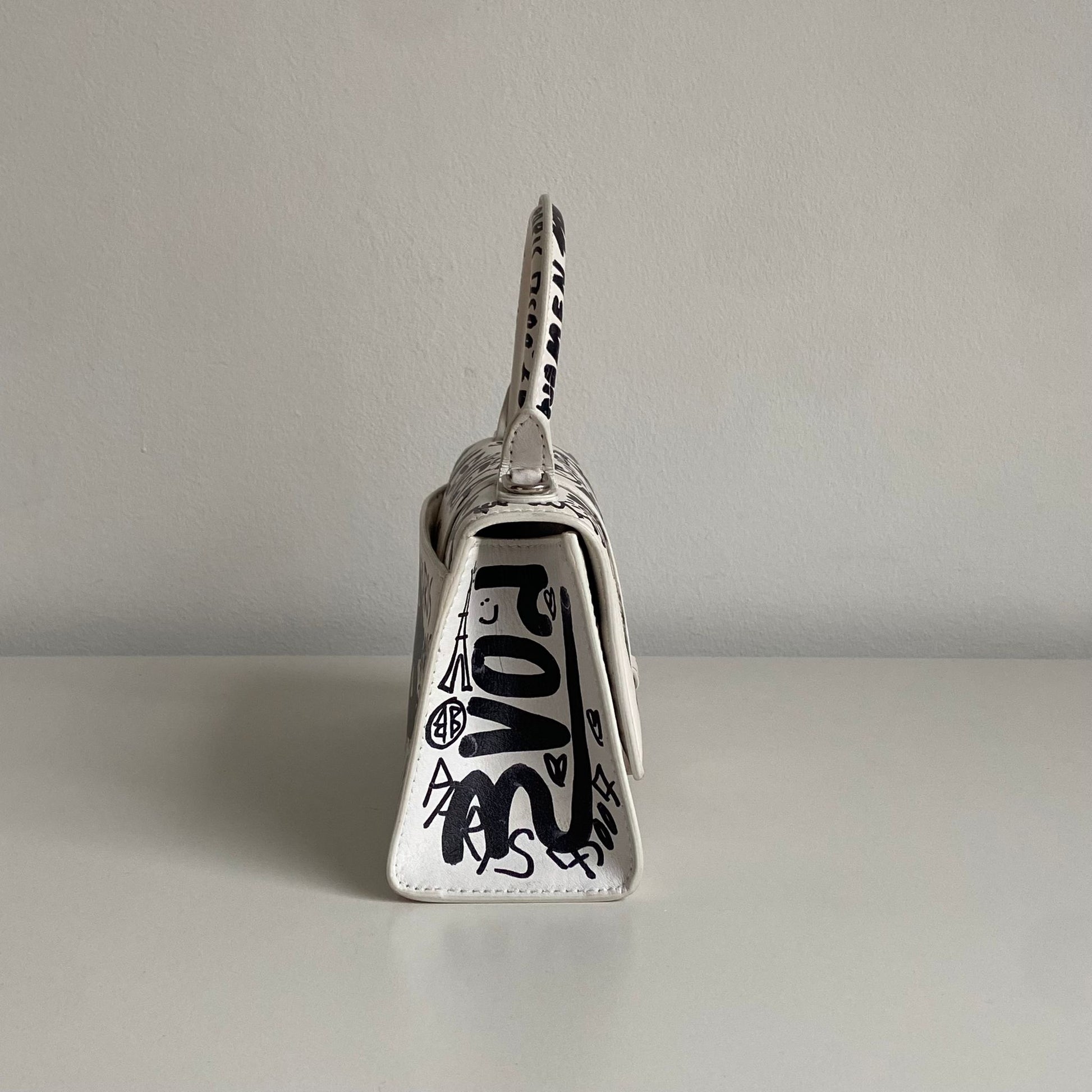 Bellissima Balenciaga modello Hourglass in pelle liscia bianca edizione Graffiti e hardware argento. Tracolla regolabile e rimovibile.