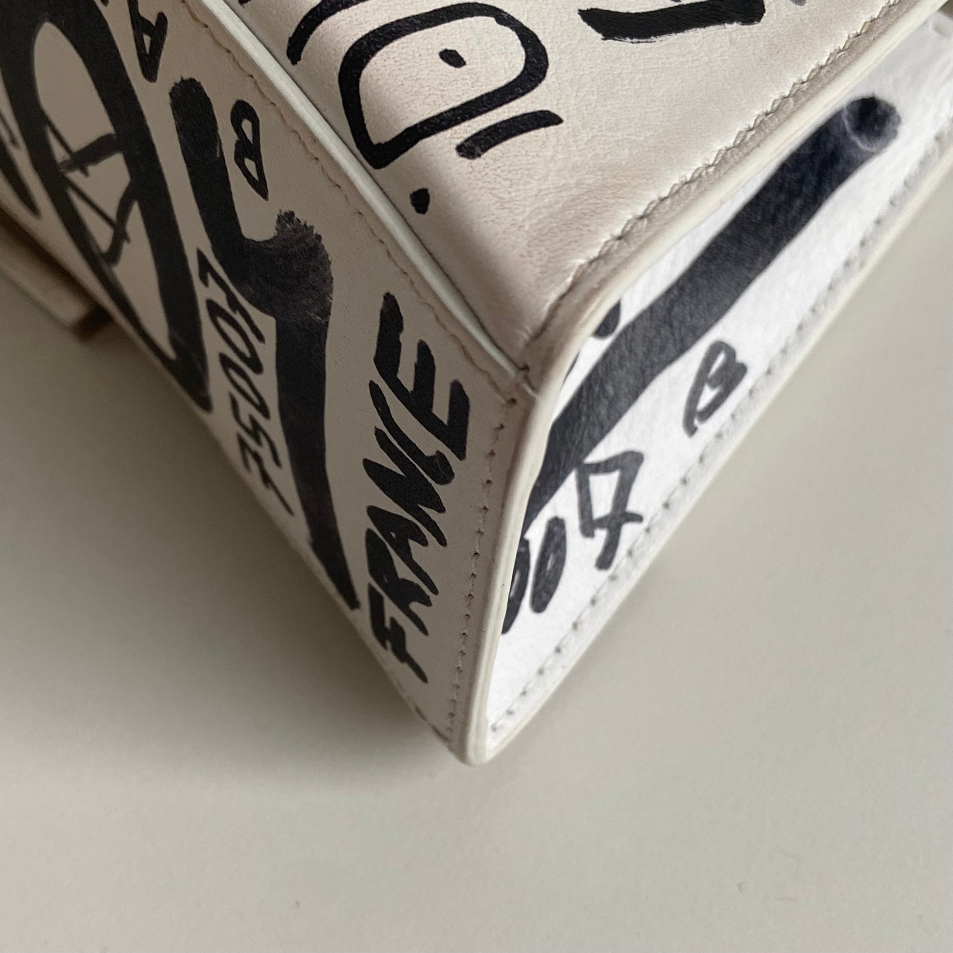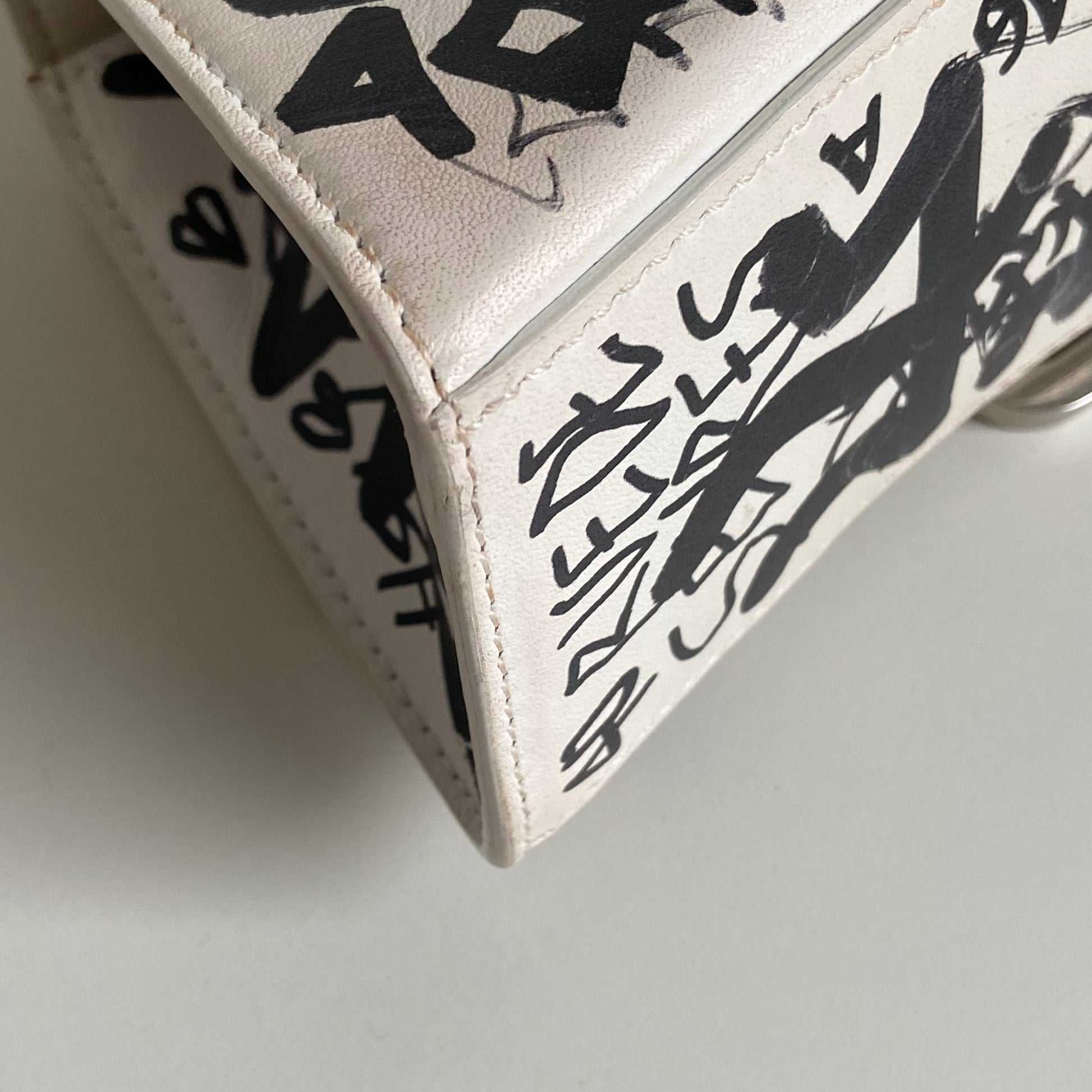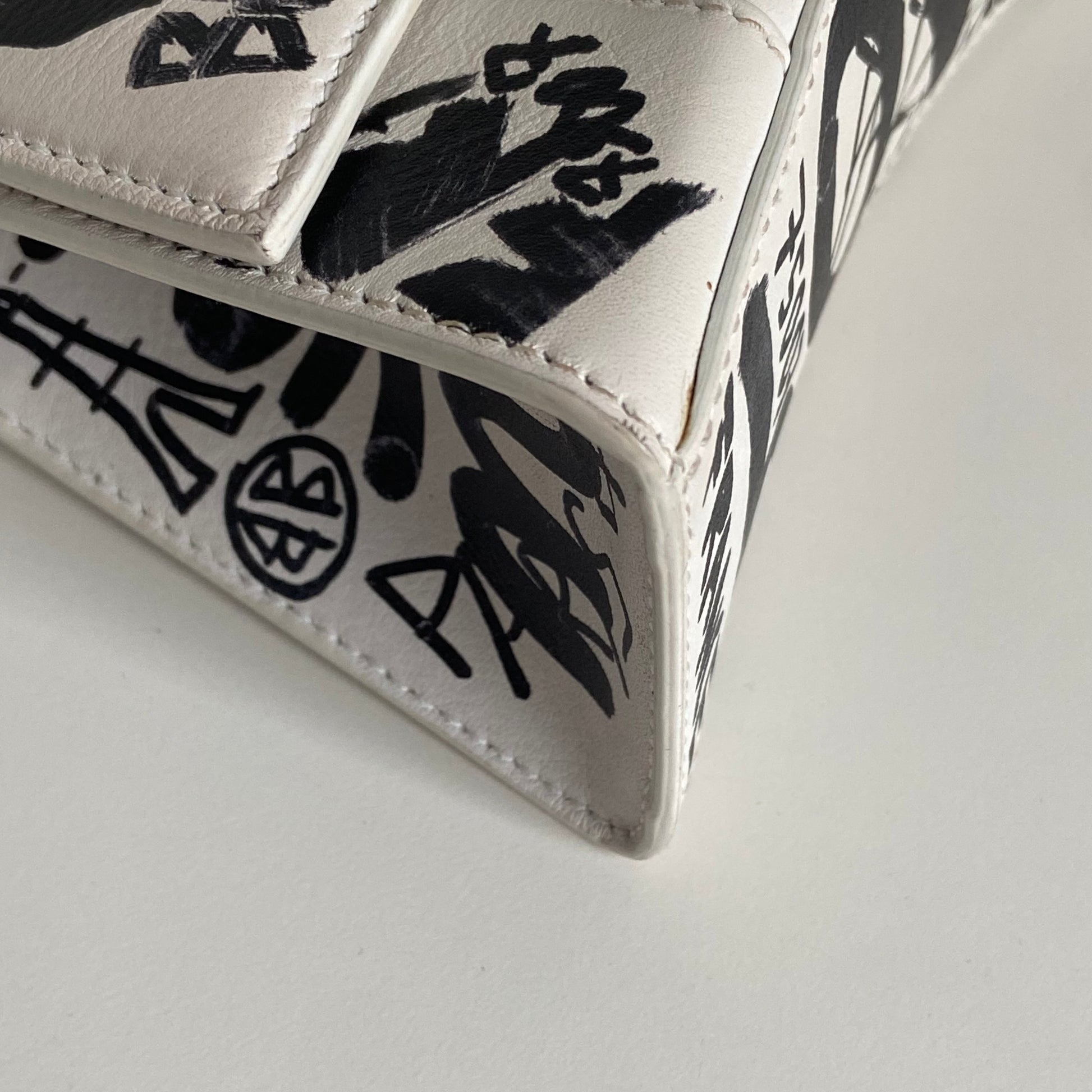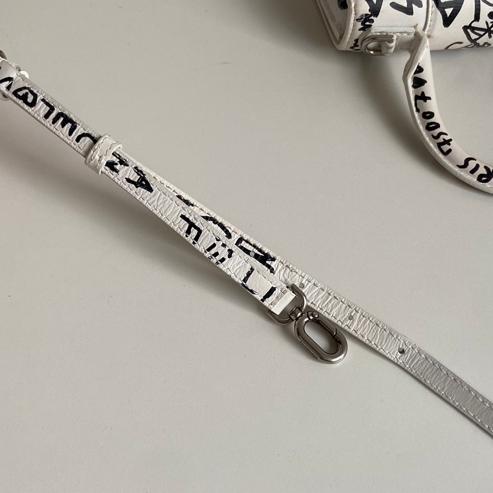 Bellissima Balenciaga modello Hourglass in pelle liscia bianca edizione Graffiti e hardware argento. Tracolla regolabile e rimovibile.