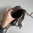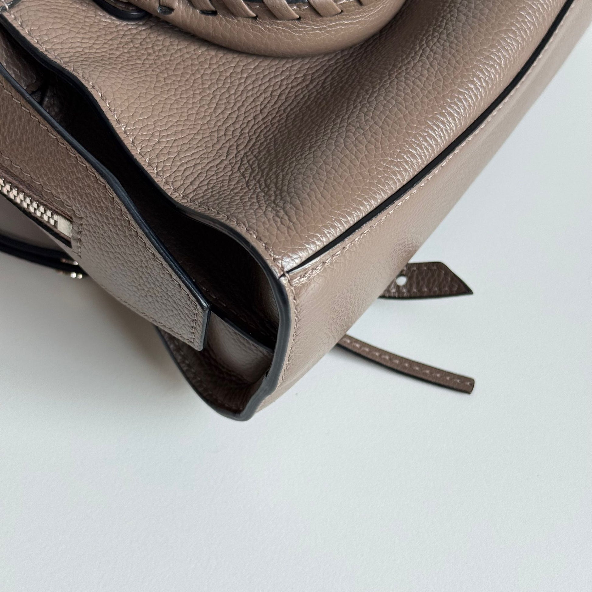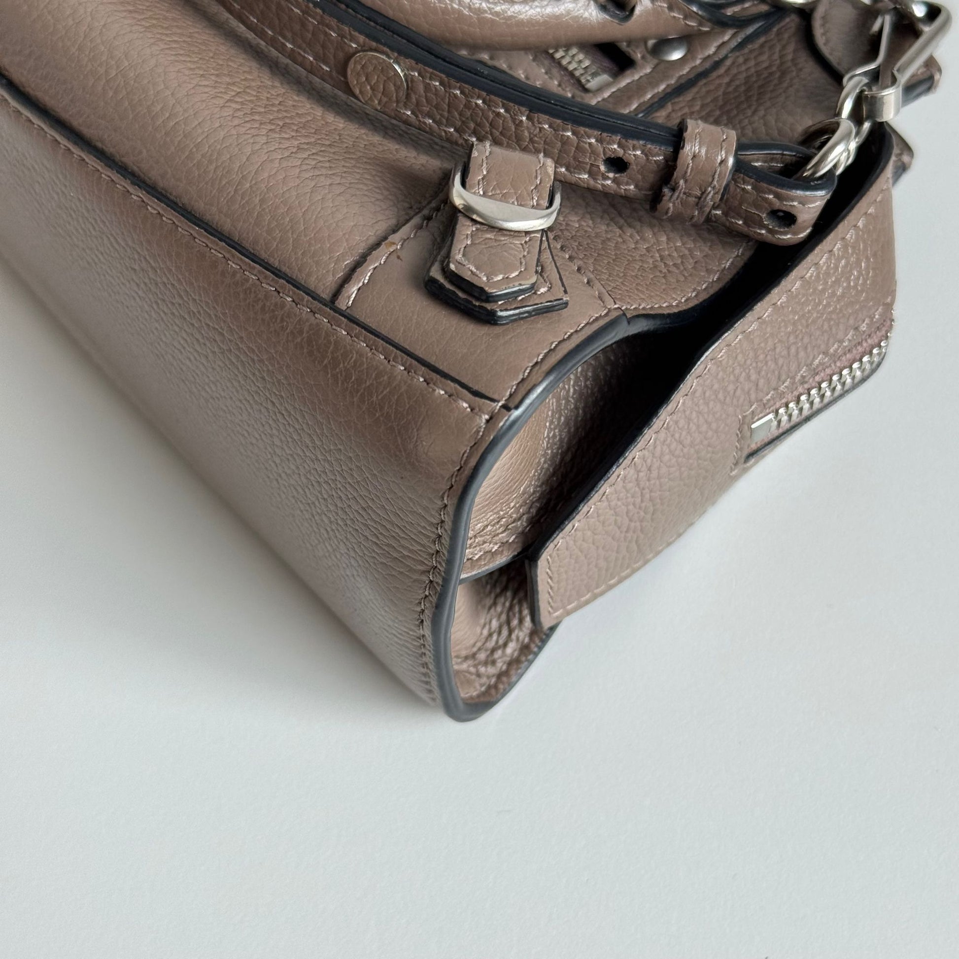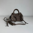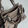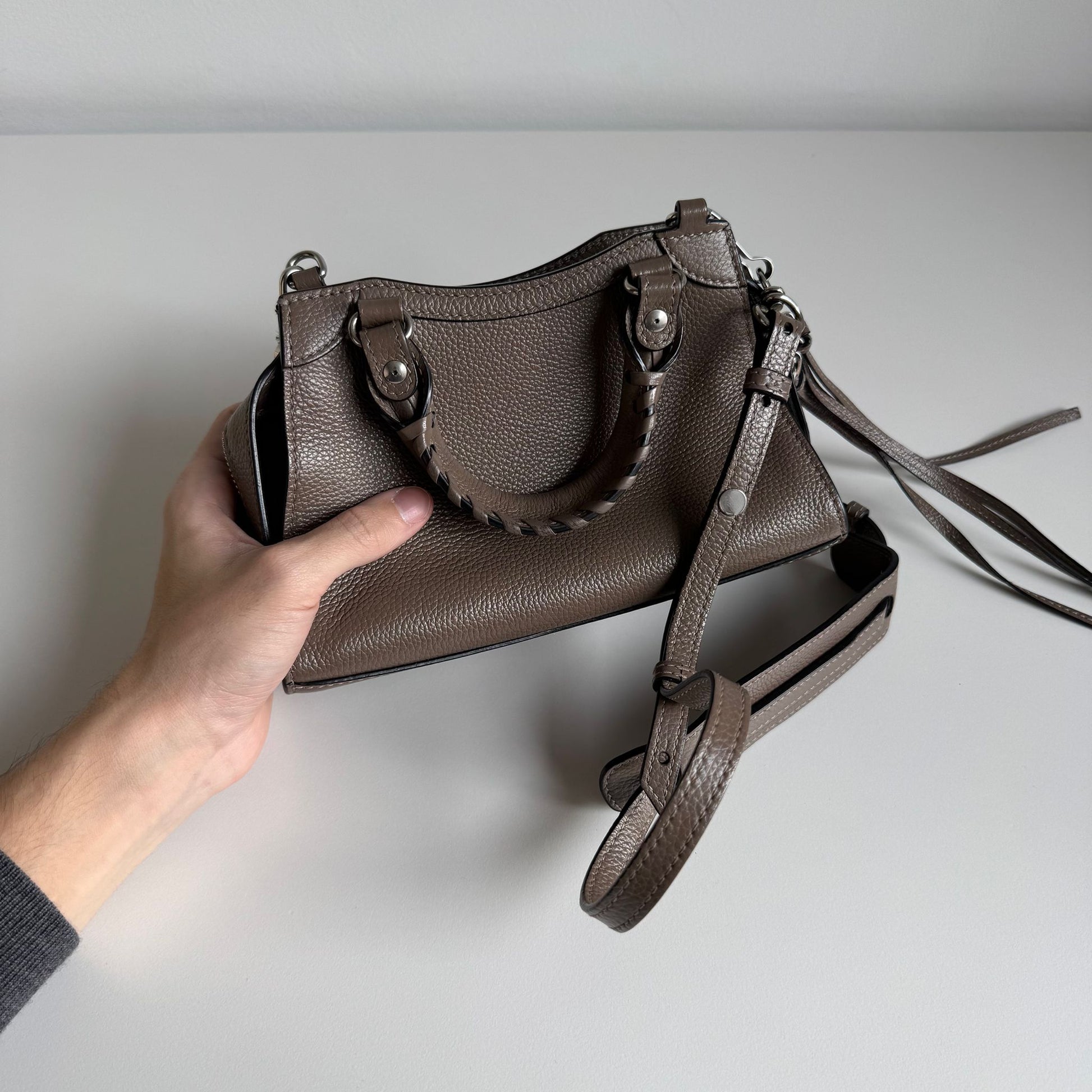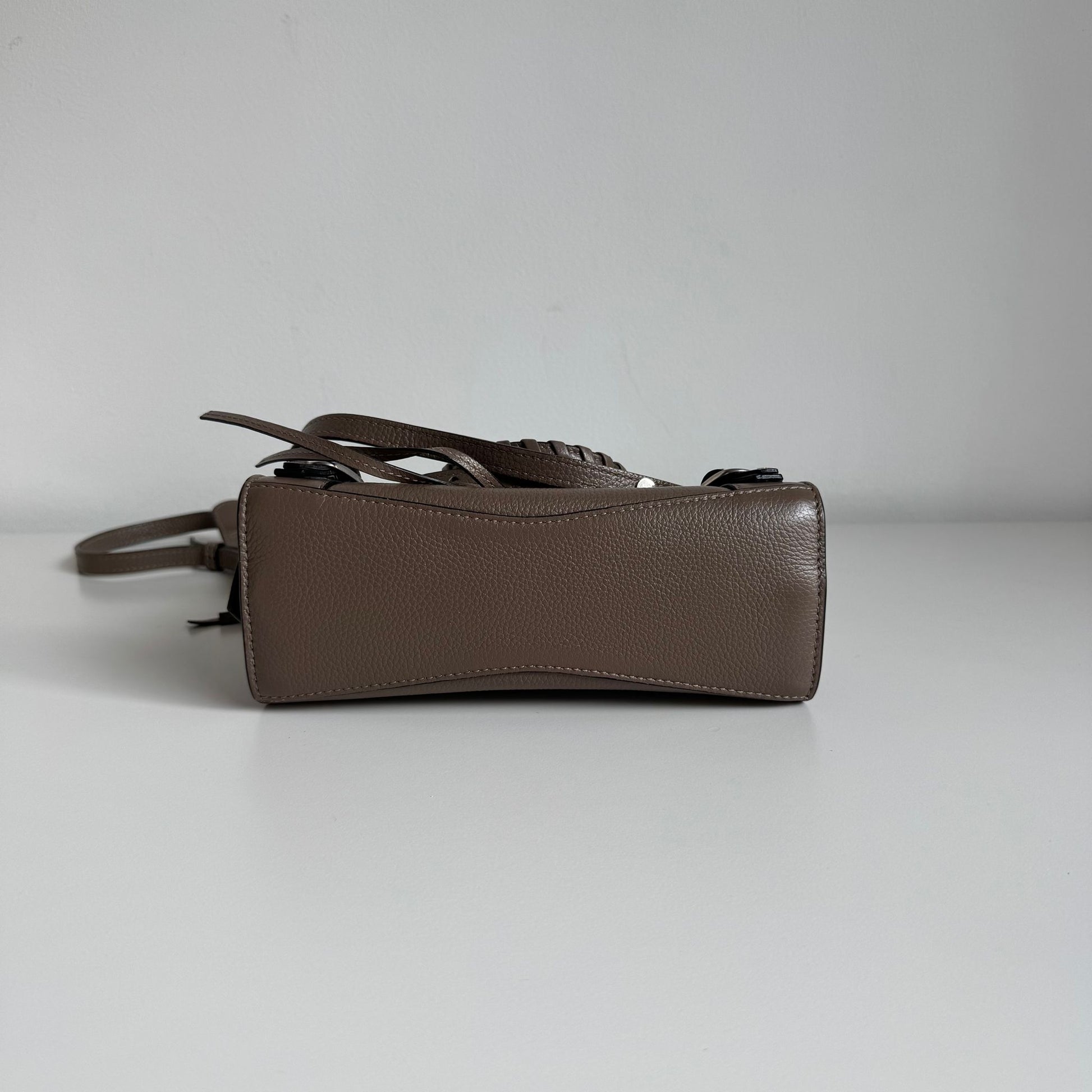 Iconica borsa Balenciaga Neo Classic City Mini in pelle martellata tortora con hardware argento. Si indossa a mano e a tracolla, e la tracolla è rimovibile e regolabile.