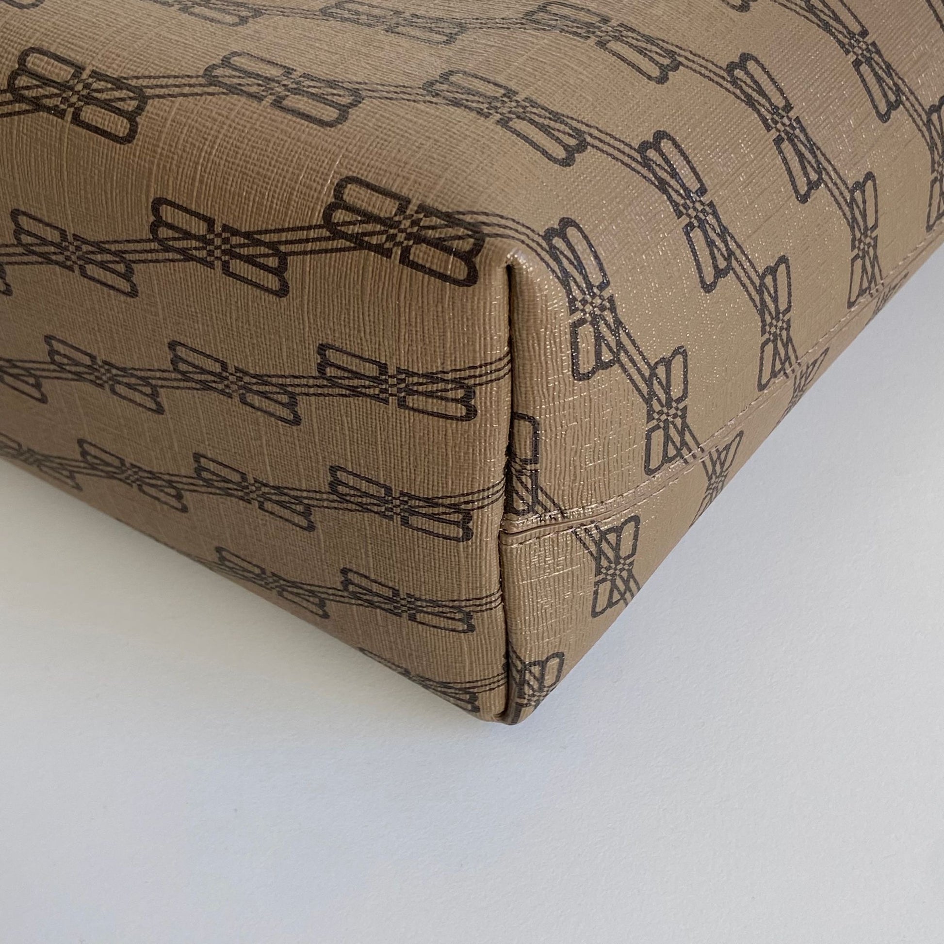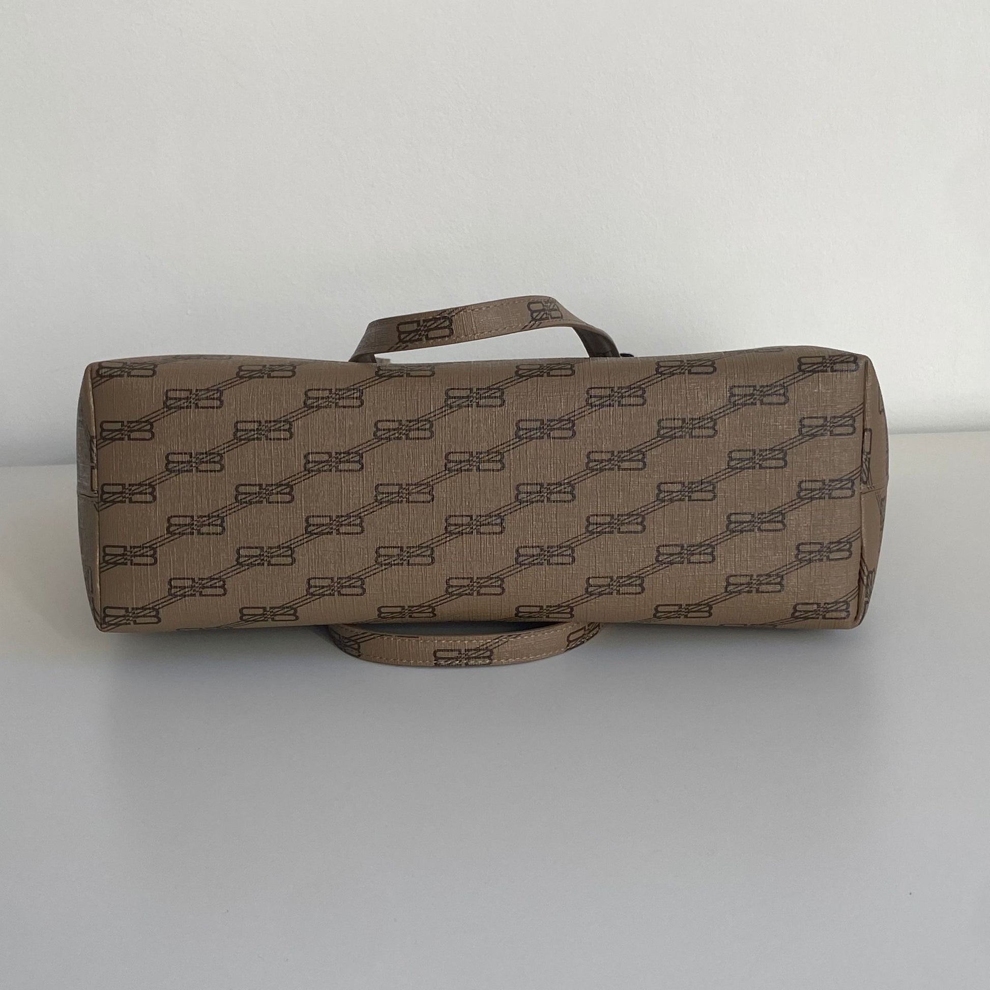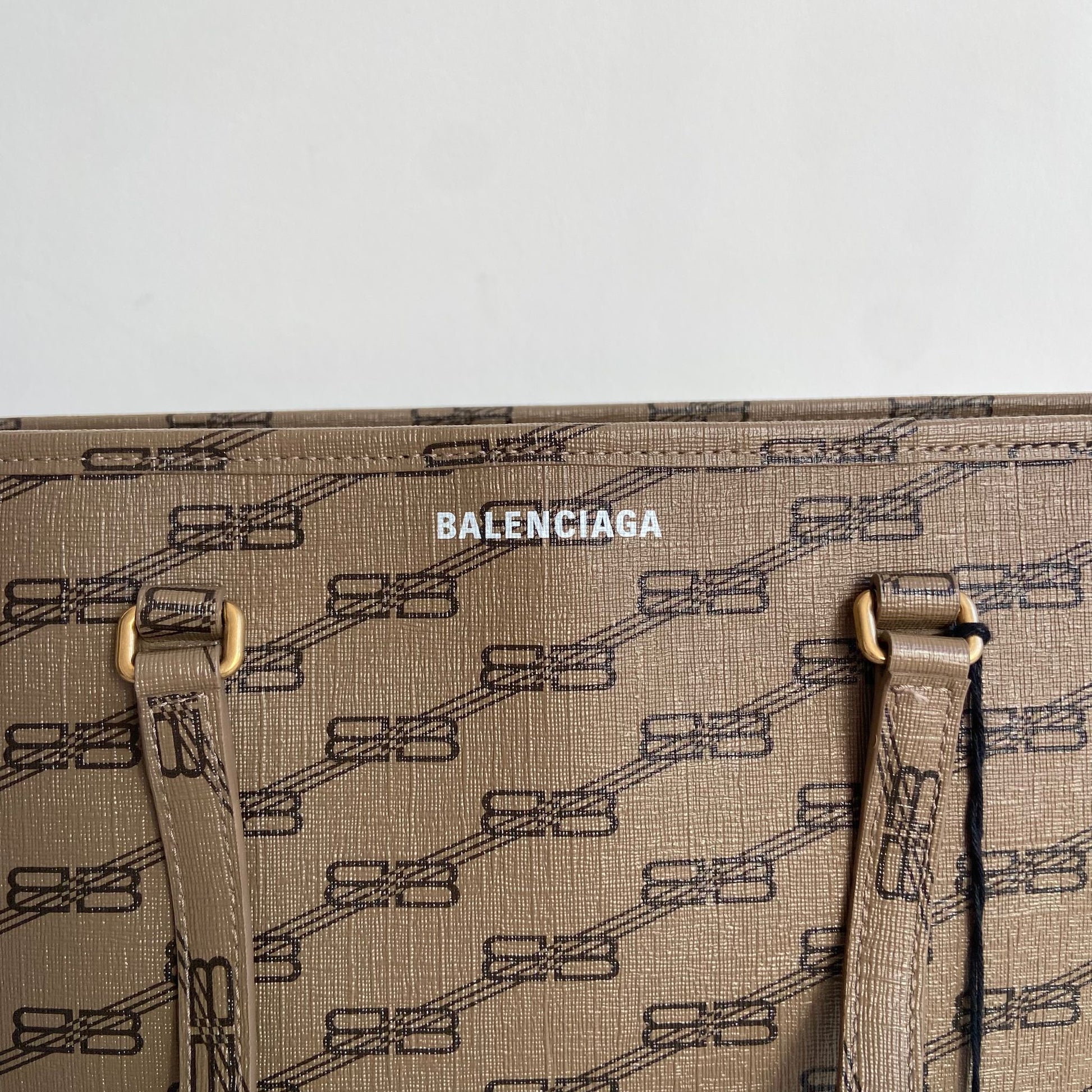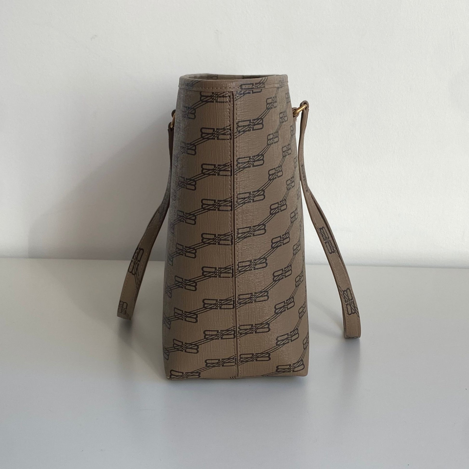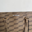 Meravigliosa borsa Balenciaga modello Signature Shopper M in pelle beige e loghi BB neri con hardware oro. Si indossa a spalla.