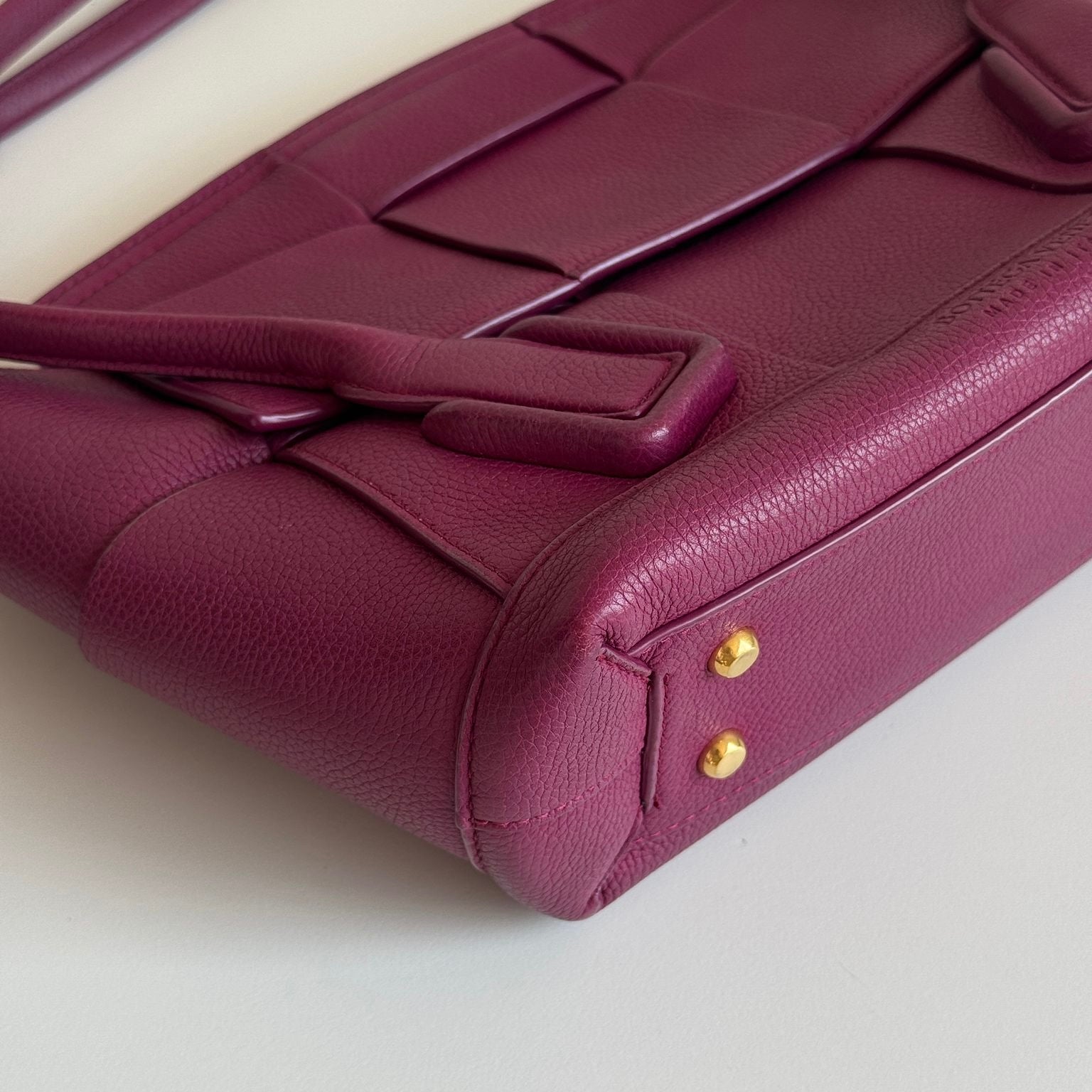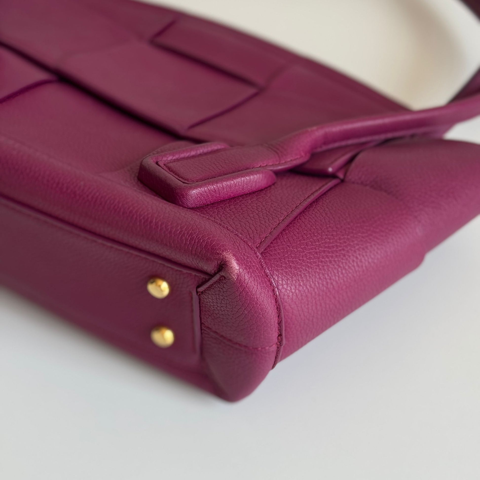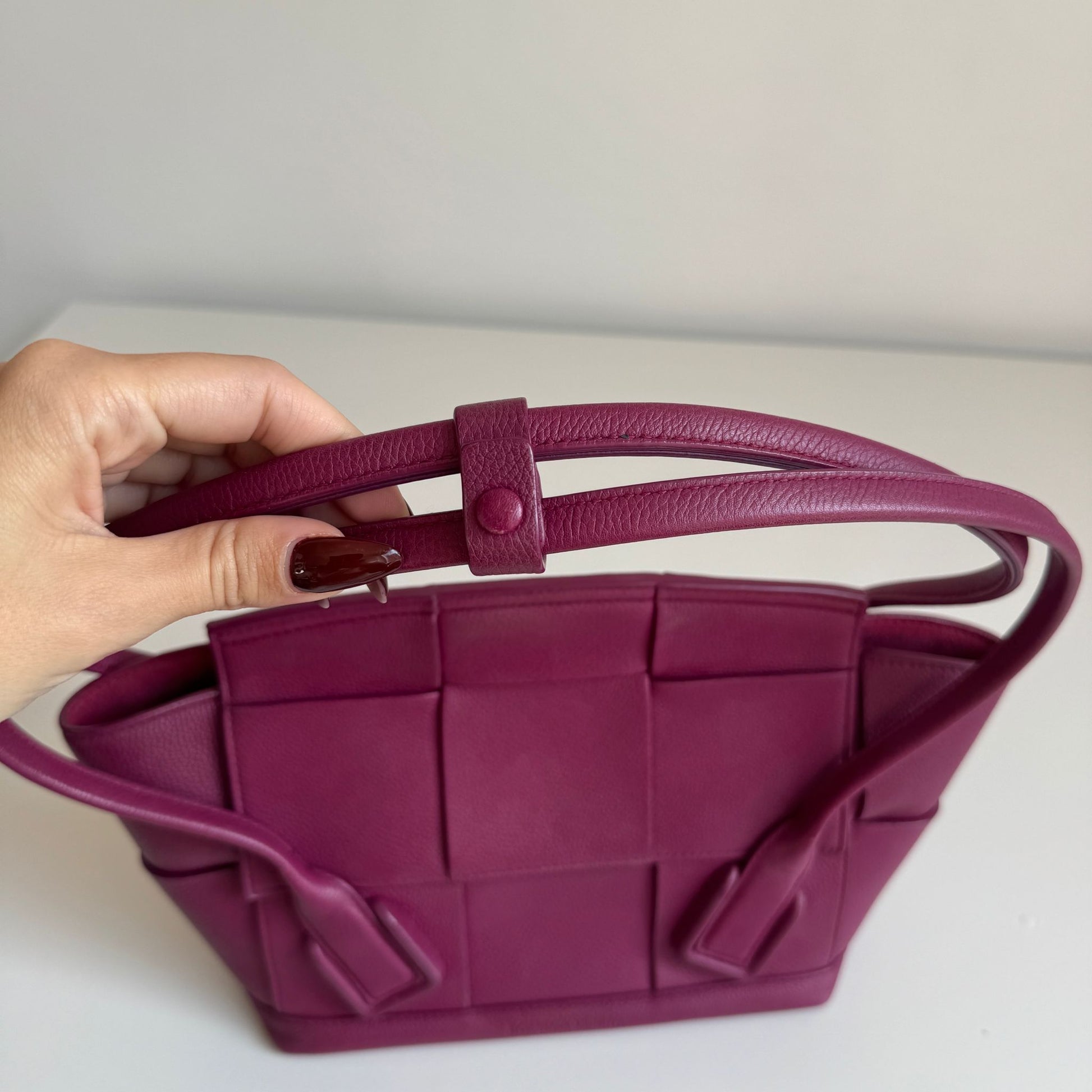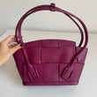 Bellissima borsa Bottega Veneta modello Arco in pelle intrecciata color porpora. Si indossa a spalla.