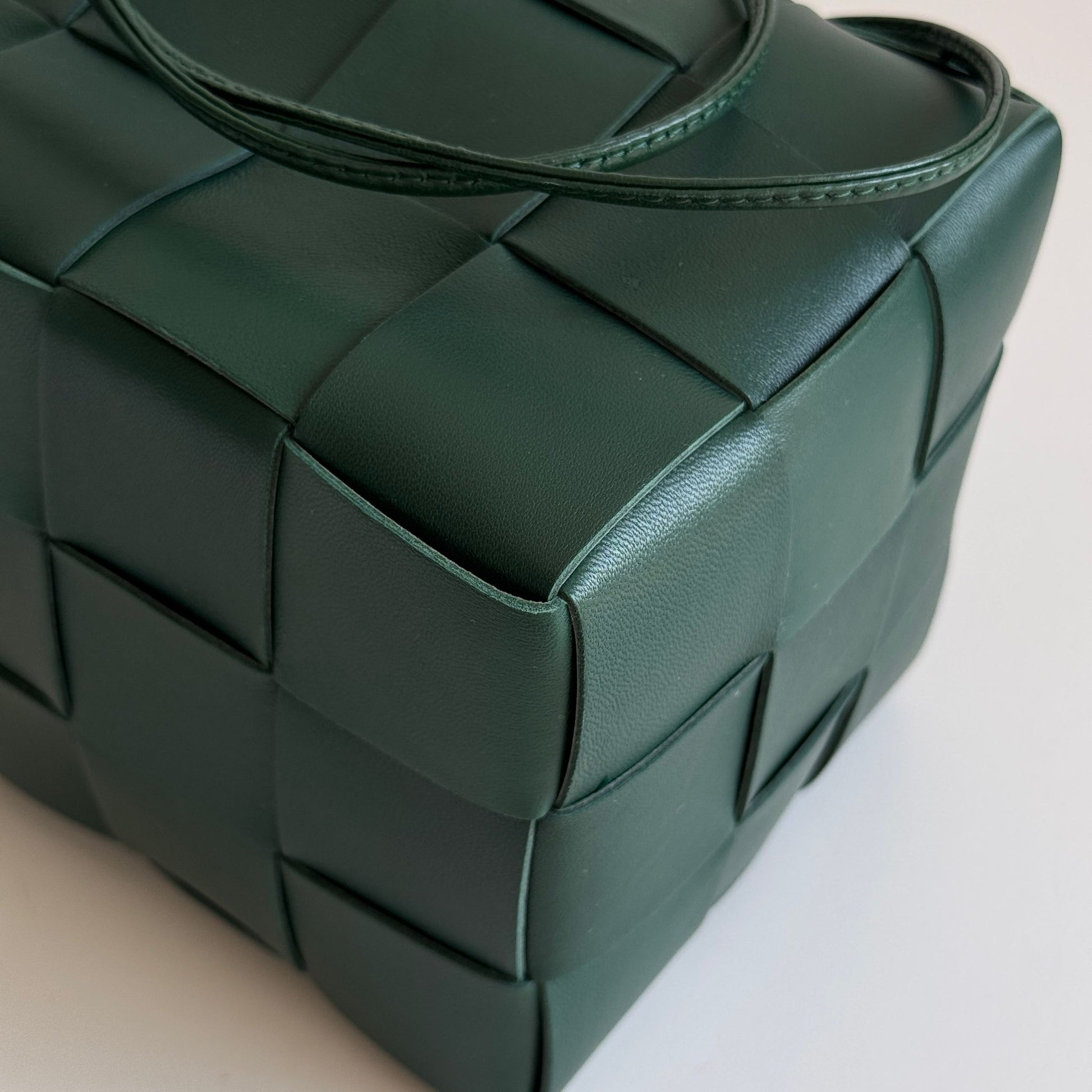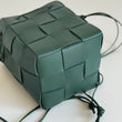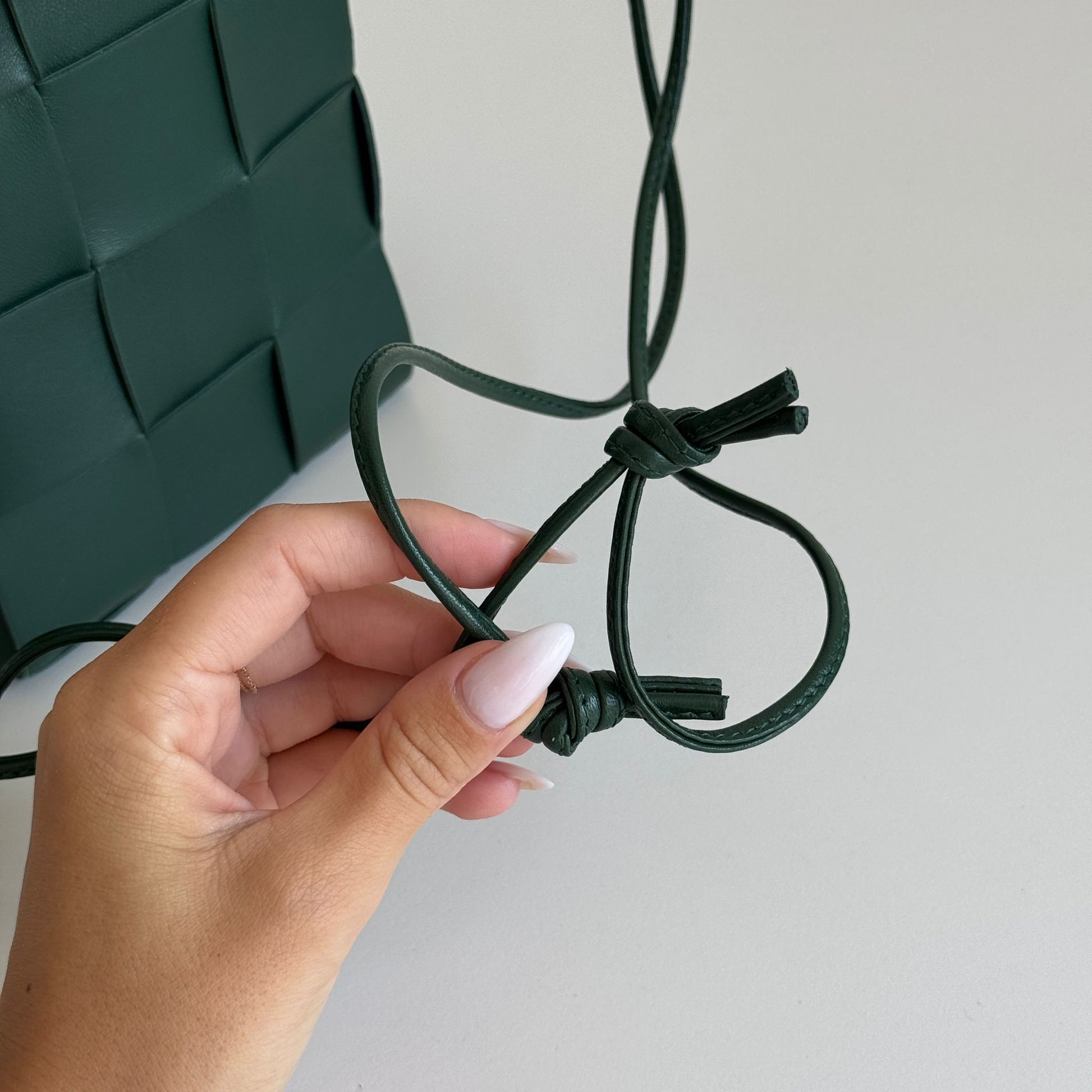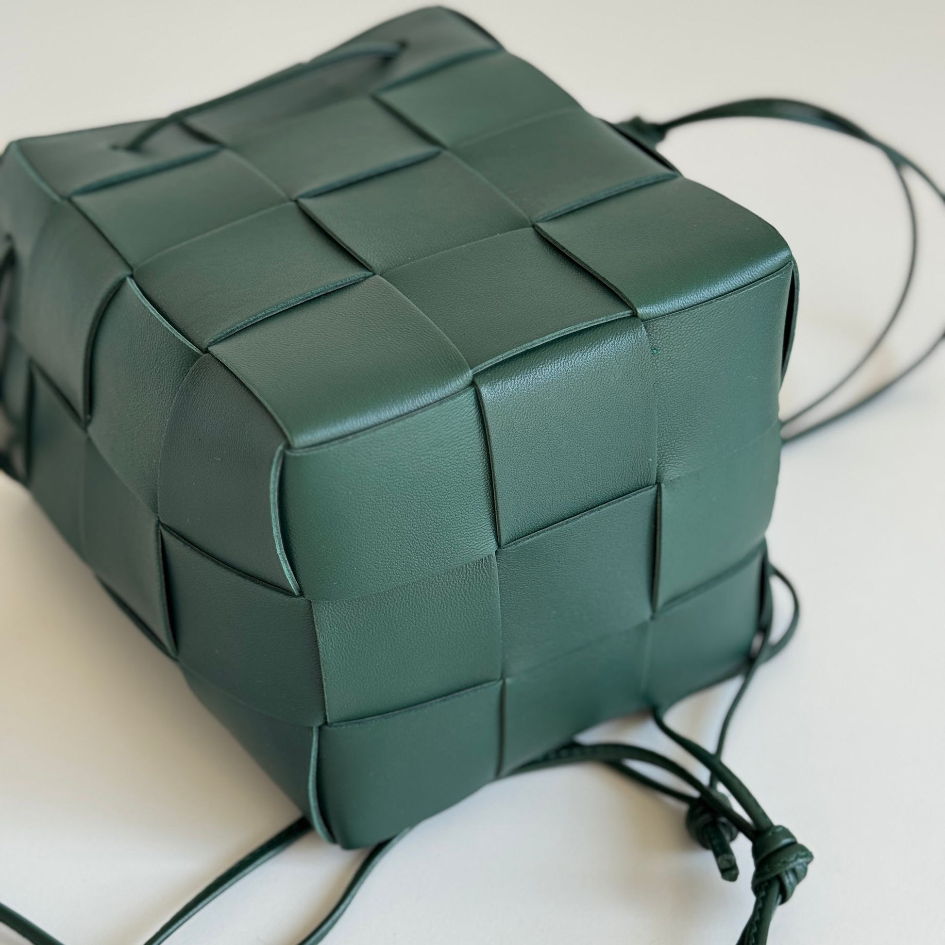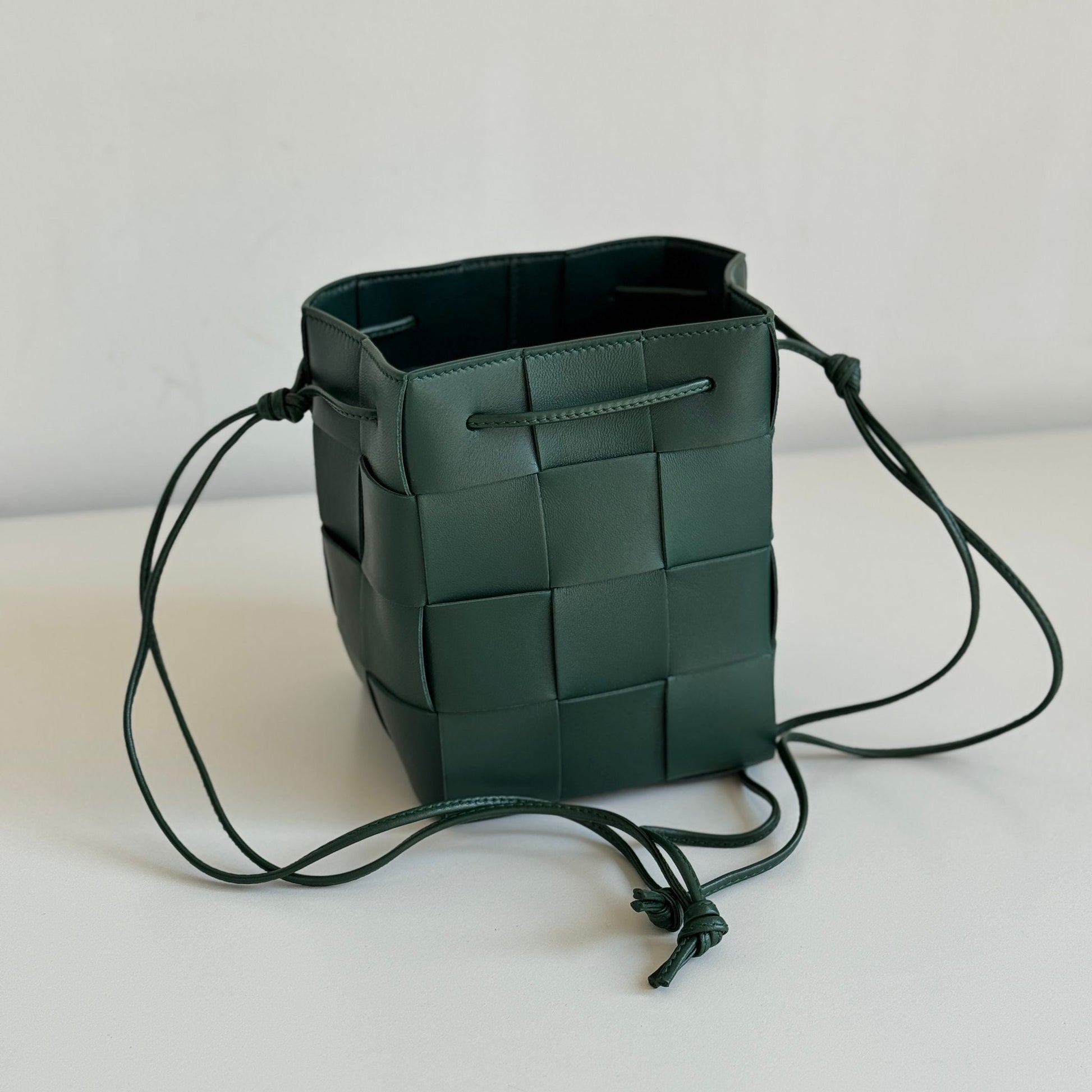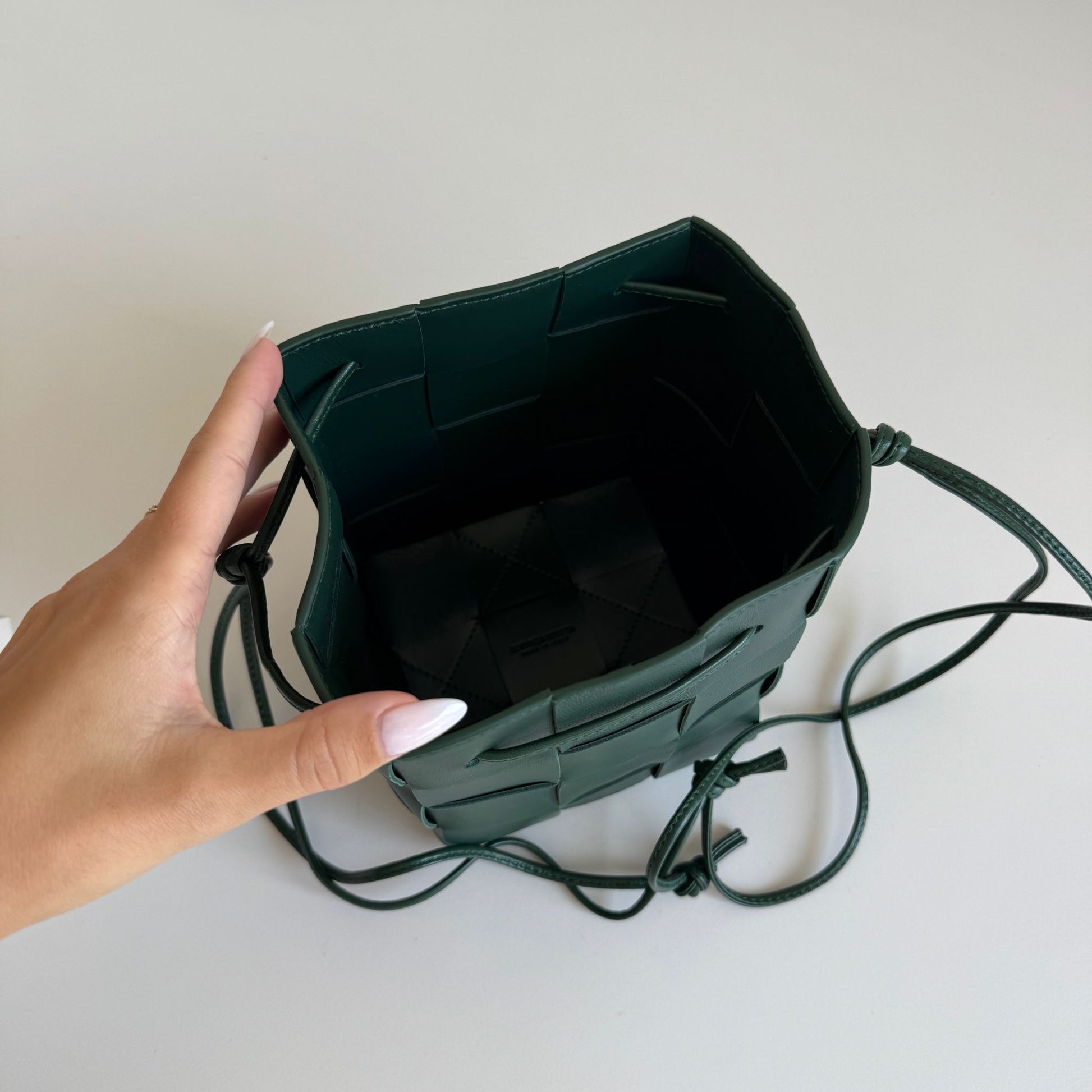 Bellissima borsa di Bottega Veneta modello Bucket in morbida pelle verde bosco intrecciata. Si indossa a spalla e a tracolla. La tracolla non è rimovibile e regolabile.