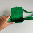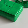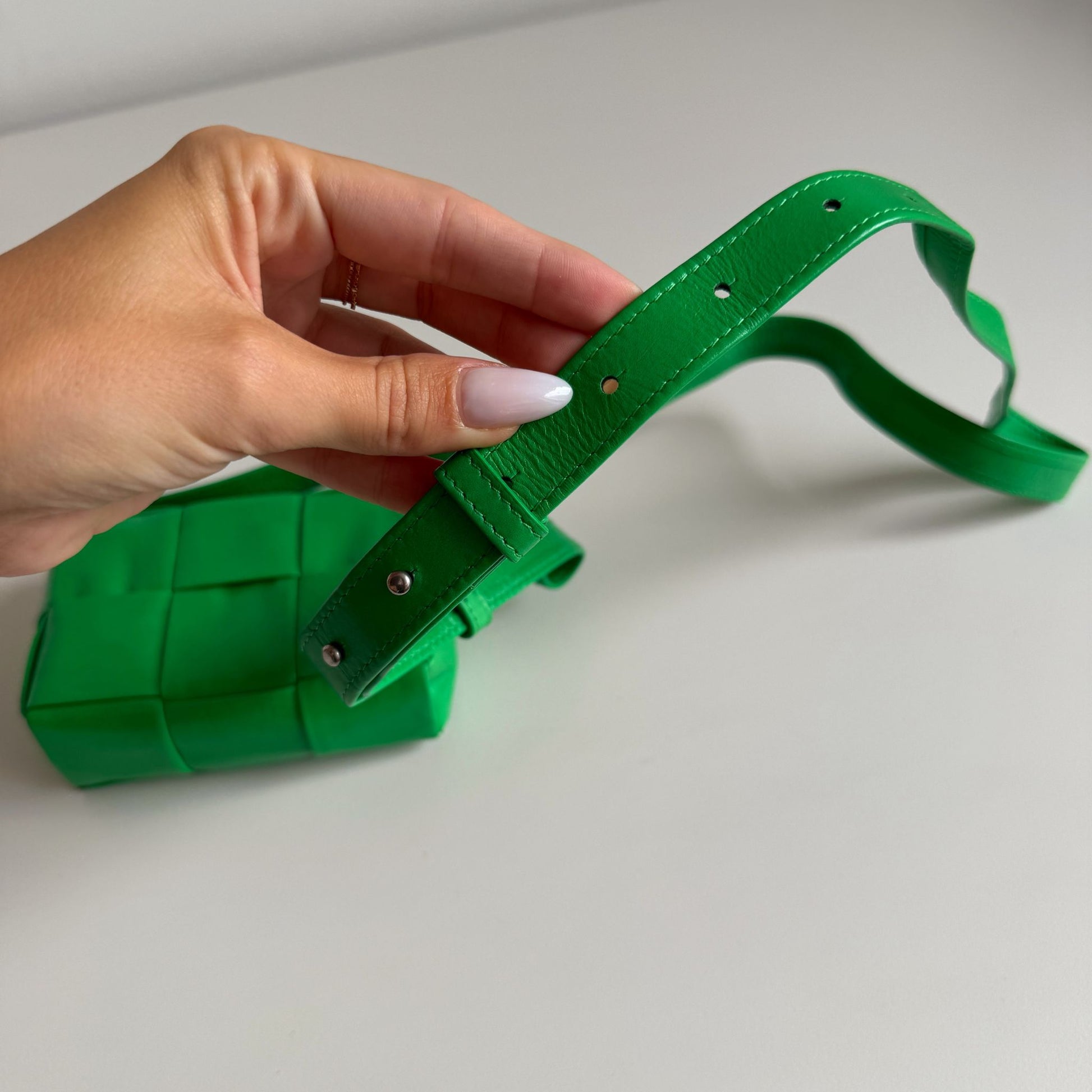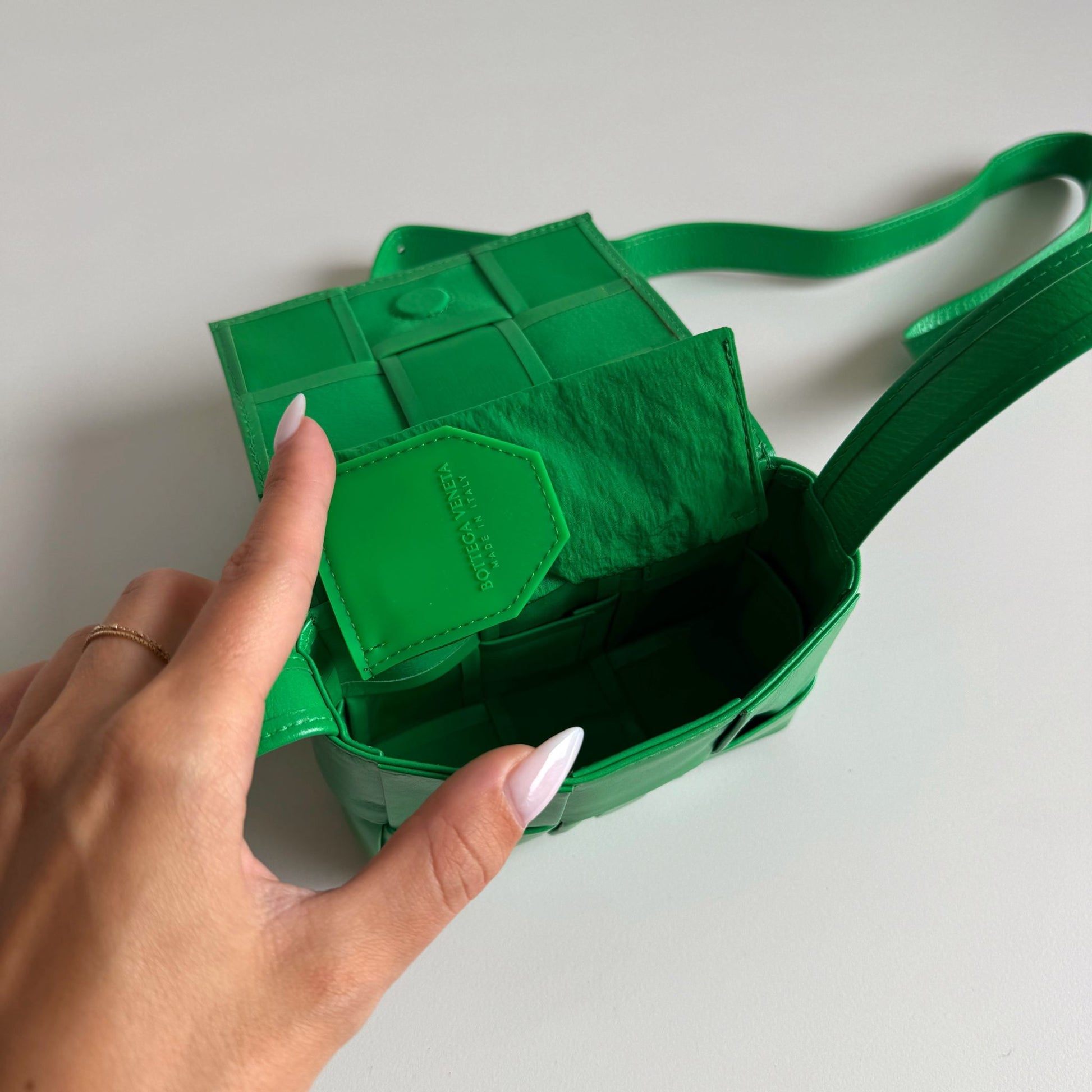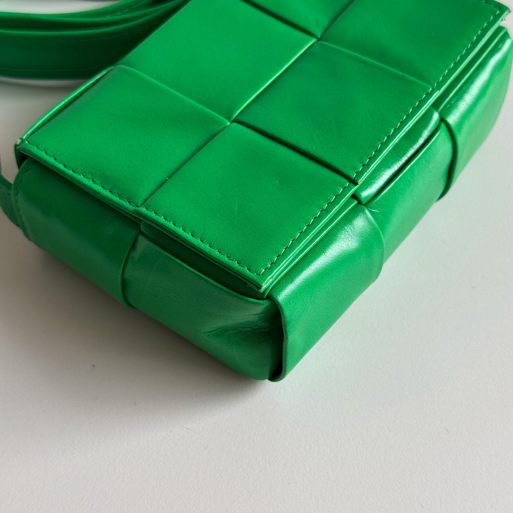 Adorabile mini bag di Bottega Veneta Candy Cassette con motivo a intreccio in pelle verde Parakeet. Si indossa a tracolla, la tracolla è regolabile.