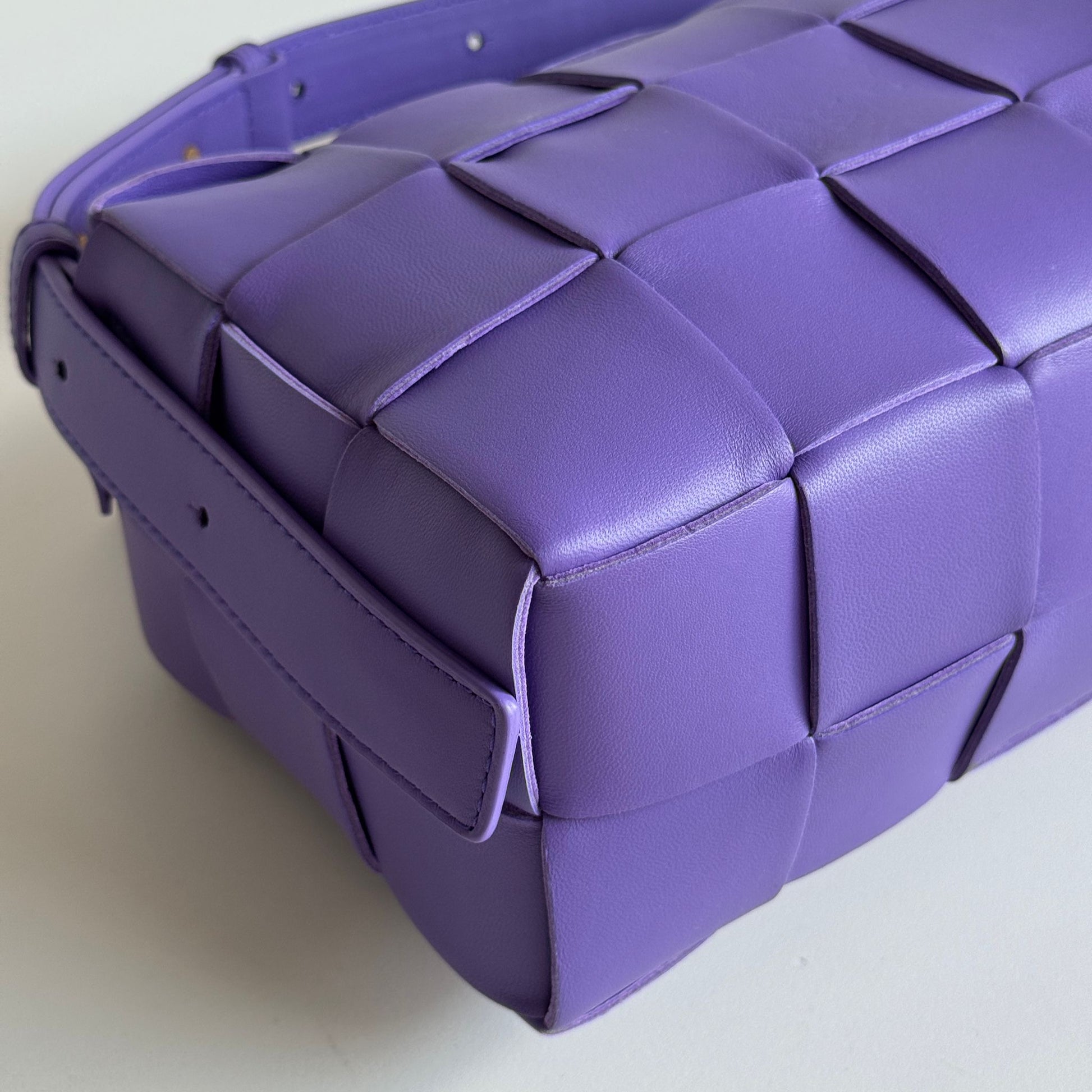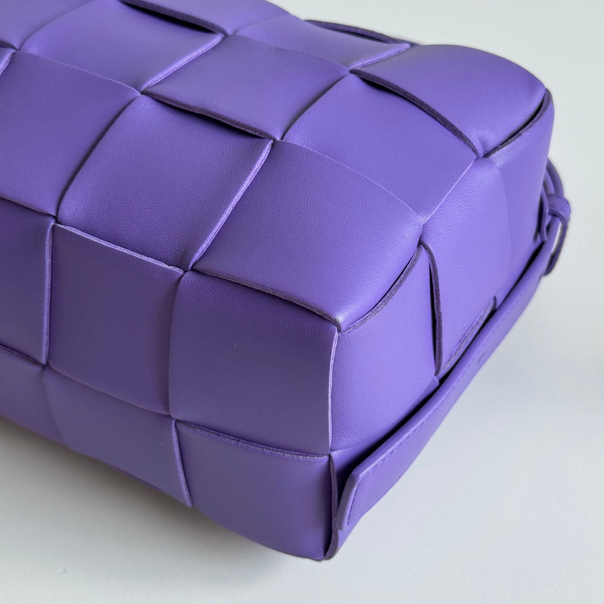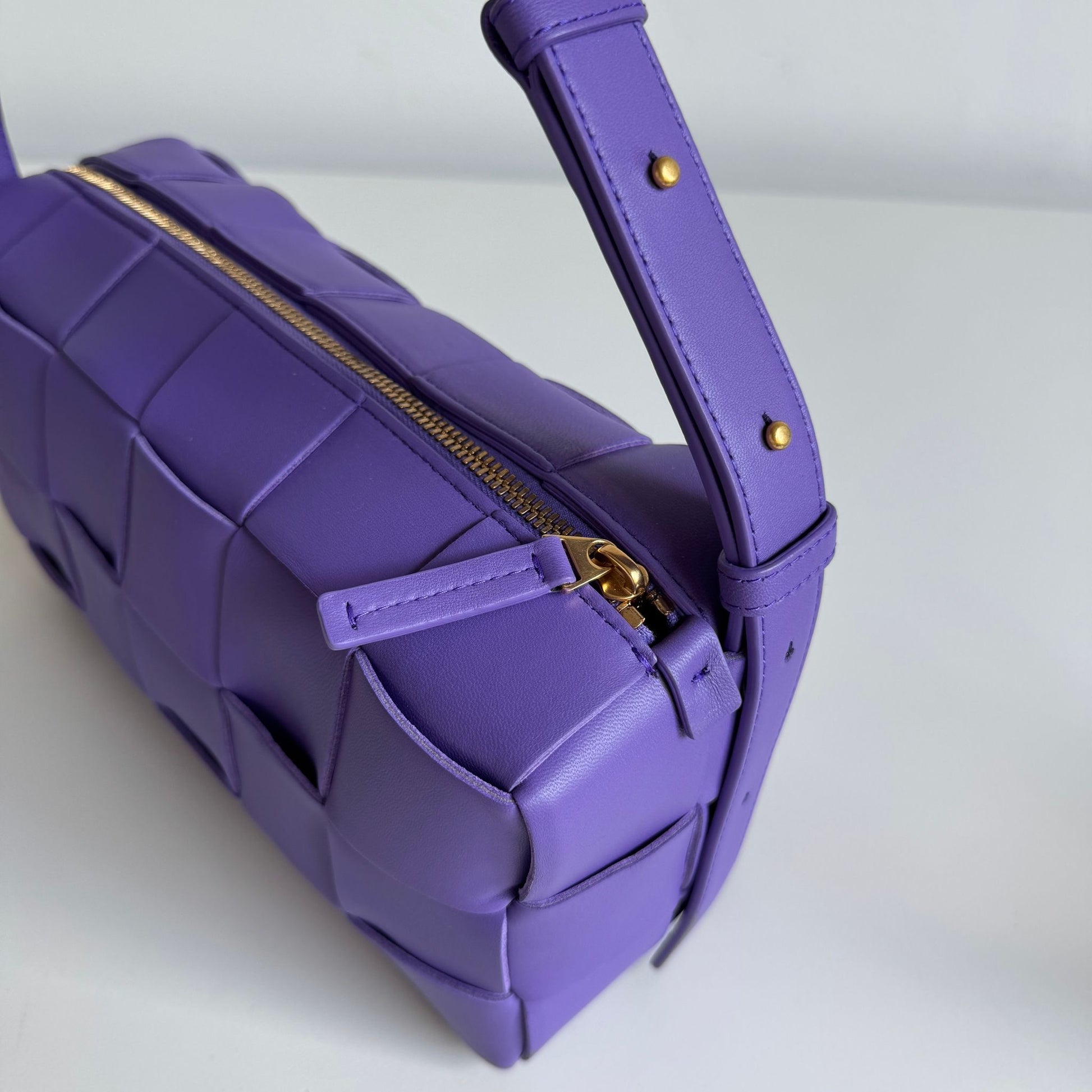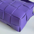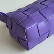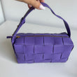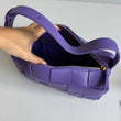 Bellissima borsa Bottega Veneta modello Cassette in pelle intrecciata viola con hardware oro. Si indossa a spalla e lo spallaccio è regolabile.
