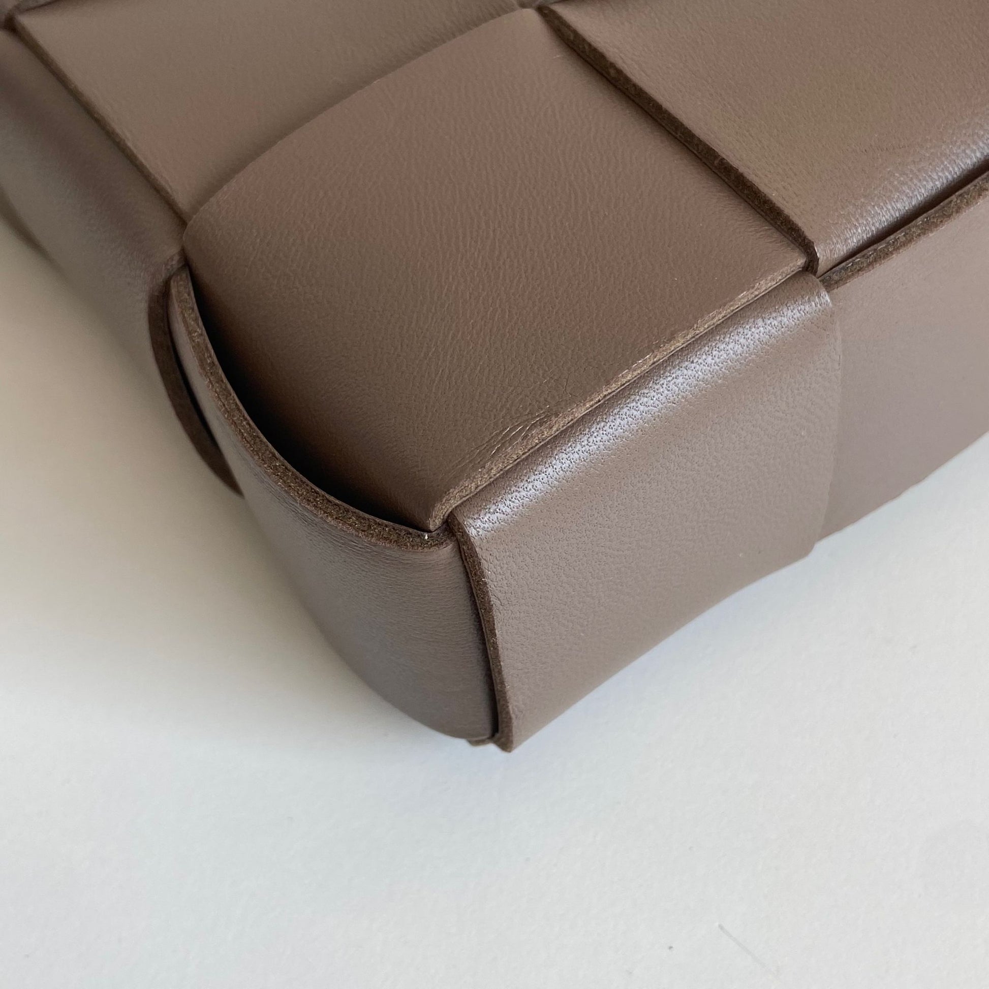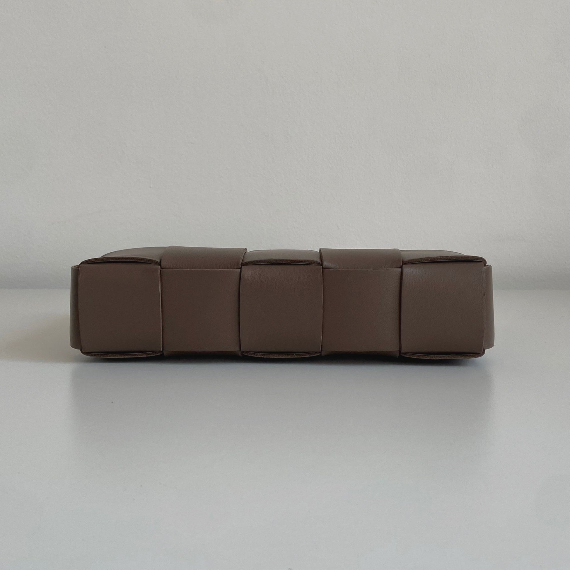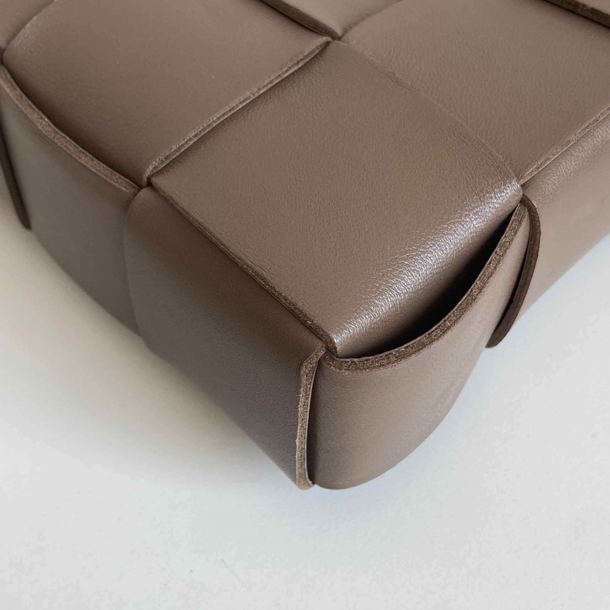 Bellissima borsa Bottega Veneta modello Cassette a spalla in pelle liscia Taupe intrecciata. Si indossa a spalla.