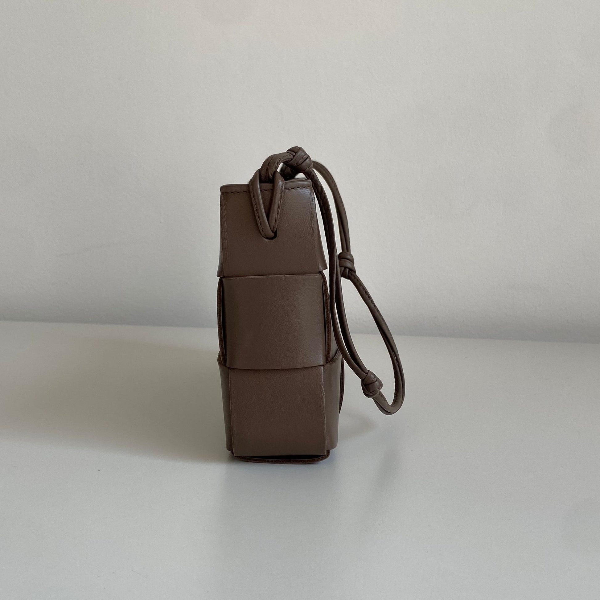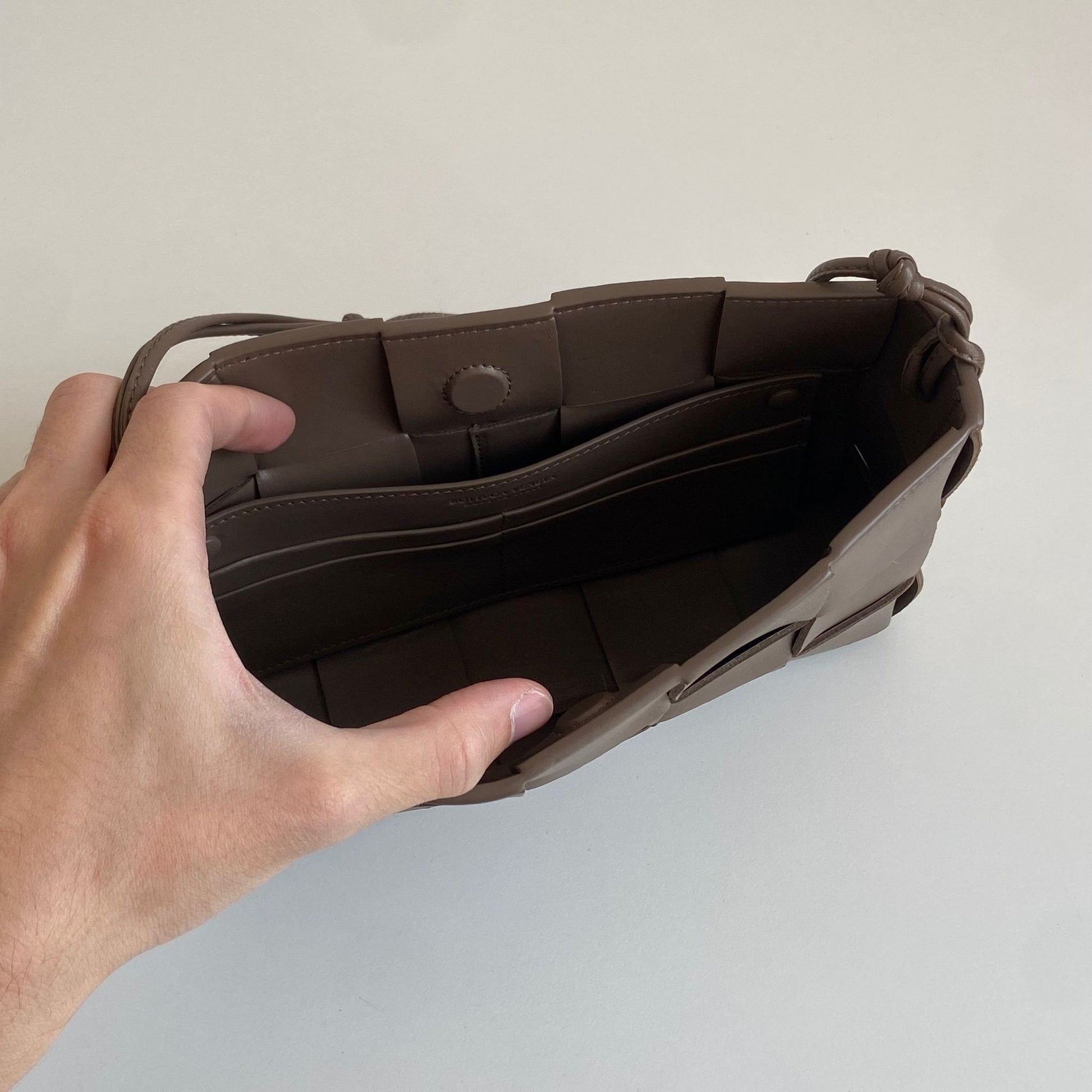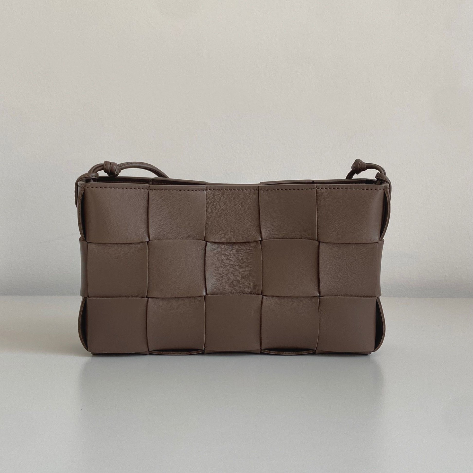 Bellissima borsa Bottega Veneta modello Cassette a spalla in pelle liscia Taupe intrecciata. Si indossa a spalla.