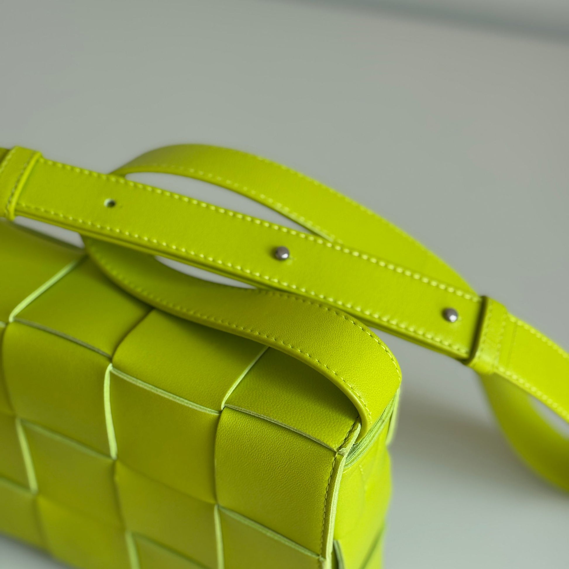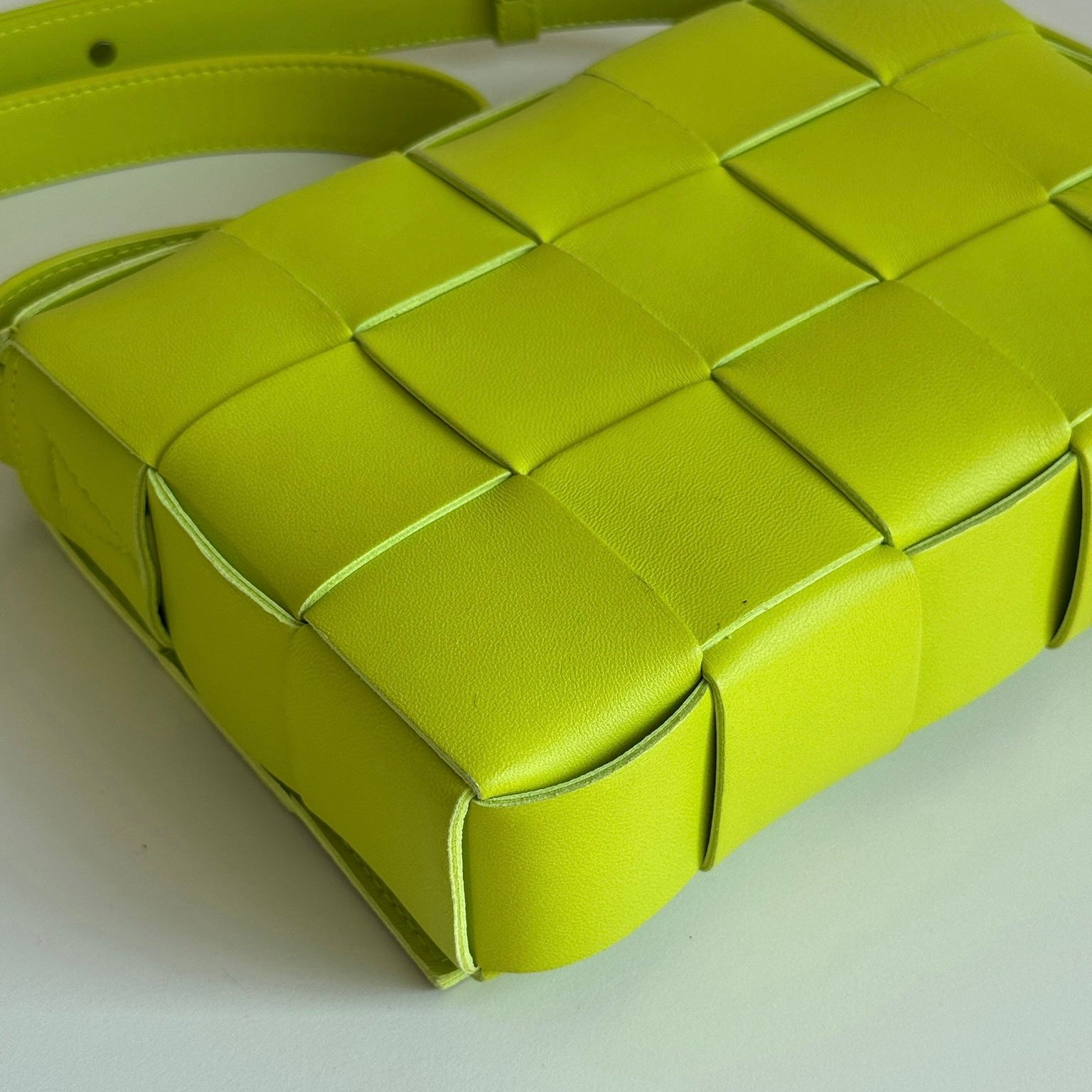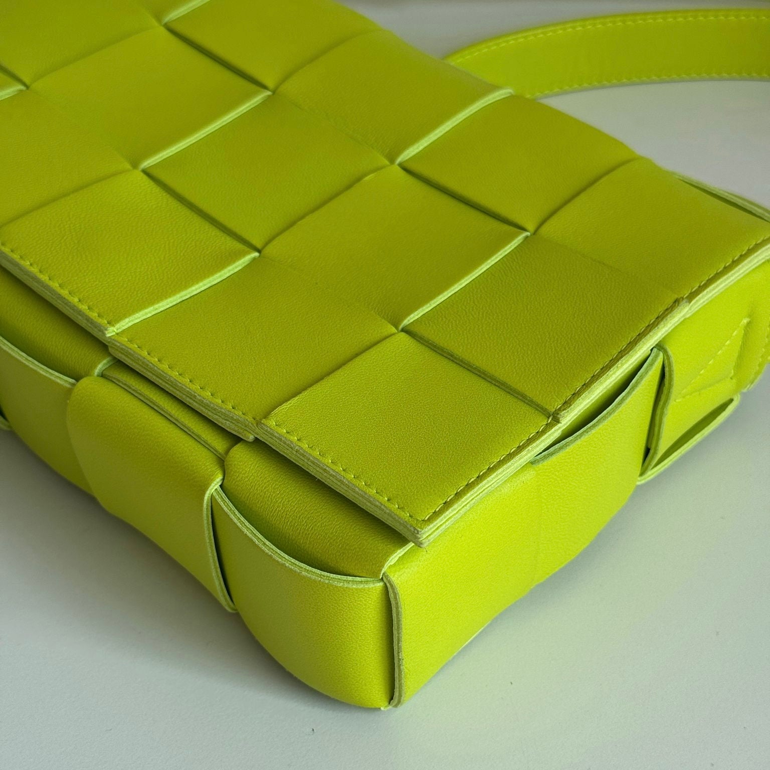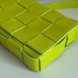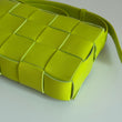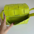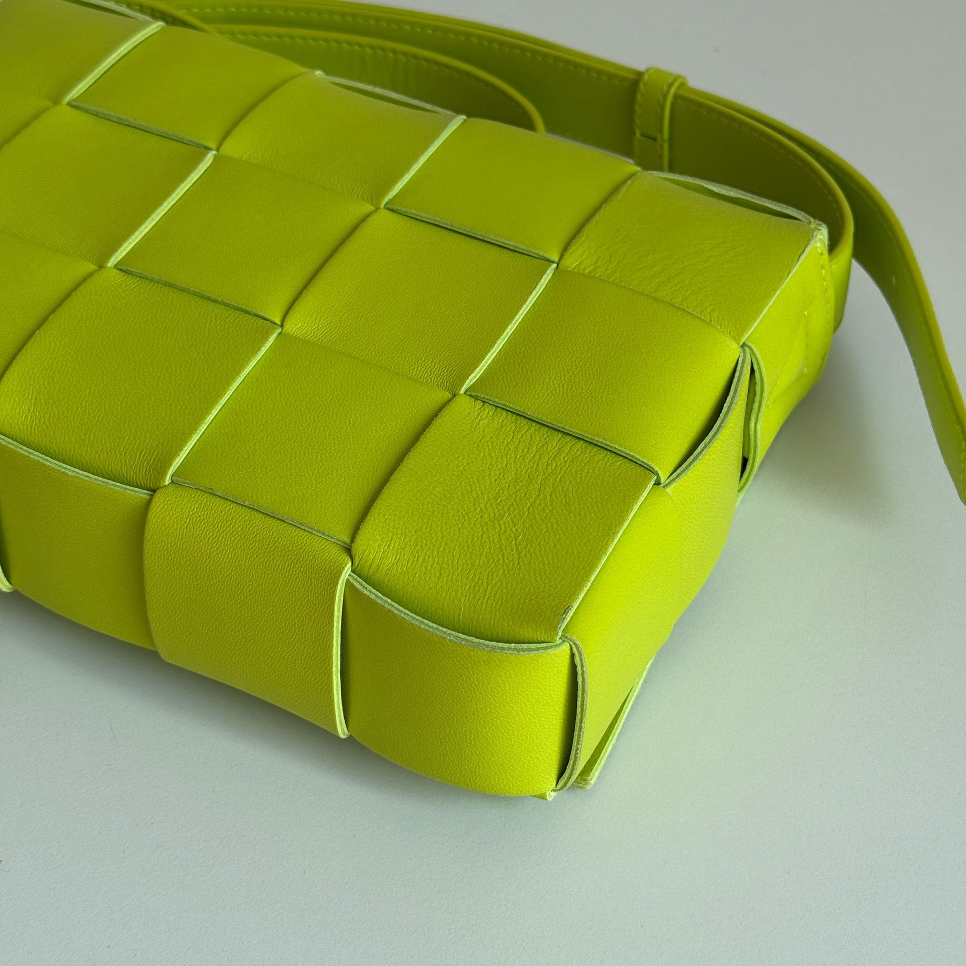 Iconica borsa cross-body Bottega Veneta modello Cassette con motivo a intreccio in pelle morbida, colore verde Acid Kiwi. Si indossa a tracolla ed è regolabile.