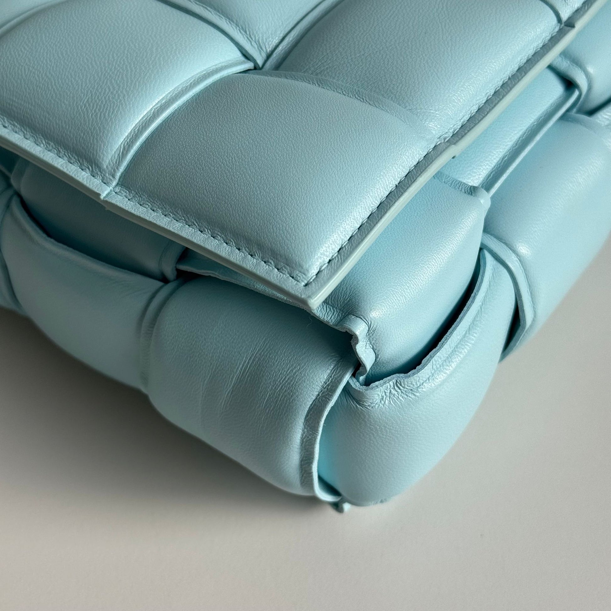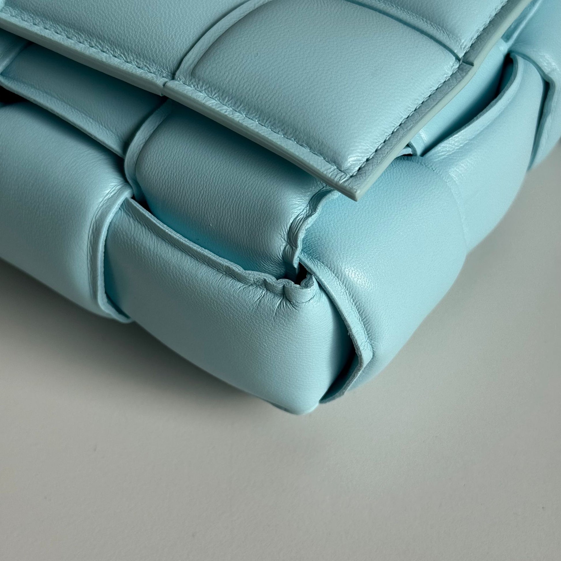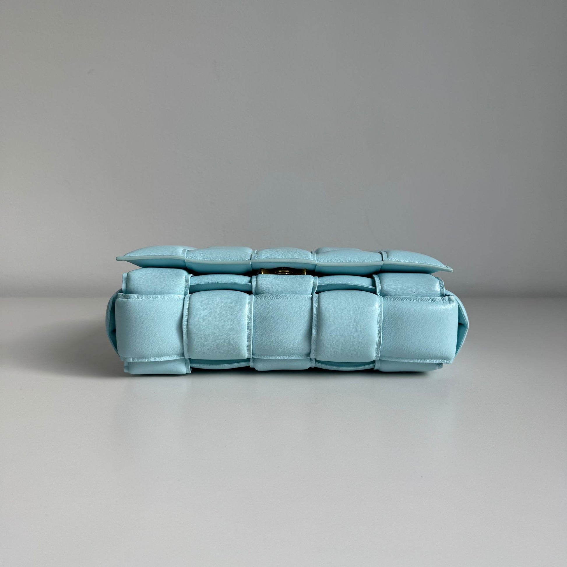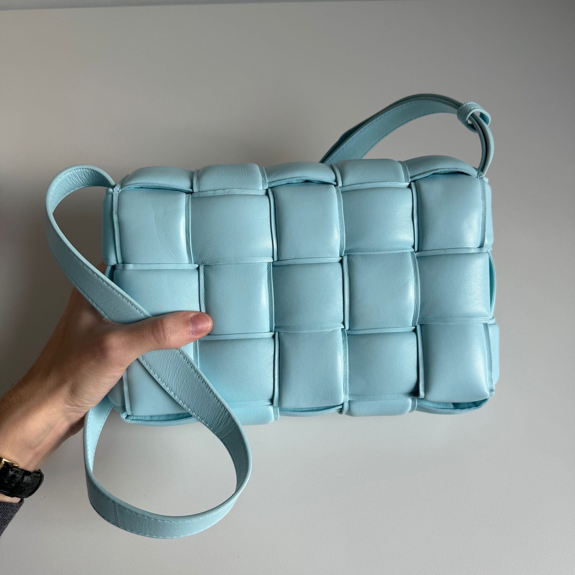Meravigliosa borsa Bottega Veneta Padded Cassette in morbidissima pelle azzurra e hardware oro. Si indossa a tracolla. La tracolla è regolabile.