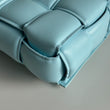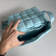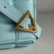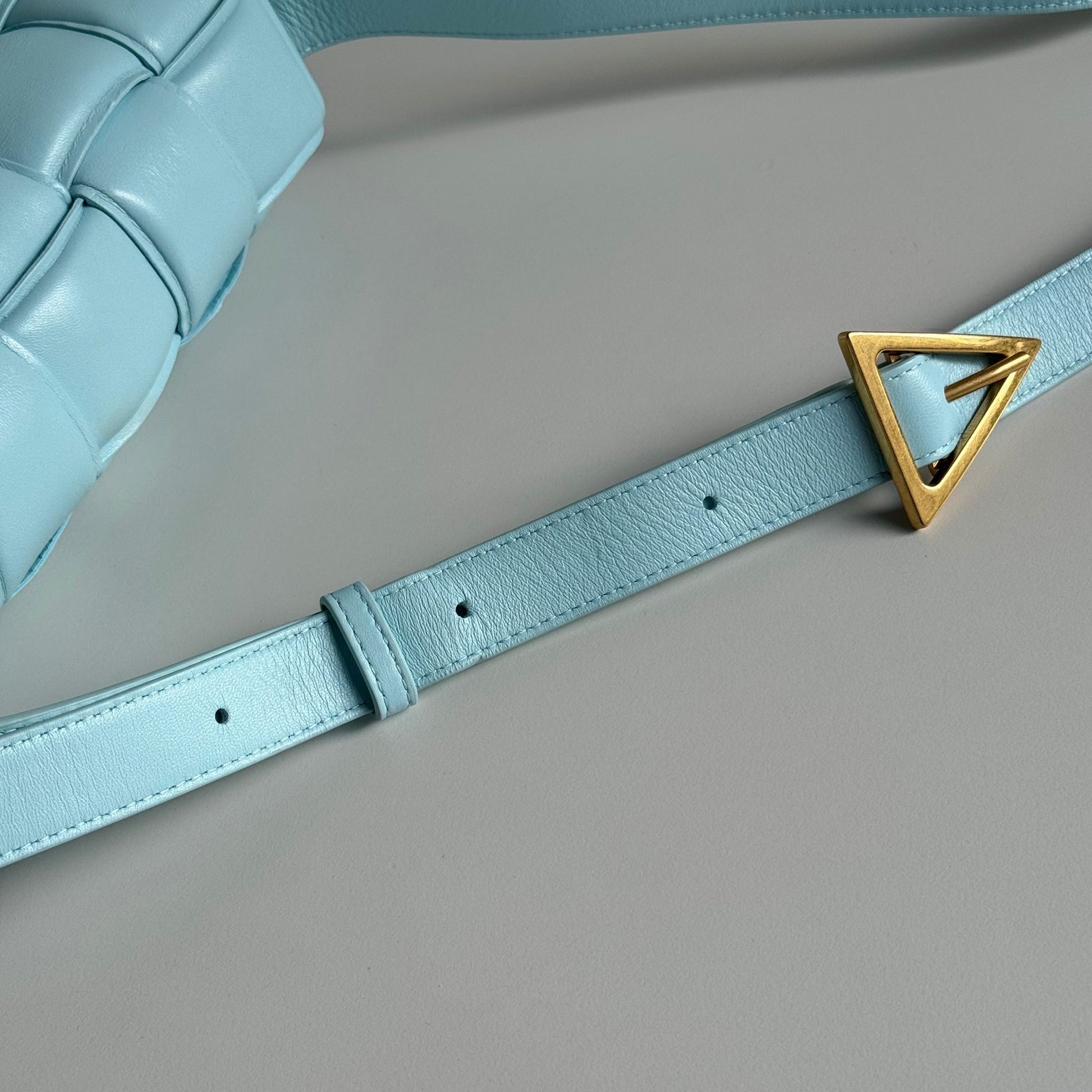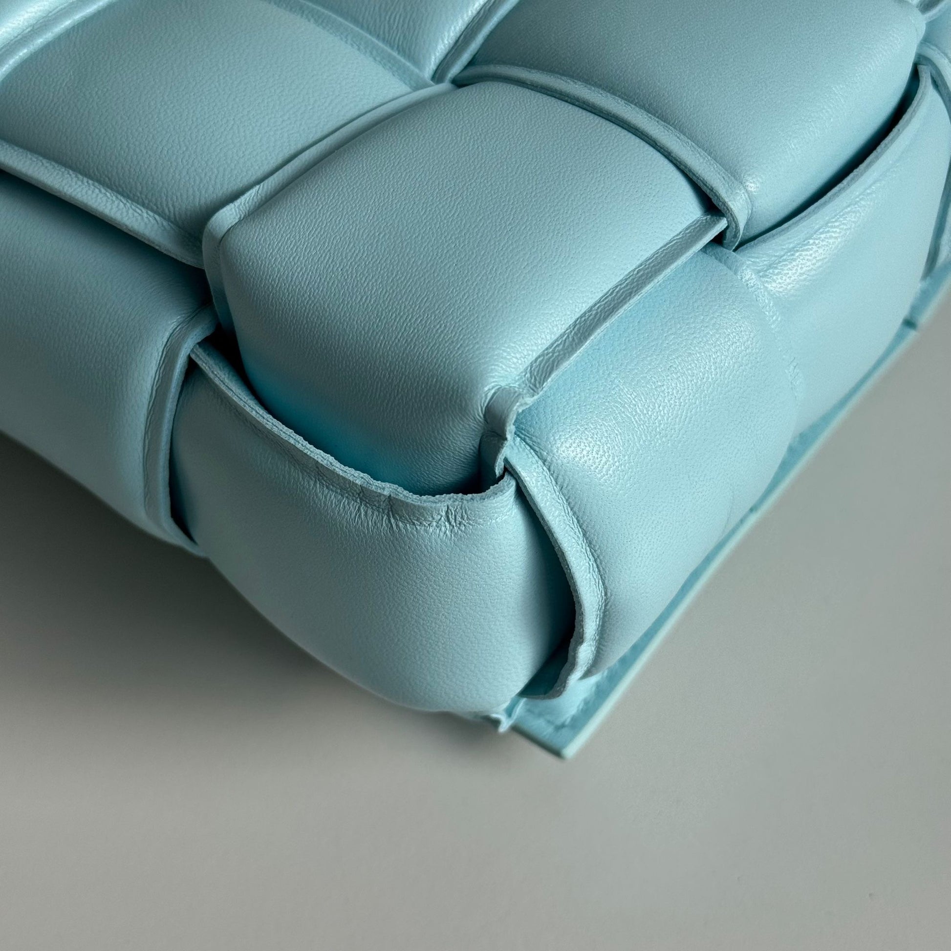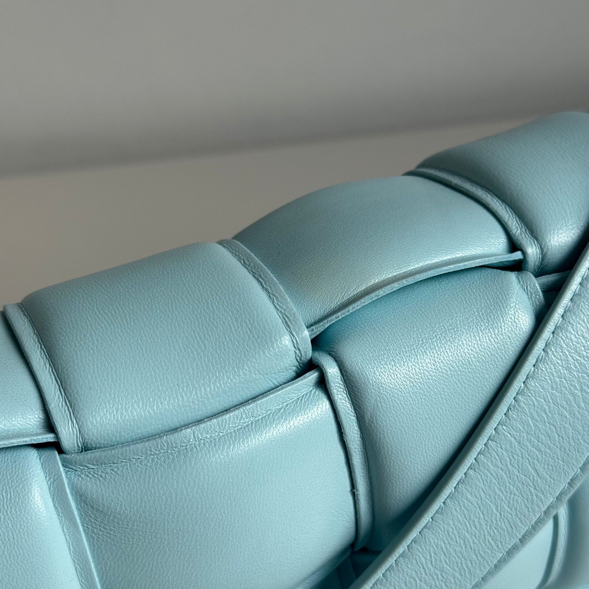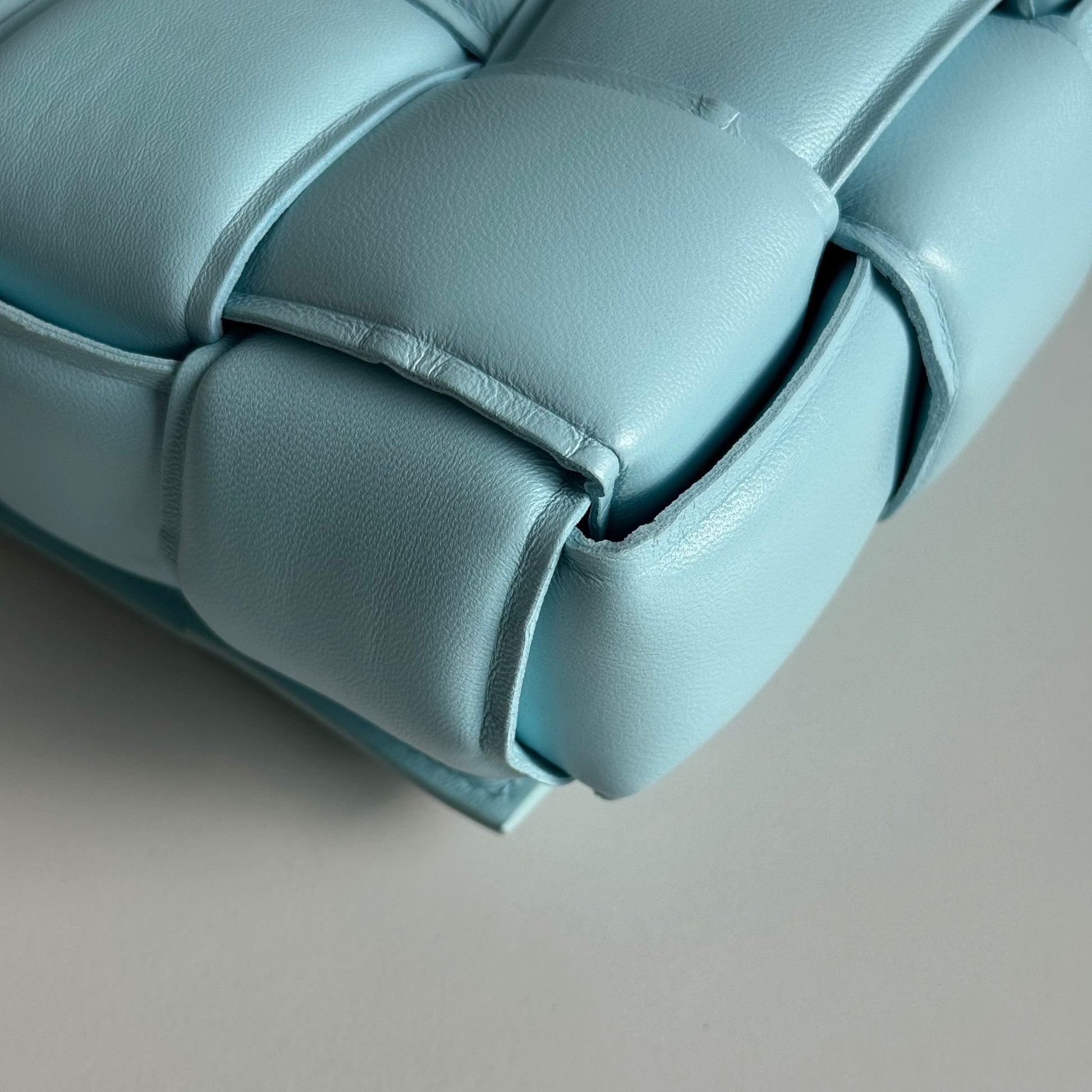 Meravigliosa borsa Bottega Veneta Padded Cassette in morbidissima pelle azzurra e hardware oro. Si indossa a tracolla. La tracolla è regolabile.