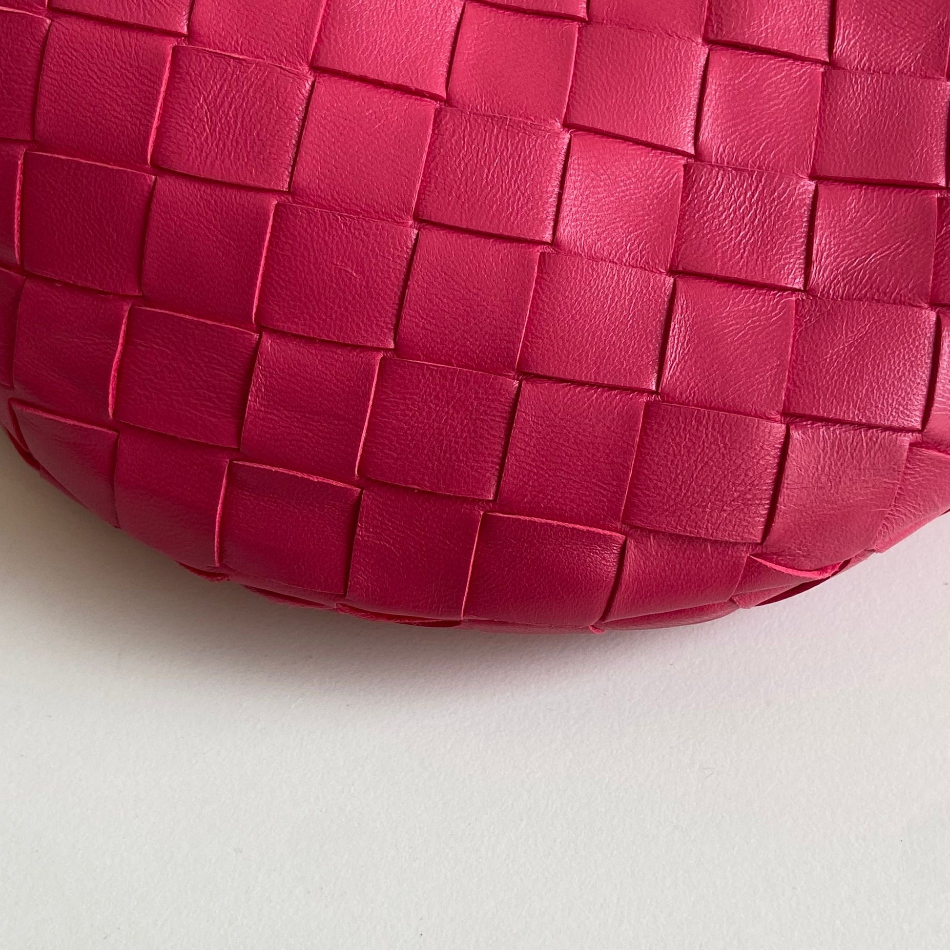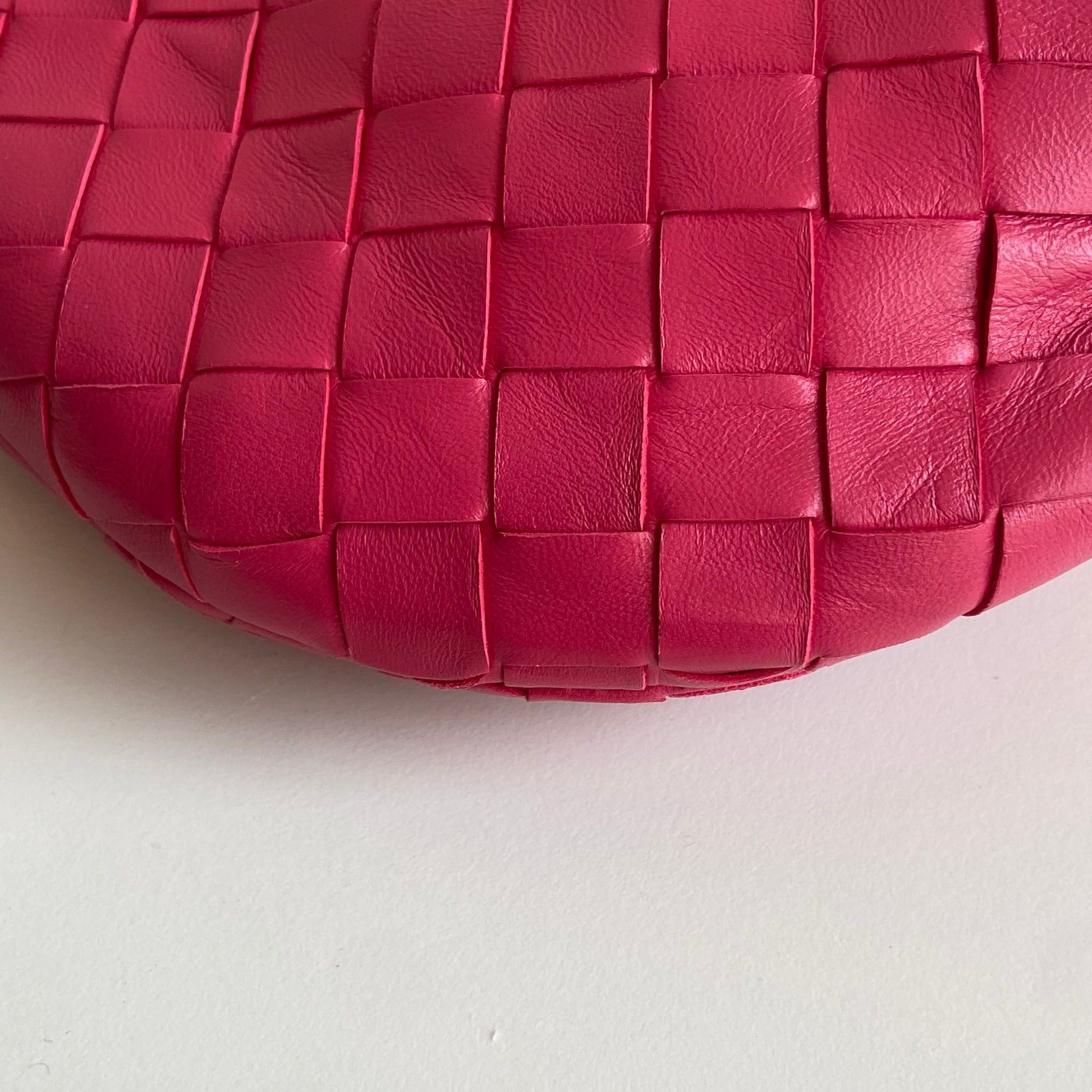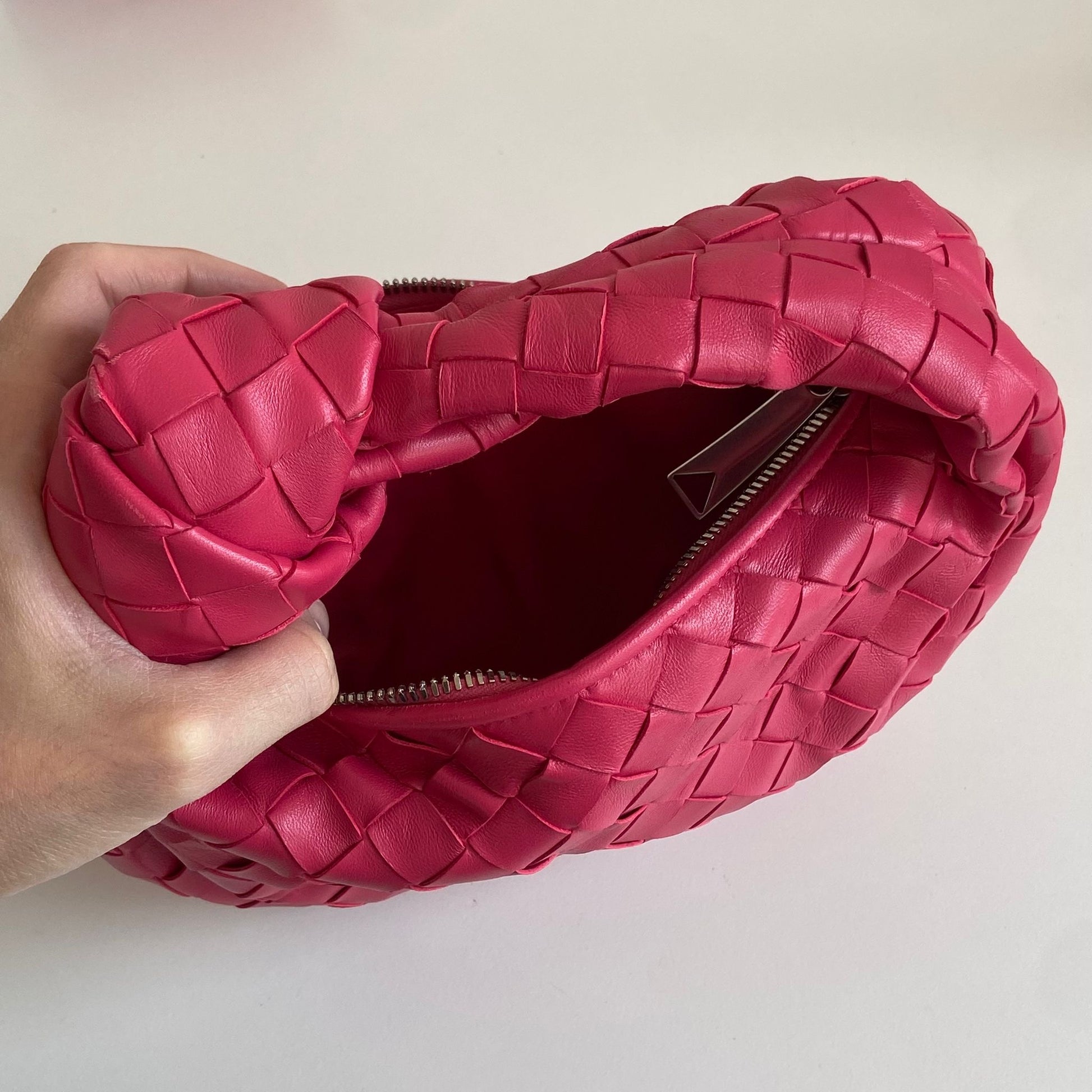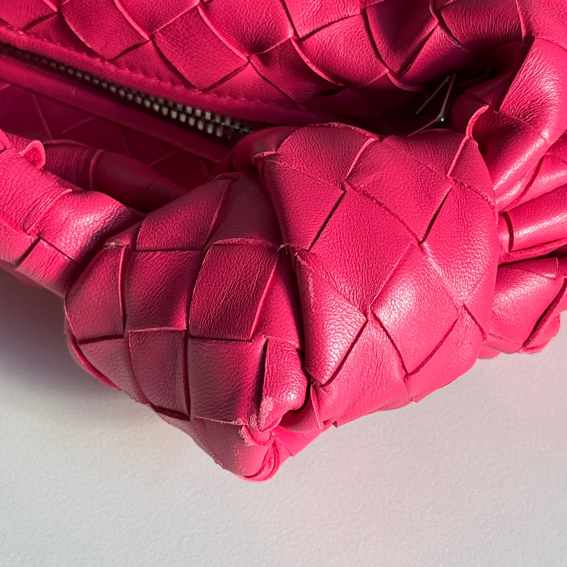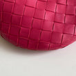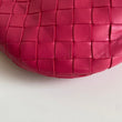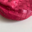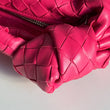 Meravigliosa borsa Bottega Veneta modello mini Jodie in pelle intrecciata rosa Cranberry e hardware argento. Si indossa a mano.