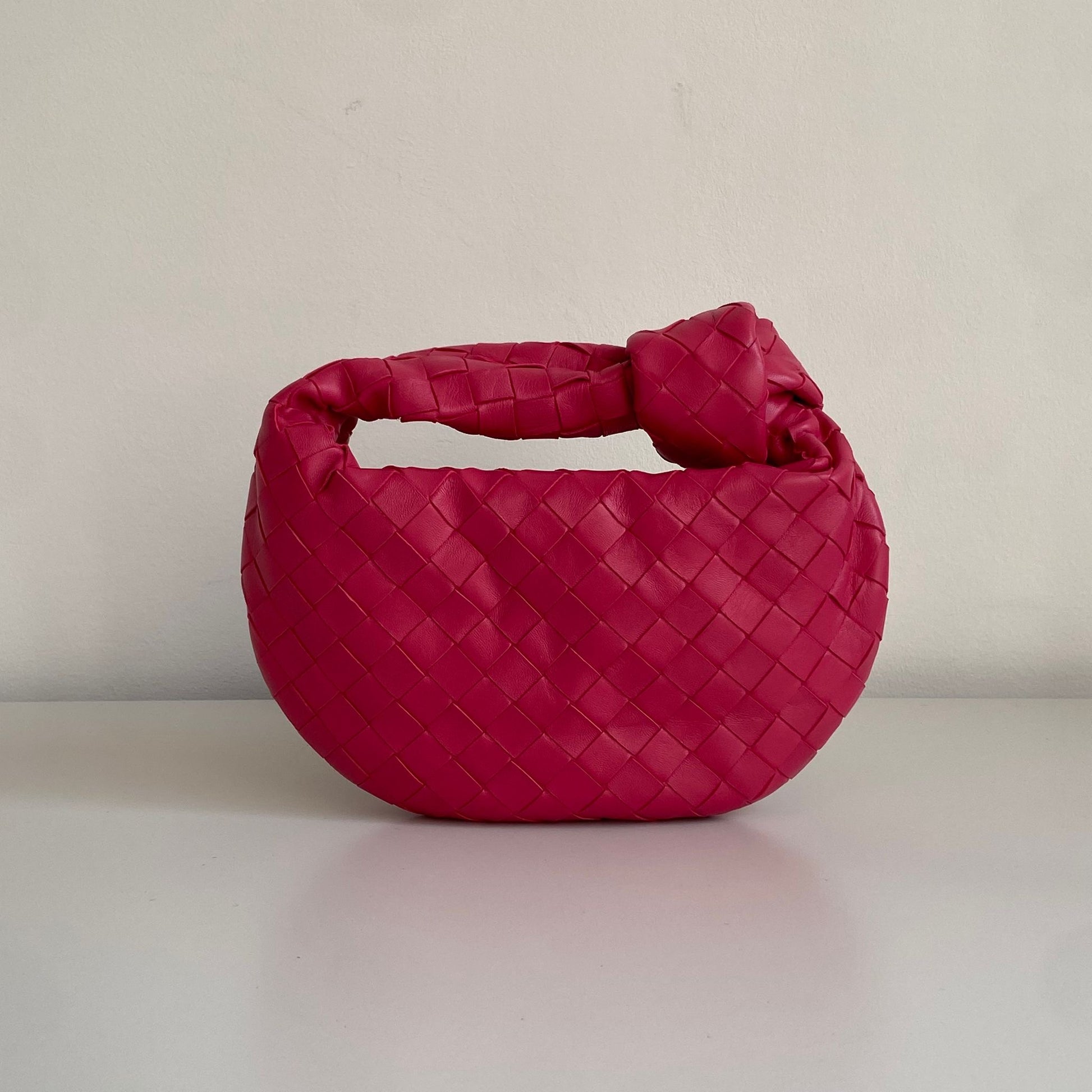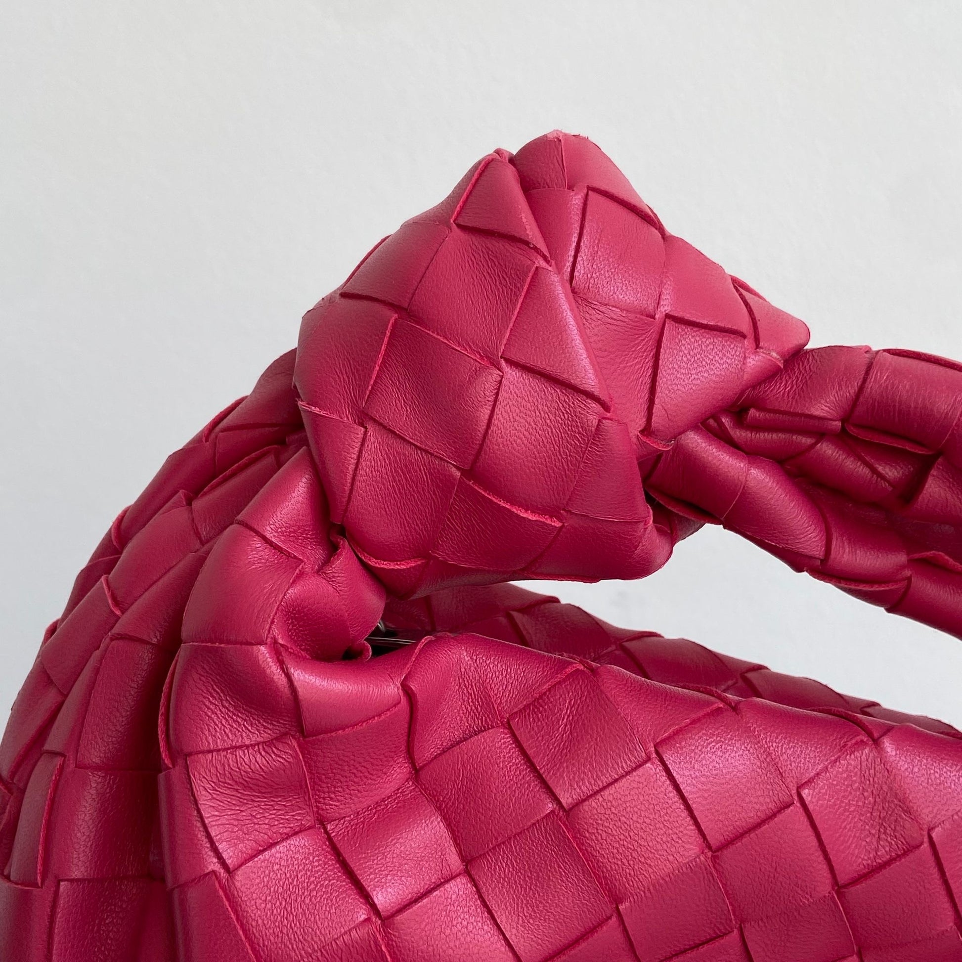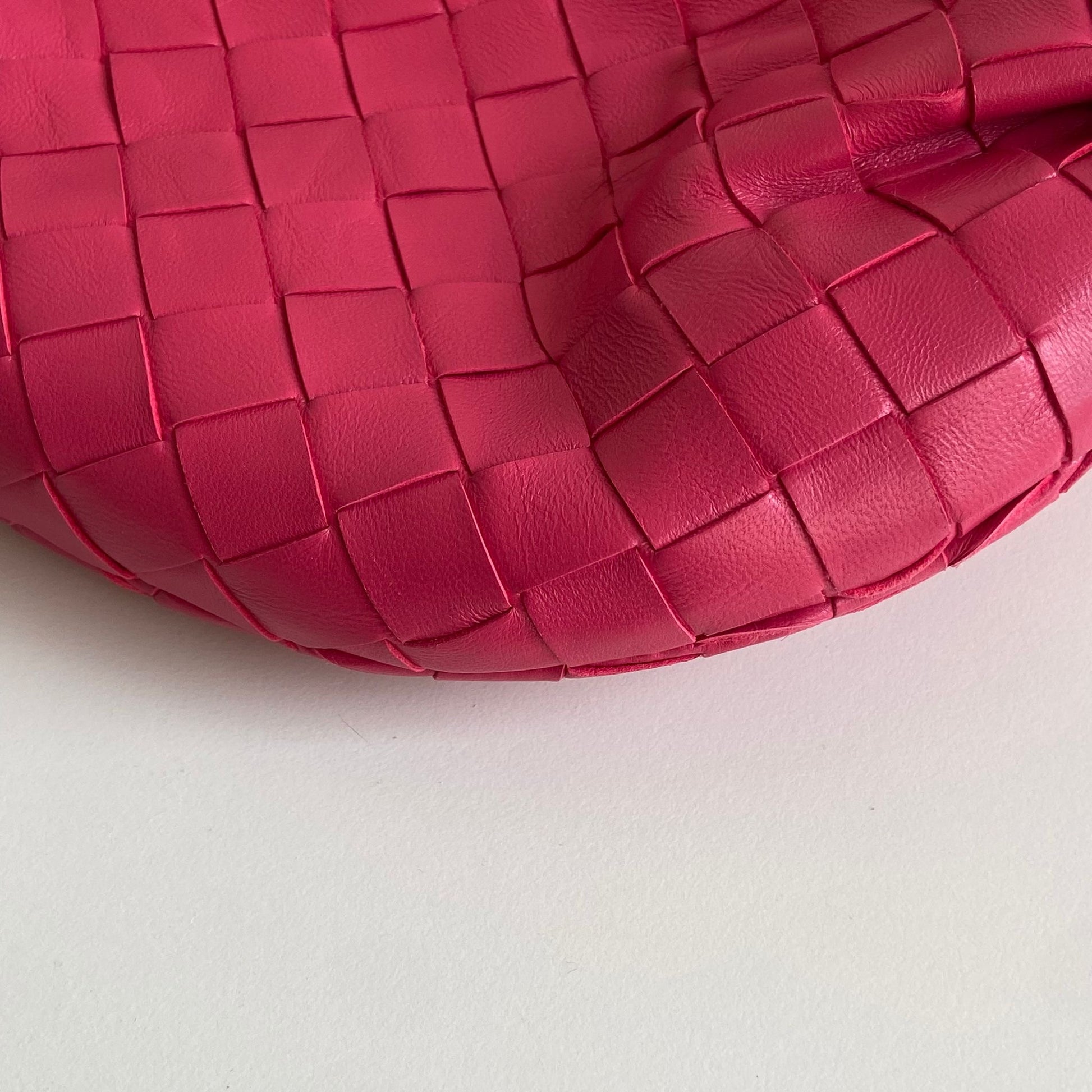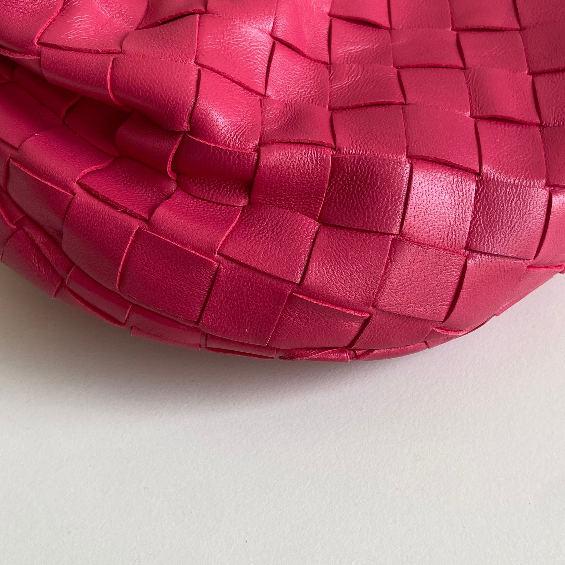Meravigliosa borsa Bottega Veneta modello mini Jodie in pelle intrecciata rosa Cranberry e hardware argento. Si indossa a mano.