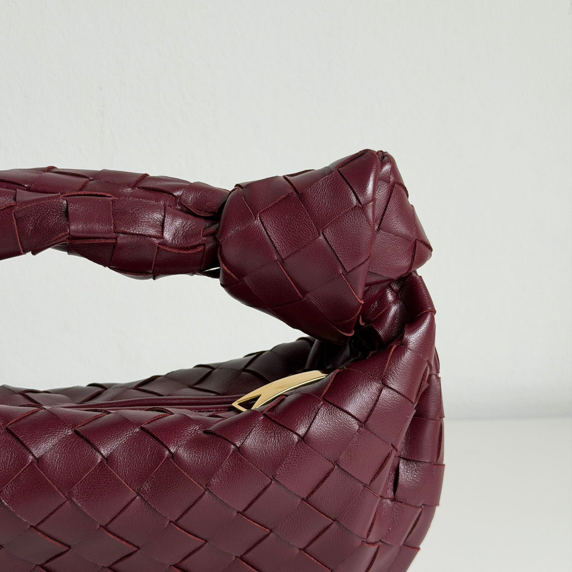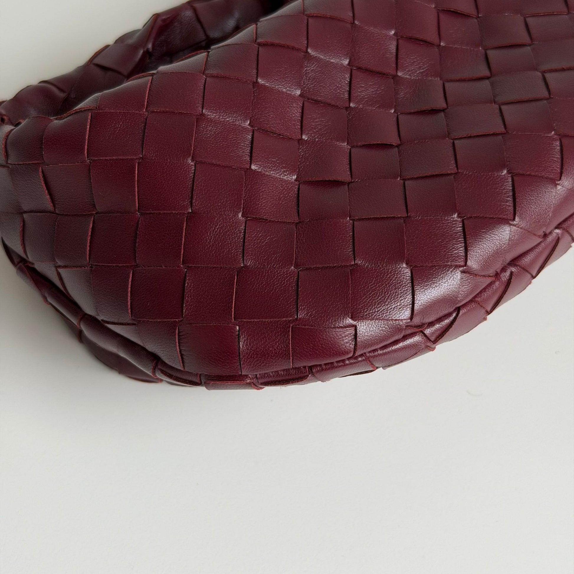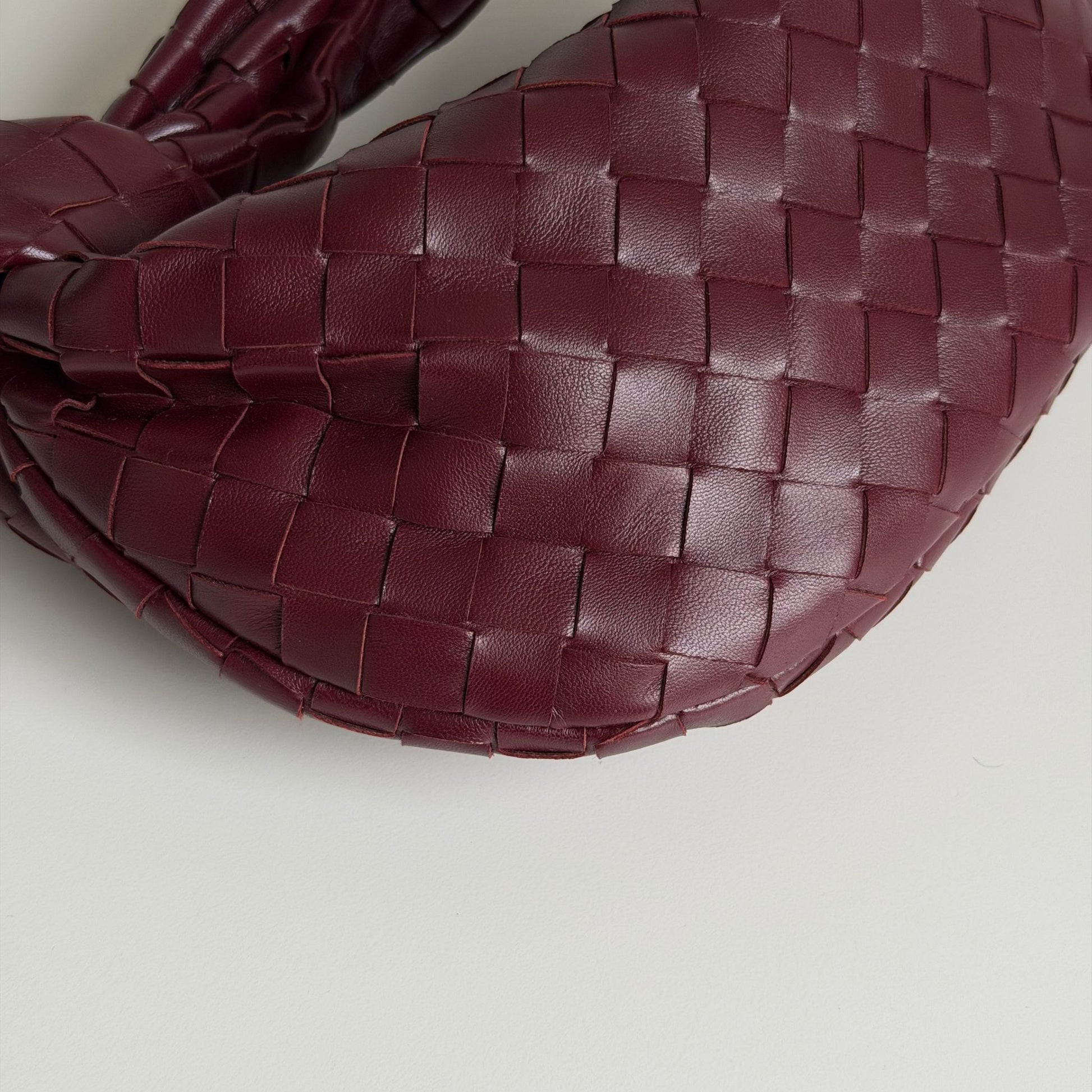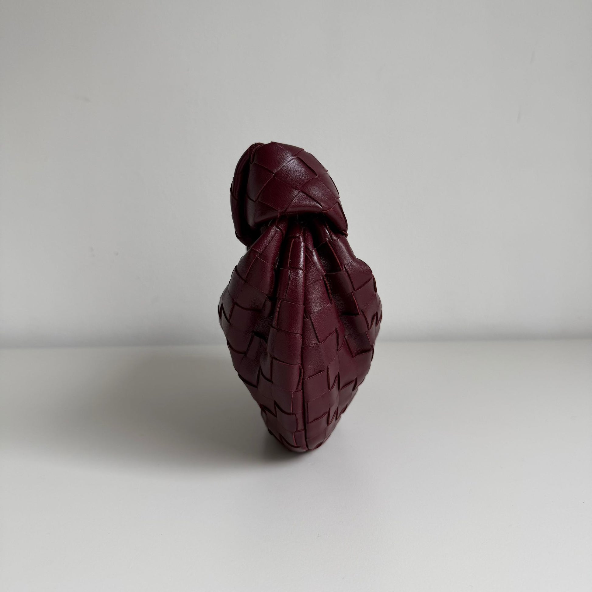 Meravigliosa borsa Bottega Veneta modello mini Jodie intrecciata in pelle bordeaux Baroloe hardware oro. Si indossa a mano.