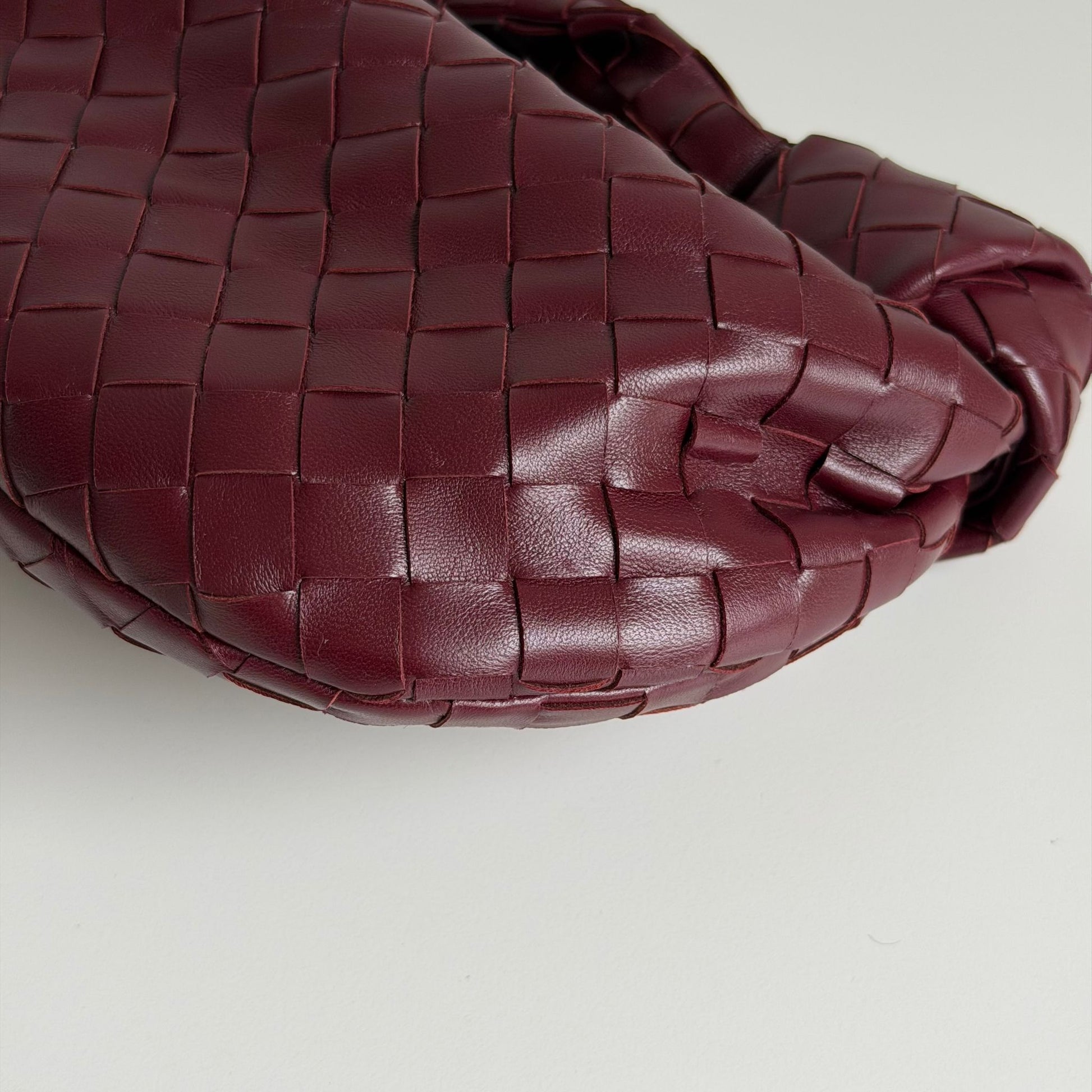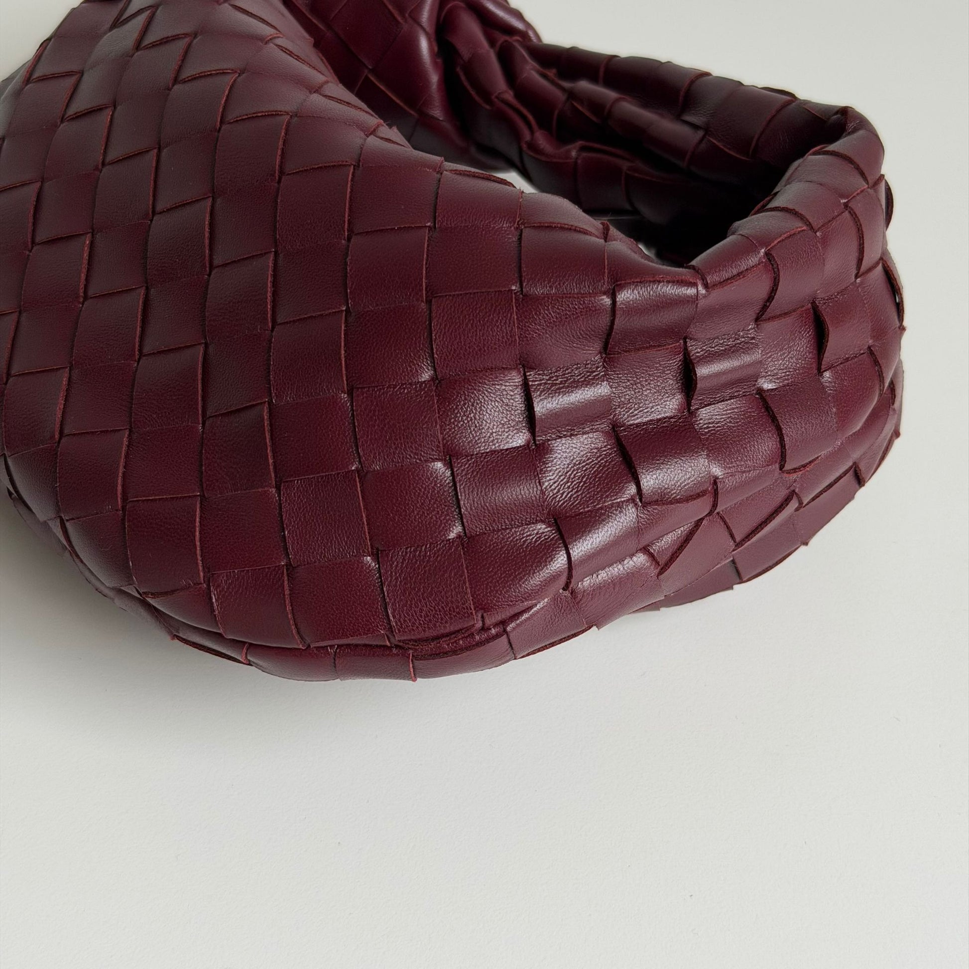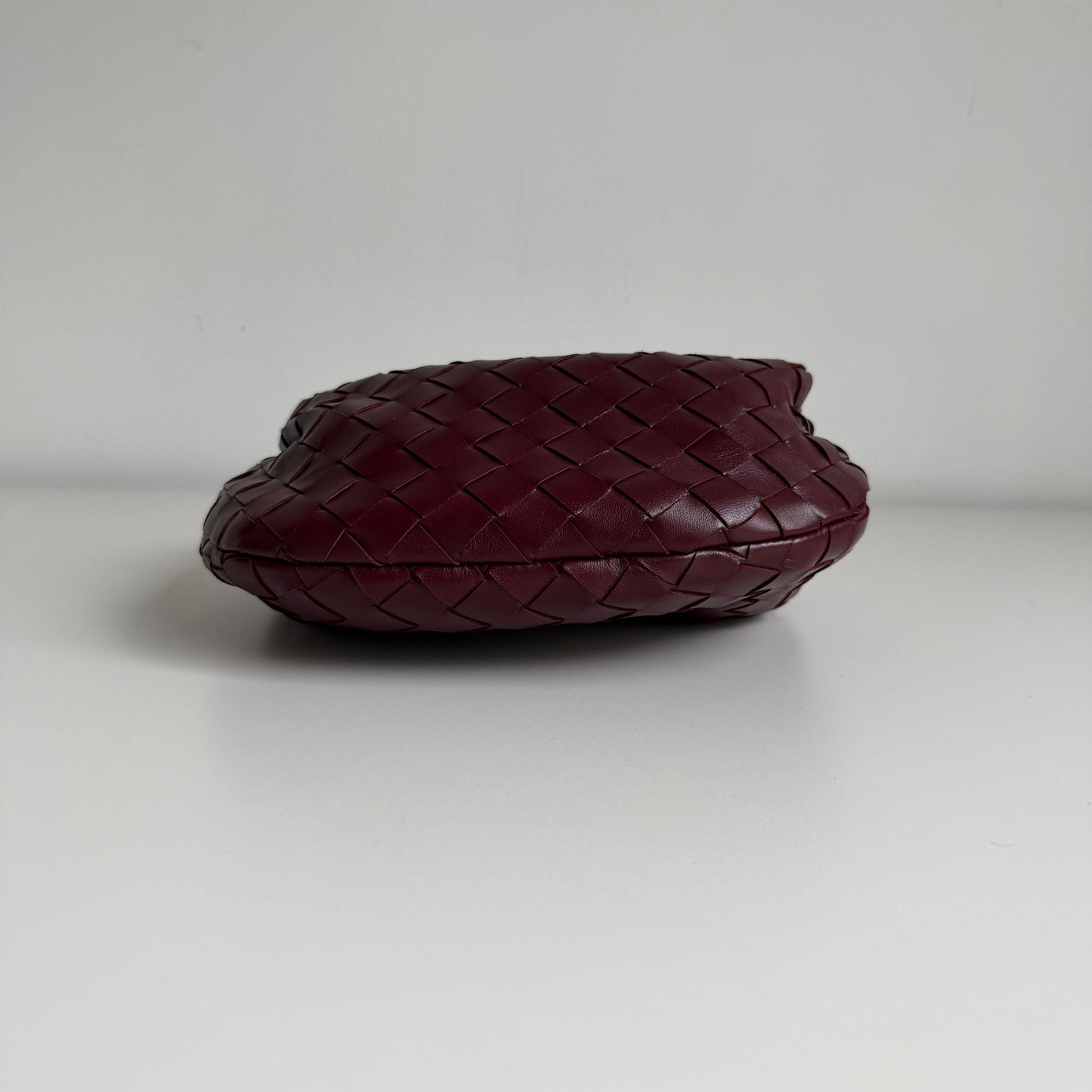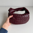 Meravigliosa borsa Bottega Veneta modello mini Jodie intrecciata in pelle bordeaux Baroloe hardware oro. Si indossa a mano.