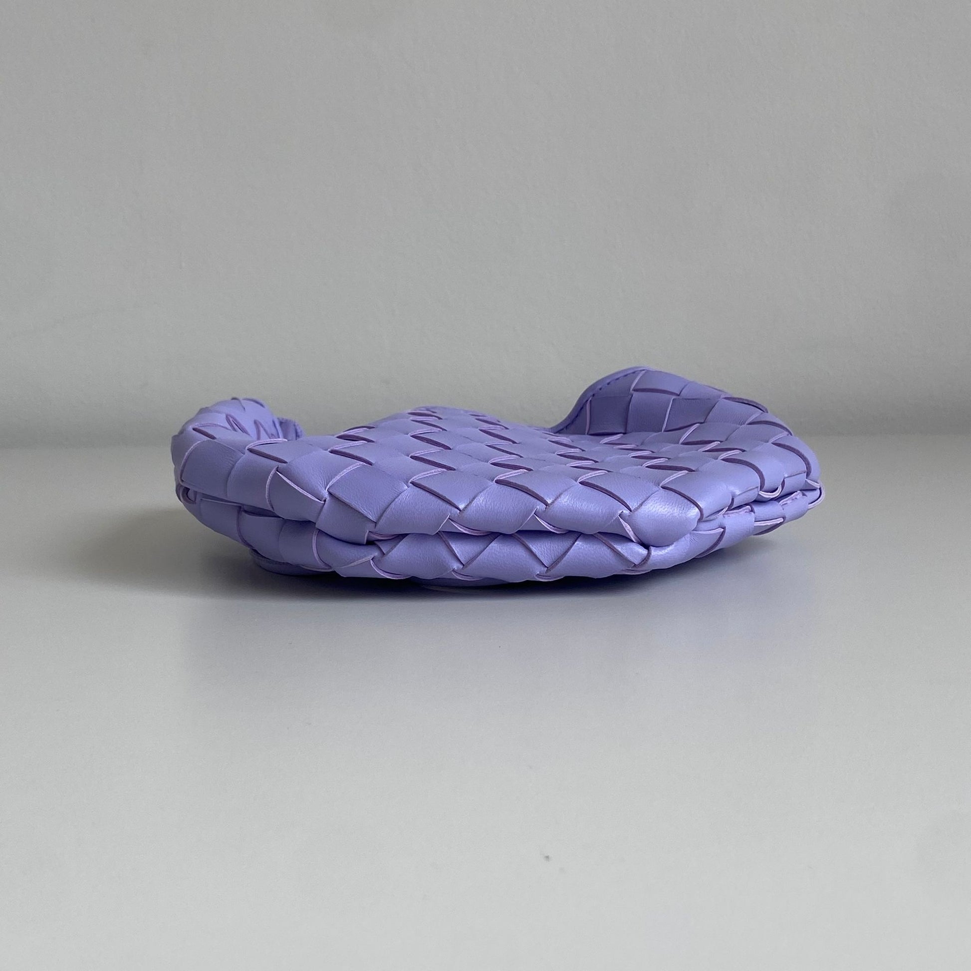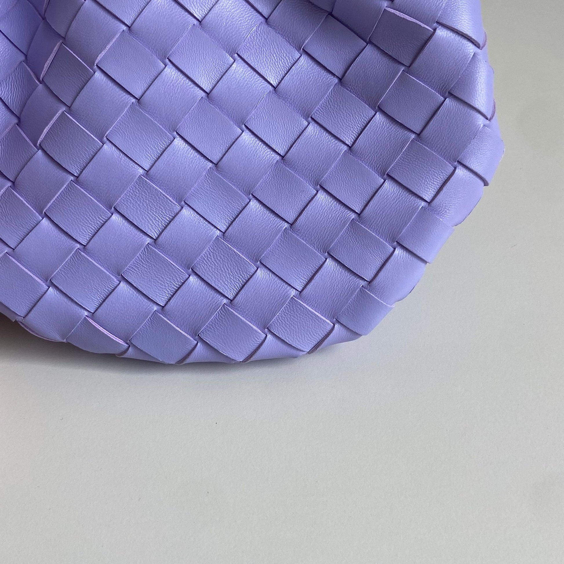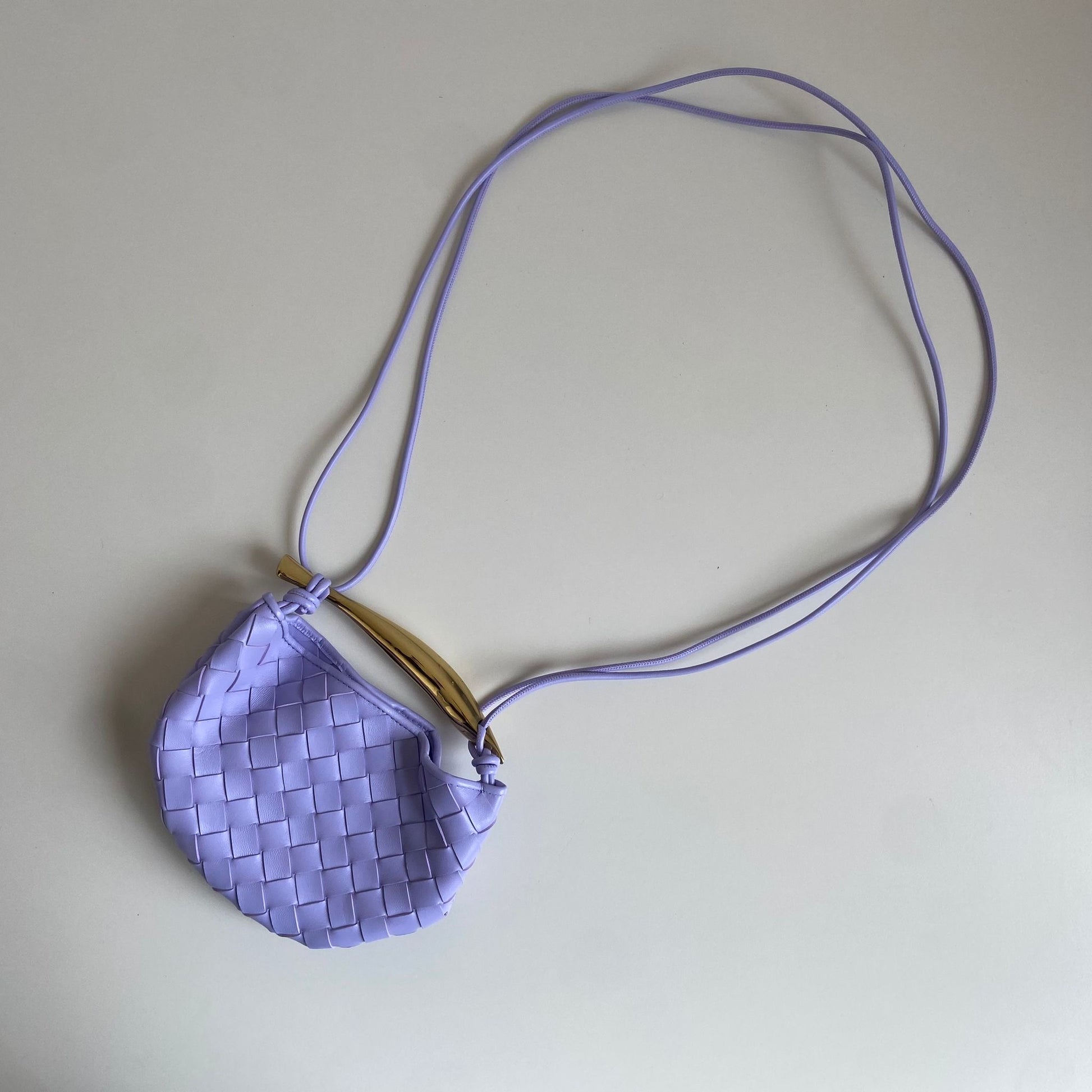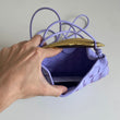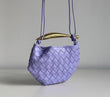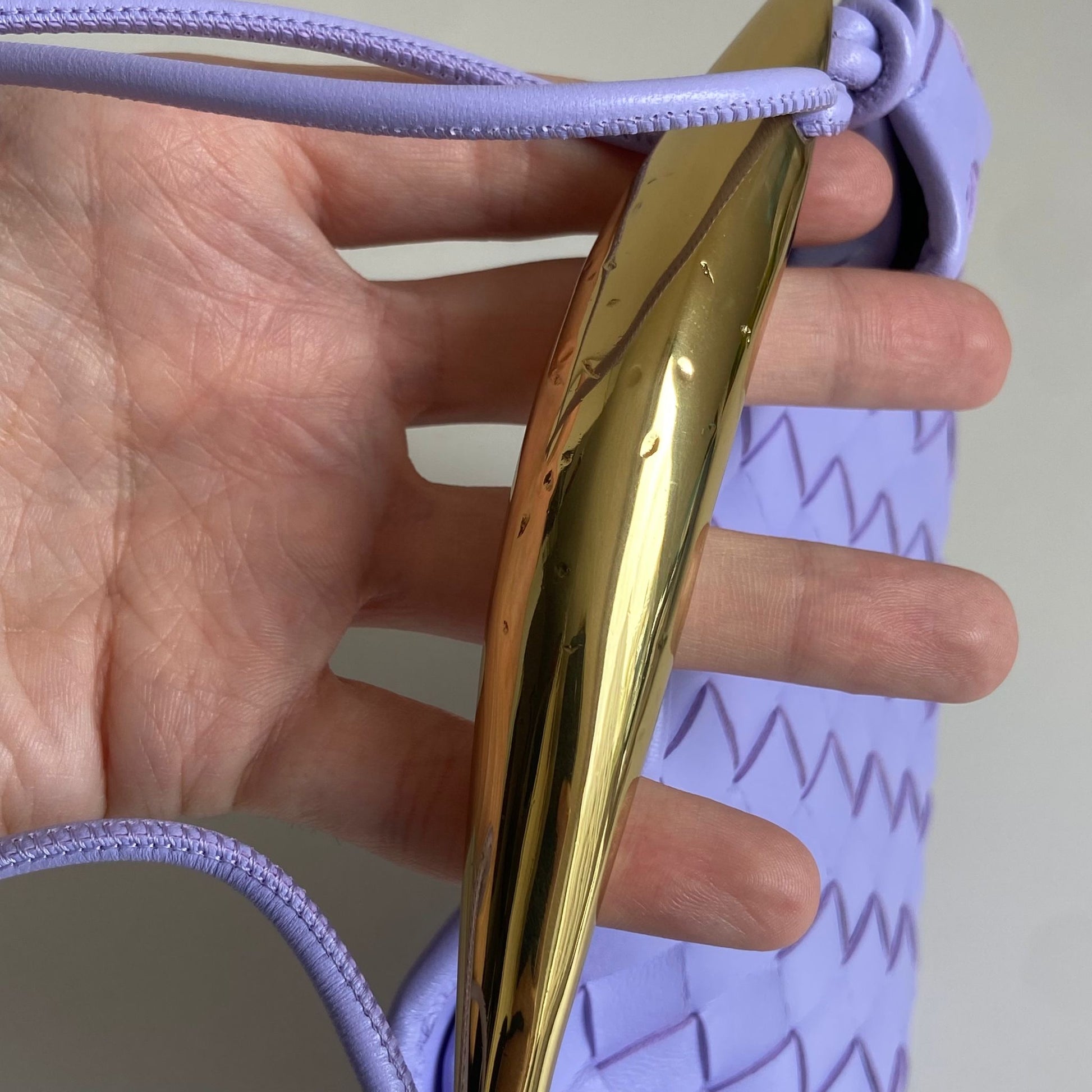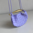 Meravigliosa borsa Bottega Veneta modello Mini Sardine in pelle intrecciata lilla chiaro e manico oro. Si indossa a mano e a tracolla. La tracolla non è regolabile né rimovibile.
