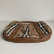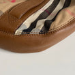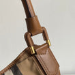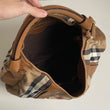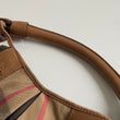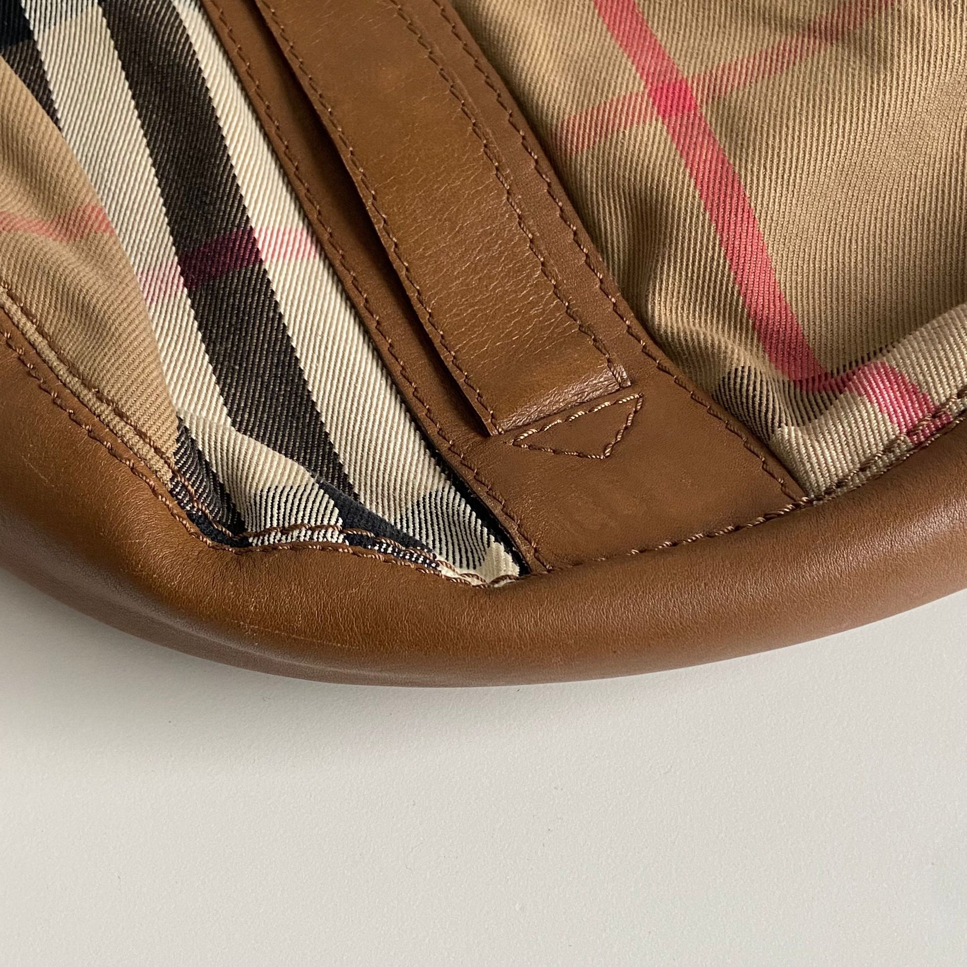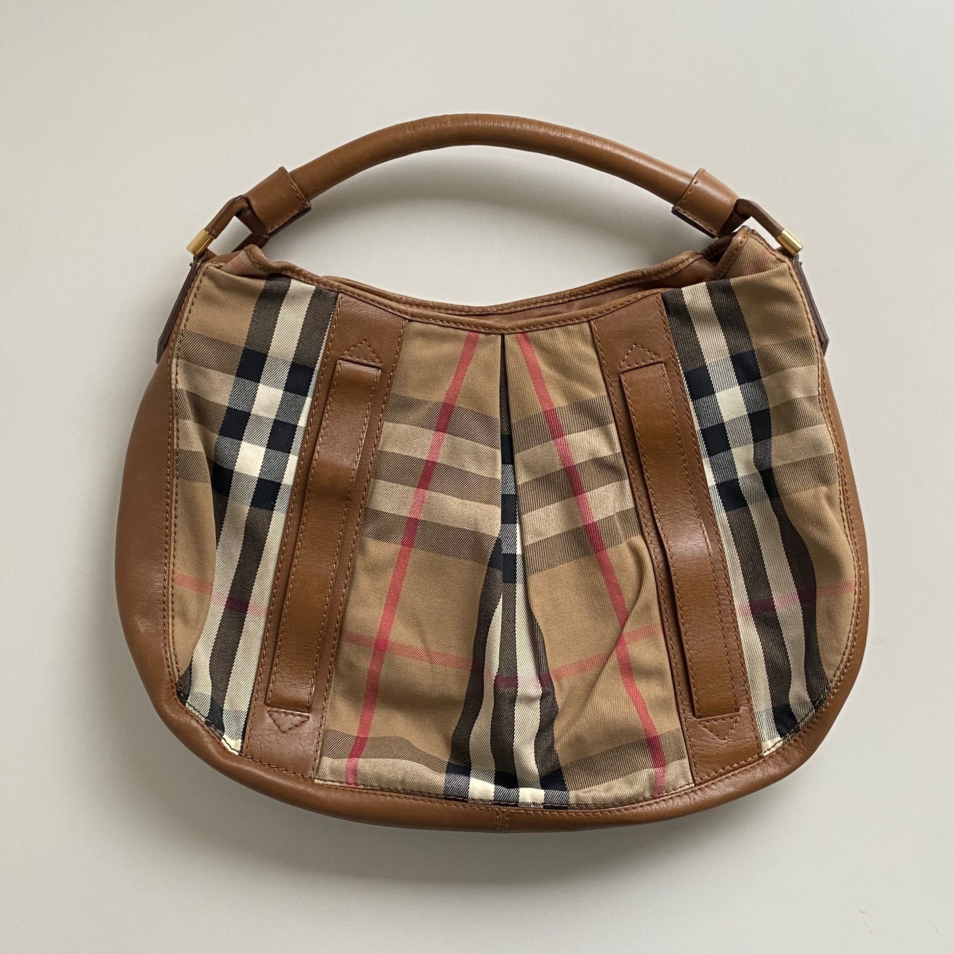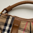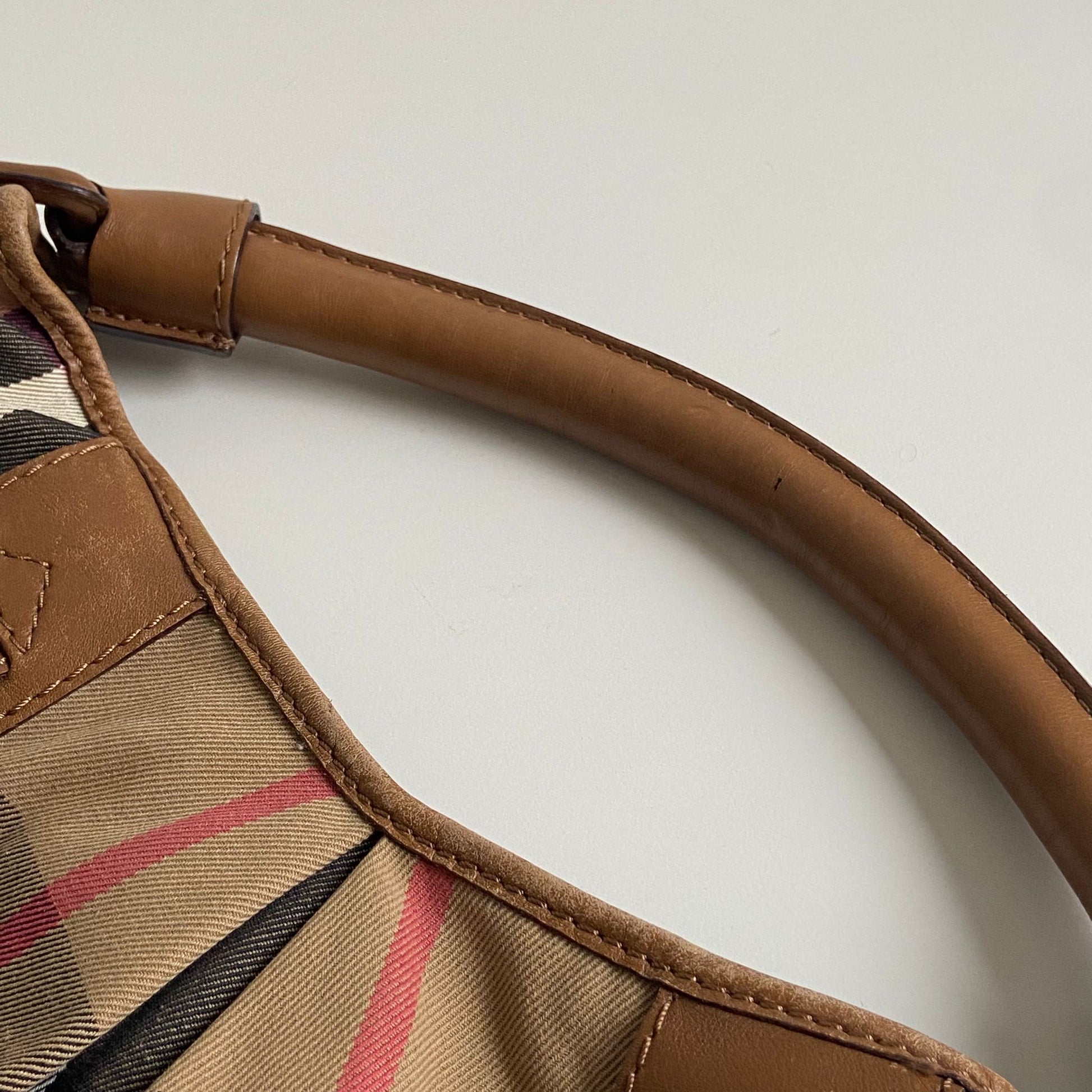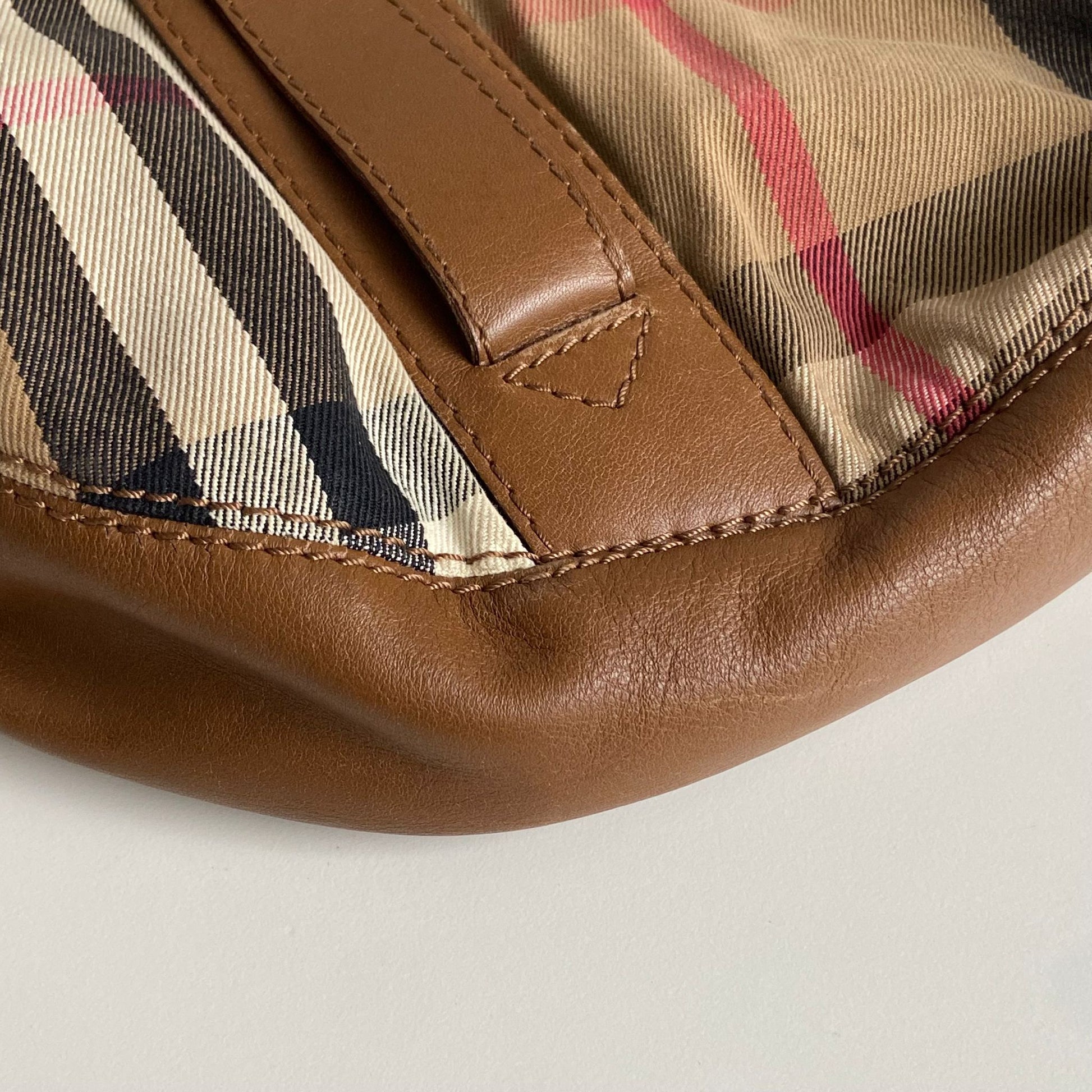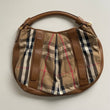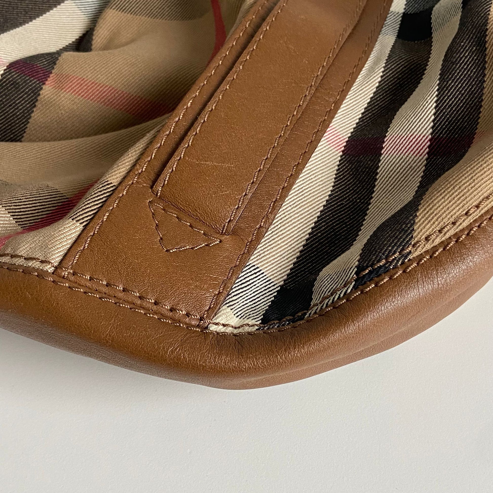 Meravigliosa borsa Burberry modello Hobo in tela check beige, pelle marrone e hardware oro. Si indossa a spalla.
