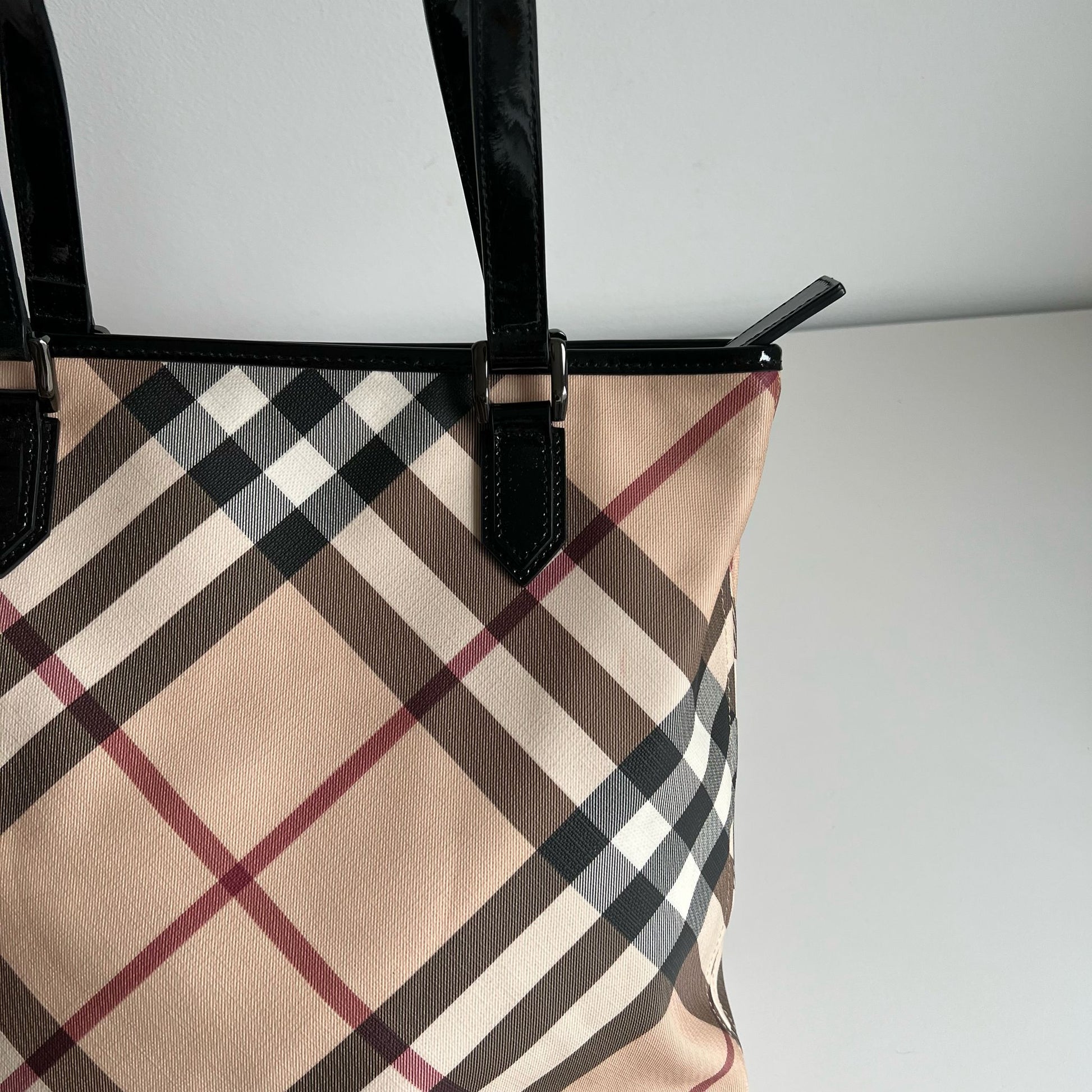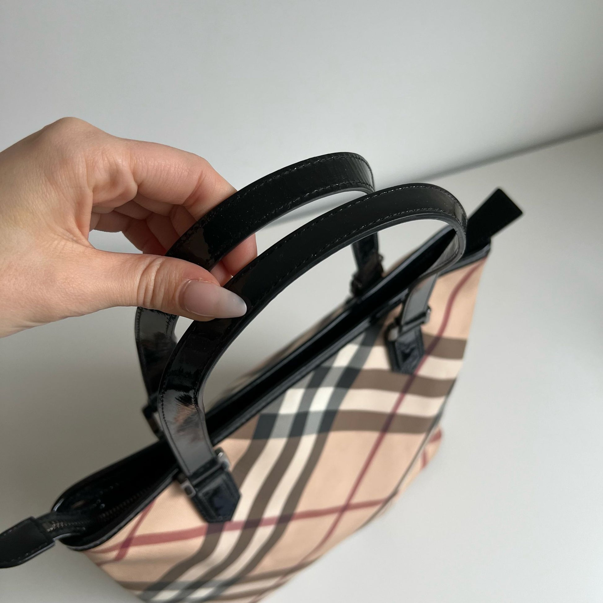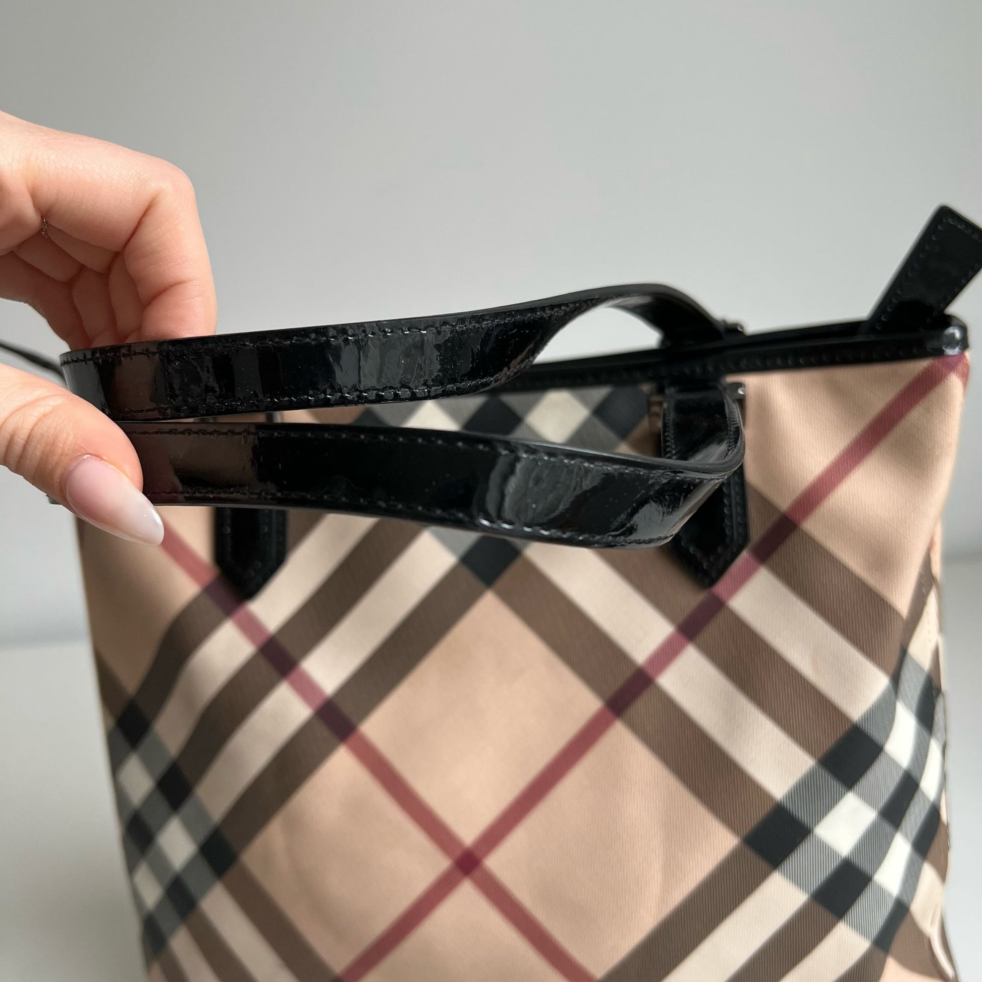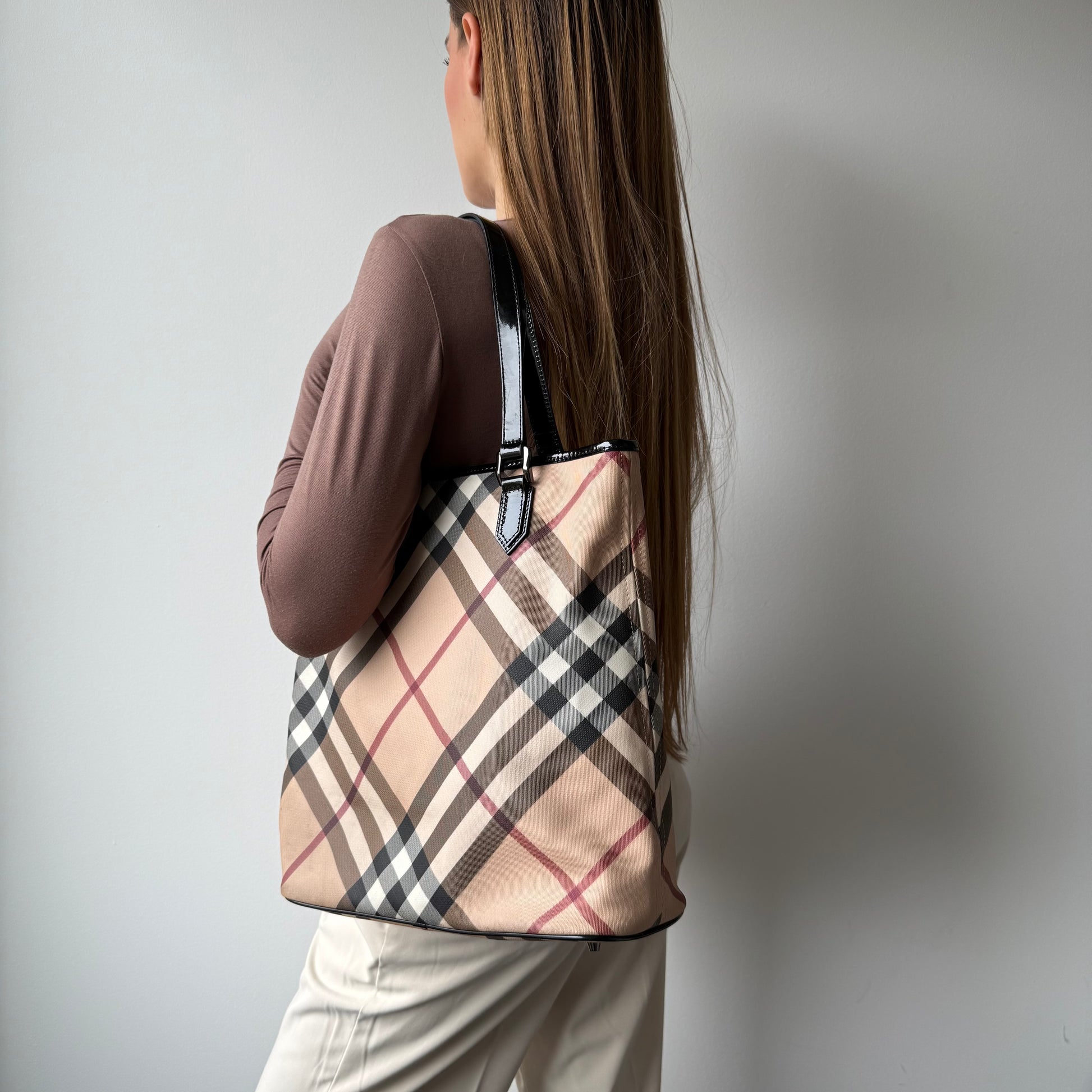 Stupenda borsa vintage Burberry modello Shopper nel classico check con dettagli in pelle lucida nera e hardware nero. Si indossa a spalla.
