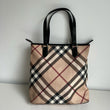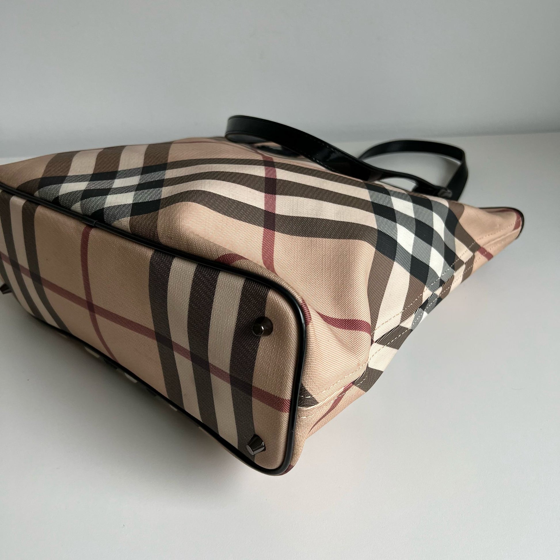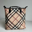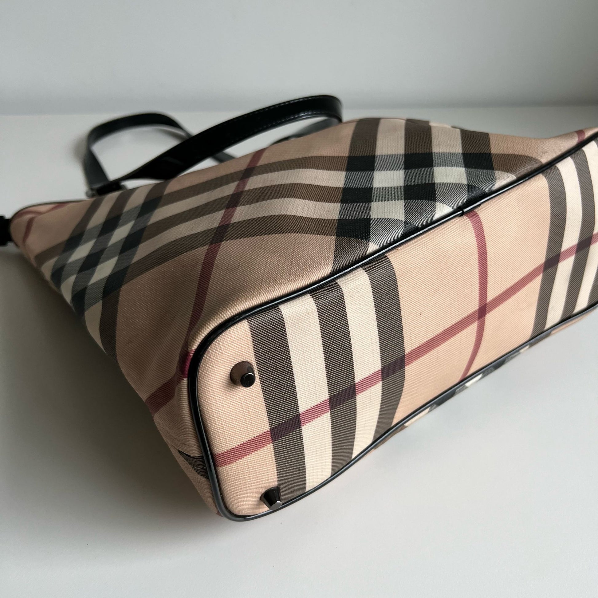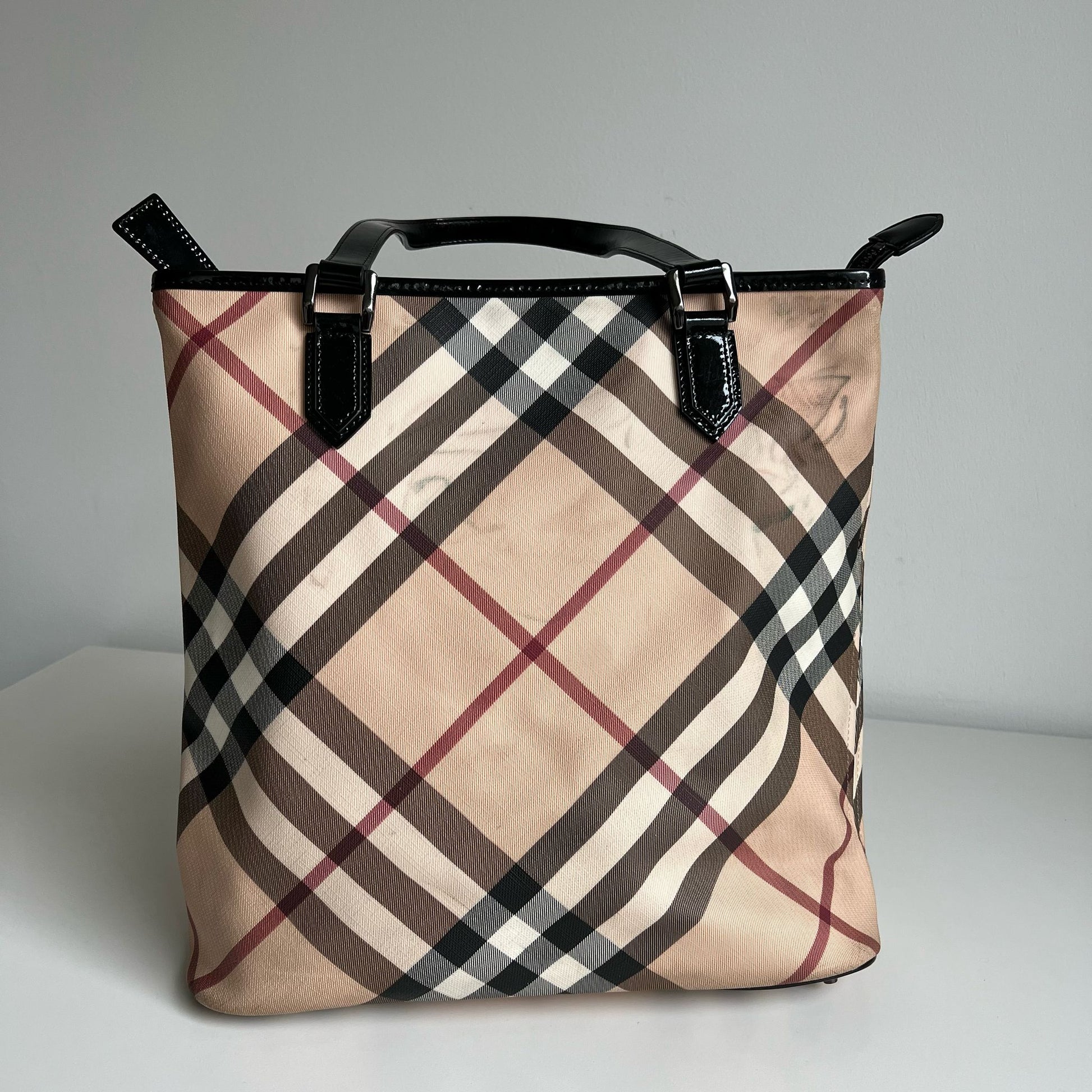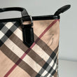 Stupenda borsa vintage Burberry modello Shopper nel classico check con dettagli in pelle lucida nera e hardware nero. Si indossa a spalla.