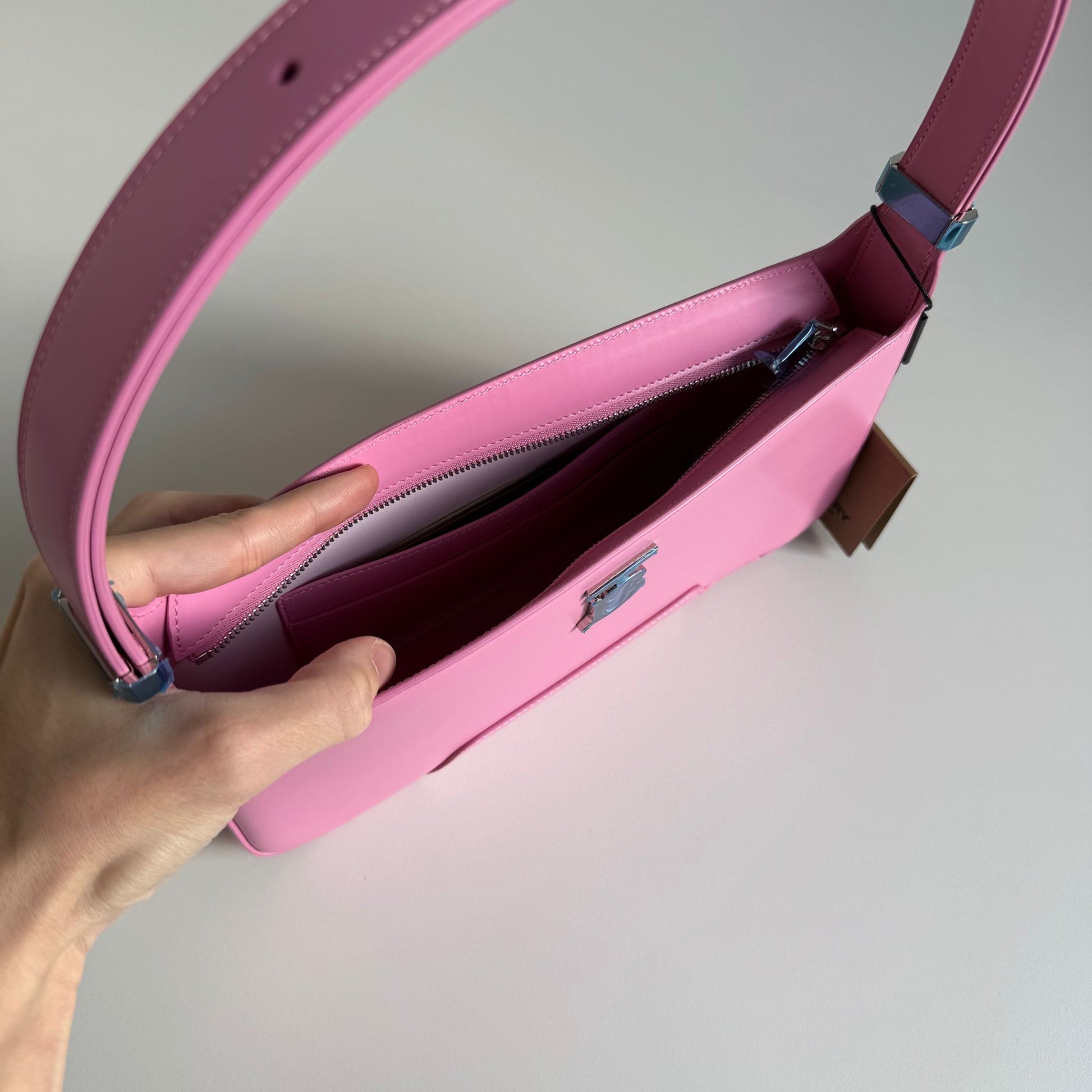Bellissima Burberry modello TB bag a spalla, colore rosa Candy con hardware argento.