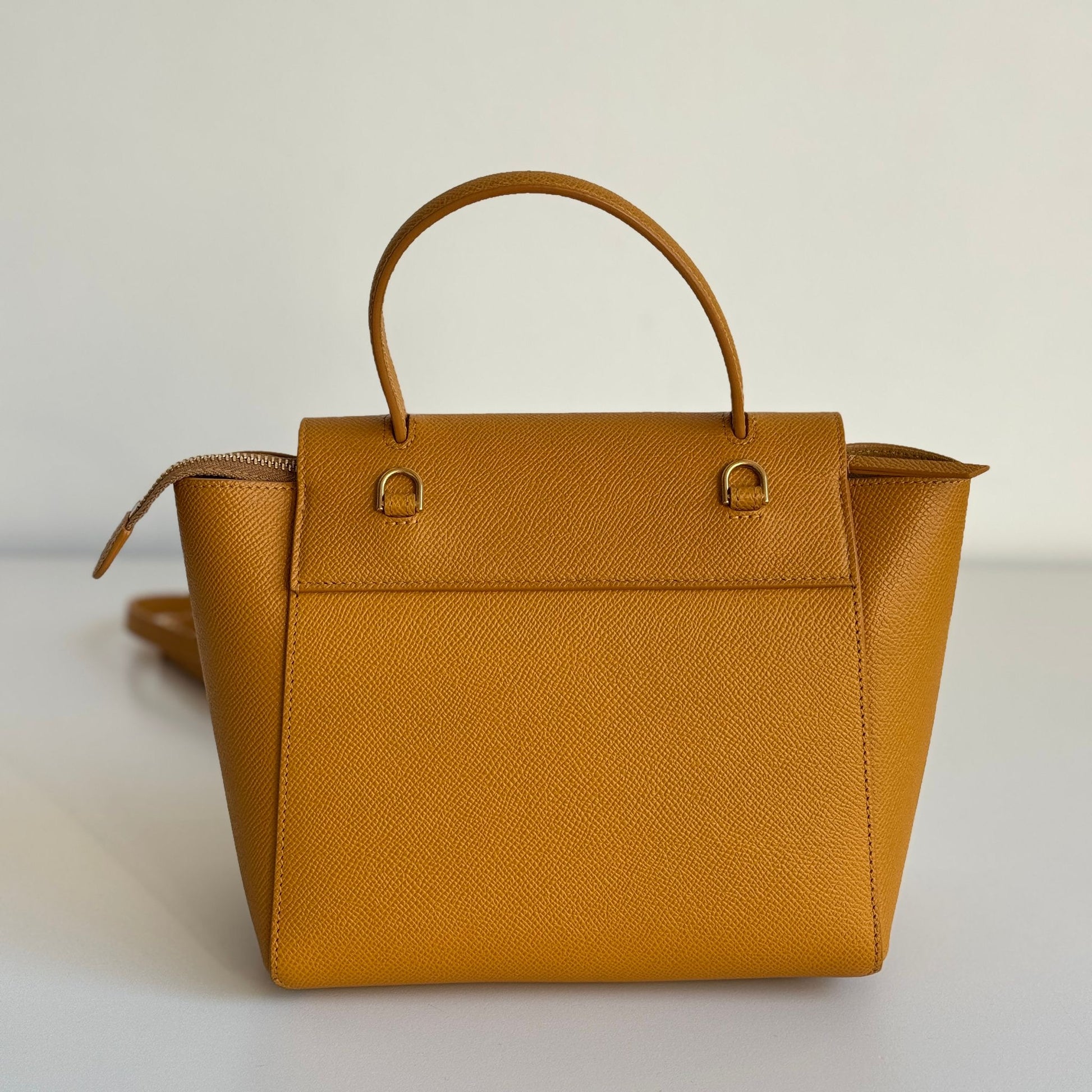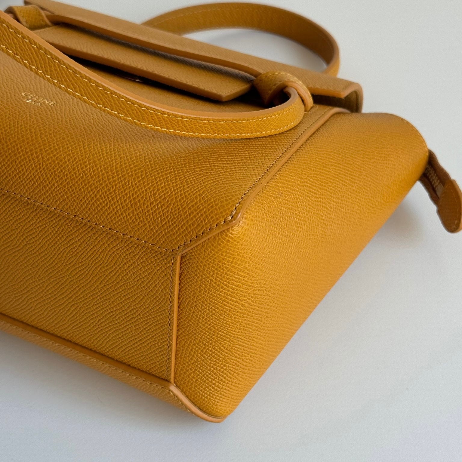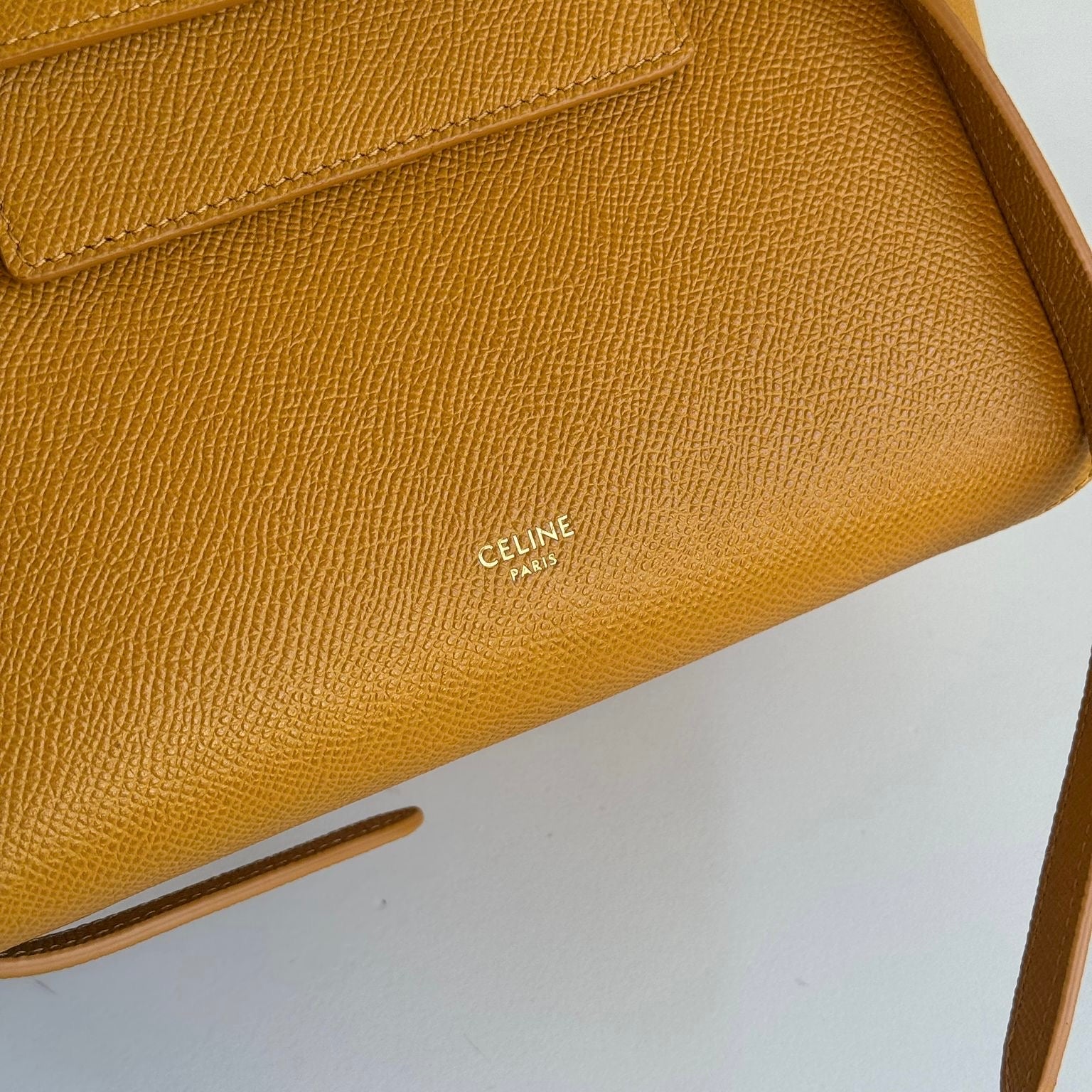 Bellissima borsa Celine modello Belt in pelle martellata giallo senape e hardware argento. Si indossa a mano e a tracolla, la tracolla è rimovibile e regolabile.
