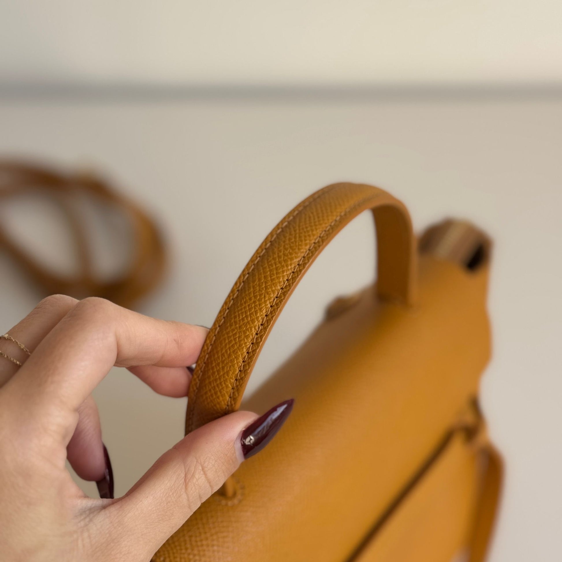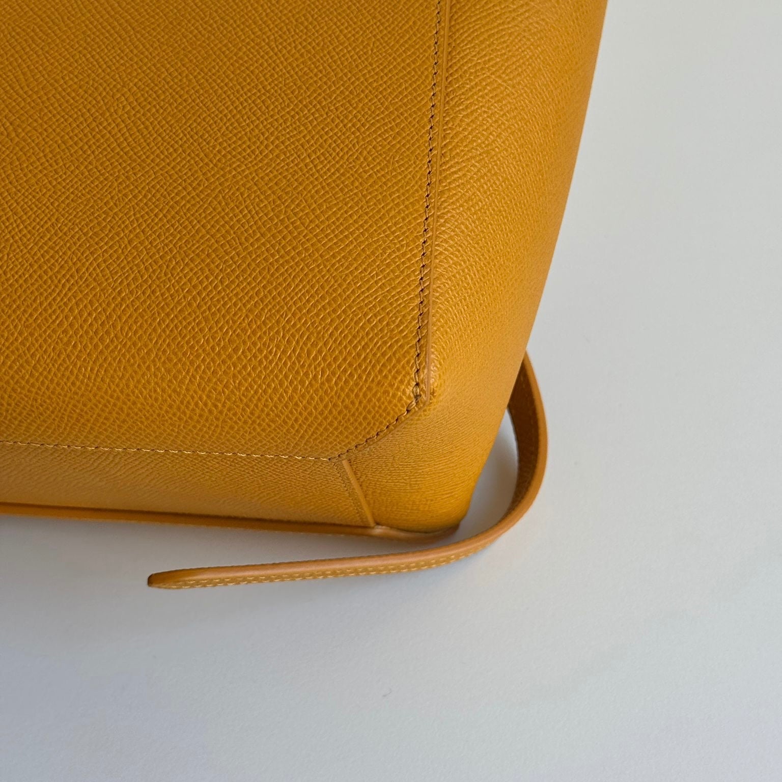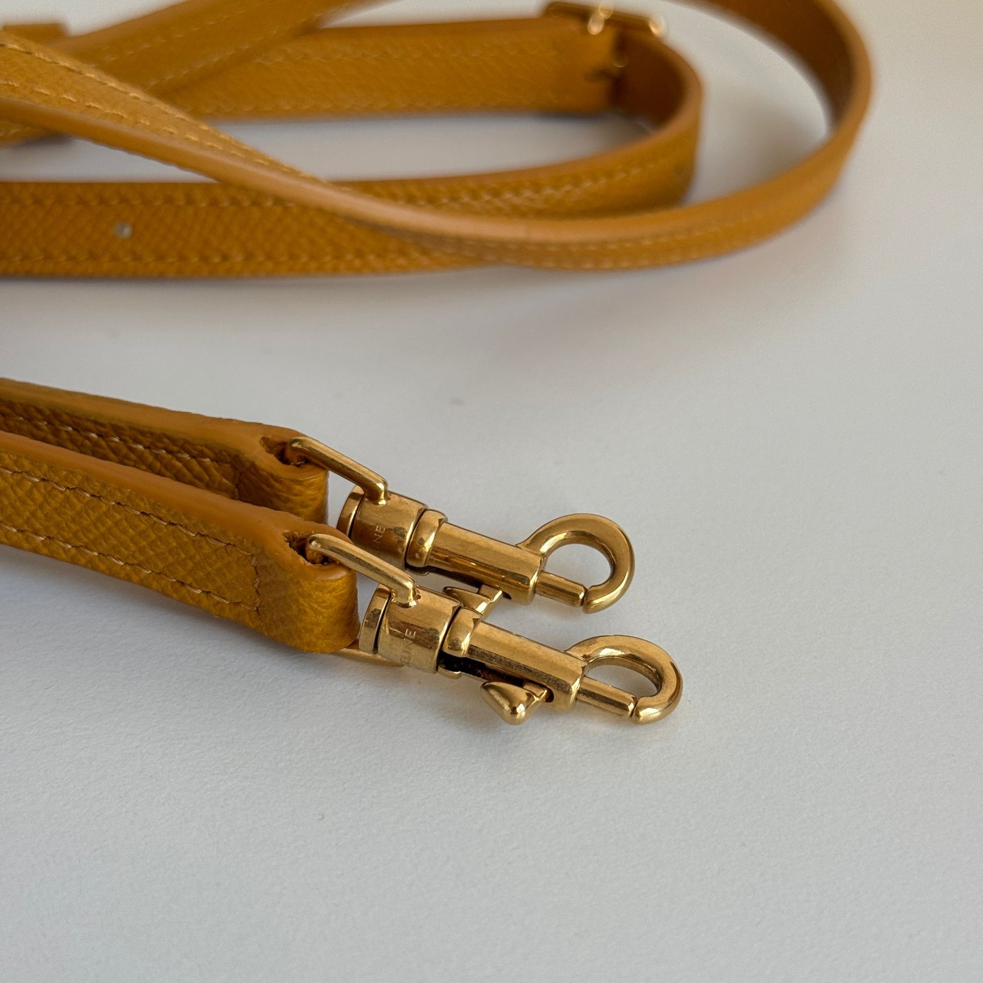 Bellissima borsa Celine modello Belt in pelle martellata giallo senape e hardware argento. Si indossa a mano e a tracolla, la tracolla è rimovibile e regolabile.