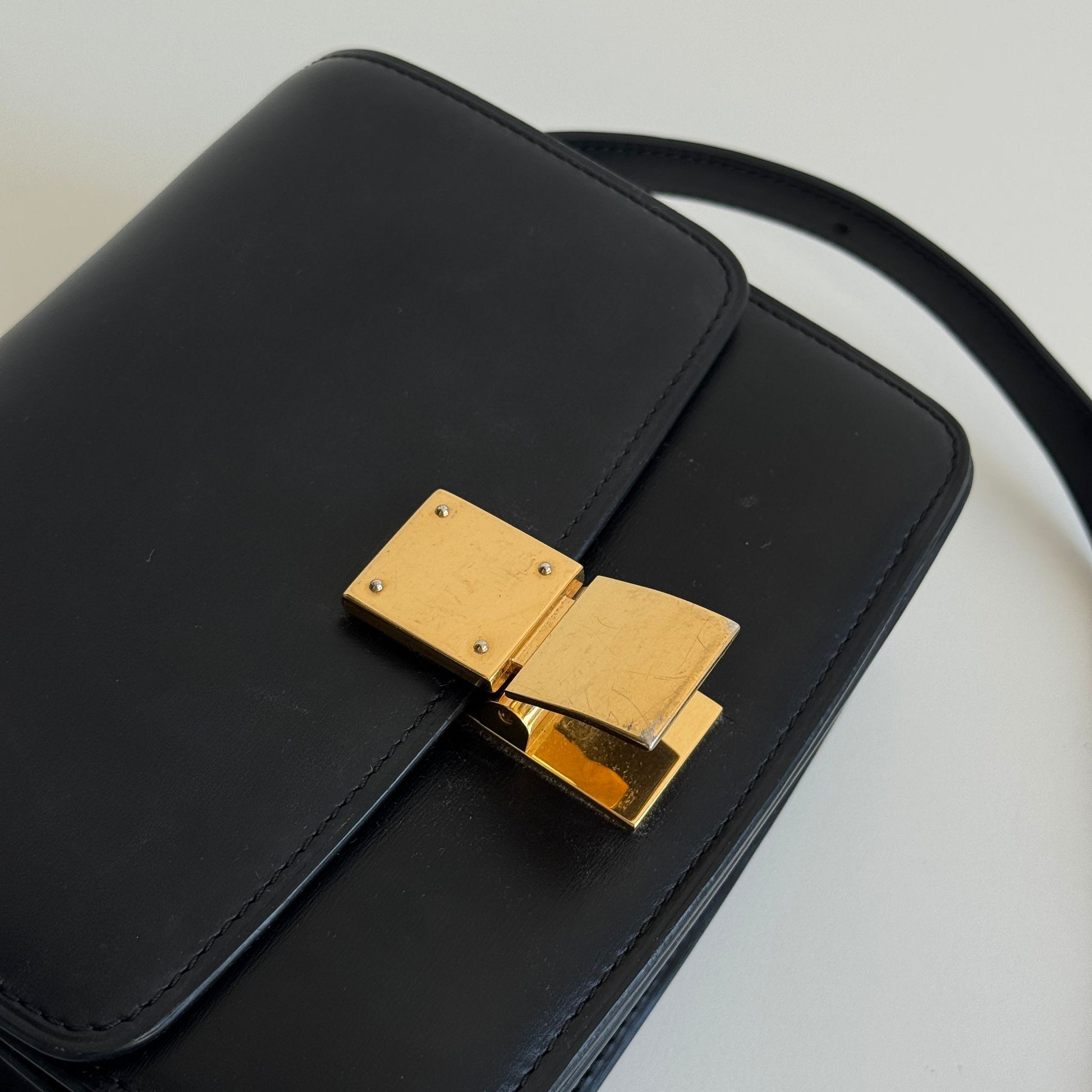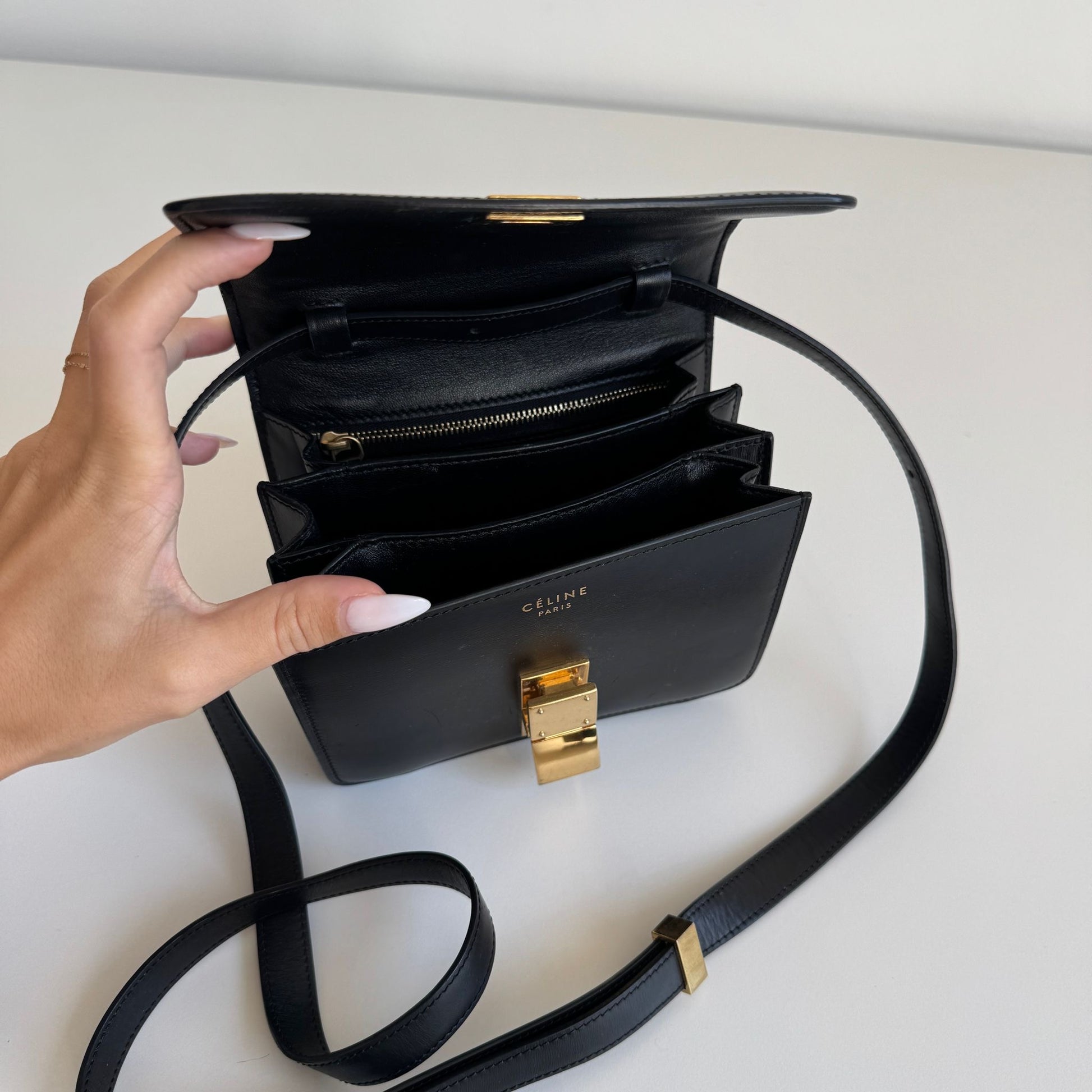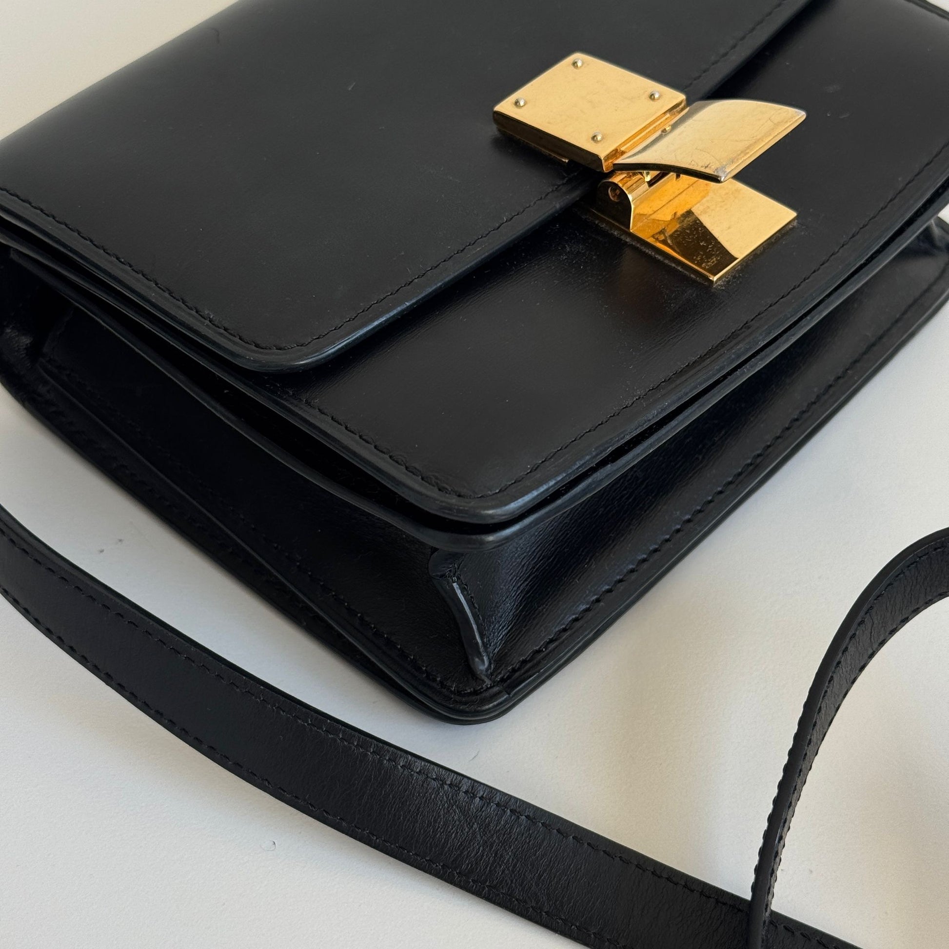 Bellissima borsa Celine modello Classic Box in pelle liscia nera e hardware oro. Si indossa a tracolla, la tracolla è regolabile e rimovibile.
