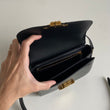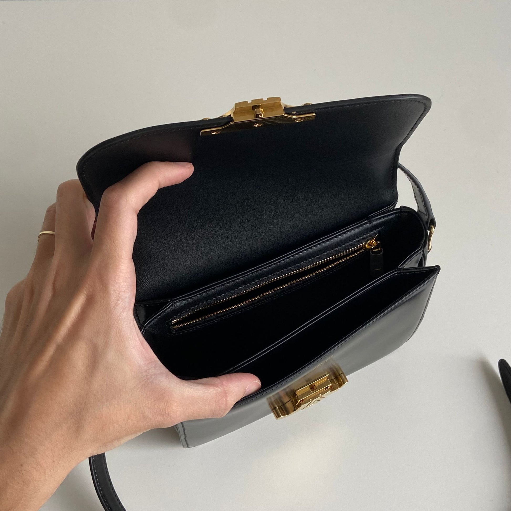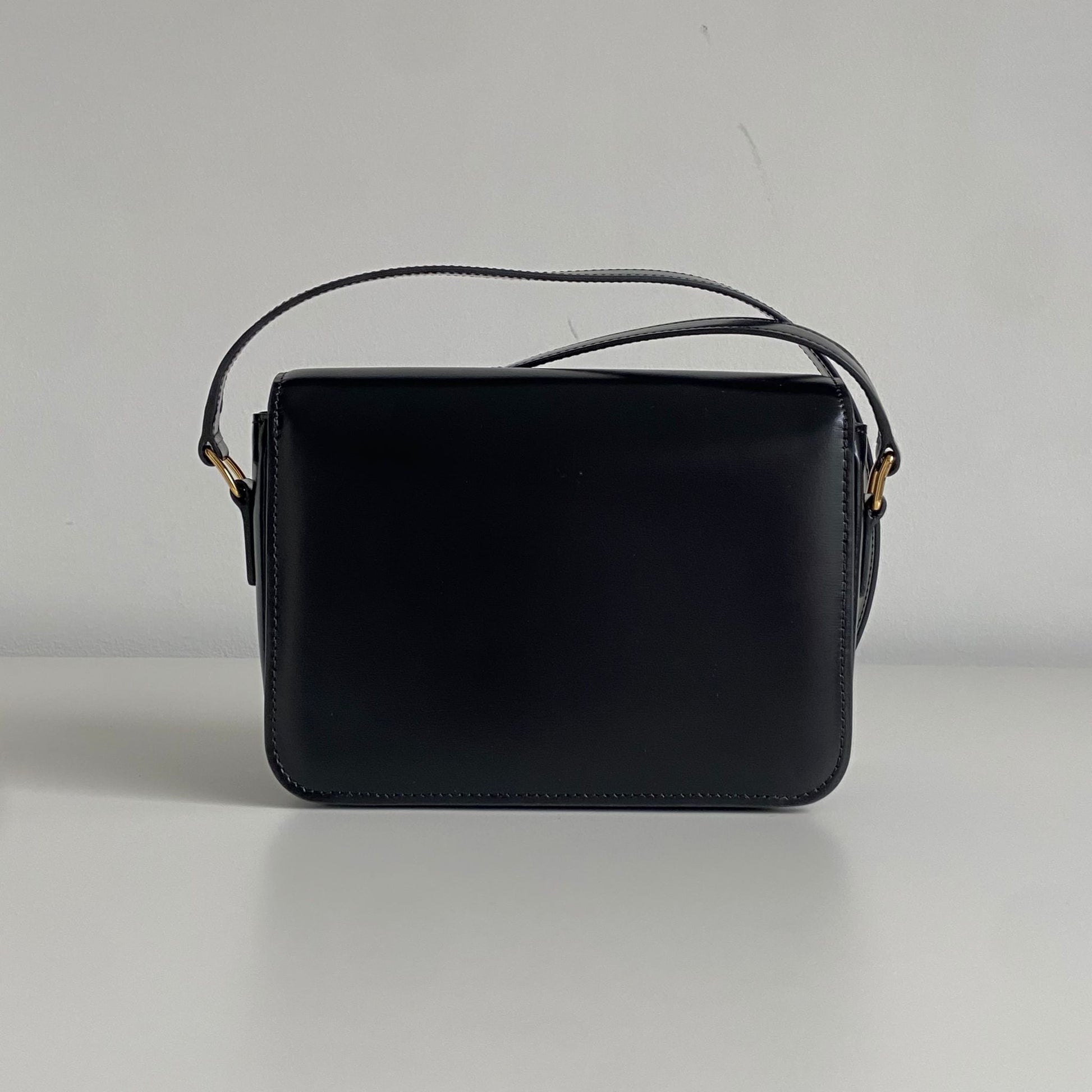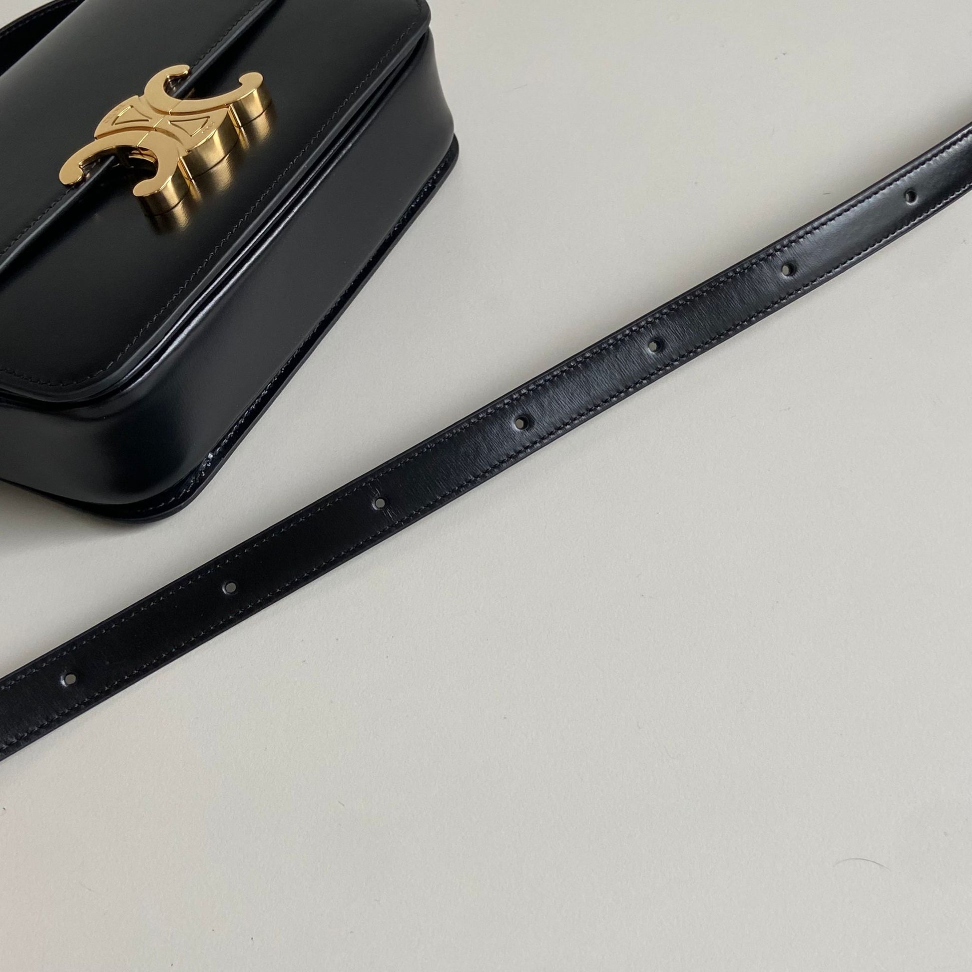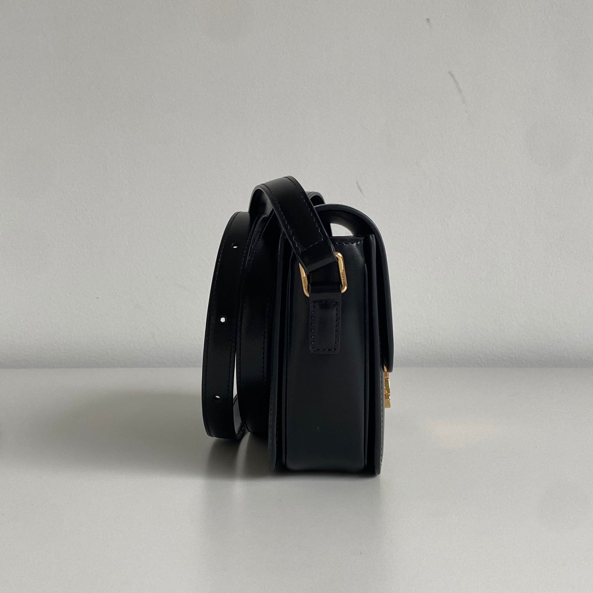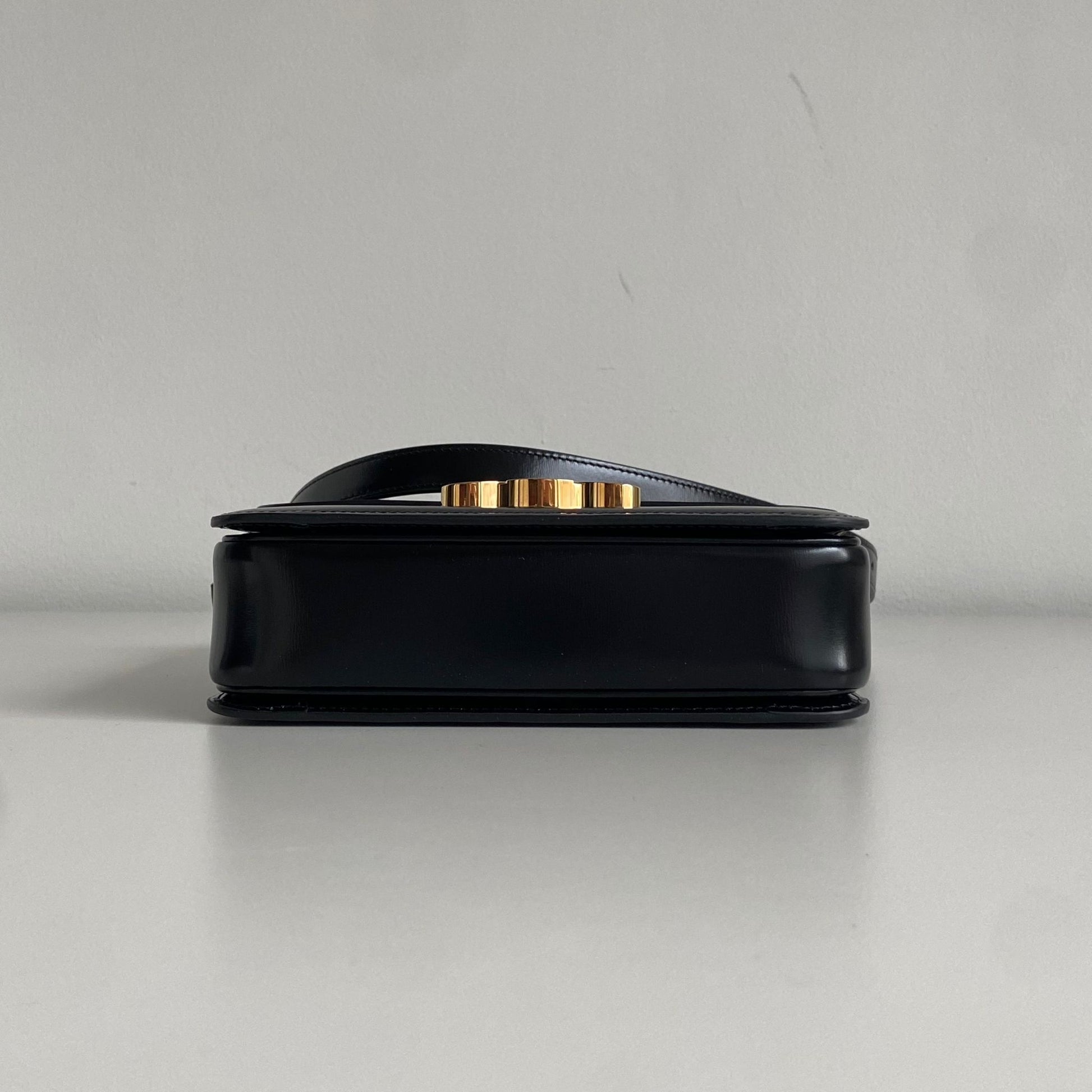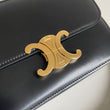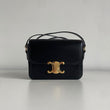 Iconica borsa Celine modello Triomphe Teen in pelle nera e hardware oro. Si indossa a spalla o a tracolla, la tracolla è regolabile.