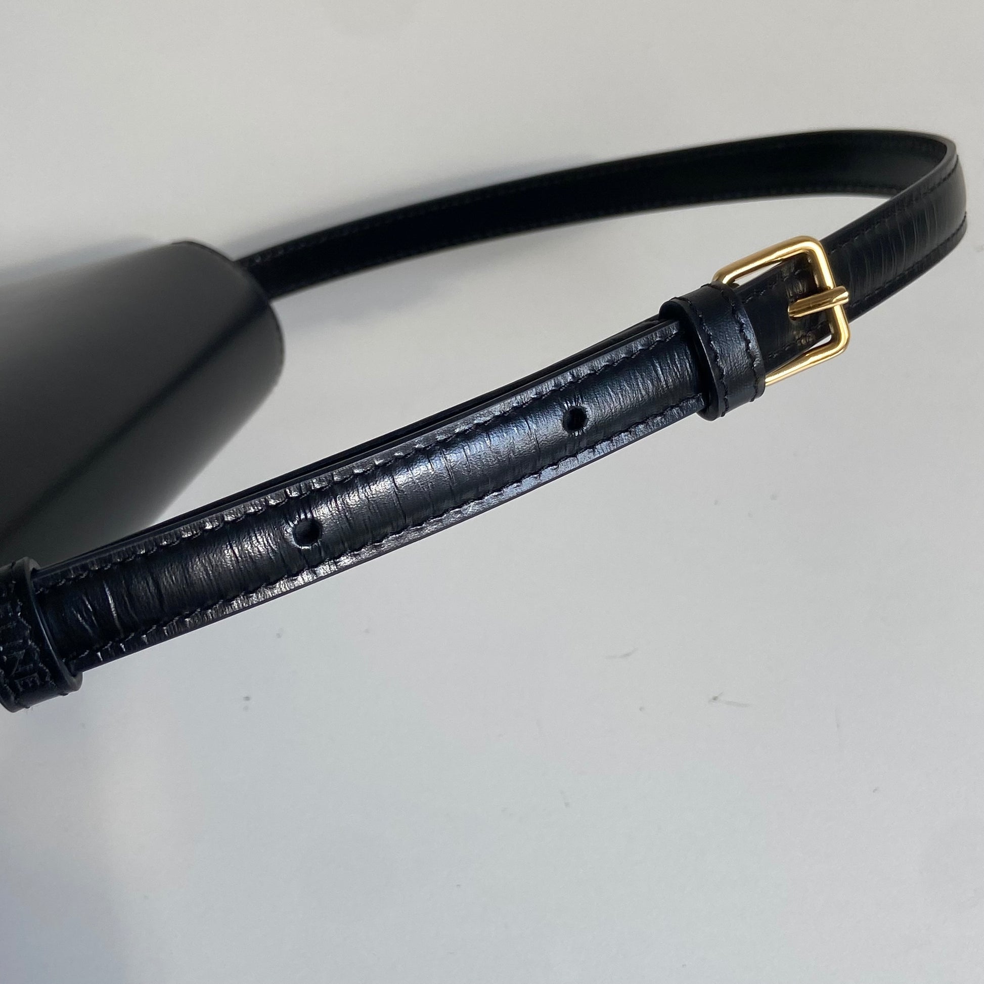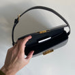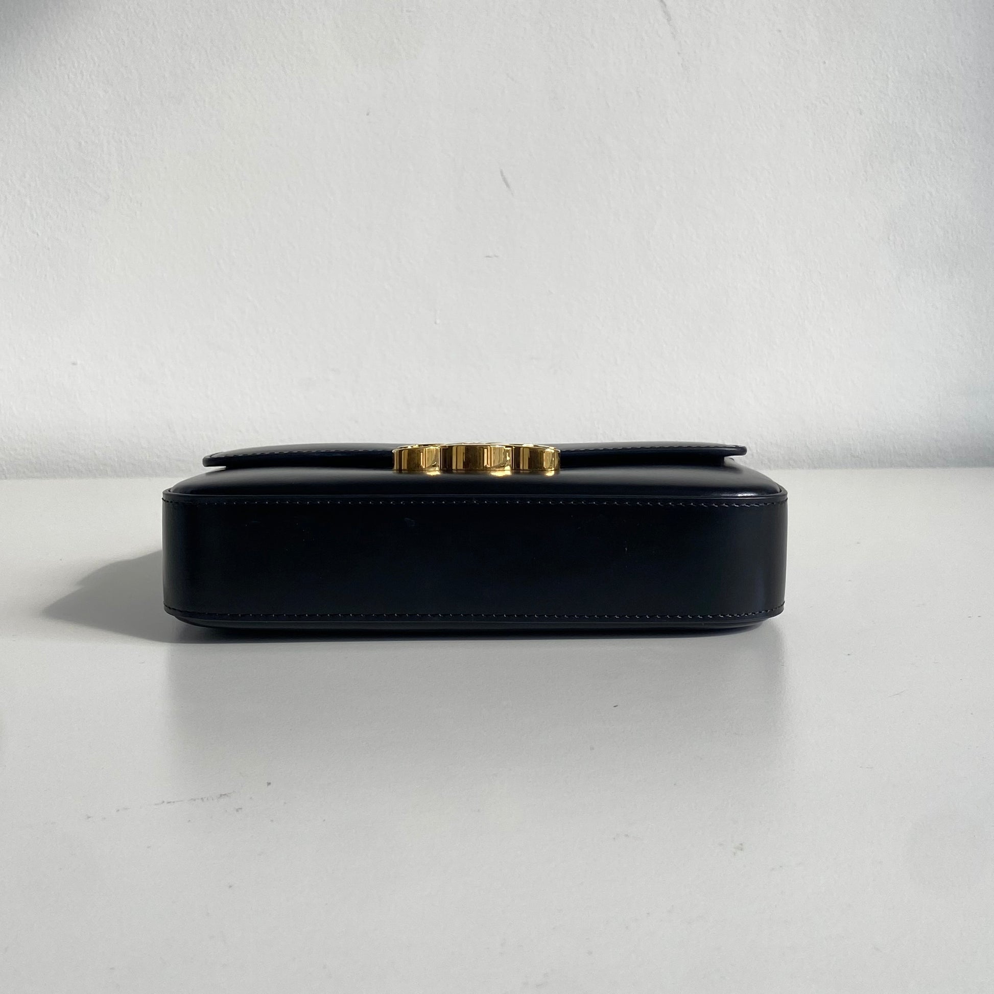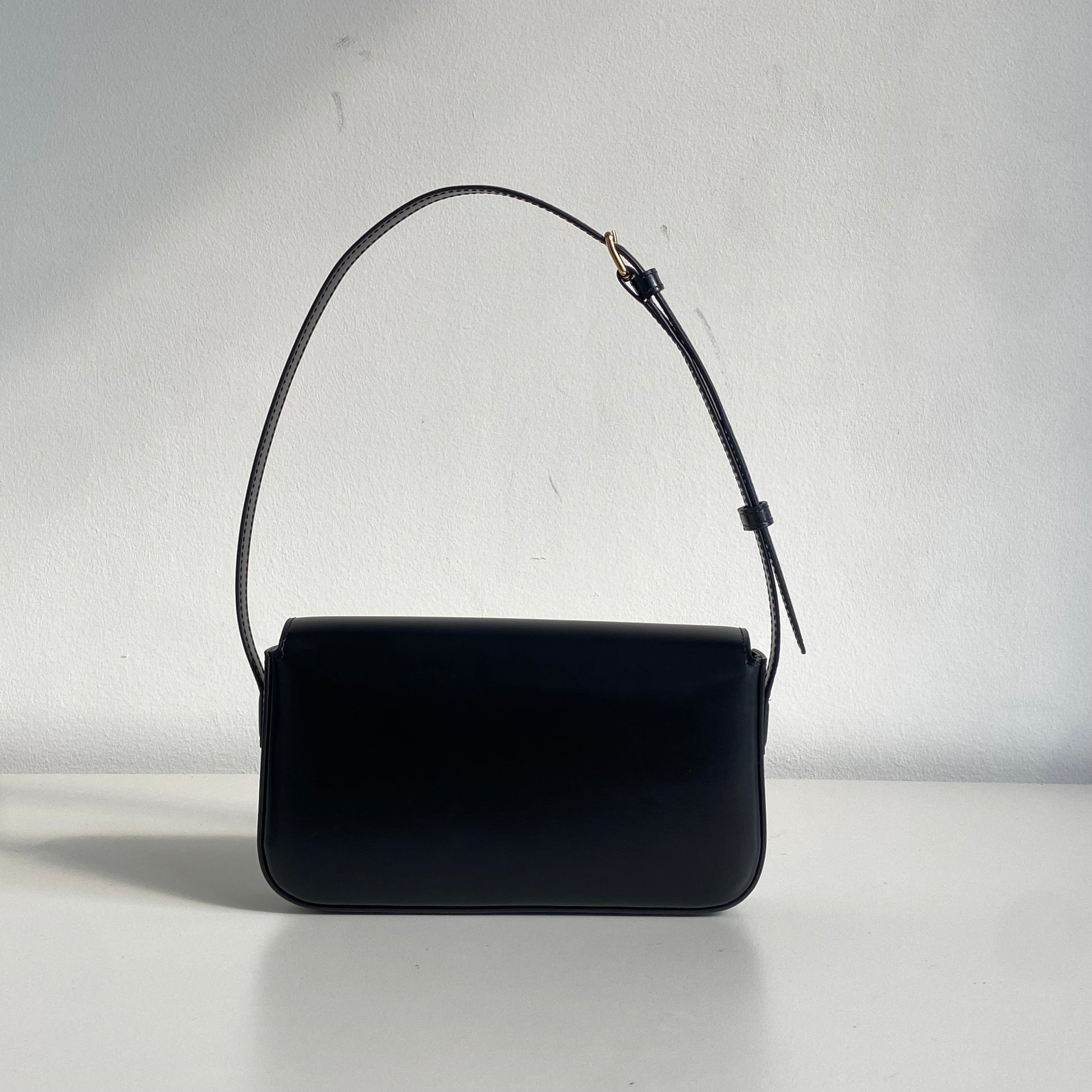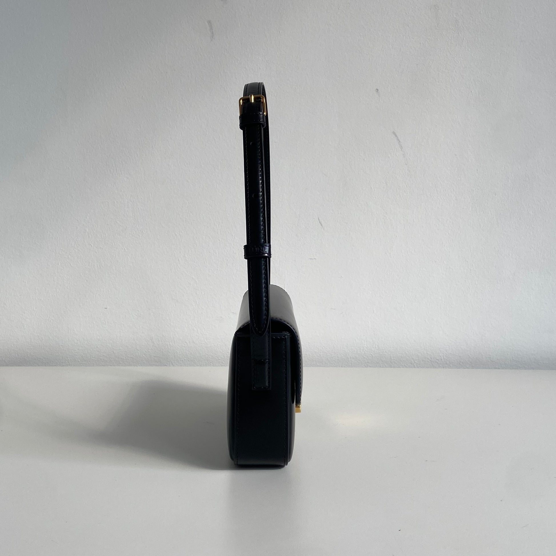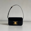 Iconica borsa Celine modello Triomphe in pelle nera e hardware oro. Si indossa a spalla, la tracolla è regolabile.