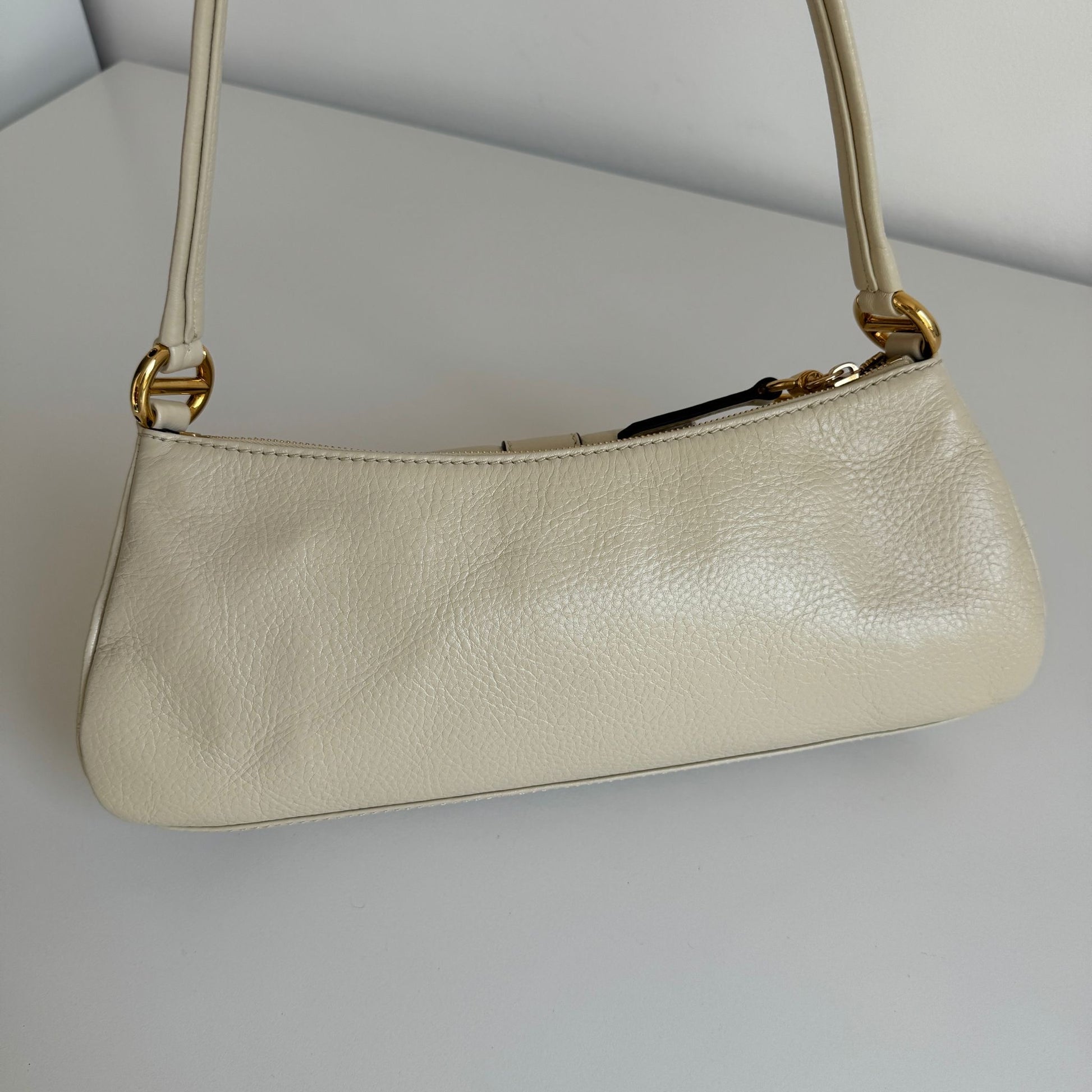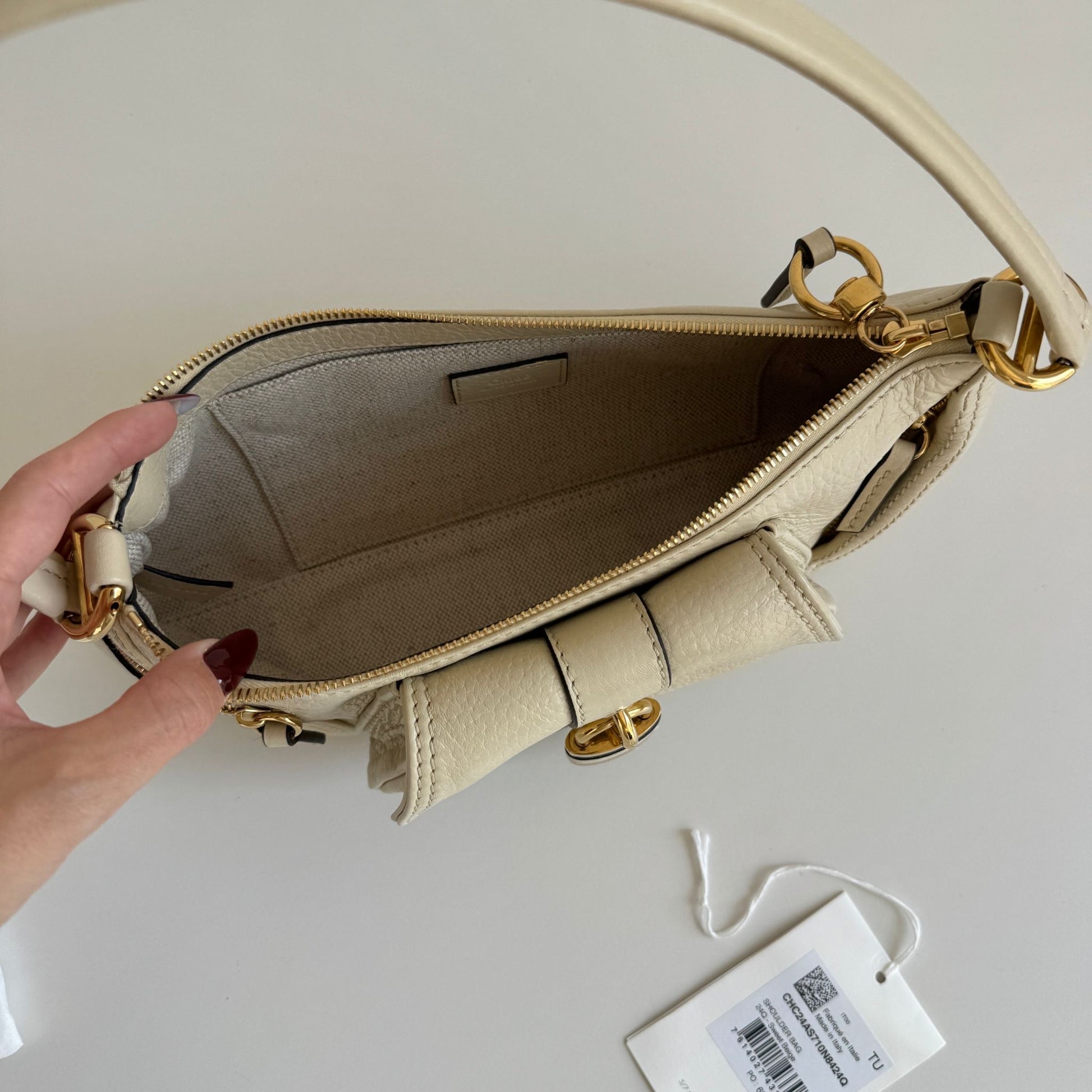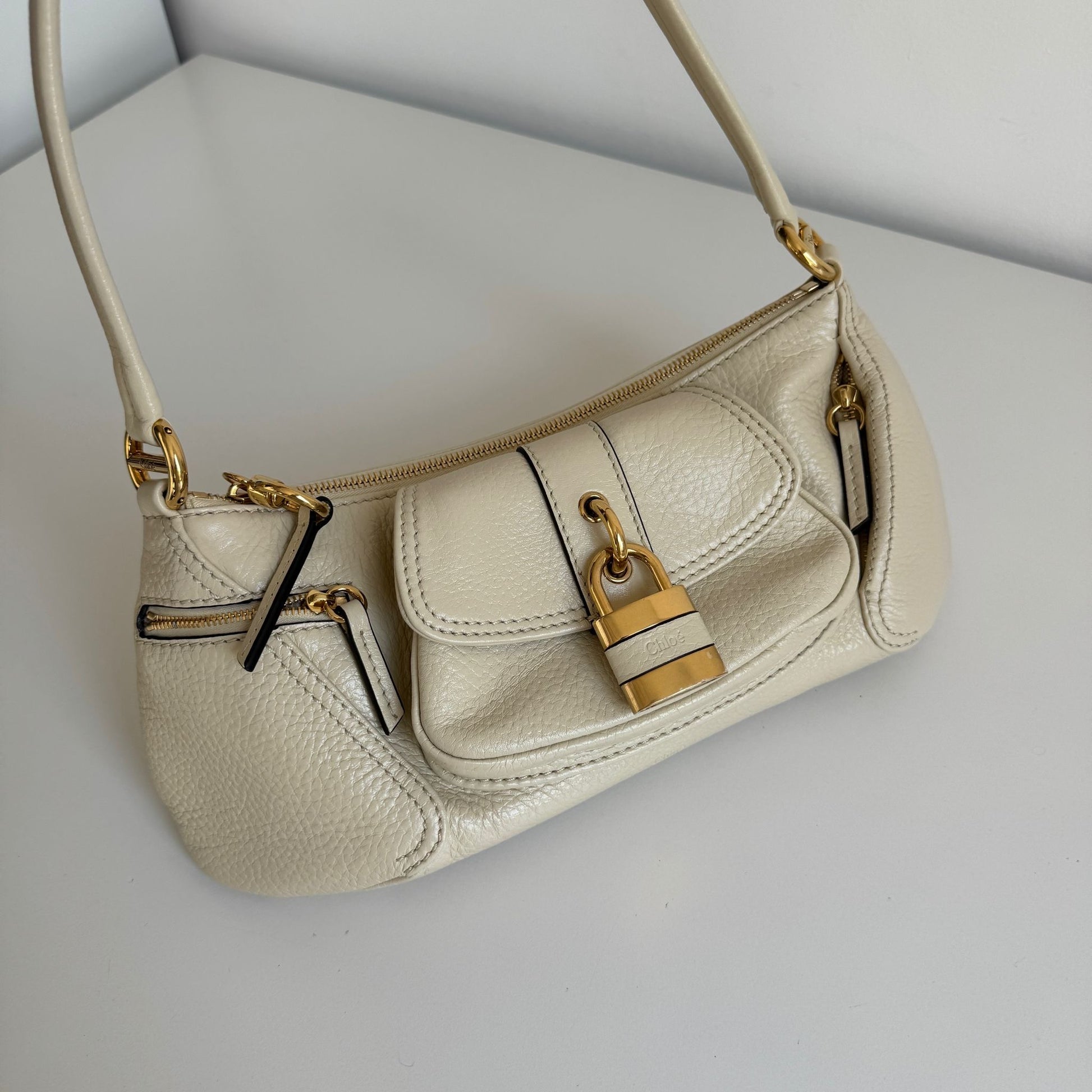 Iconica borsa Chloé modello The 99, in pelle color crema e hardware oro. Si indossa solo a spalla.