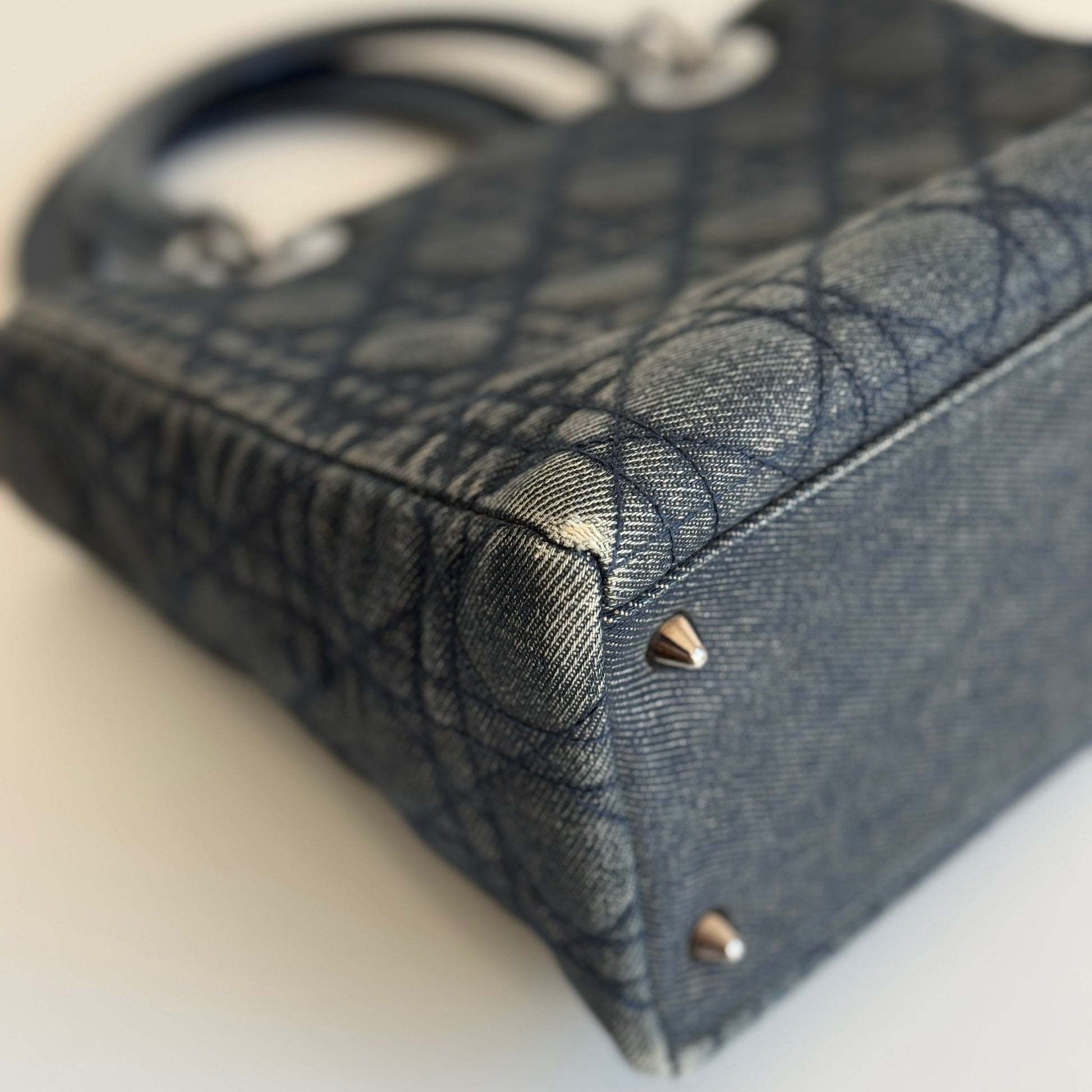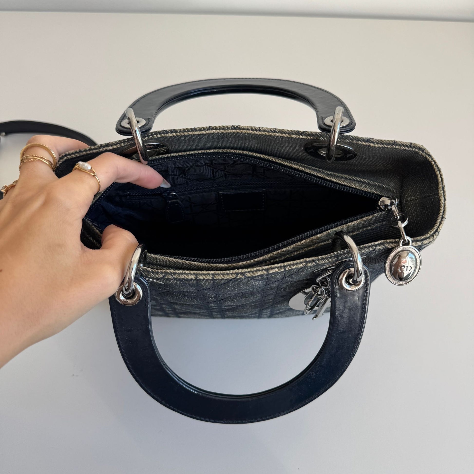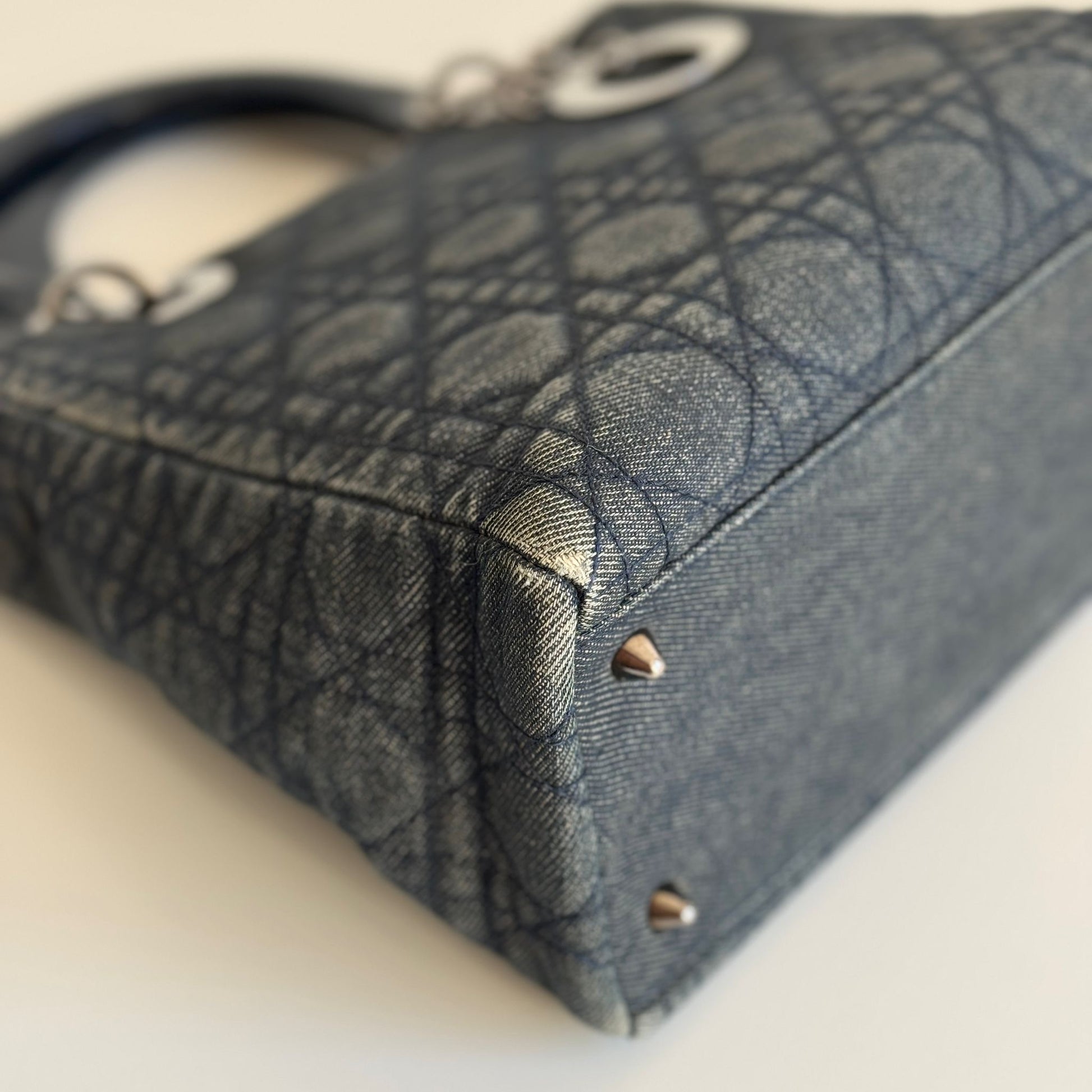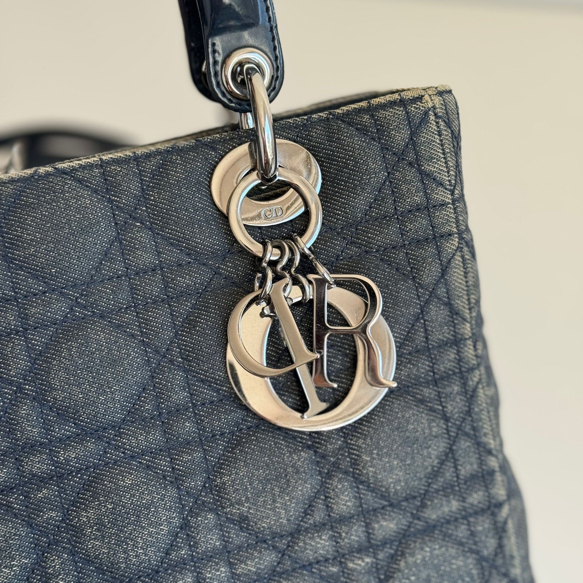 Bellissima borsa Dior modello Lady Dior del 2001 sotto direzione creativa di John Galliano, in denim delavé, dettagli in vernice blu e hardware argento. Si indossa a mano e a spalla, la tracolla non è regolabile ma è rimovibile.