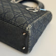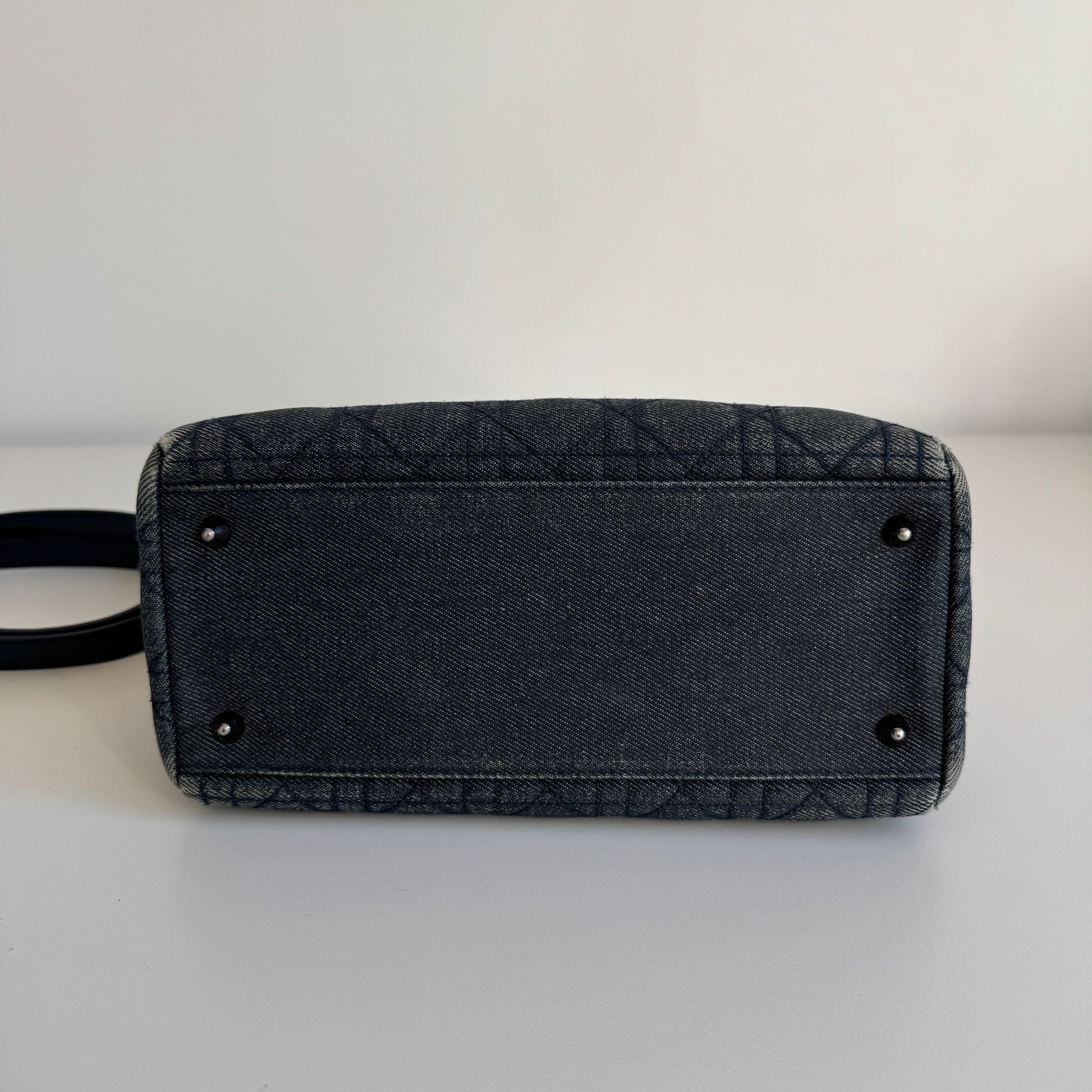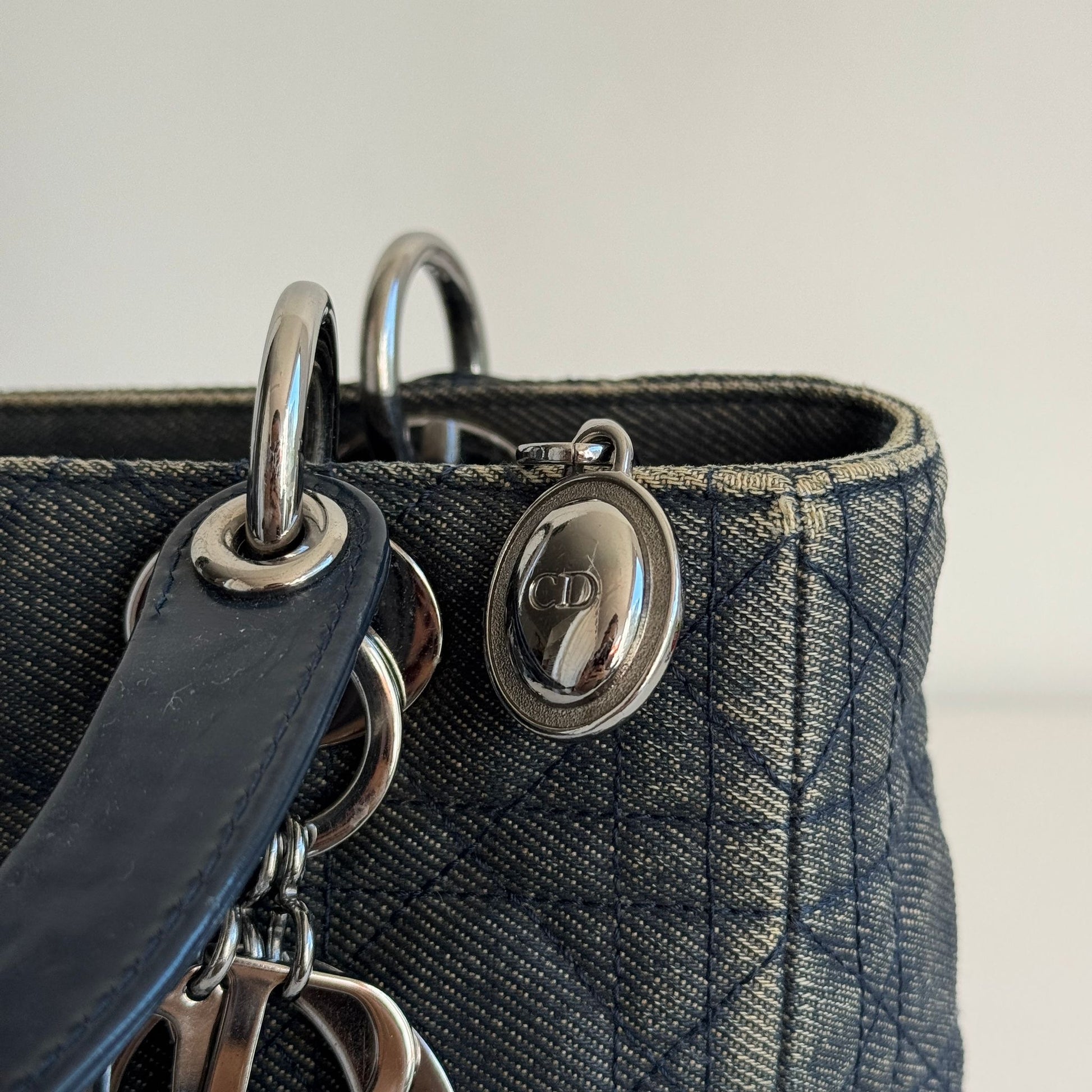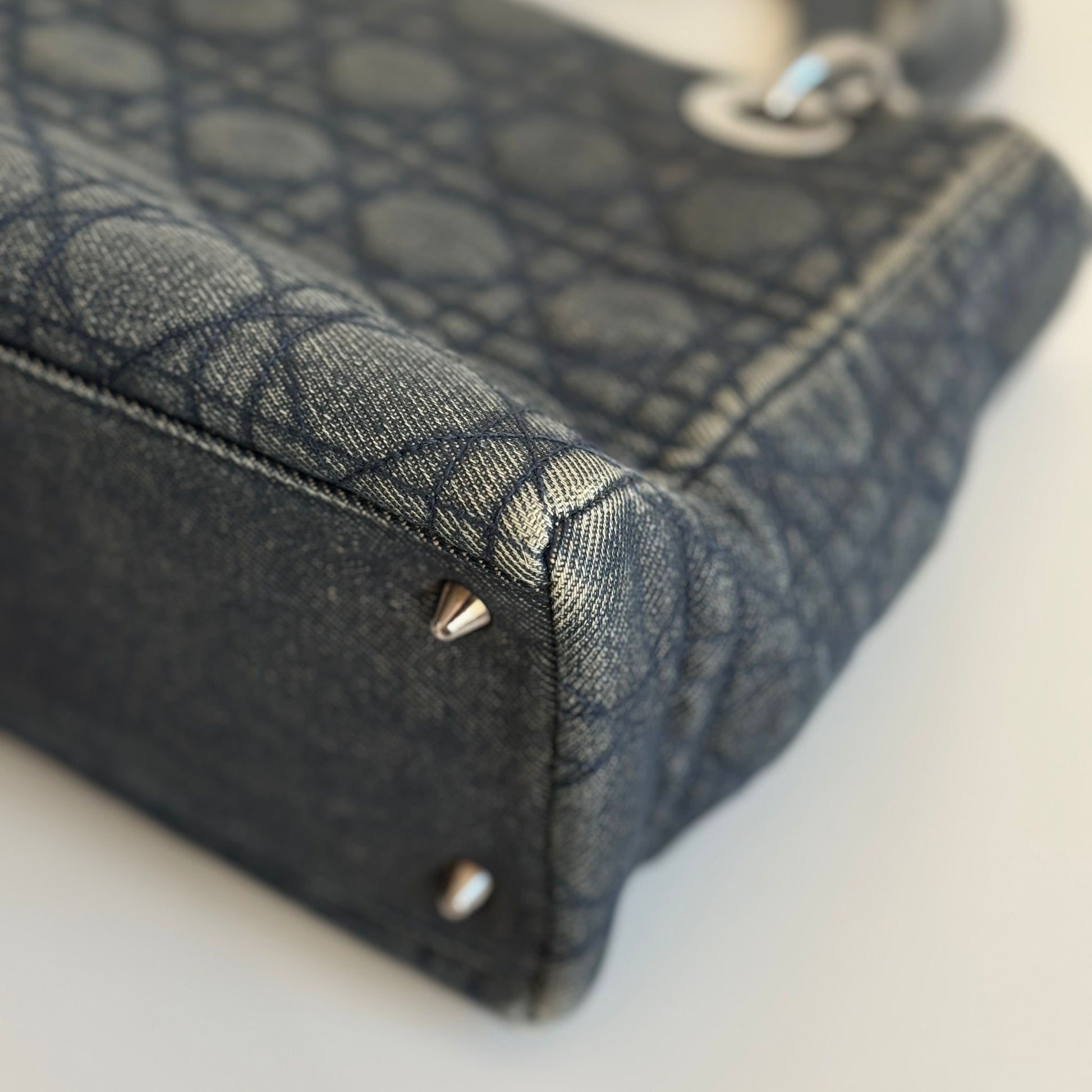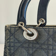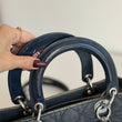 Bellissima borsa Dior modello Lady Dior del 2001 sotto direzione creativa di John Galliano, in denim delavé, dettagli in vernice blu e hardware argento. Si indossa a mano e a spalla, la tracolla non è regolabile ma è rimovibile.