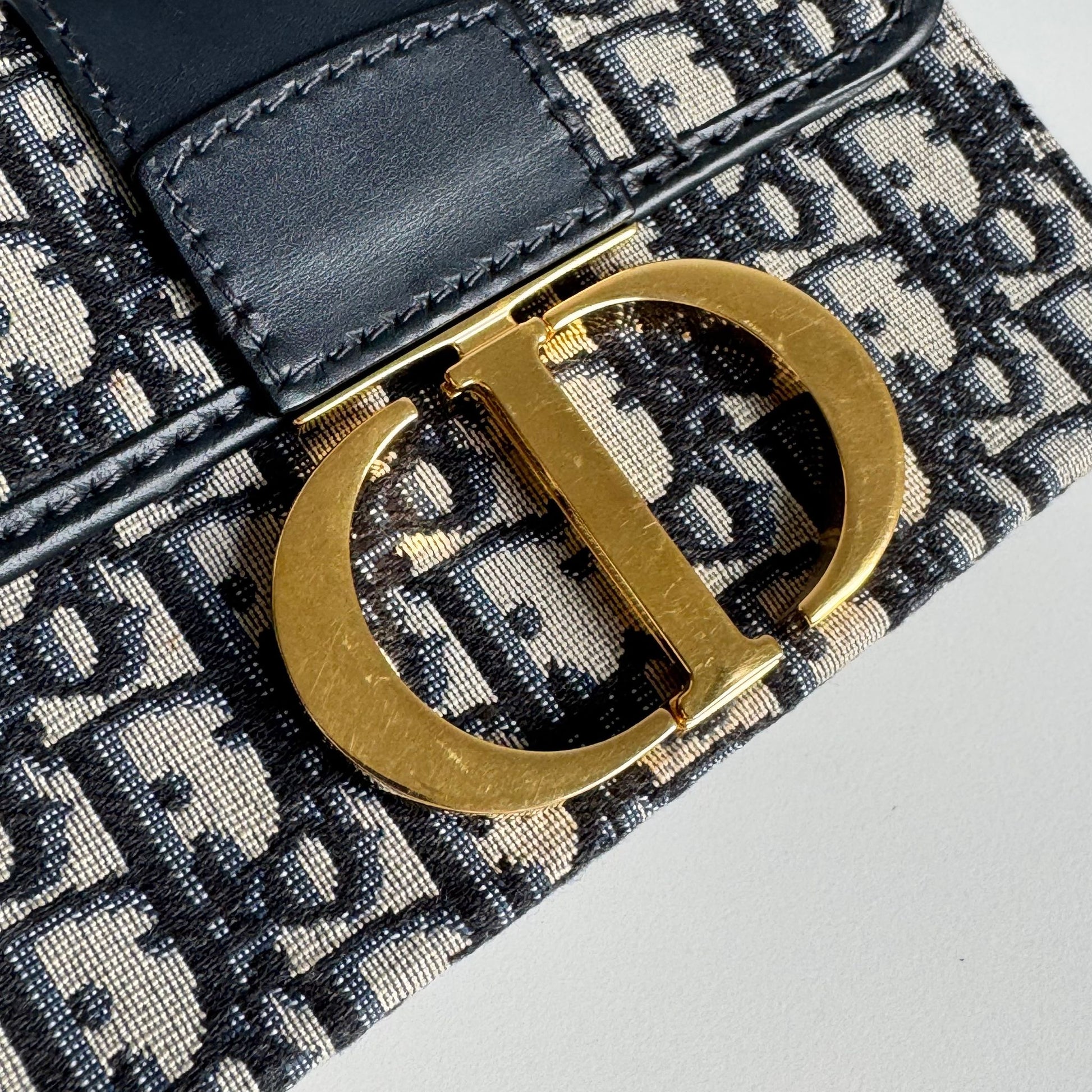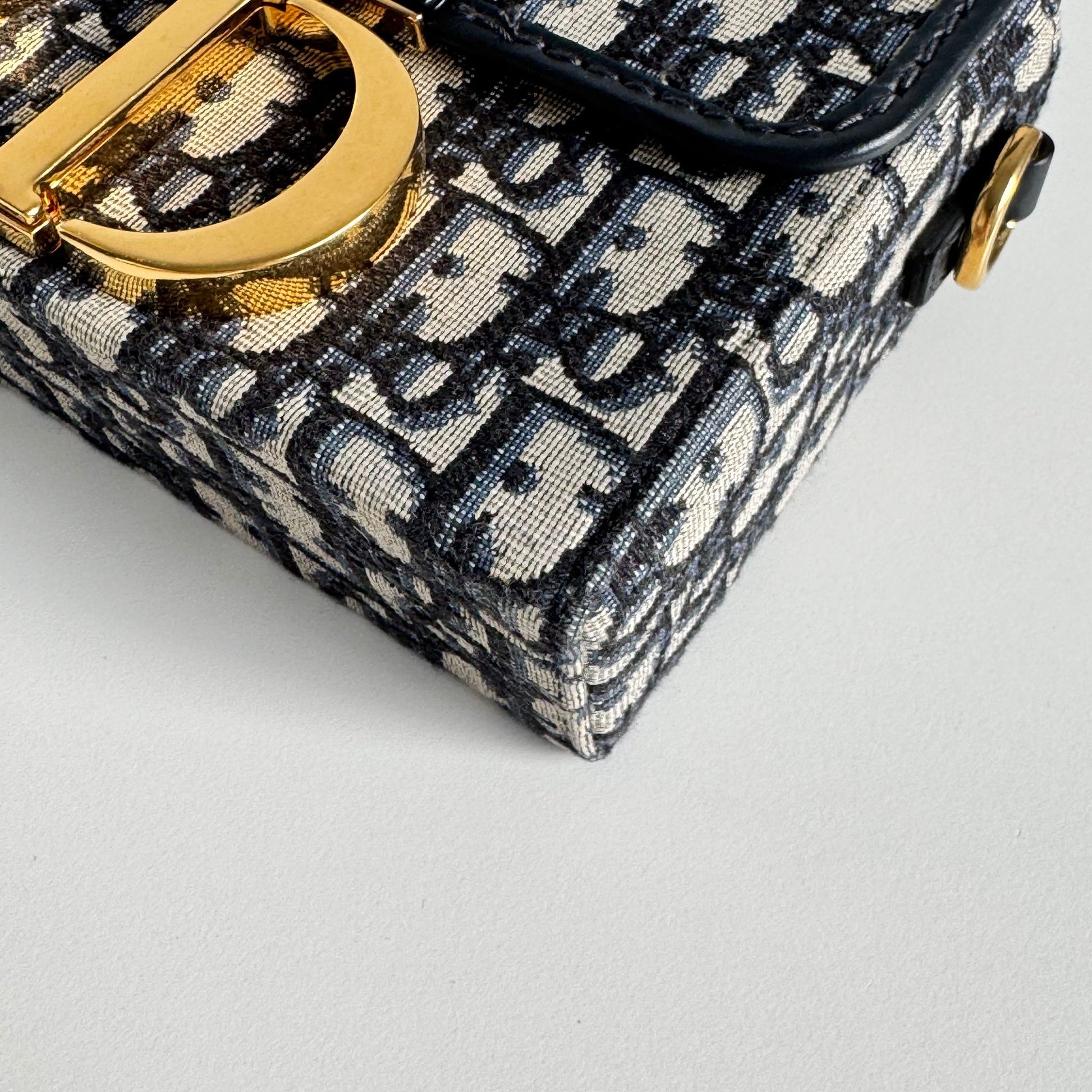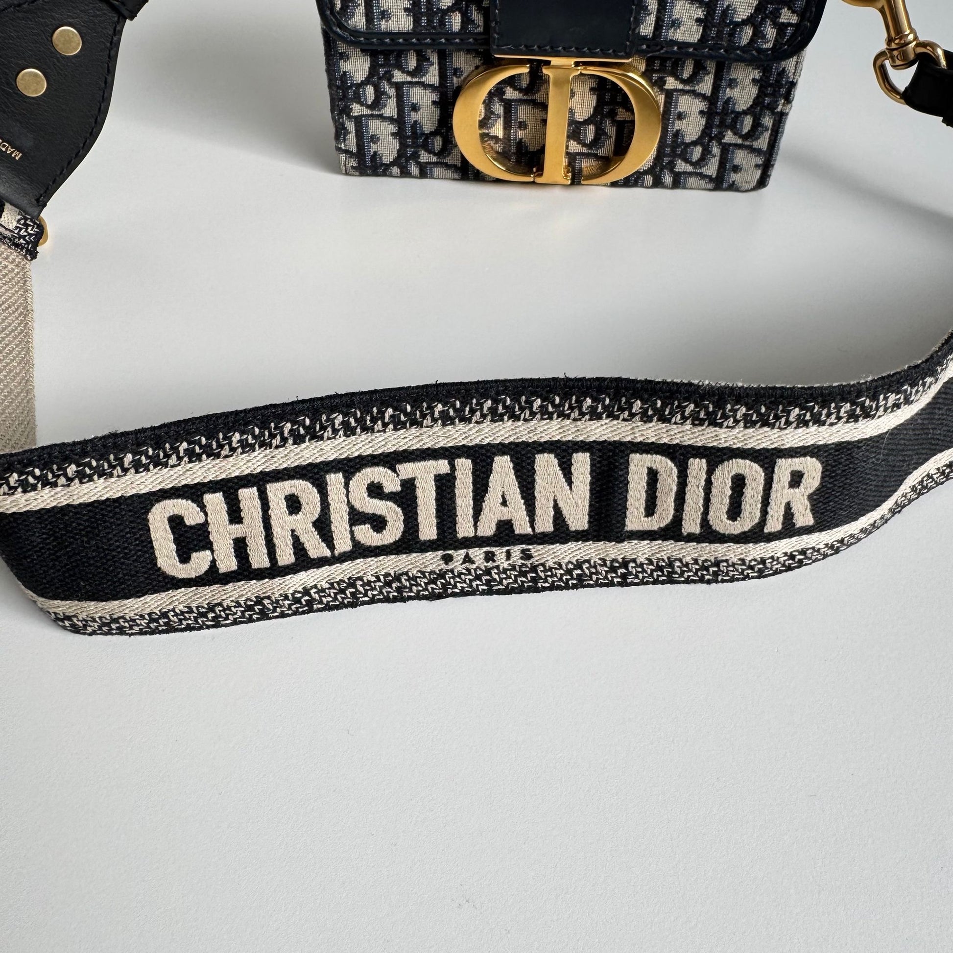 Meravigliosa borsa di or modello 30 Montaigne in tela Jacquard Oblique “Dior” blu e dettagli in pelle blu con hardware oro, la tracolla è in tela e pelle nera con hardware oro. Si indossa a mano e a tracolla, la tracolla è rimovibile ma non regolabile.