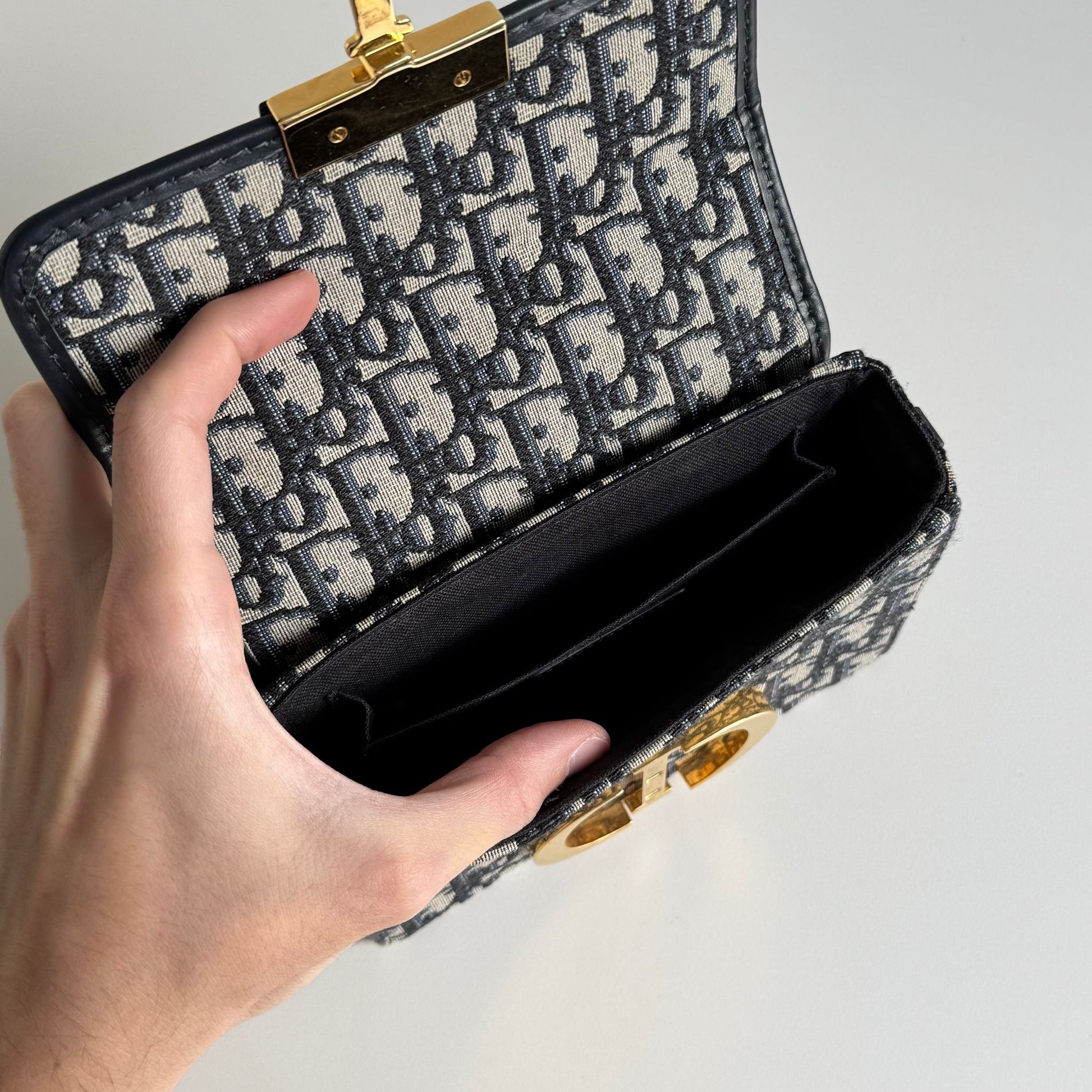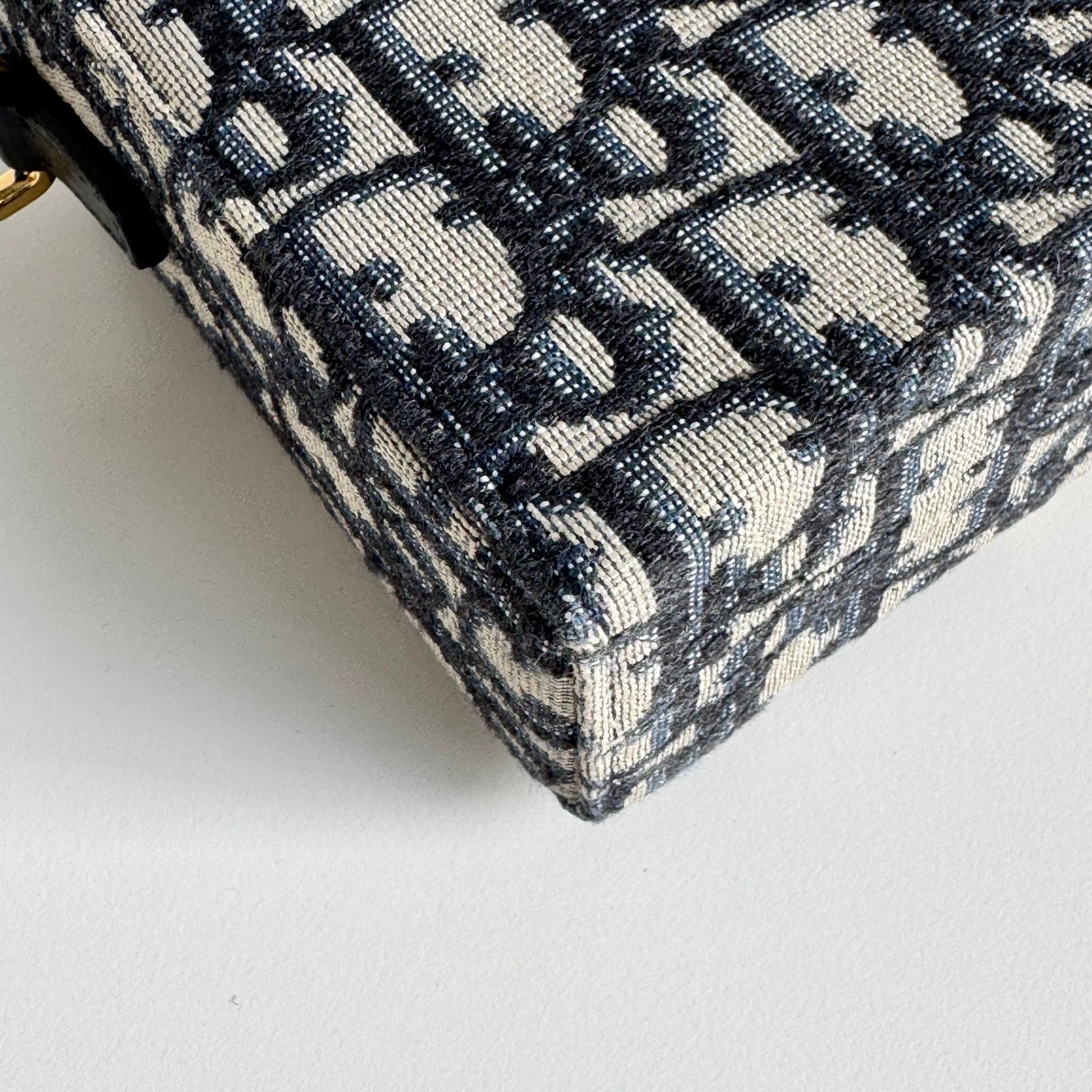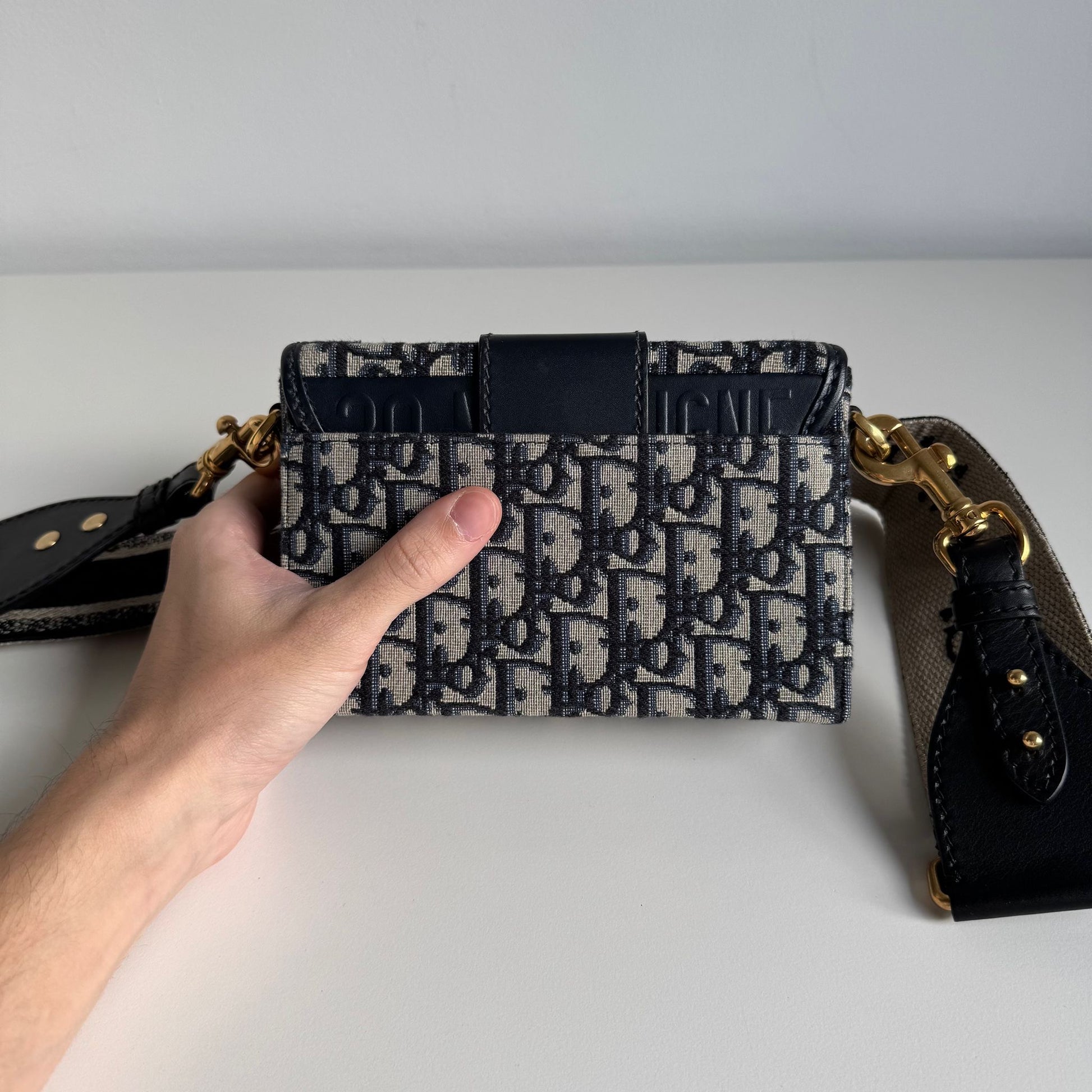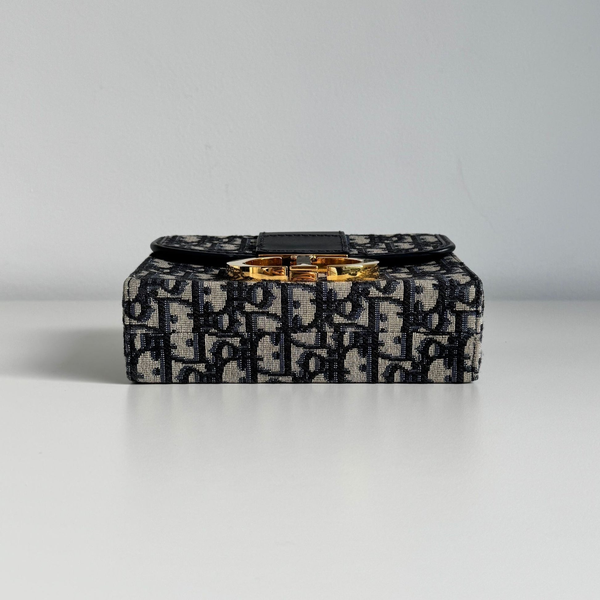 Meravigliosa borsa di or modello 30 Montaigne in tela Jacquard Oblique “Dior” blu e dettagli in pelle blu con hardware oro, la tracolla è in tela e pelle nera con hardware oro. Si indossa a mano e a tracolla, la tracolla è rimovibile ma non regolabile.