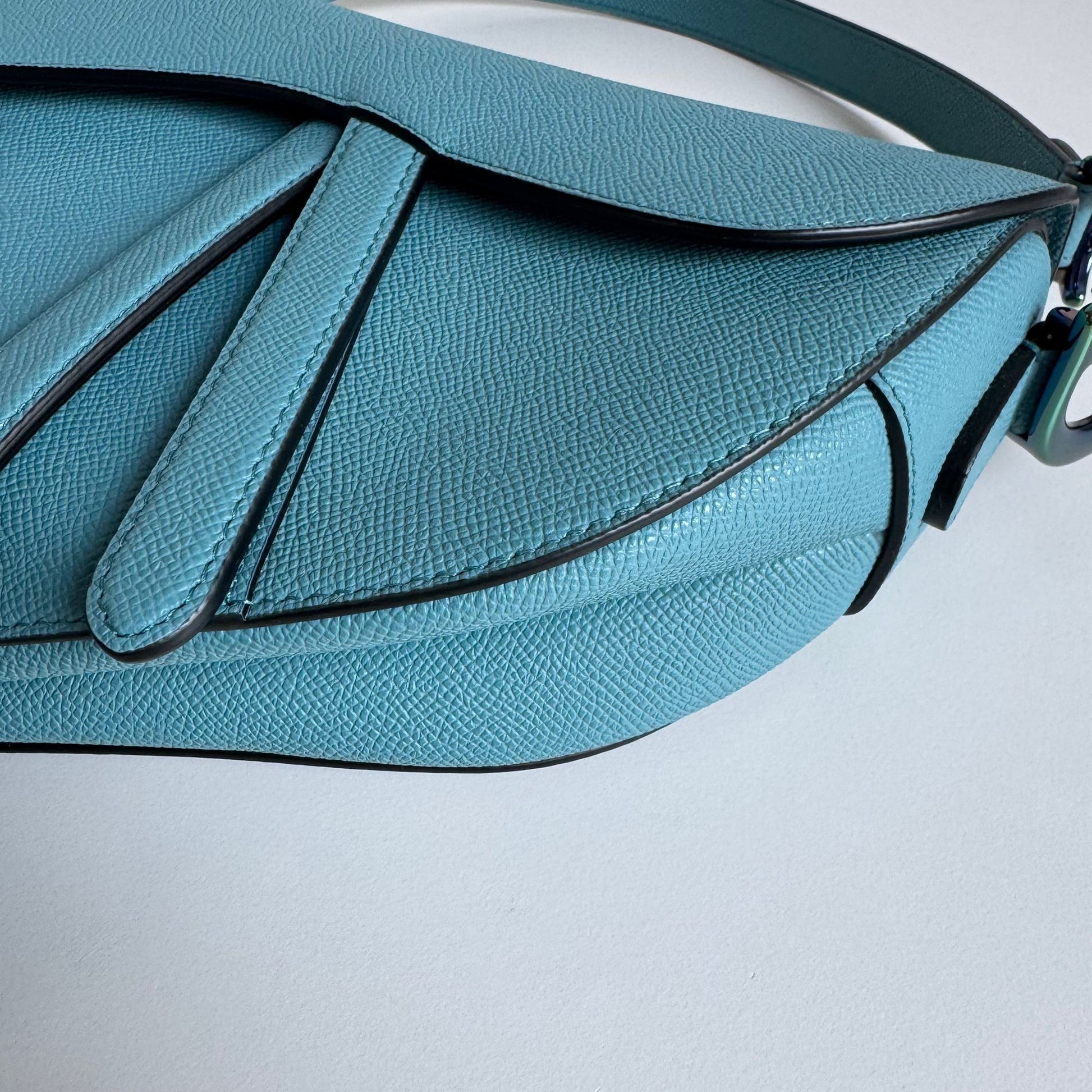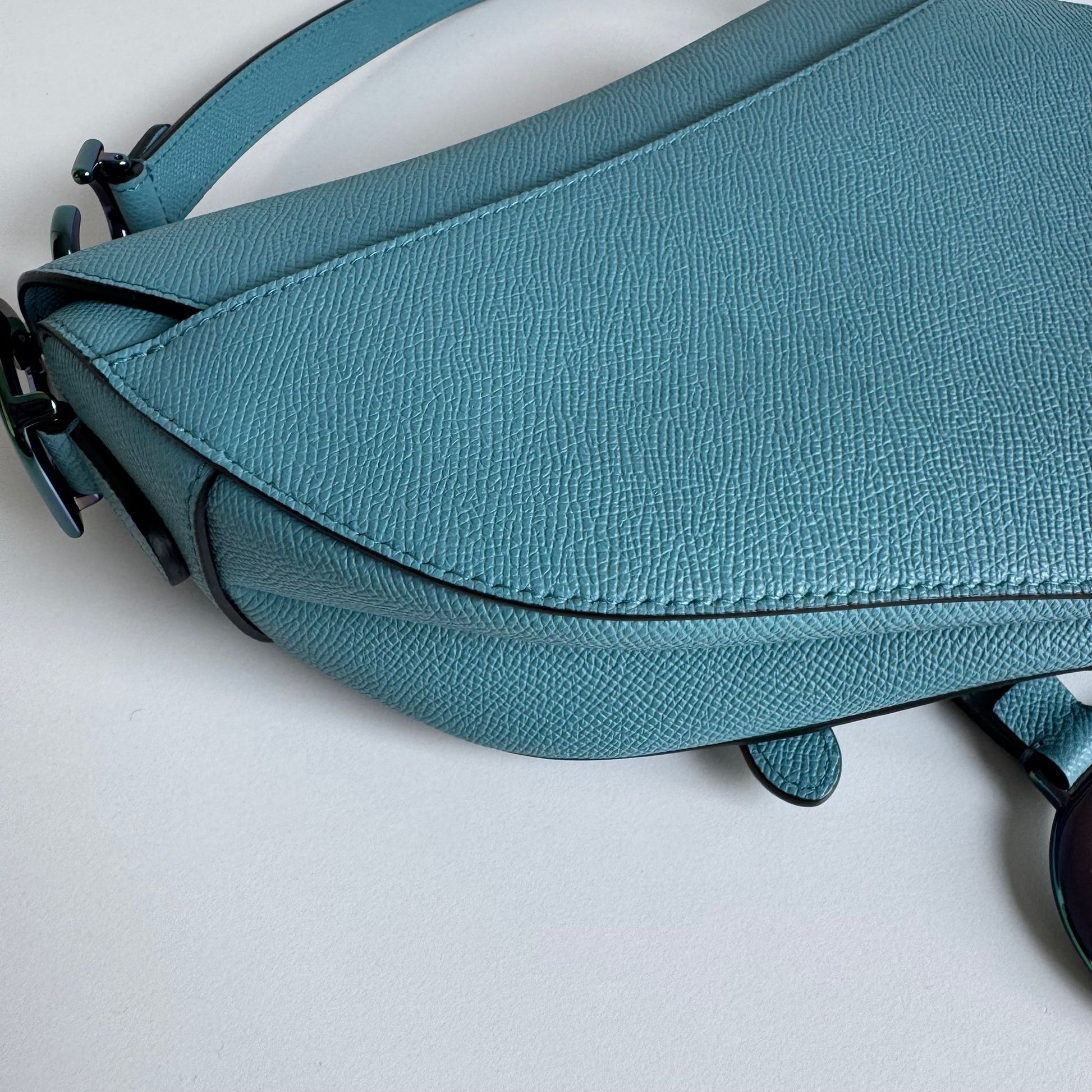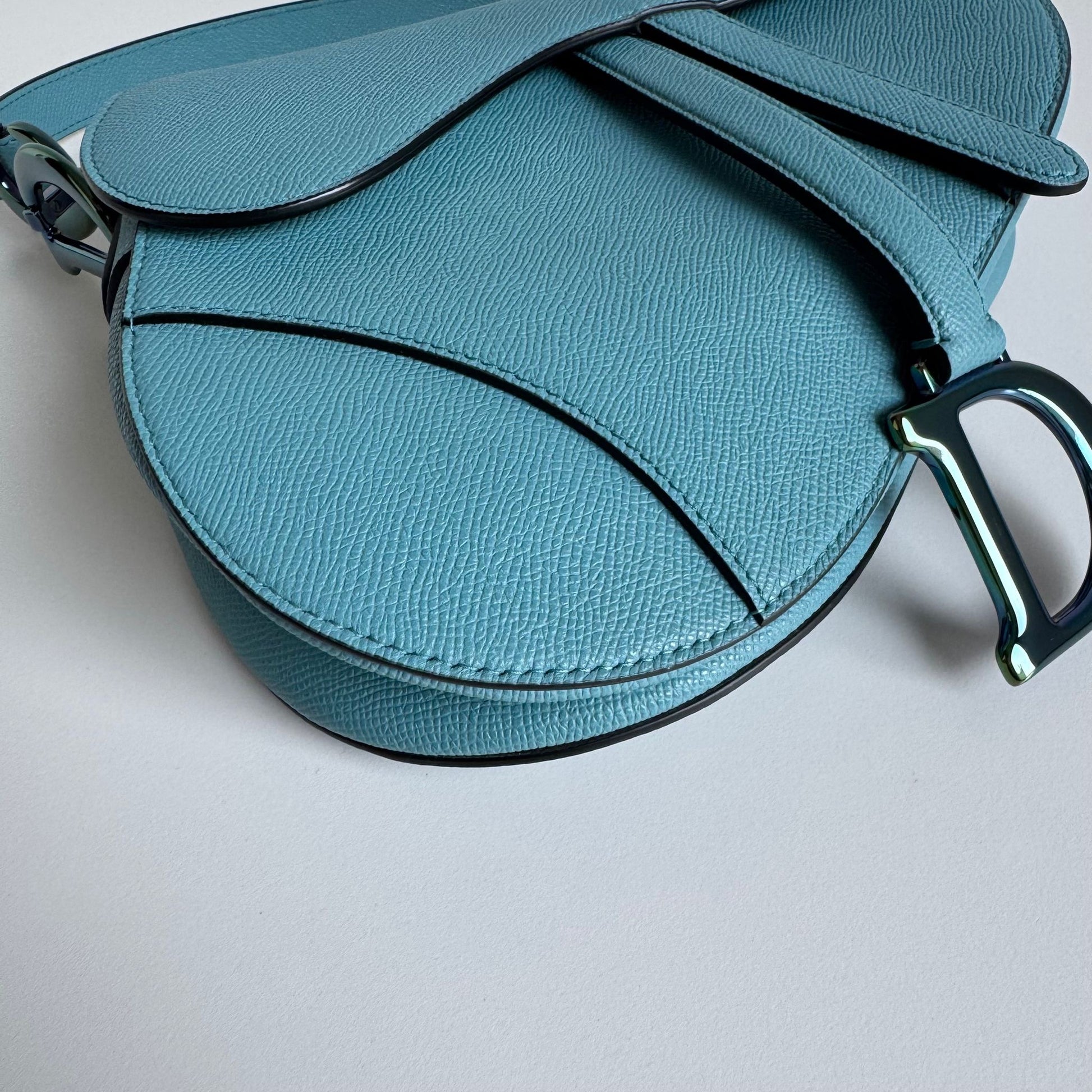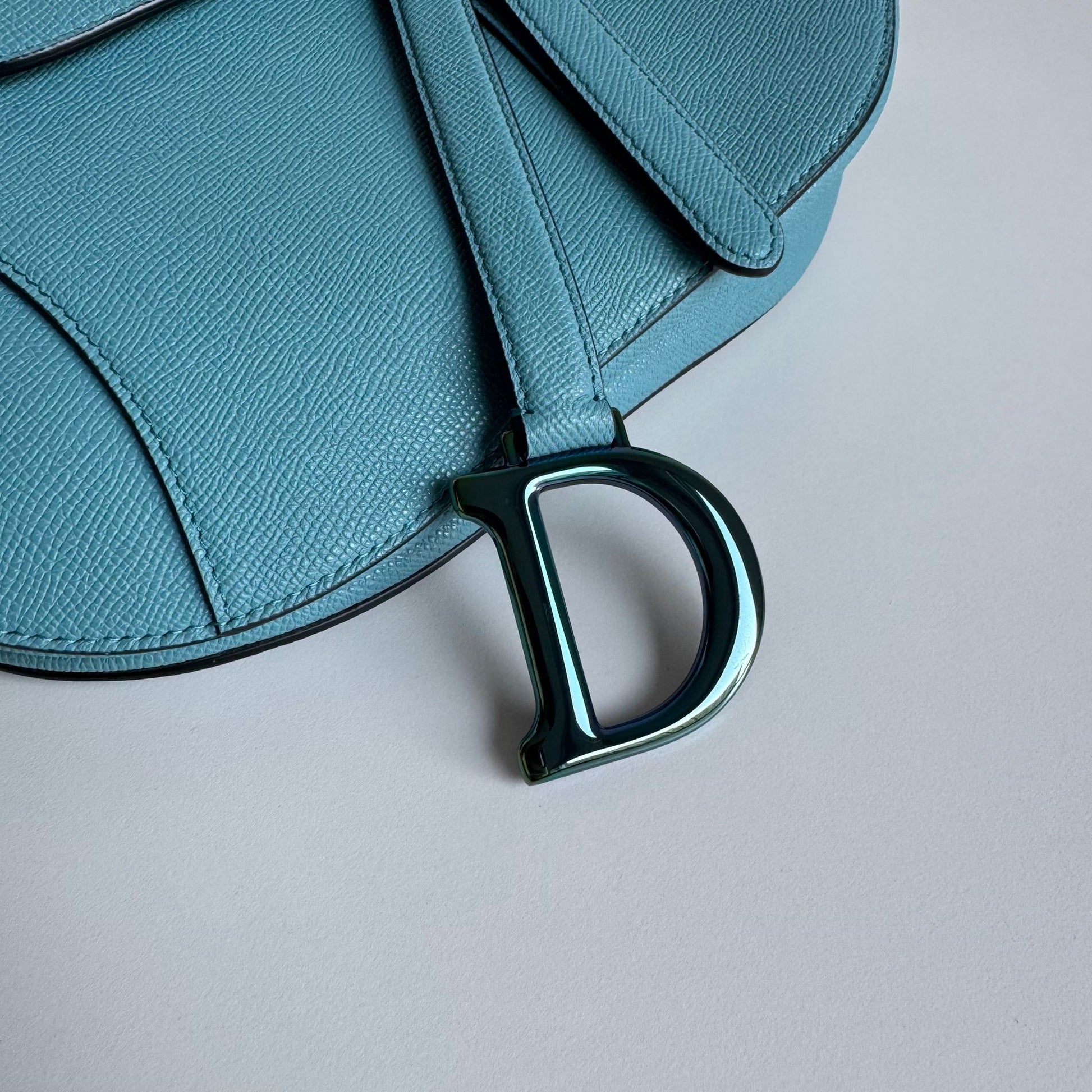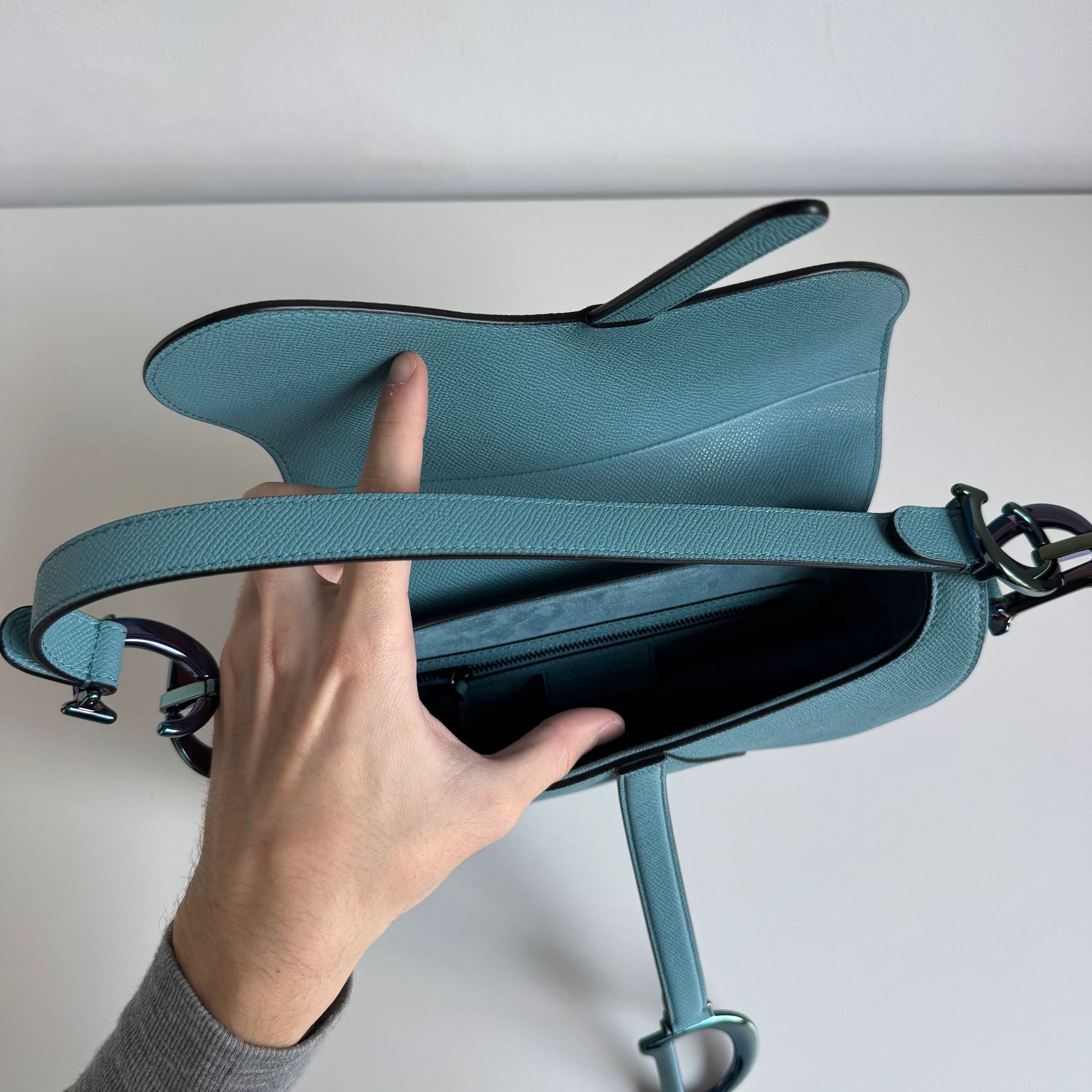 Bellissima borsa Dior modello Saddle in pelle martellata turchese con hardware olografico. Si indossa a spalla. Non prevede tracolla.