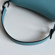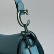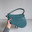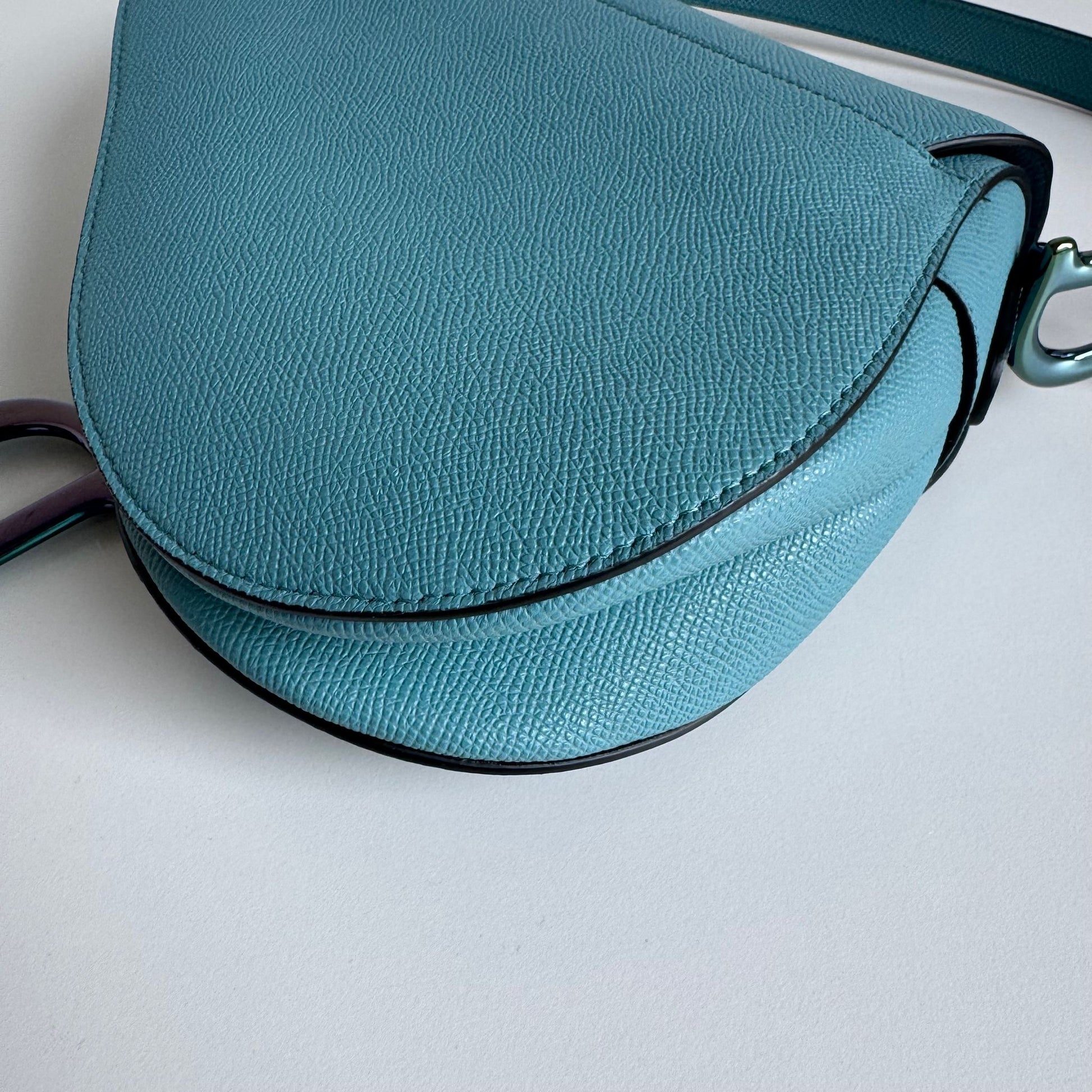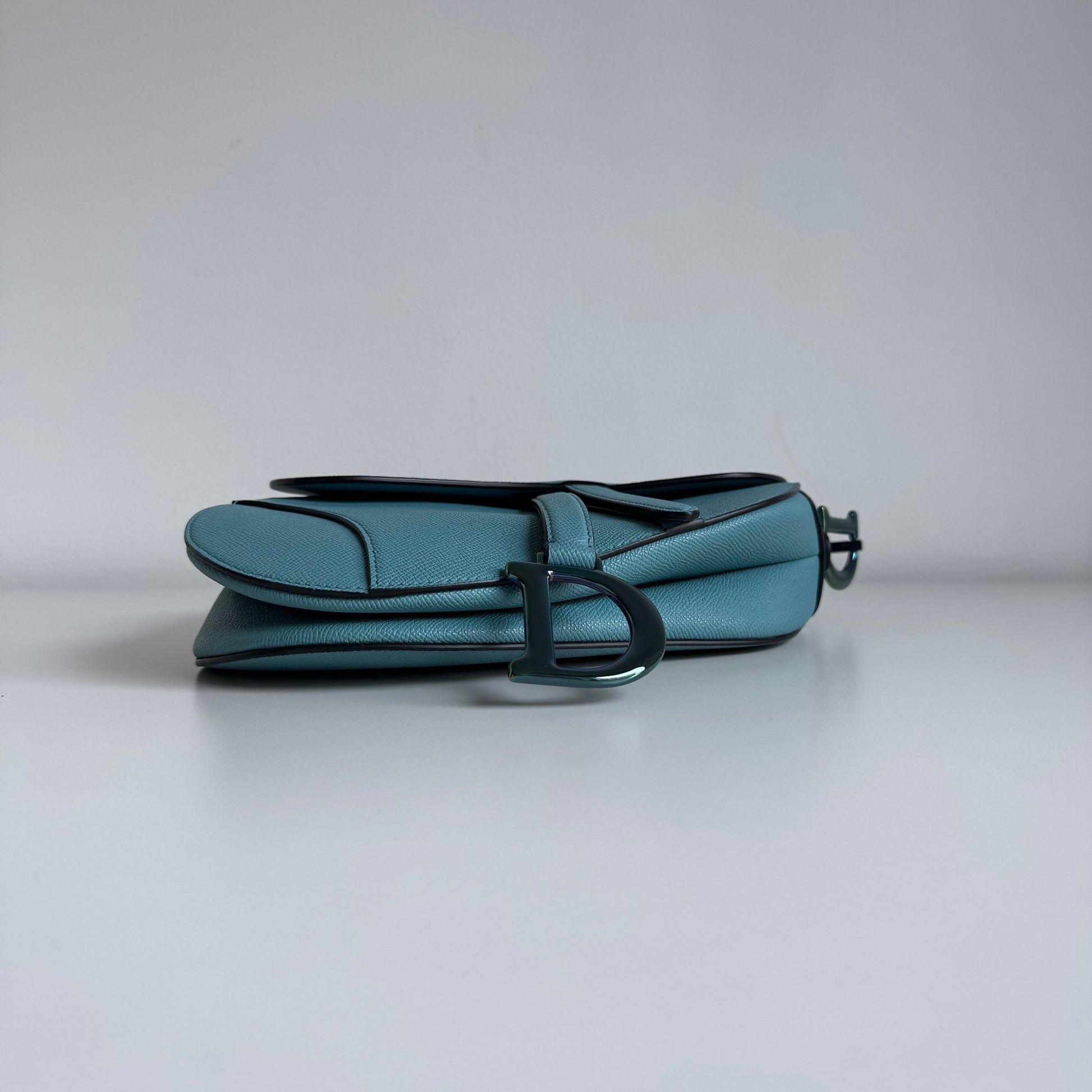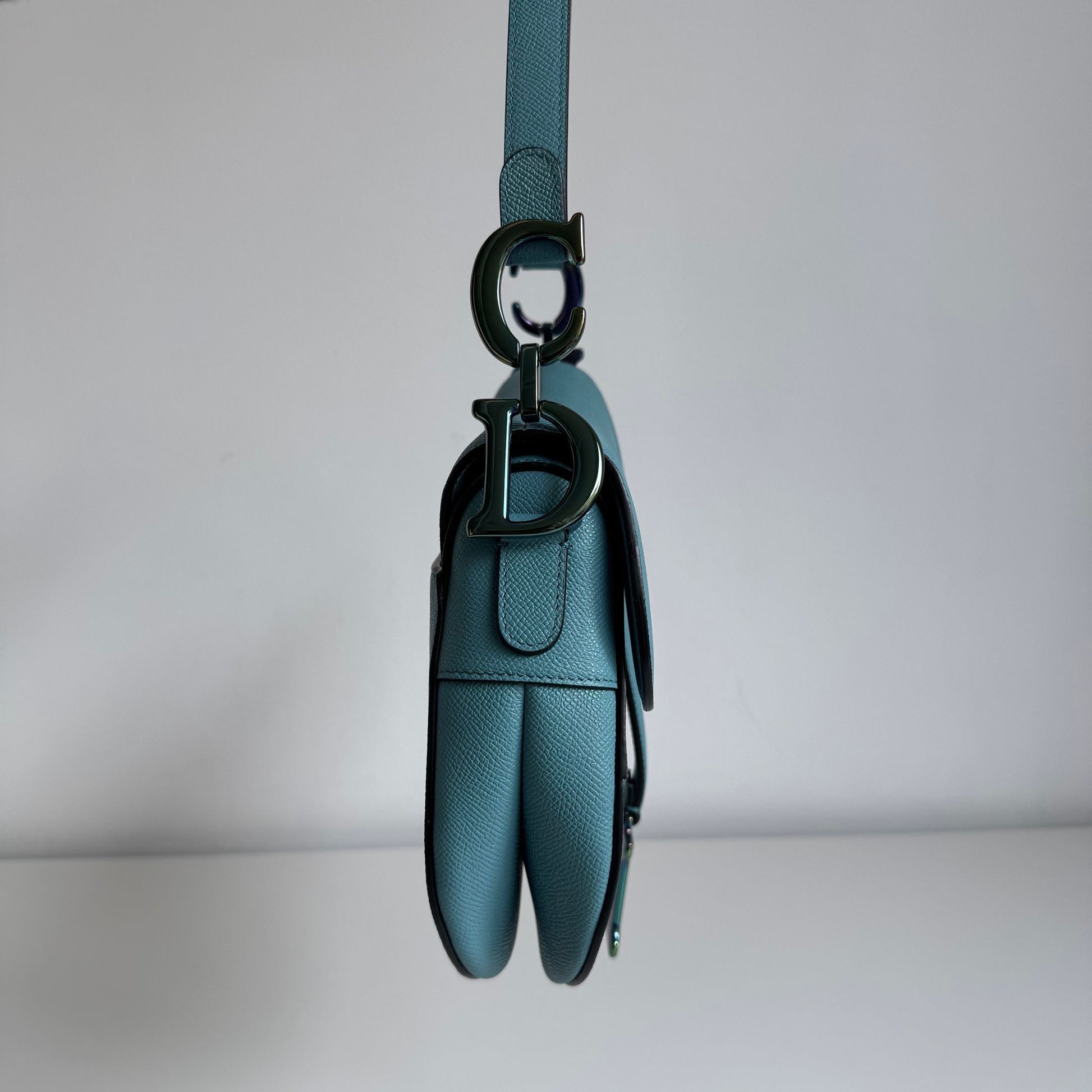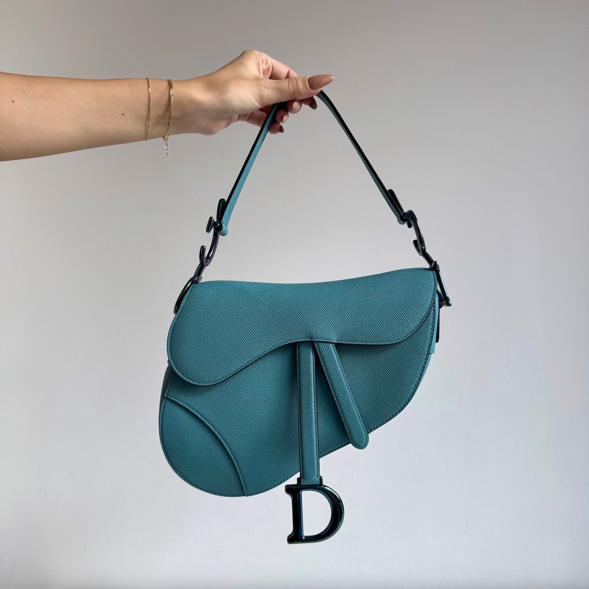 Bellissima borsa Dior modello Saddle in pelle martellata turchese con hardware olografico. Si indossa a spalla. Non prevede tracolla.