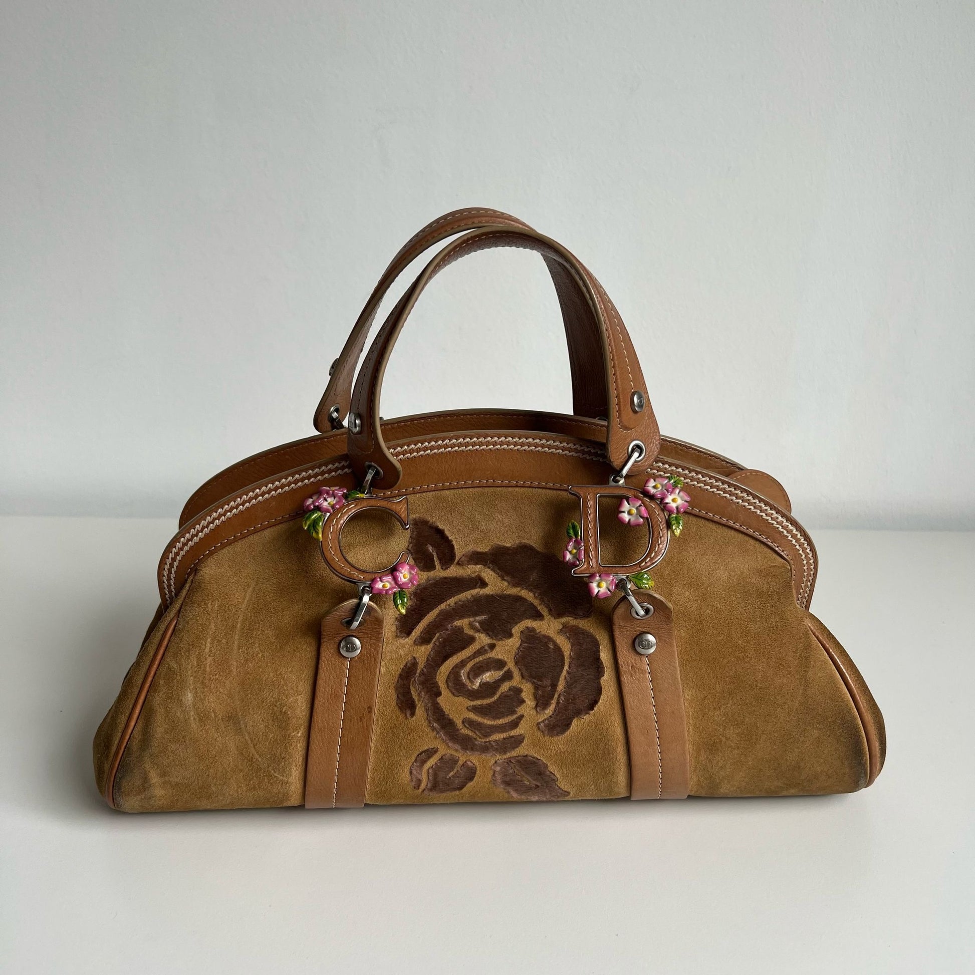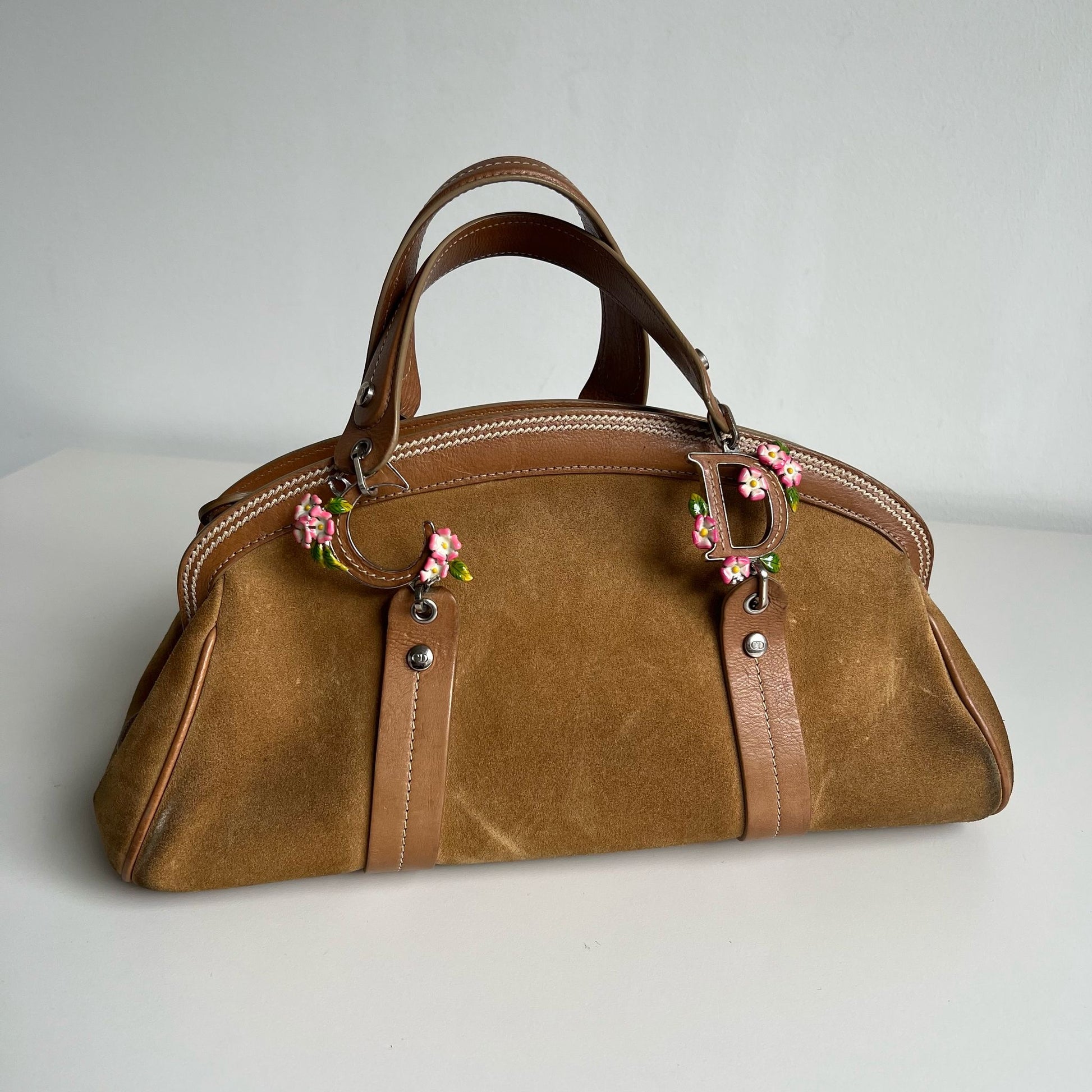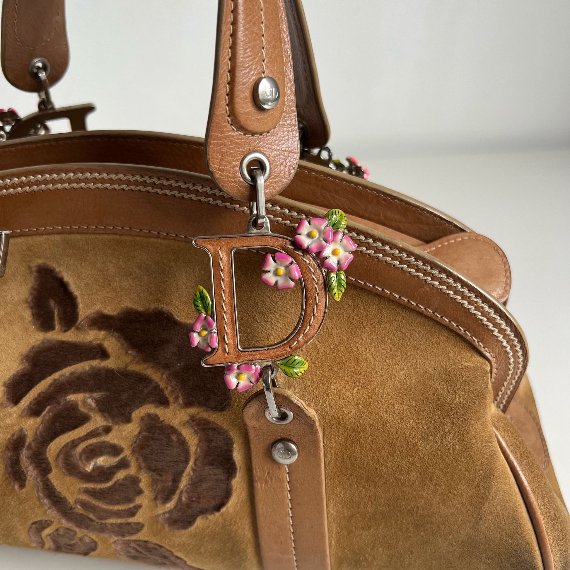 Bellissima borsa a mano Dior by Jhon Galliani del 2005, in pelle suede color cammello con inserti in pelle color caramello. Hardware argento. Si indossa a mano.