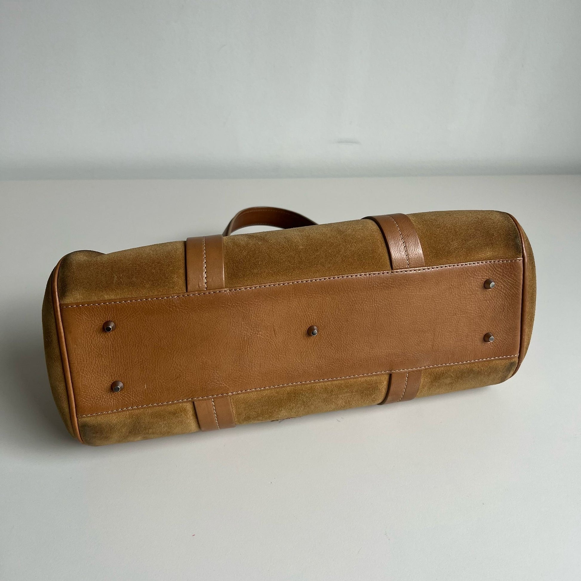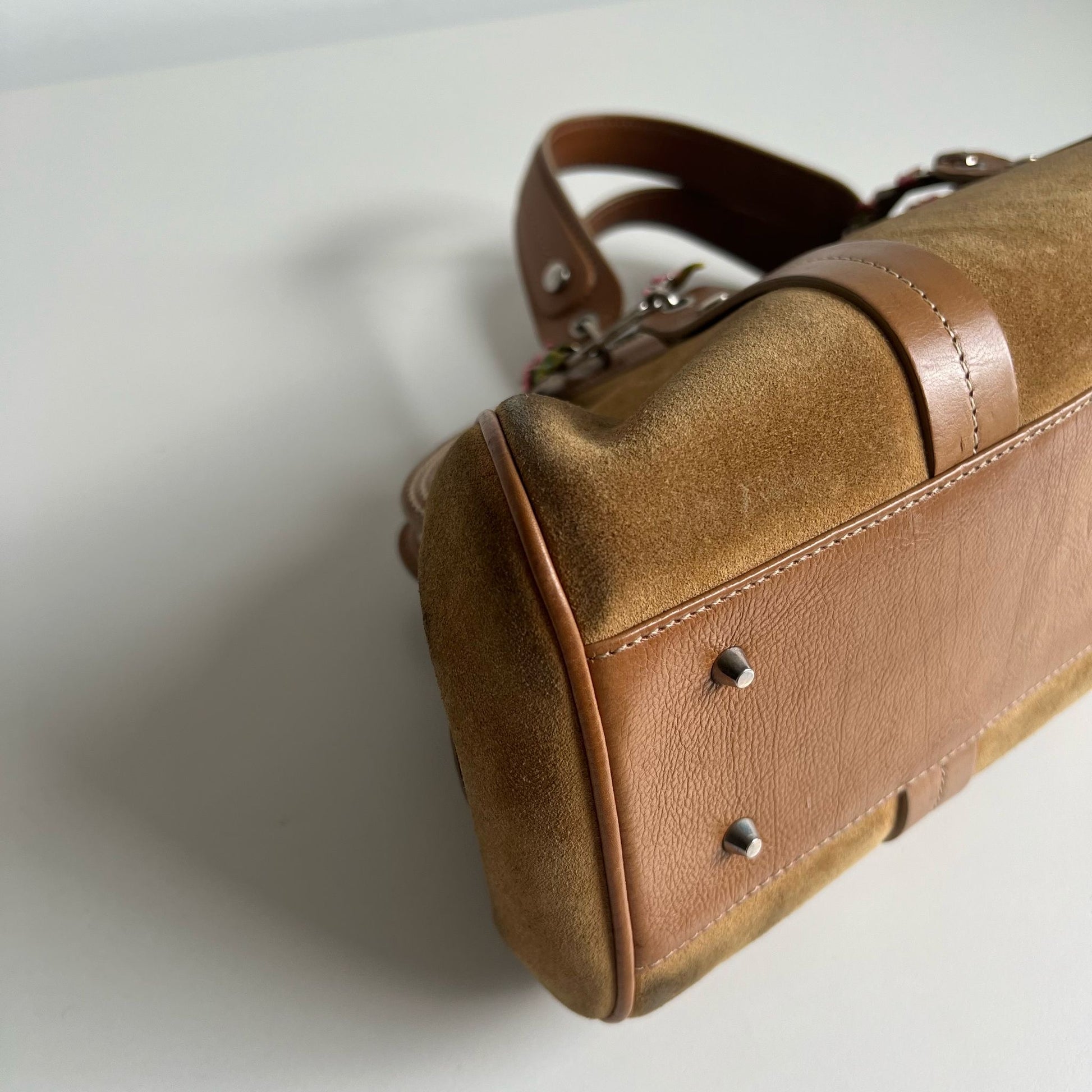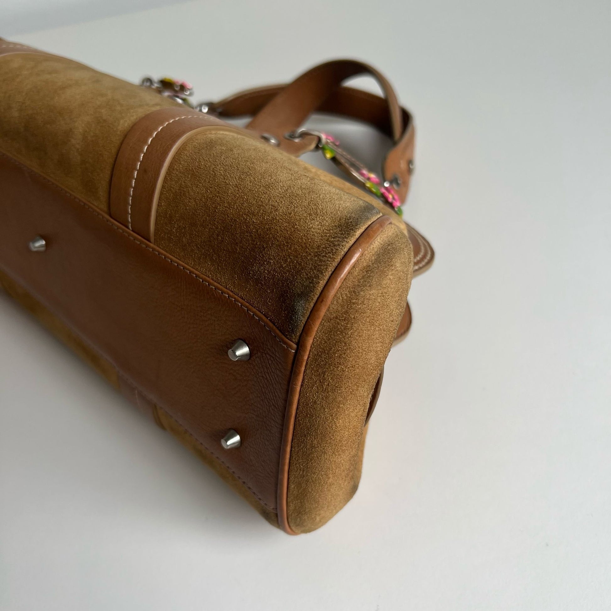 Bellissima borsa a mano Dior by Jhon Galliani del 2005, in pelle suede color cammello con inserti in pelle color caramello. Hardware argento. Si indossa a mano.