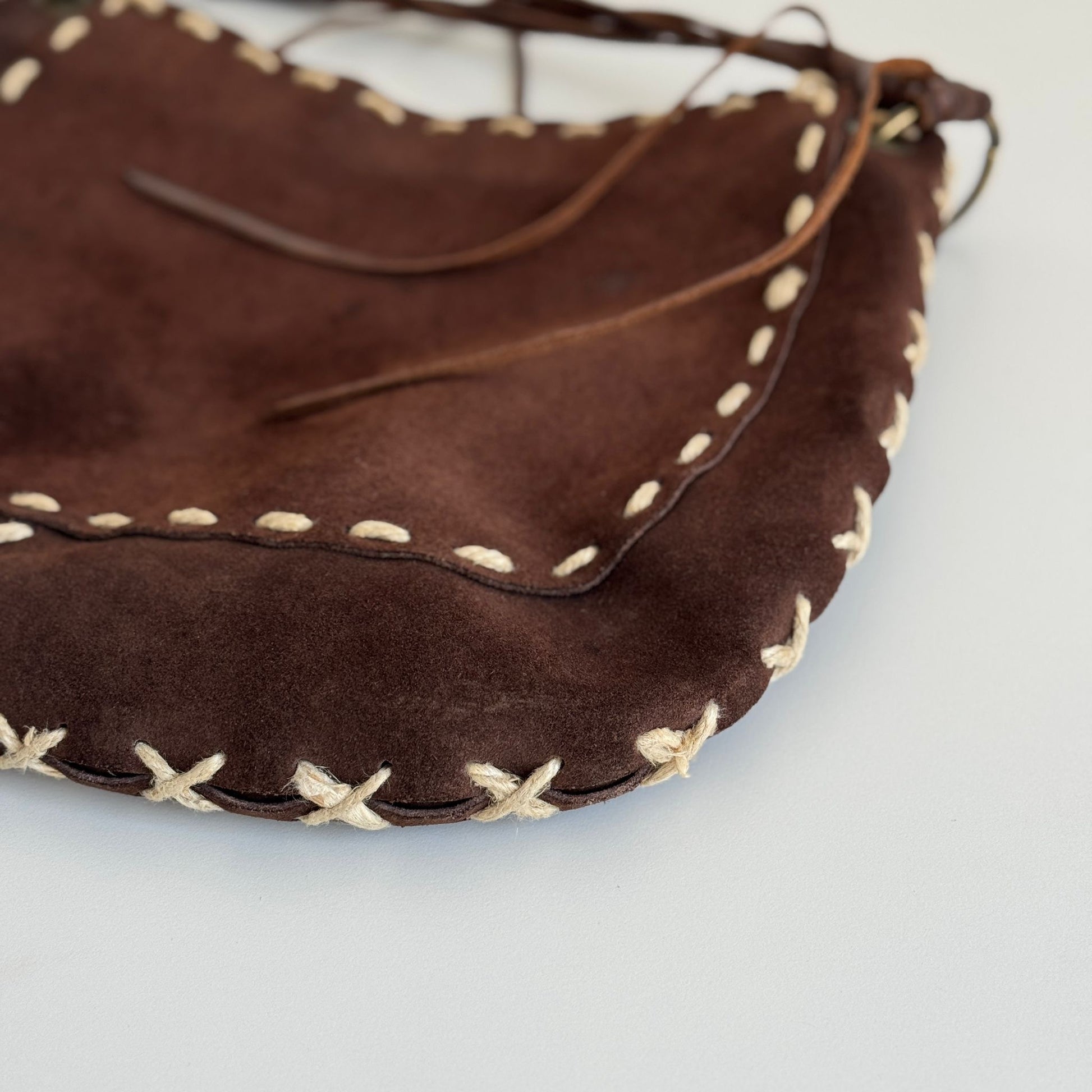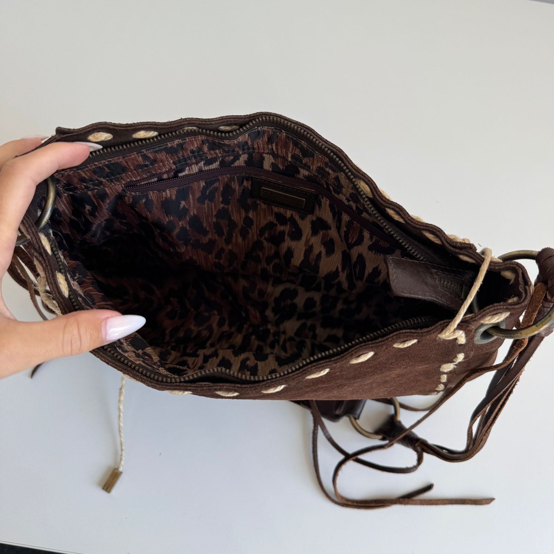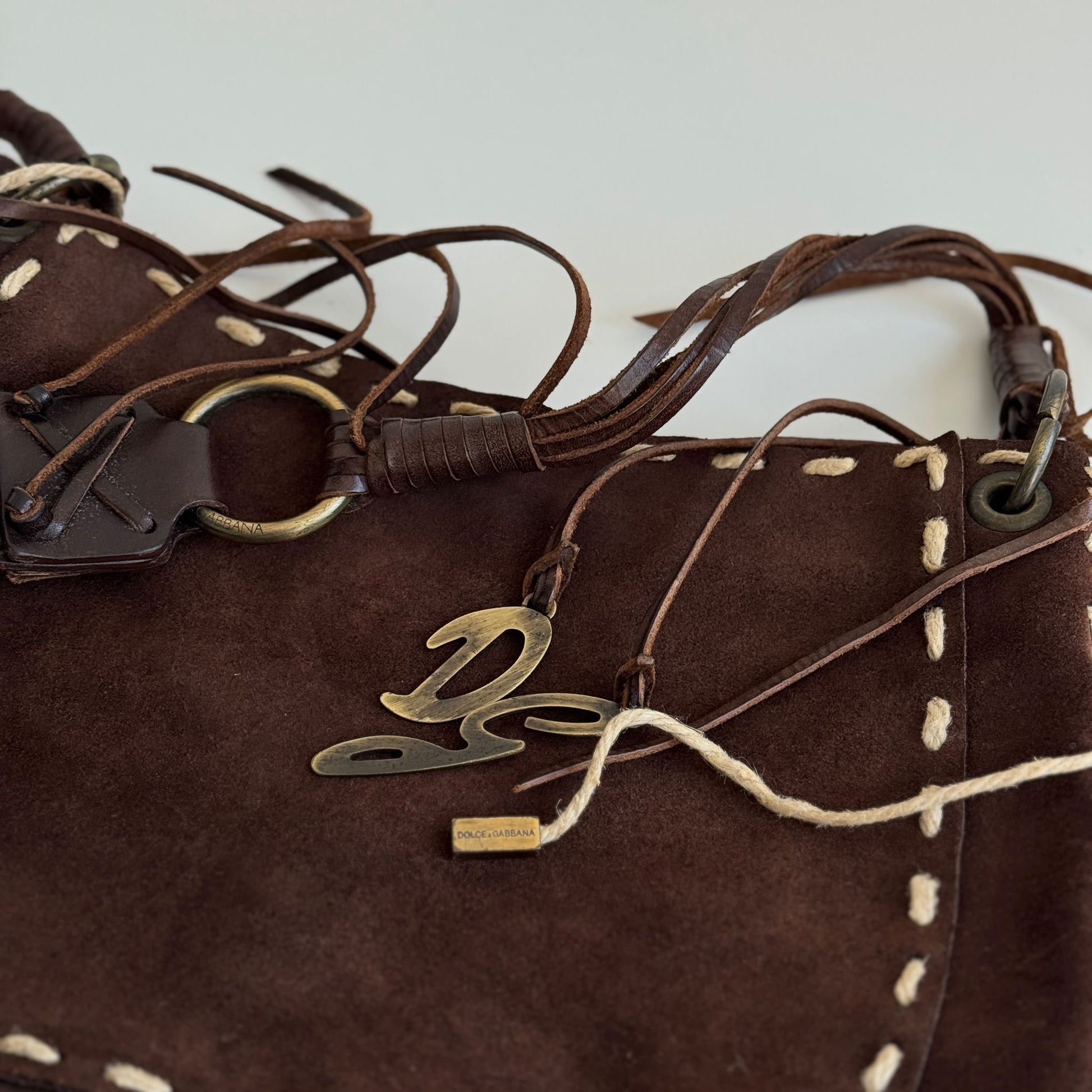Bellissima borsa a tracolla di Dolce&Gabbana della F/W 2002 in suede marrone con dettagli in pelle e spago e hardware bruniti. Si indossa a spalla e a tracolla, la tracolla non è né regolabile né rimovibile.