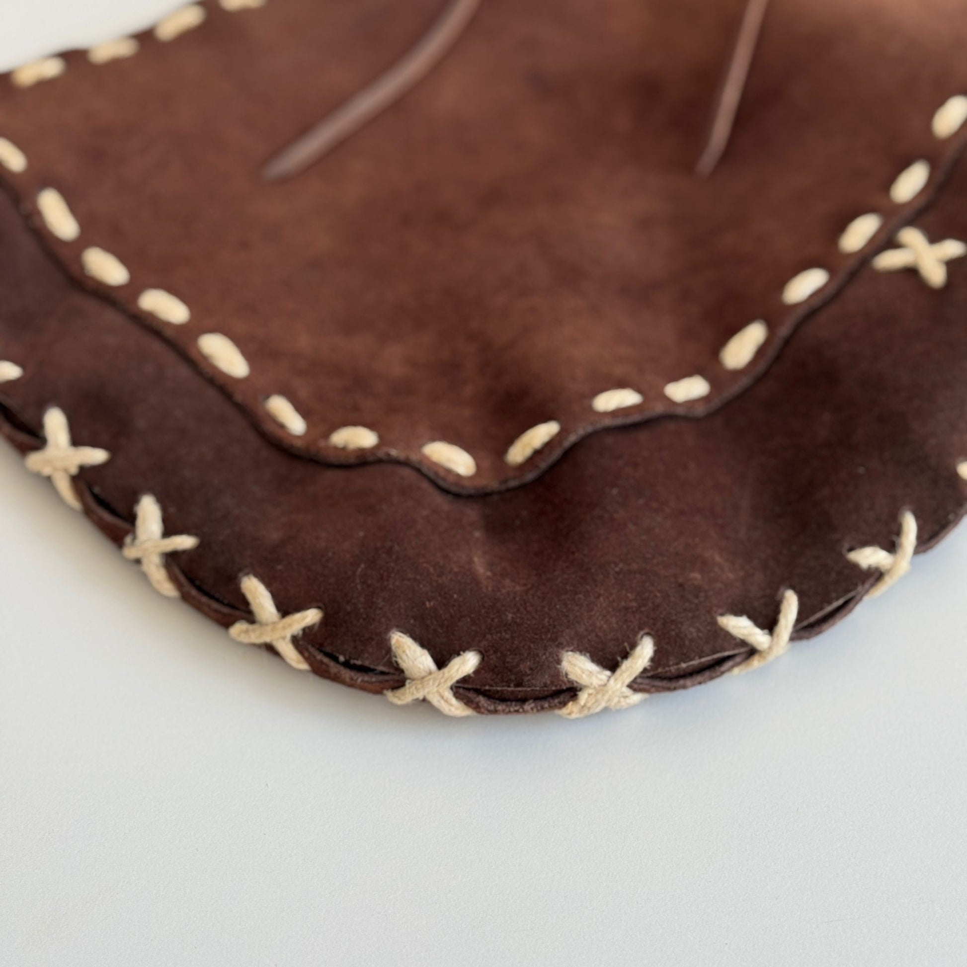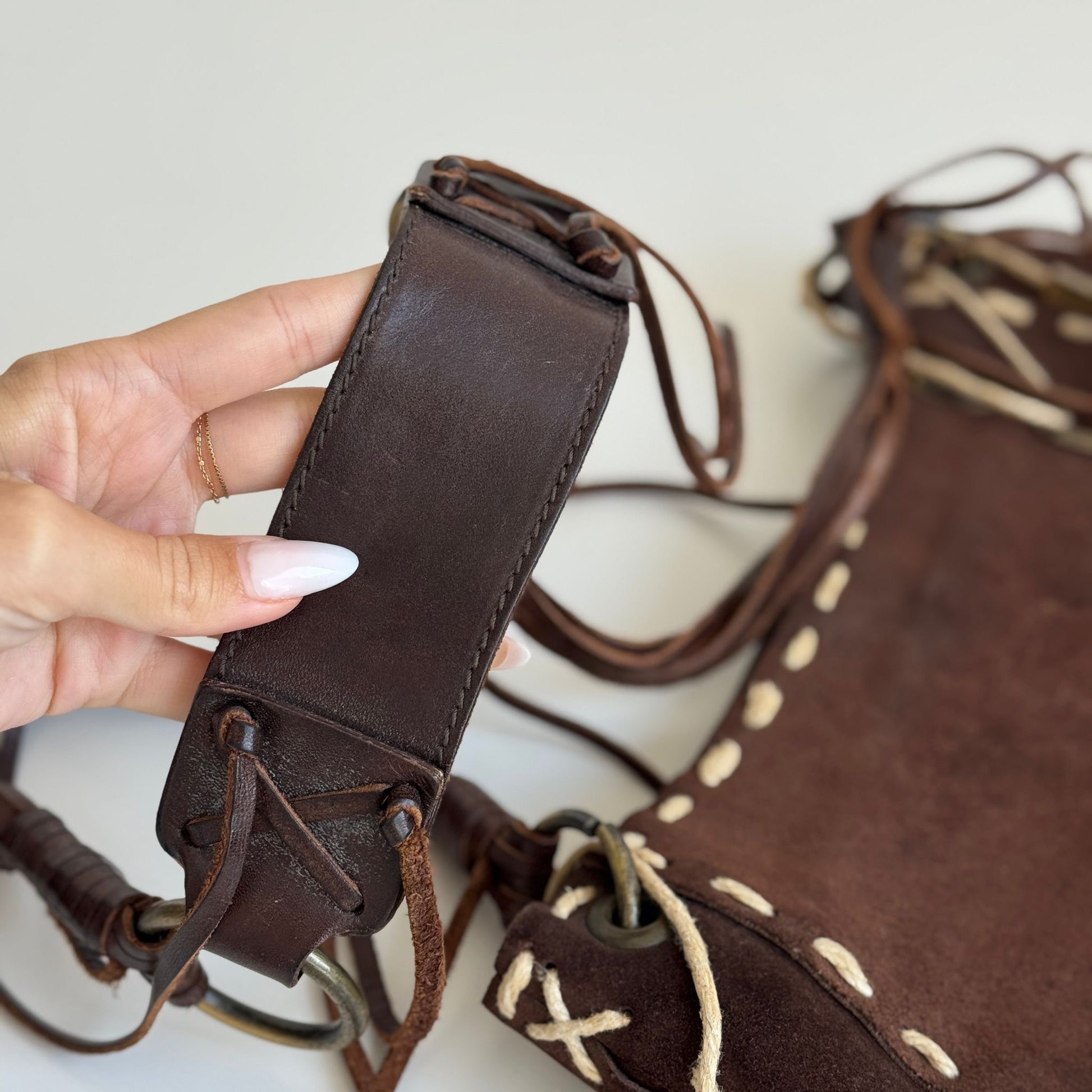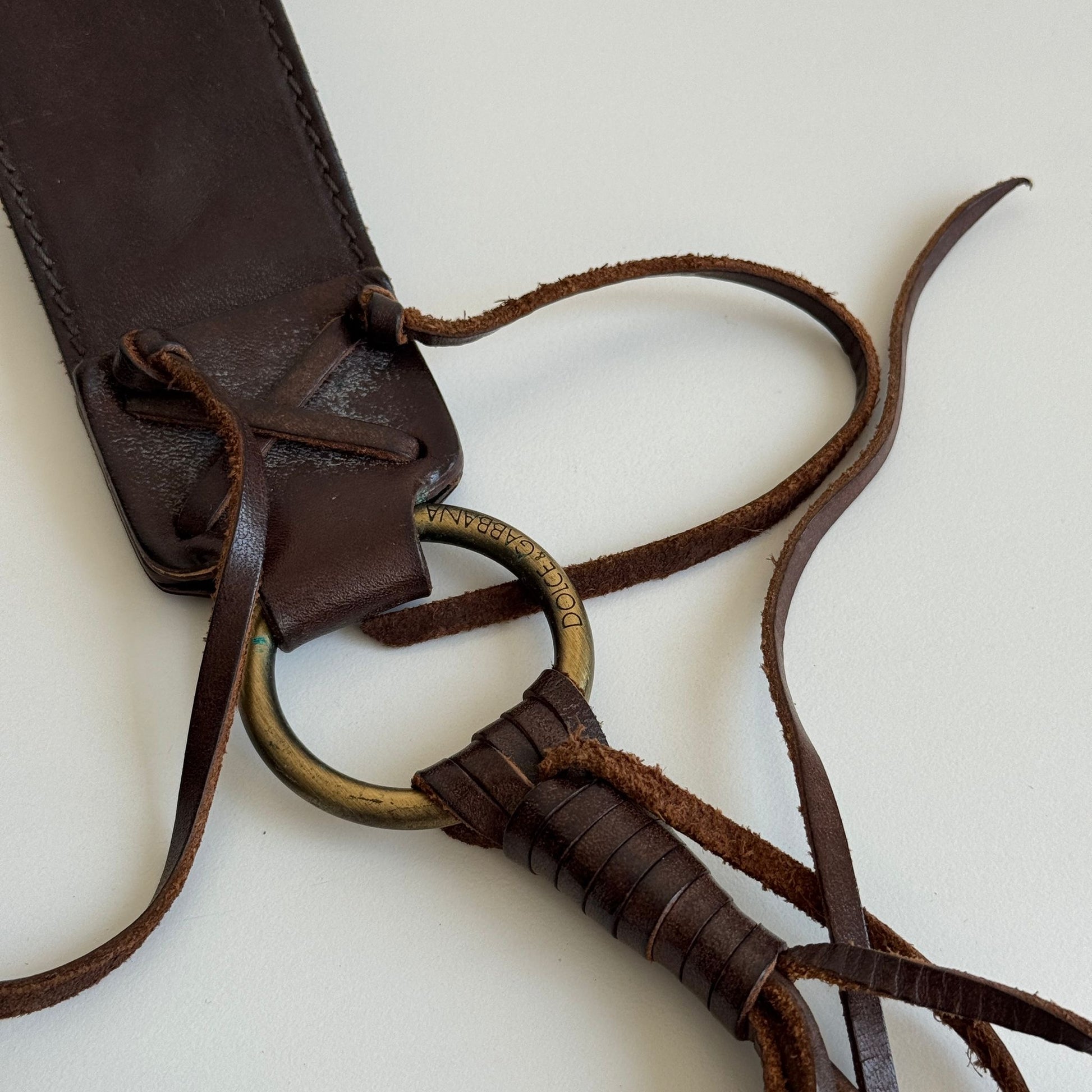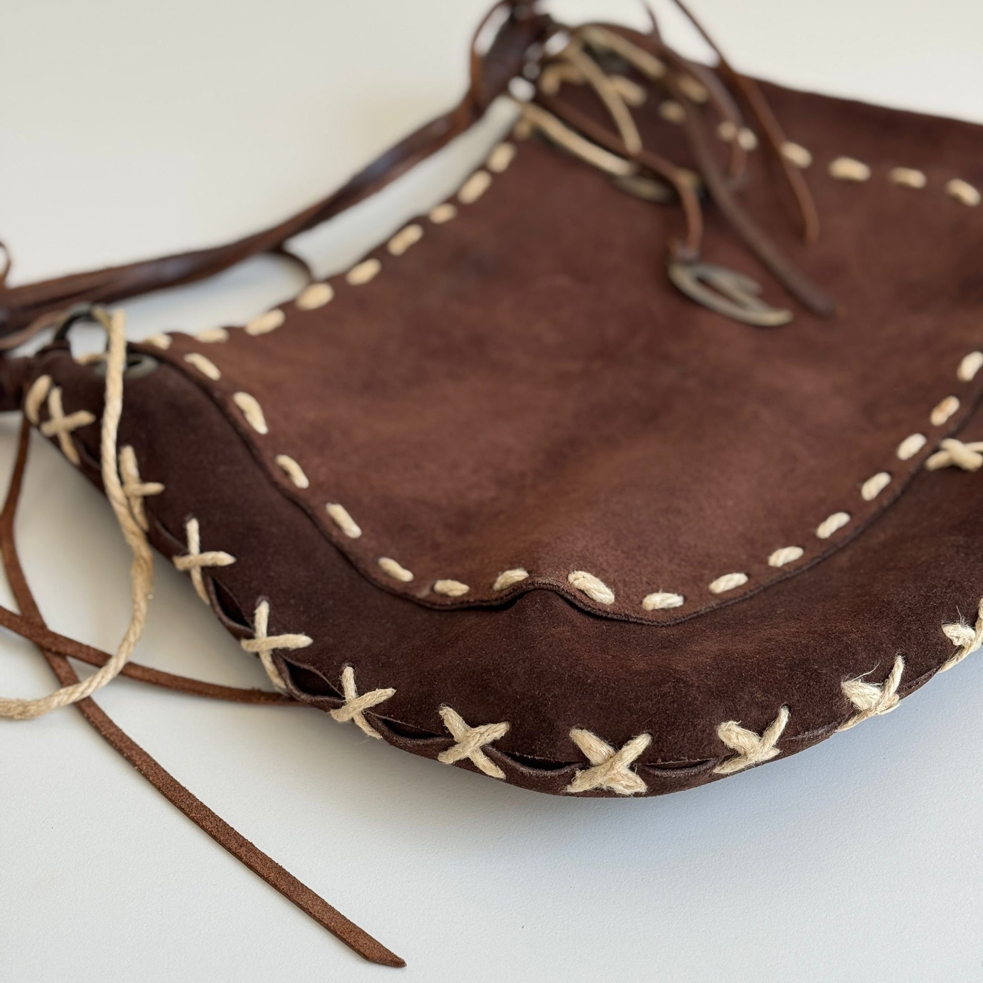 Bellissima borsa a tracolla di Dolce&Gabbana della F/W 2002 in suede marrone con dettagli in pelle e spago e hardware bruniti. Si indossa a spalla e a tracolla, la tracolla non è né regolabile né rimovibile.
