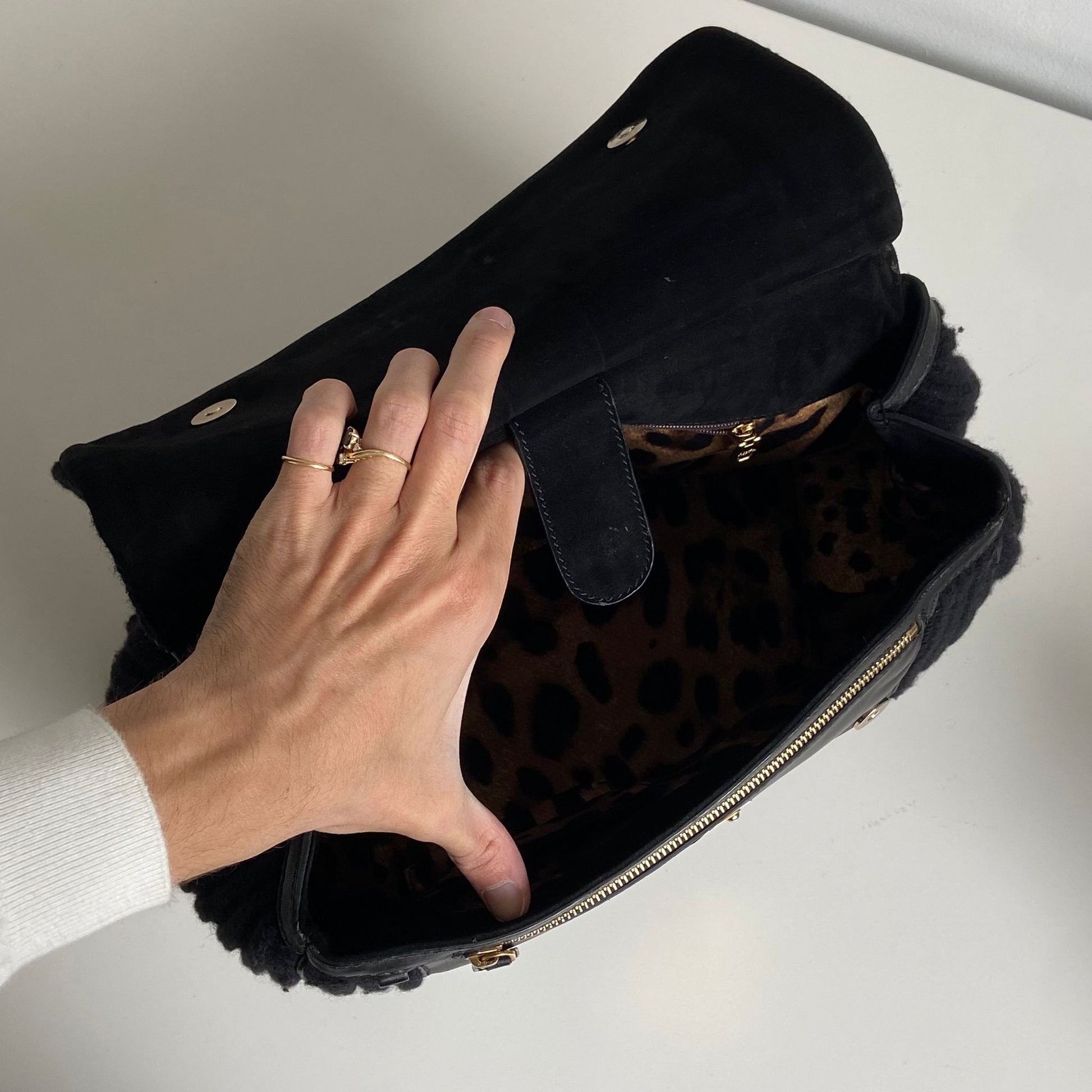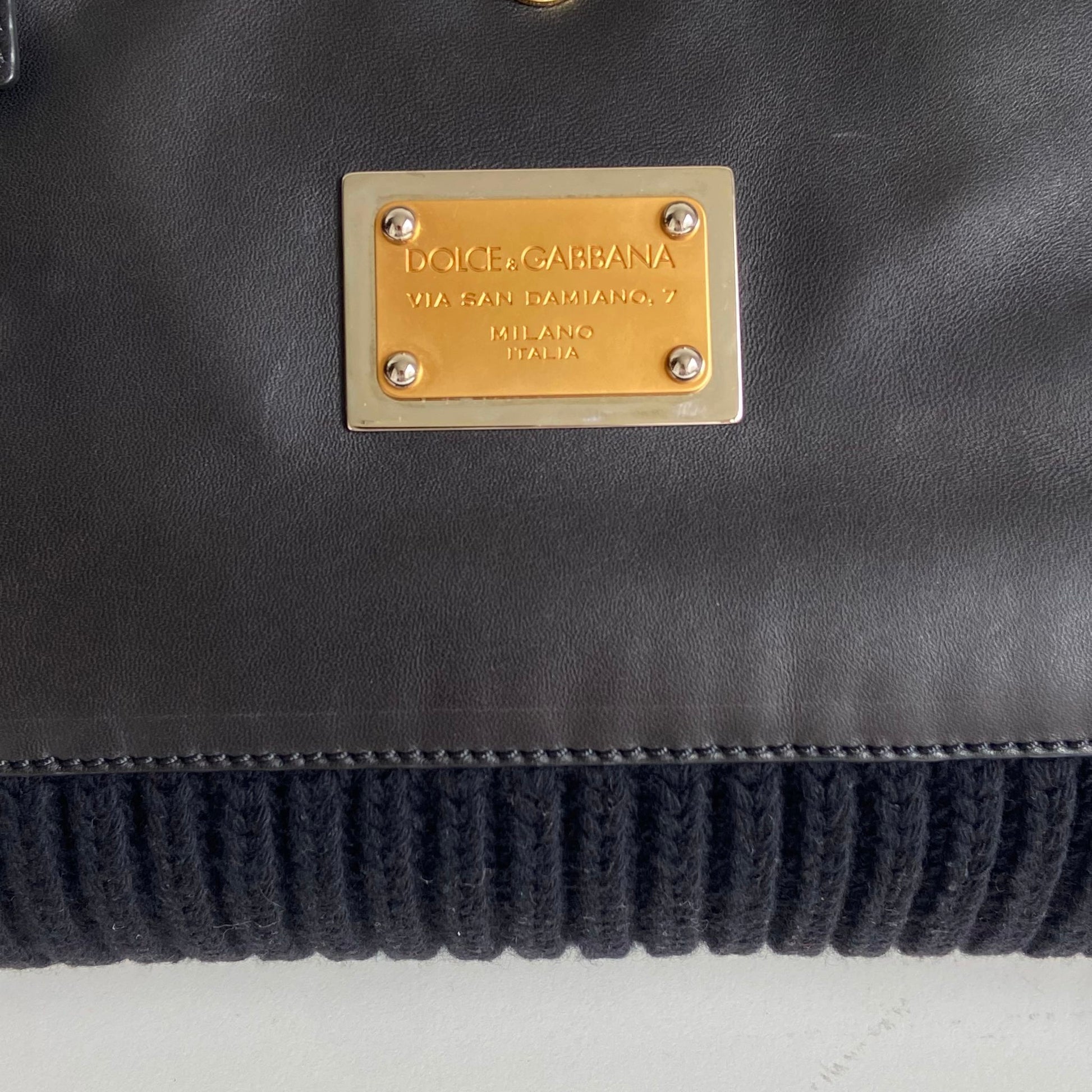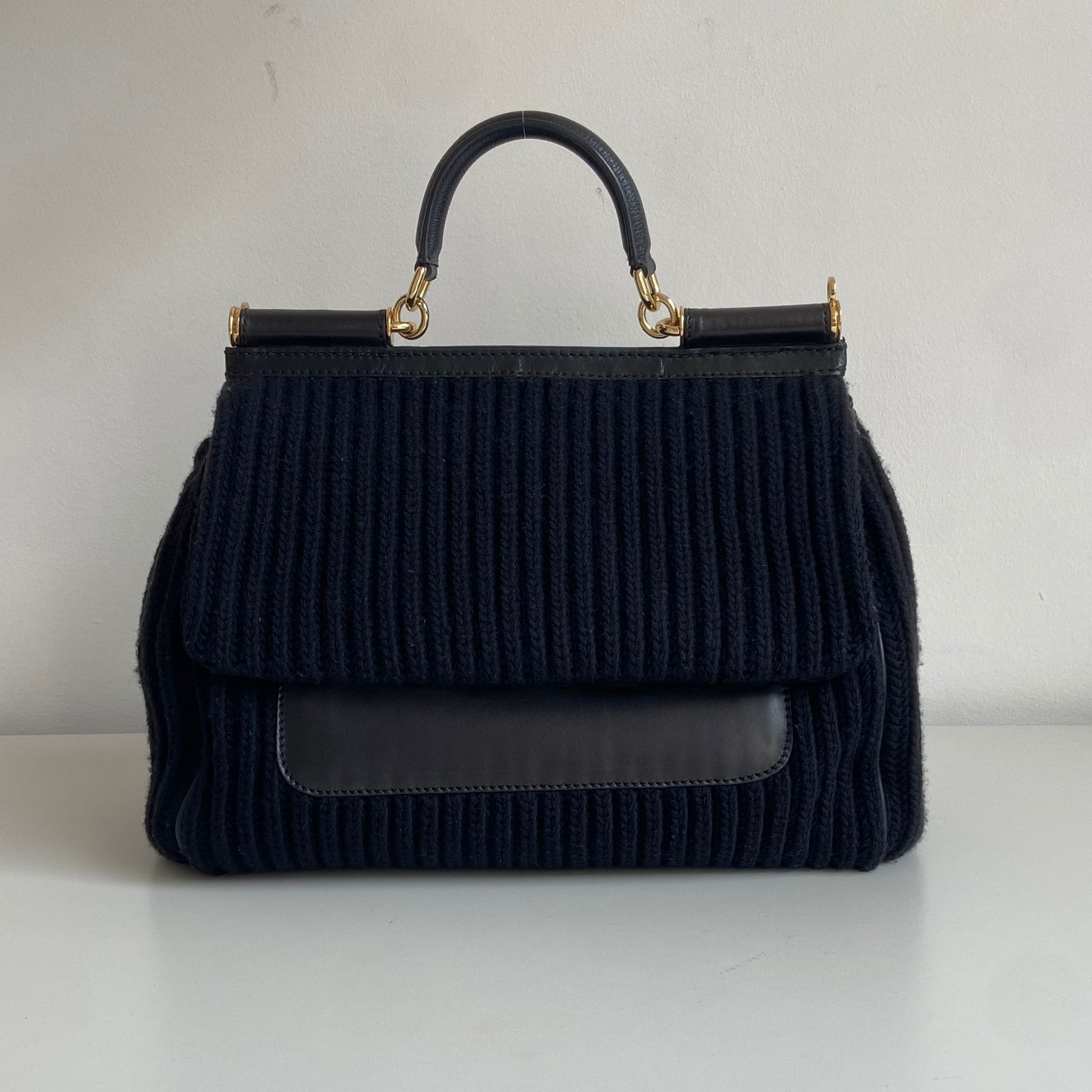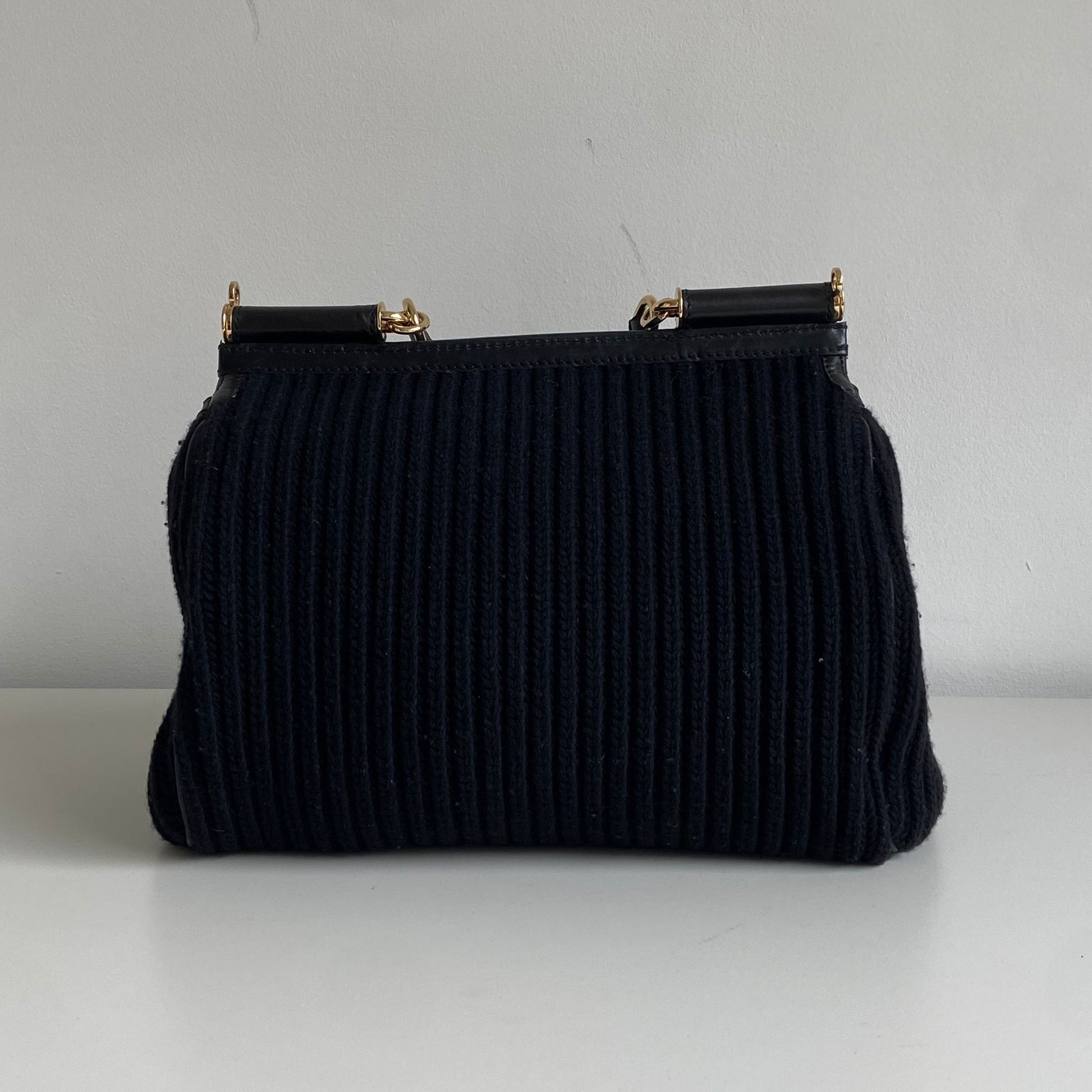 Bellissima borsa Sicily di Dolce&Gabbana in lana nera con dettagli in pelle nera e hardware oro. Si indossa a mano.
