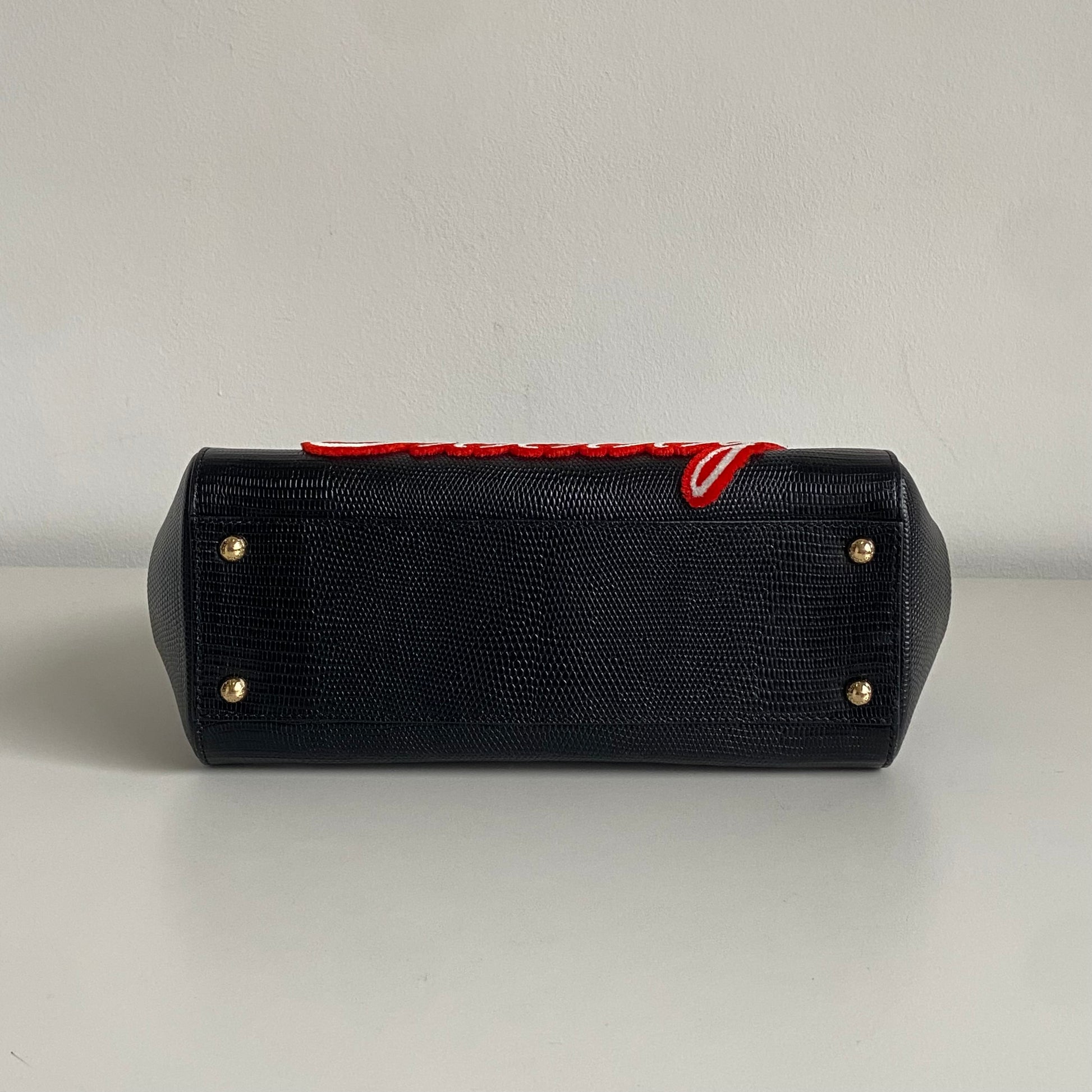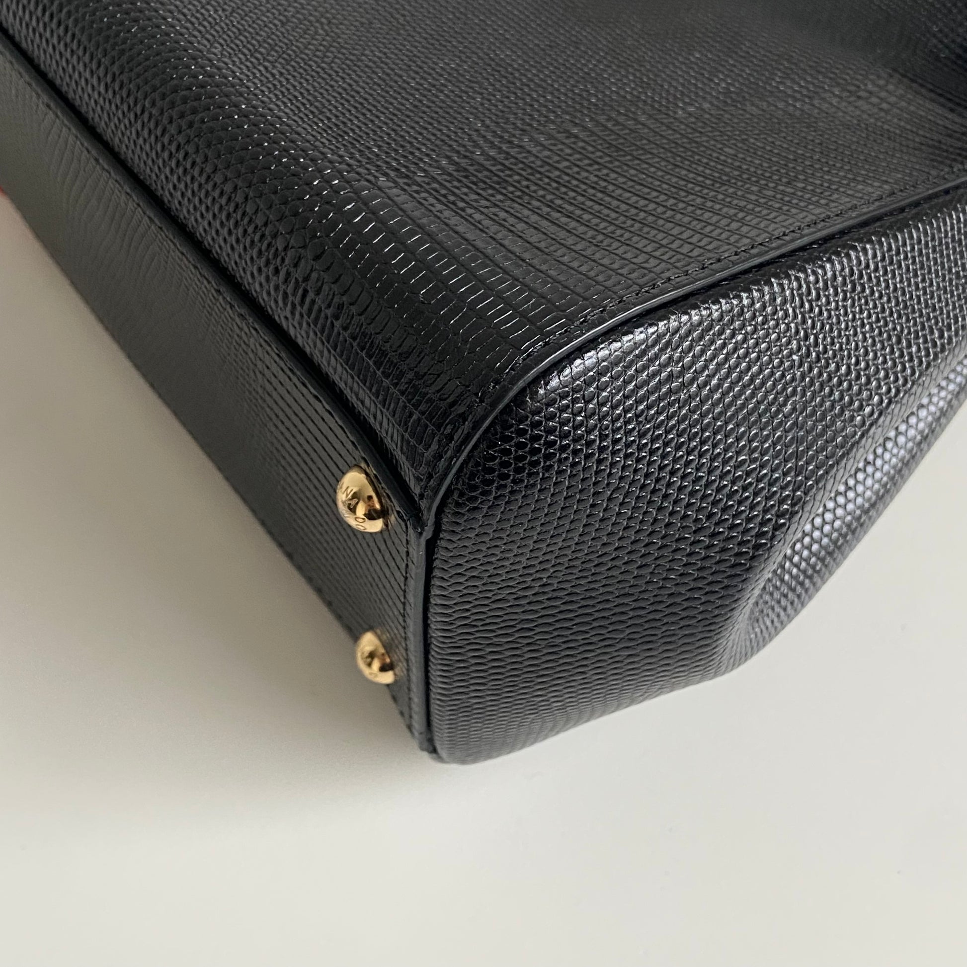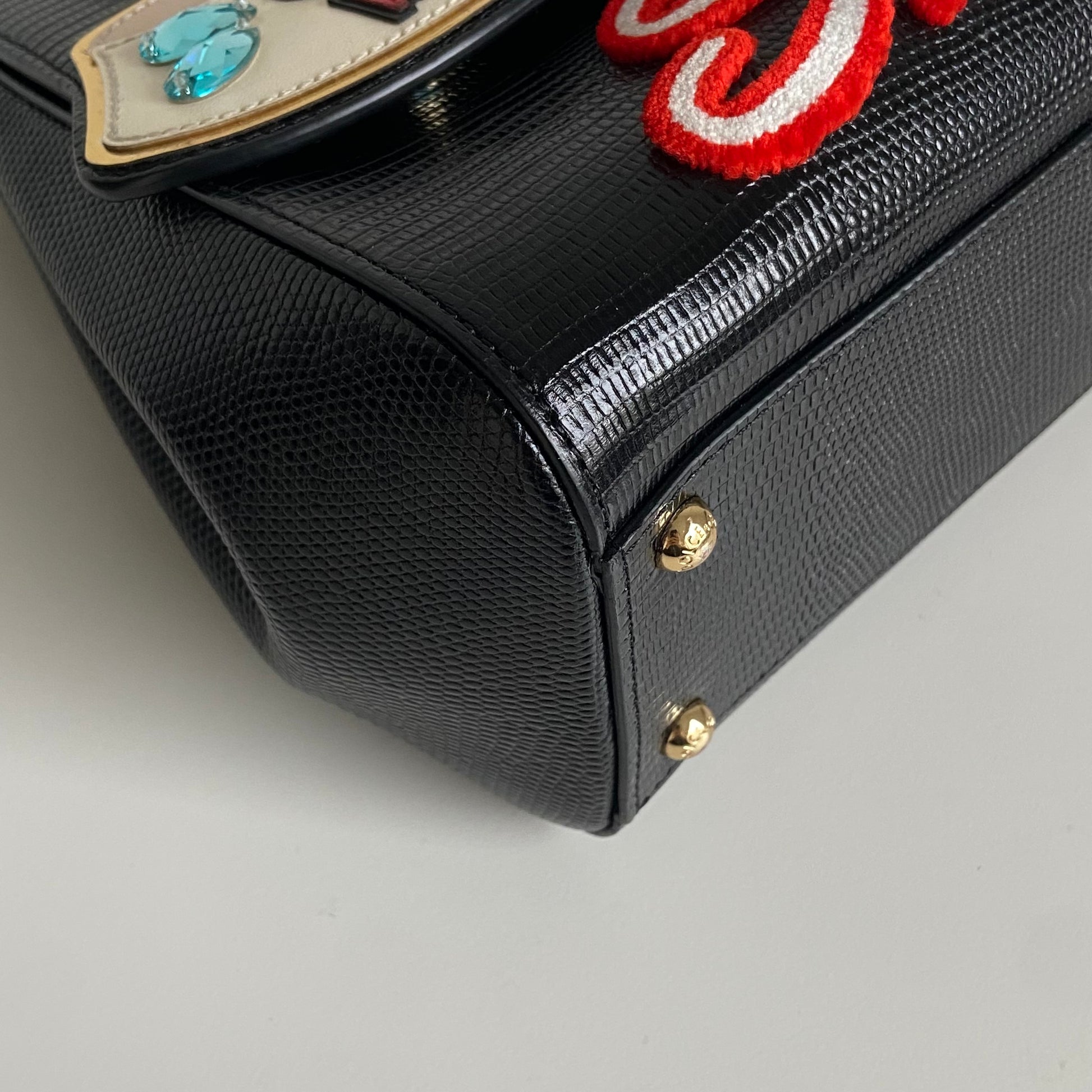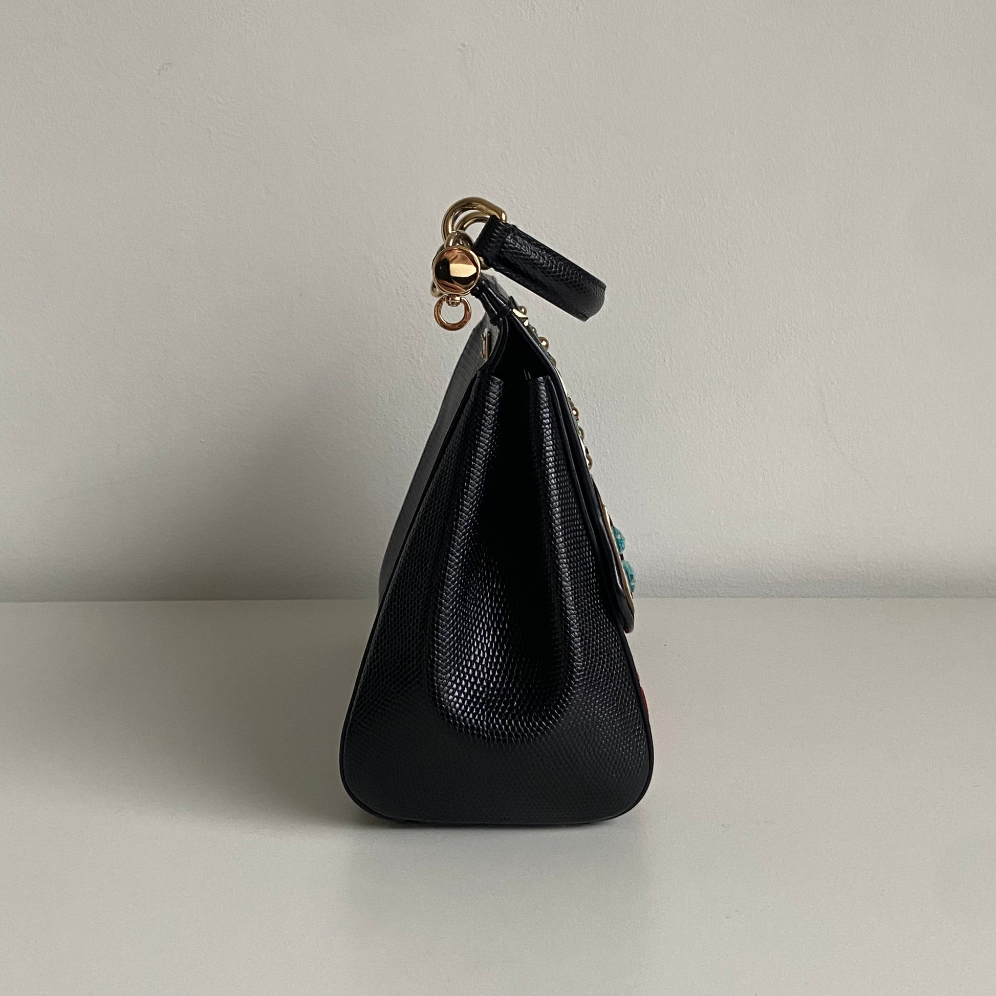Borsa iconica Dolce&Gabbana modello Sicily in pelle Iguana nera con applicazioni in pelle, borchie e perline. Si indossa a mano e a tracolla, la tracolla è regolabile e rimovibile.