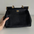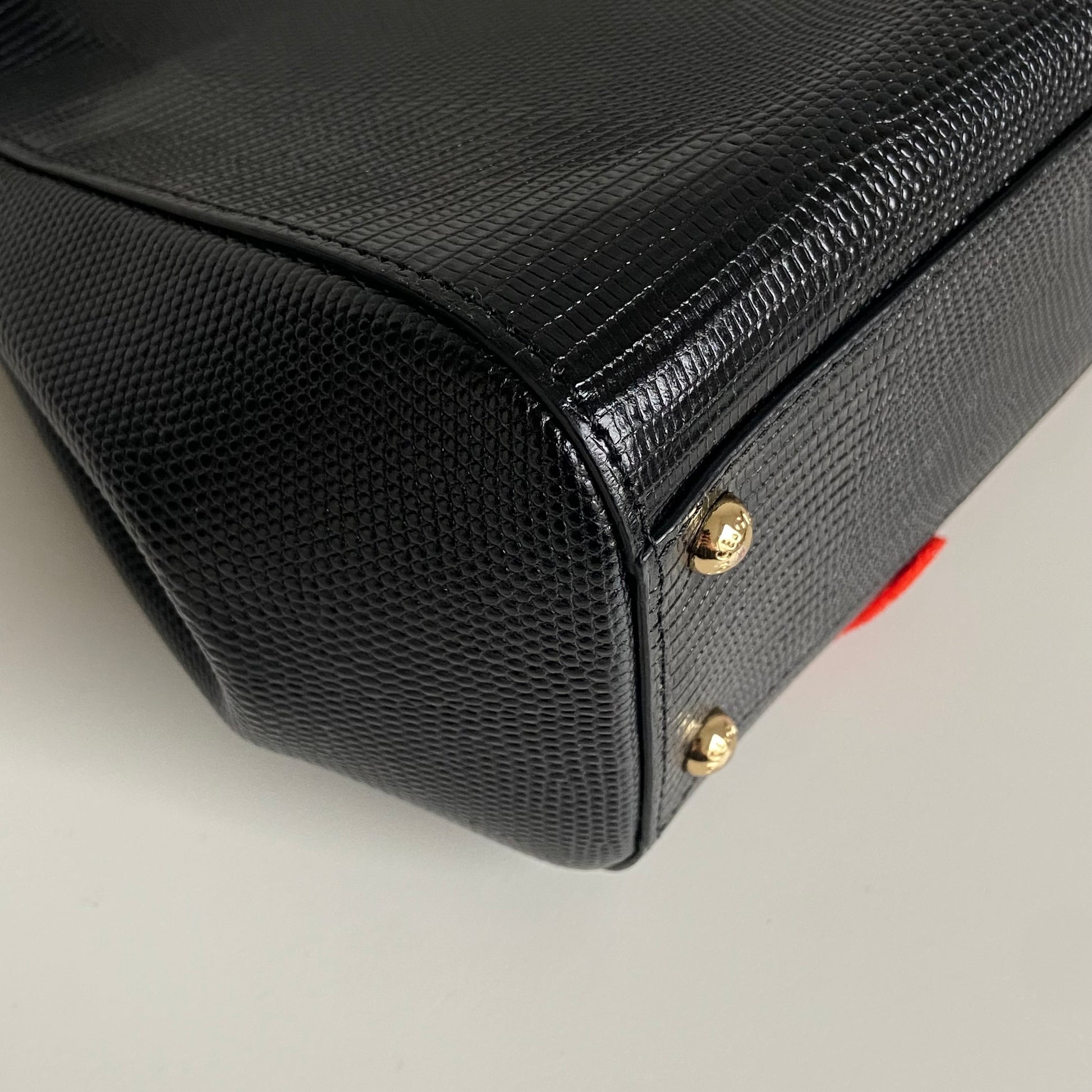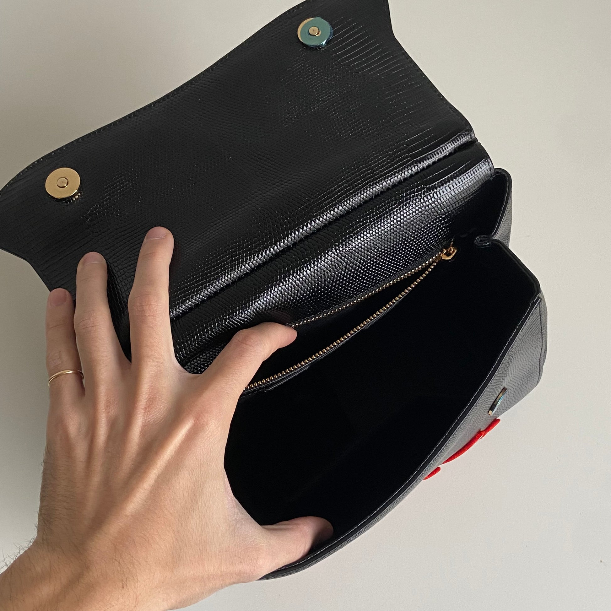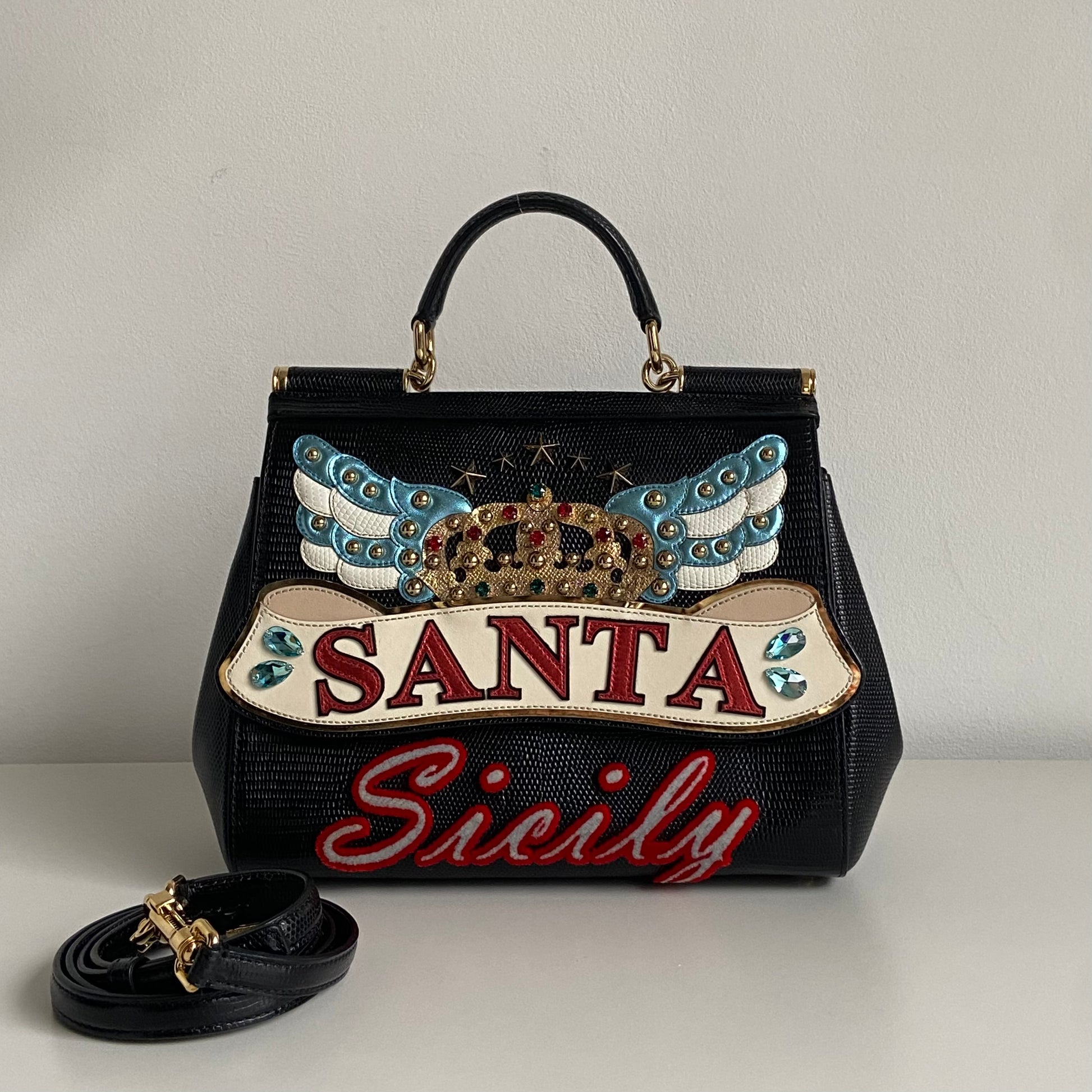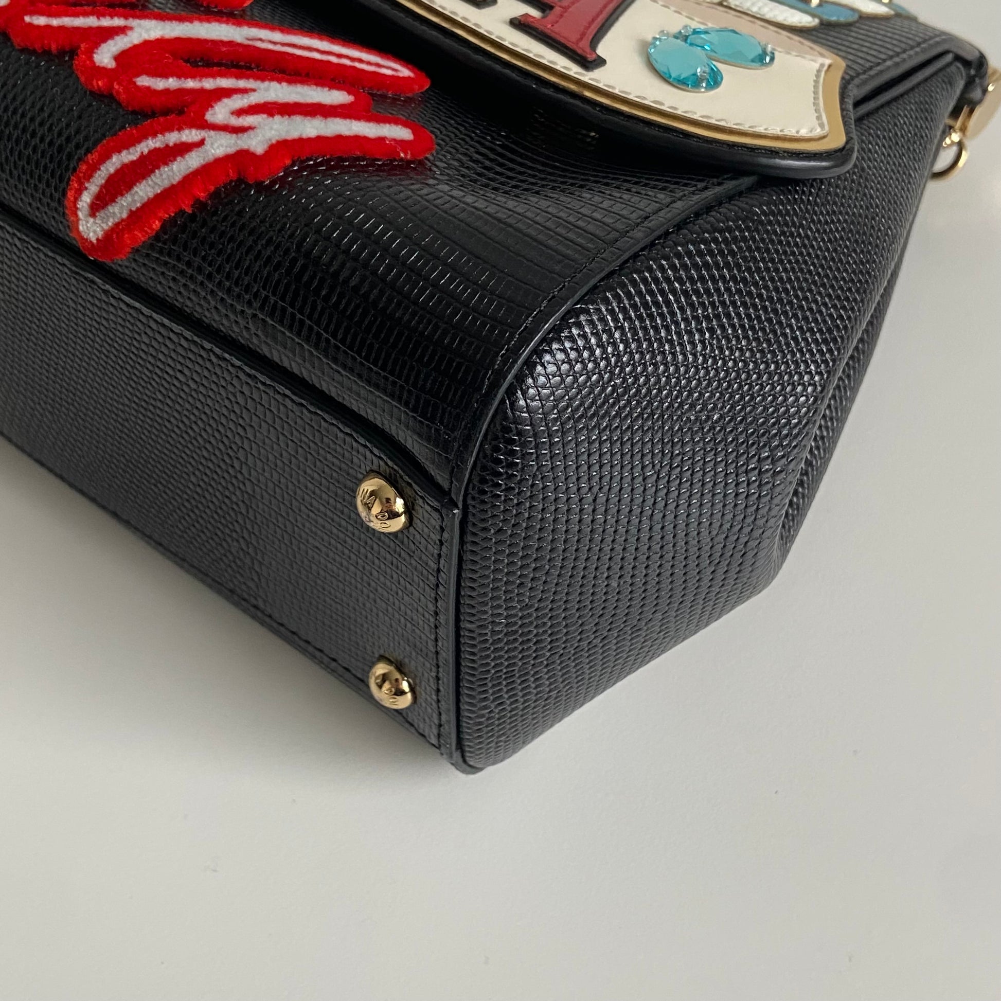 Borsa iconica Dolce&Gabbana modello Sicily in pelle Iguana nera con applicazioni in pelle, borchie e perline. Si indossa a mano e a tracolla, la tracolla è regolabile e rimovibile.