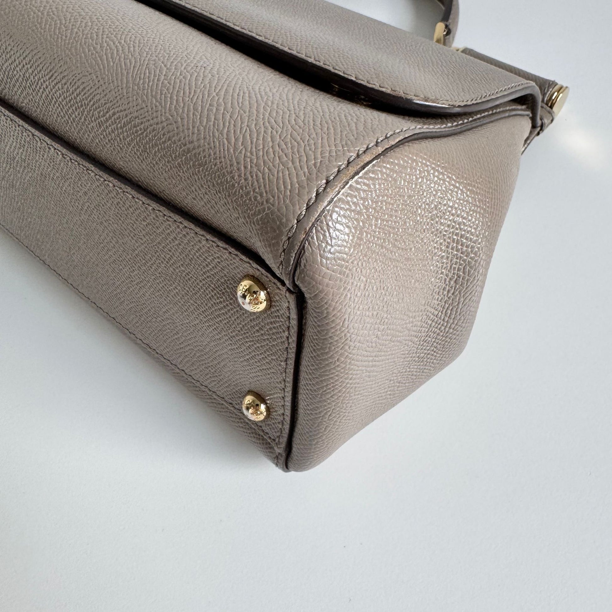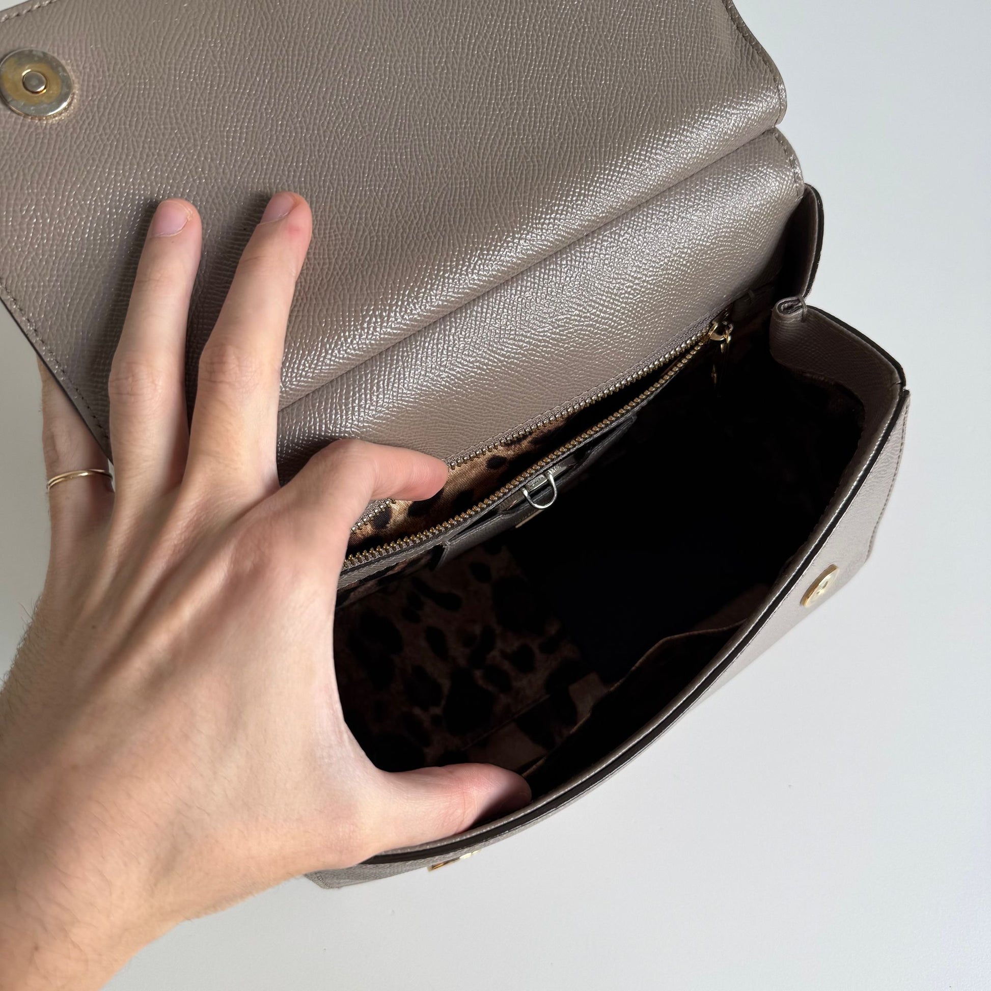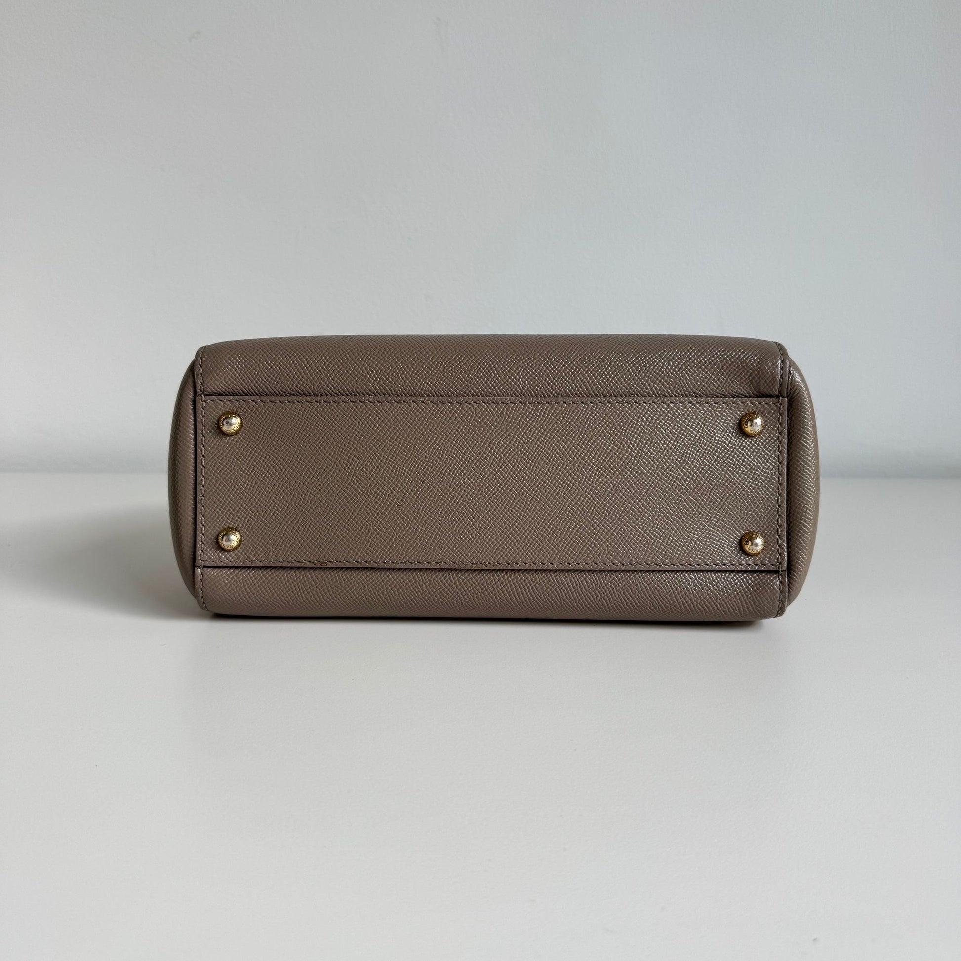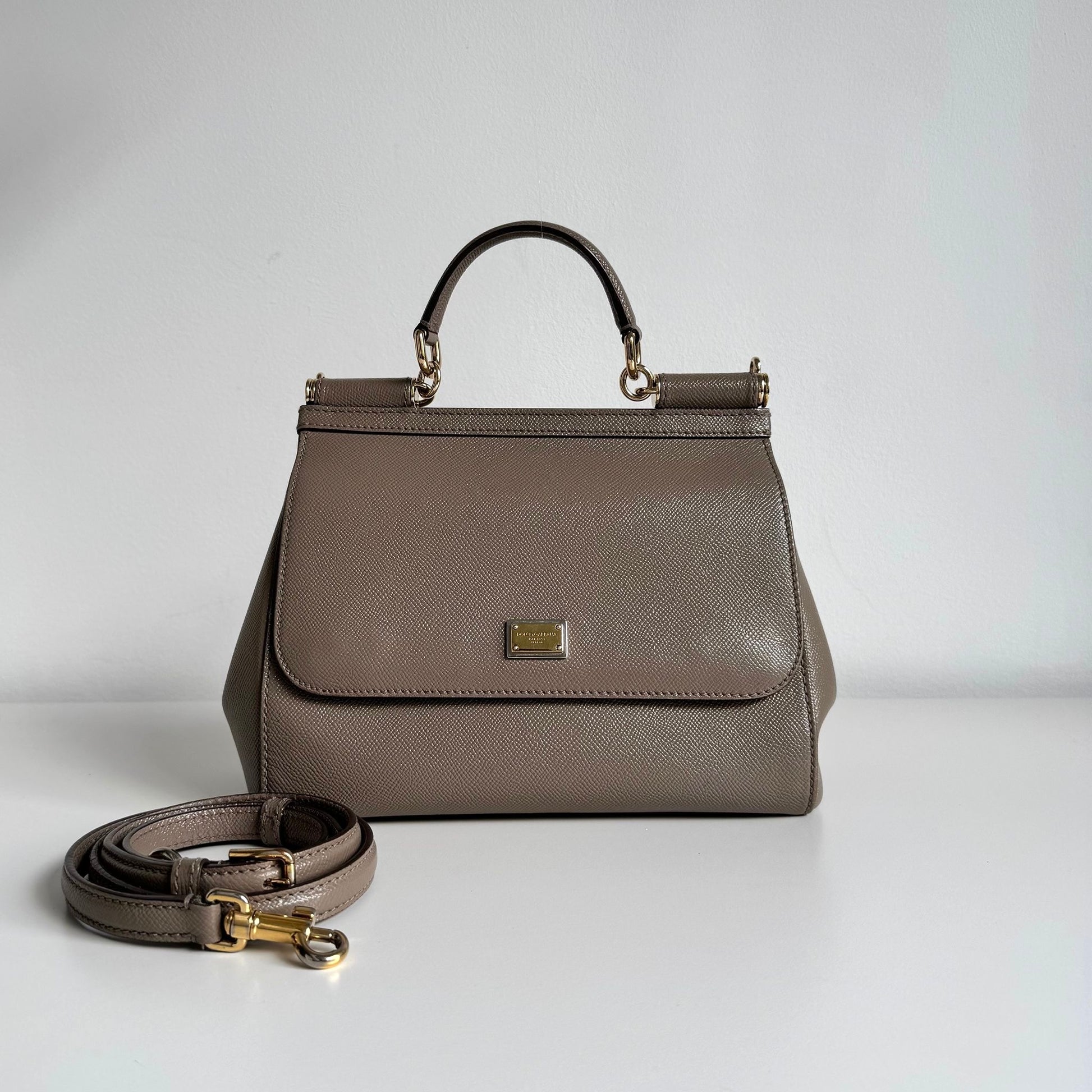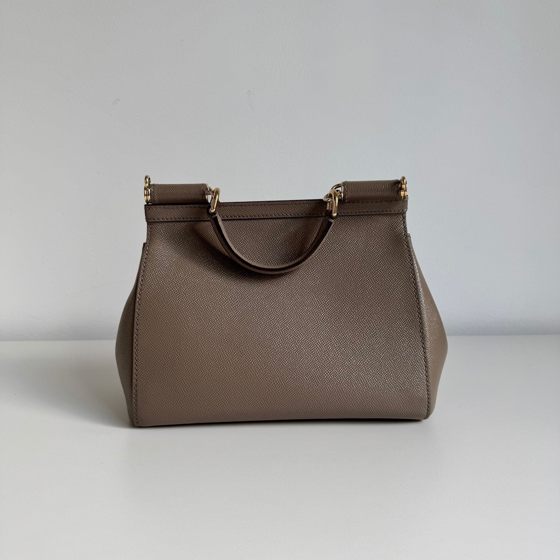 Stupenda borsa Dolce e Gabbana modello Sicily Media in pelle Dauphine fango e hardware oro. Si indossa a mano o a tracolla. La tracolla è rimovibile e regolabile.