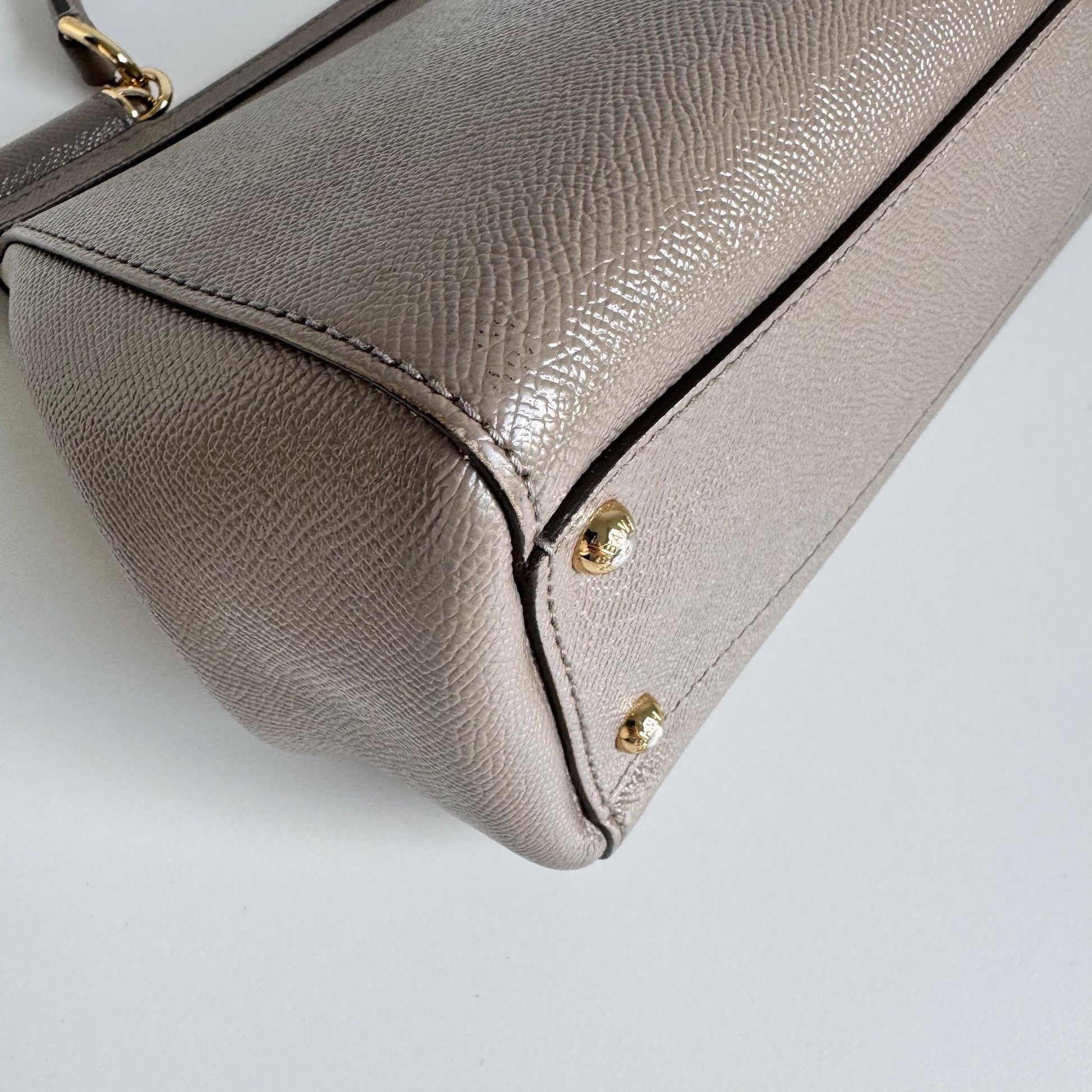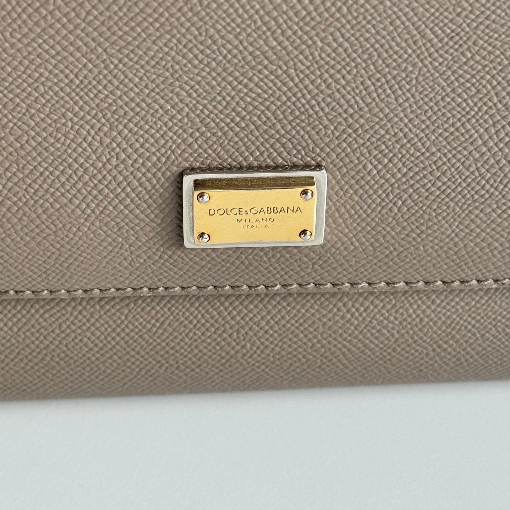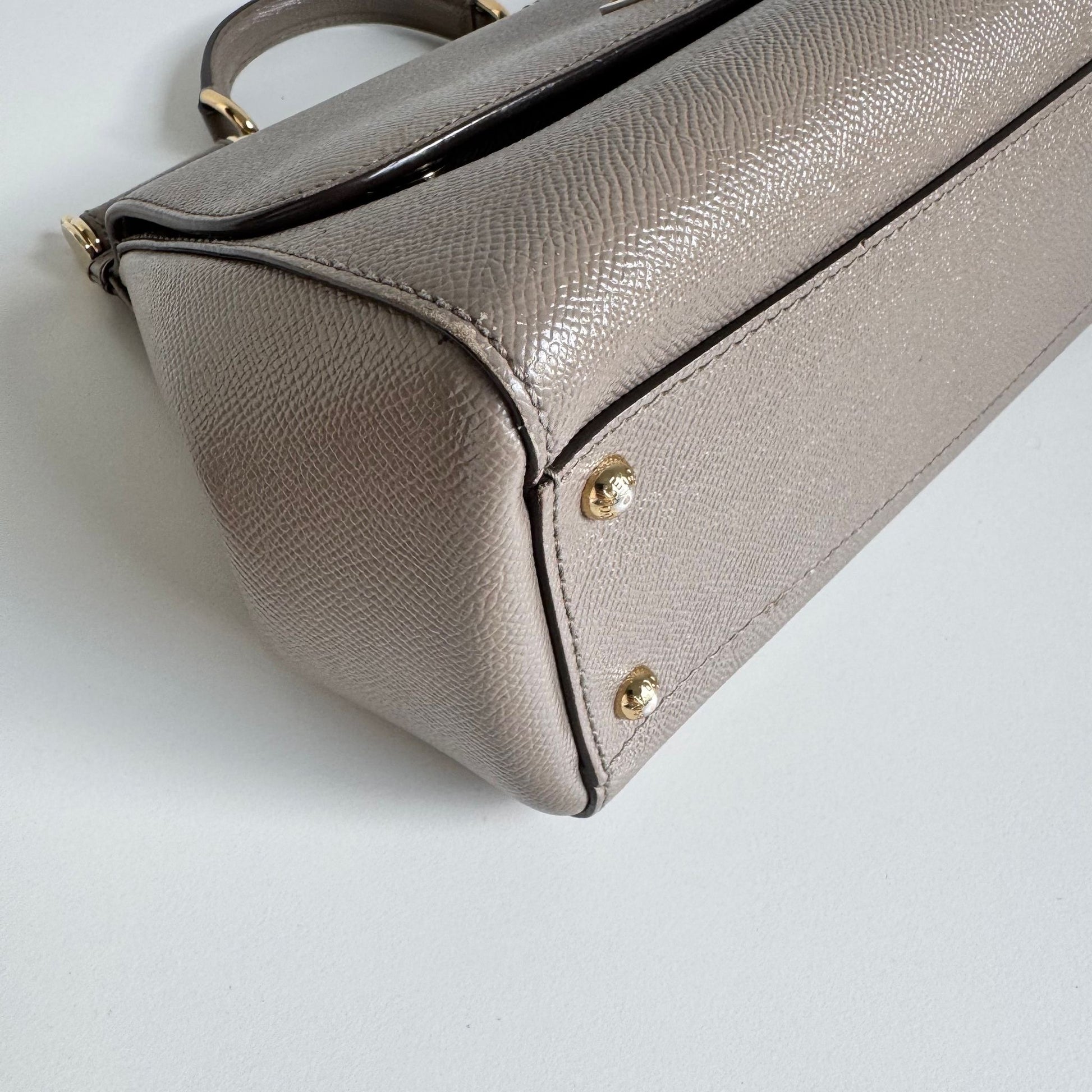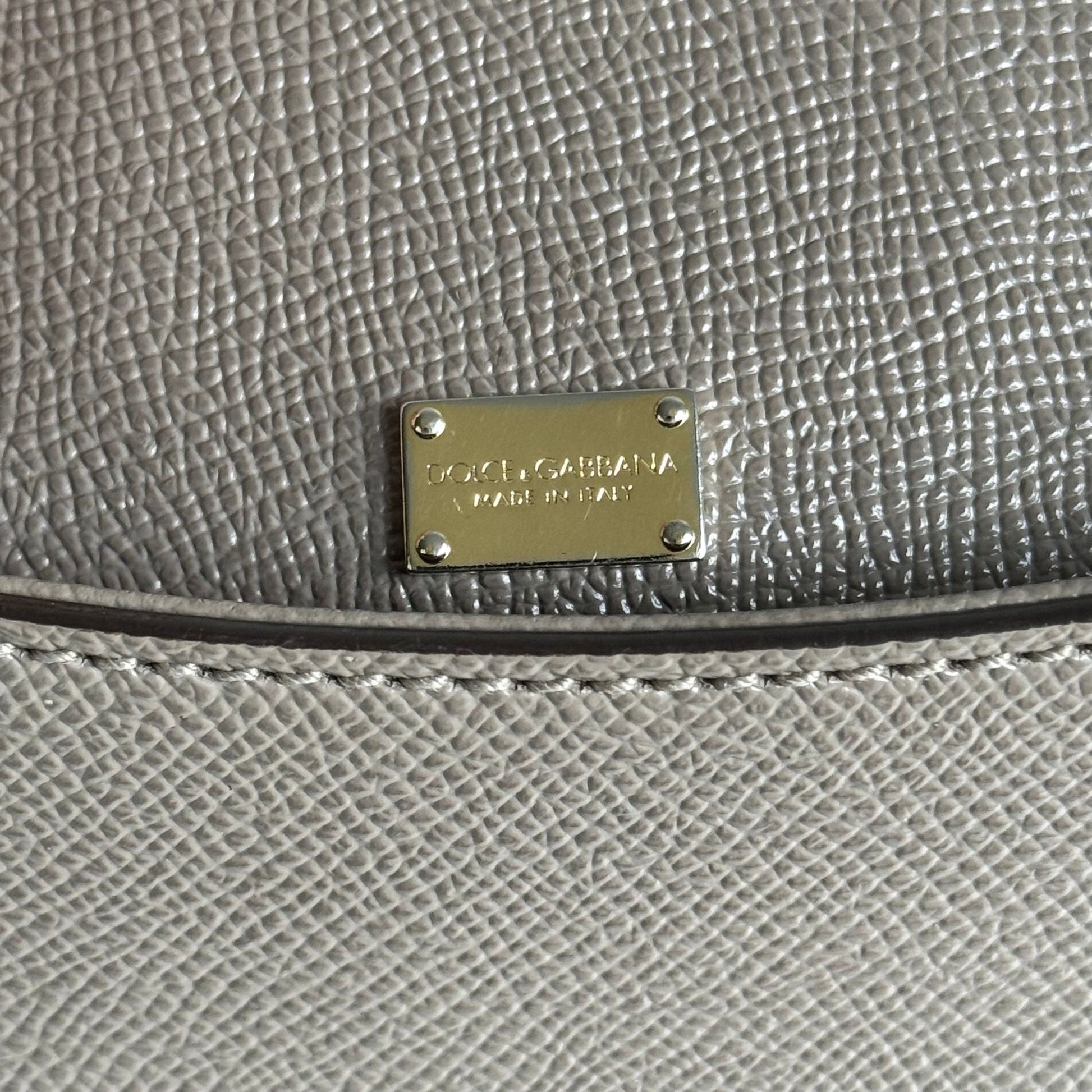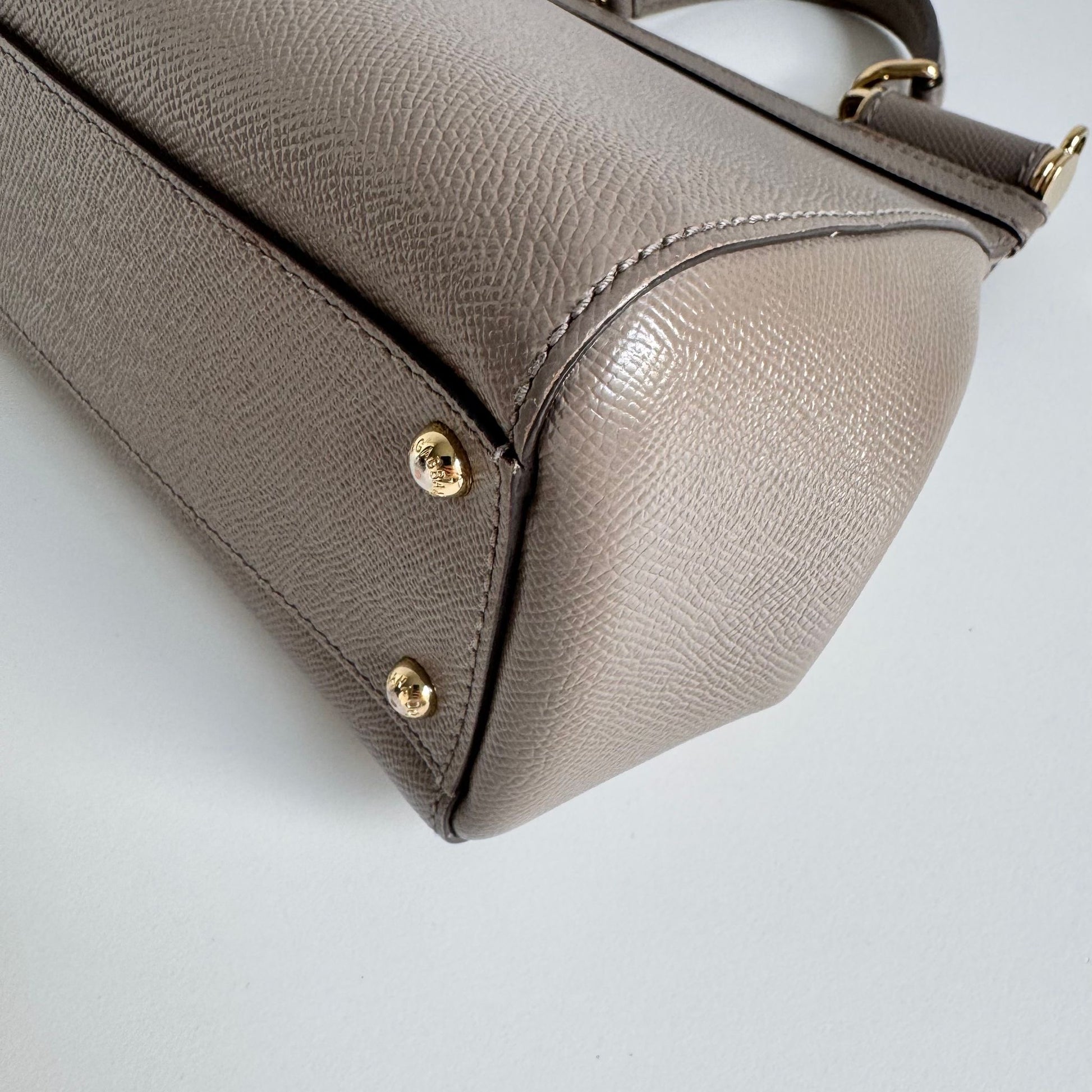 Stupenda borsa Dolce e Gabbana modello Sicily Media in pelle Dauphine fango e hardware oro. Si indossa a mano o a tracolla. La tracolla è rimovibile e regolabile.