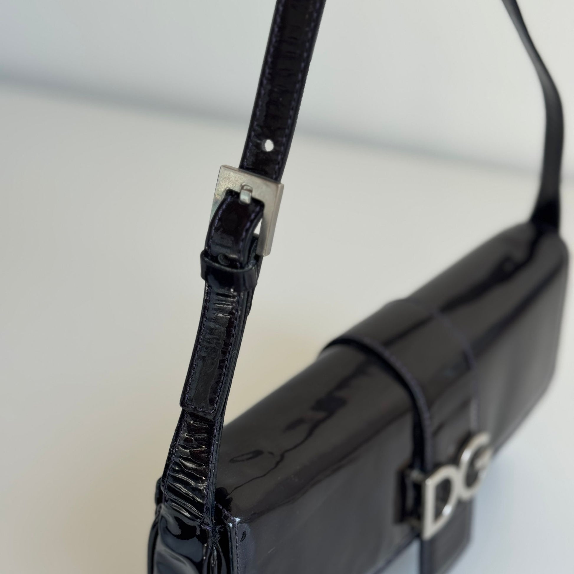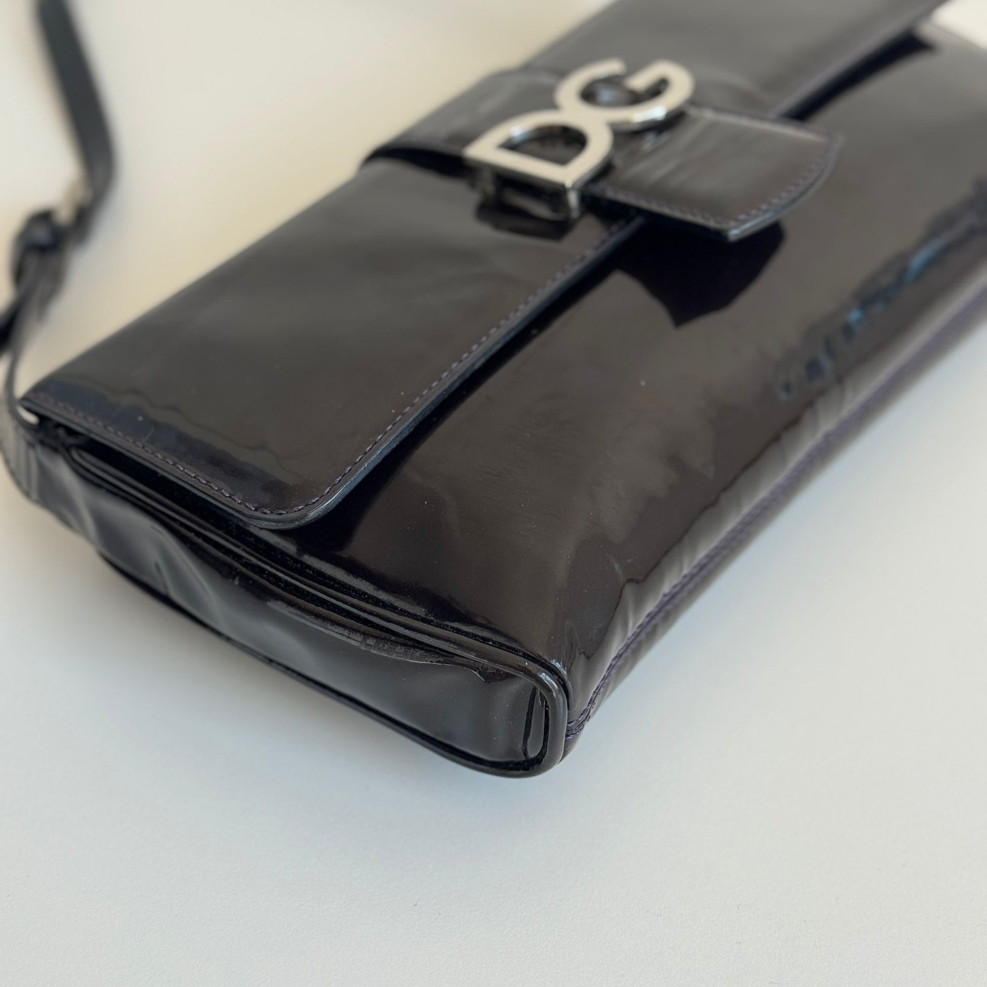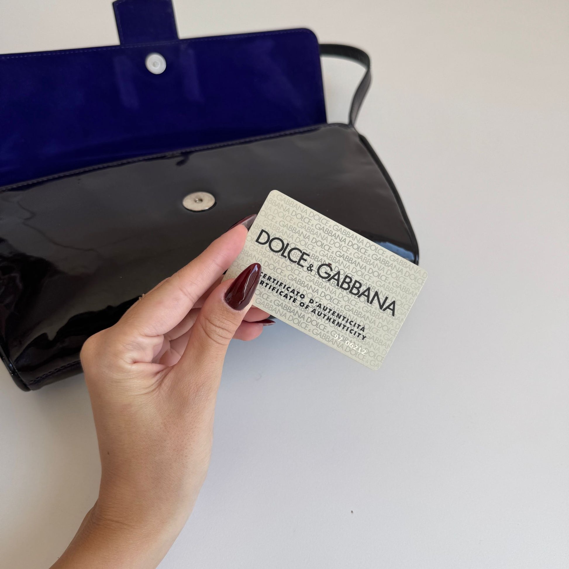 Bellissima borsa a spalla Dolce&Gabbana in vernice viola melanzana molto scuro, quasi nero e hardware argento. Si indossa a spalla.